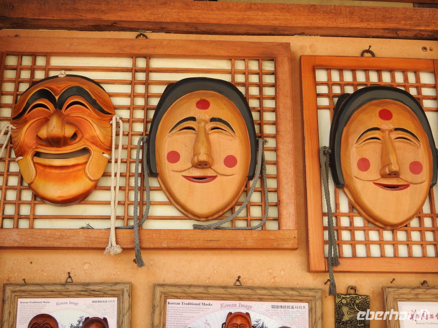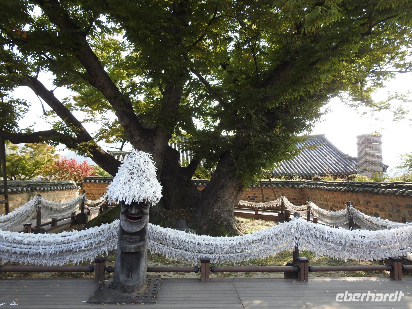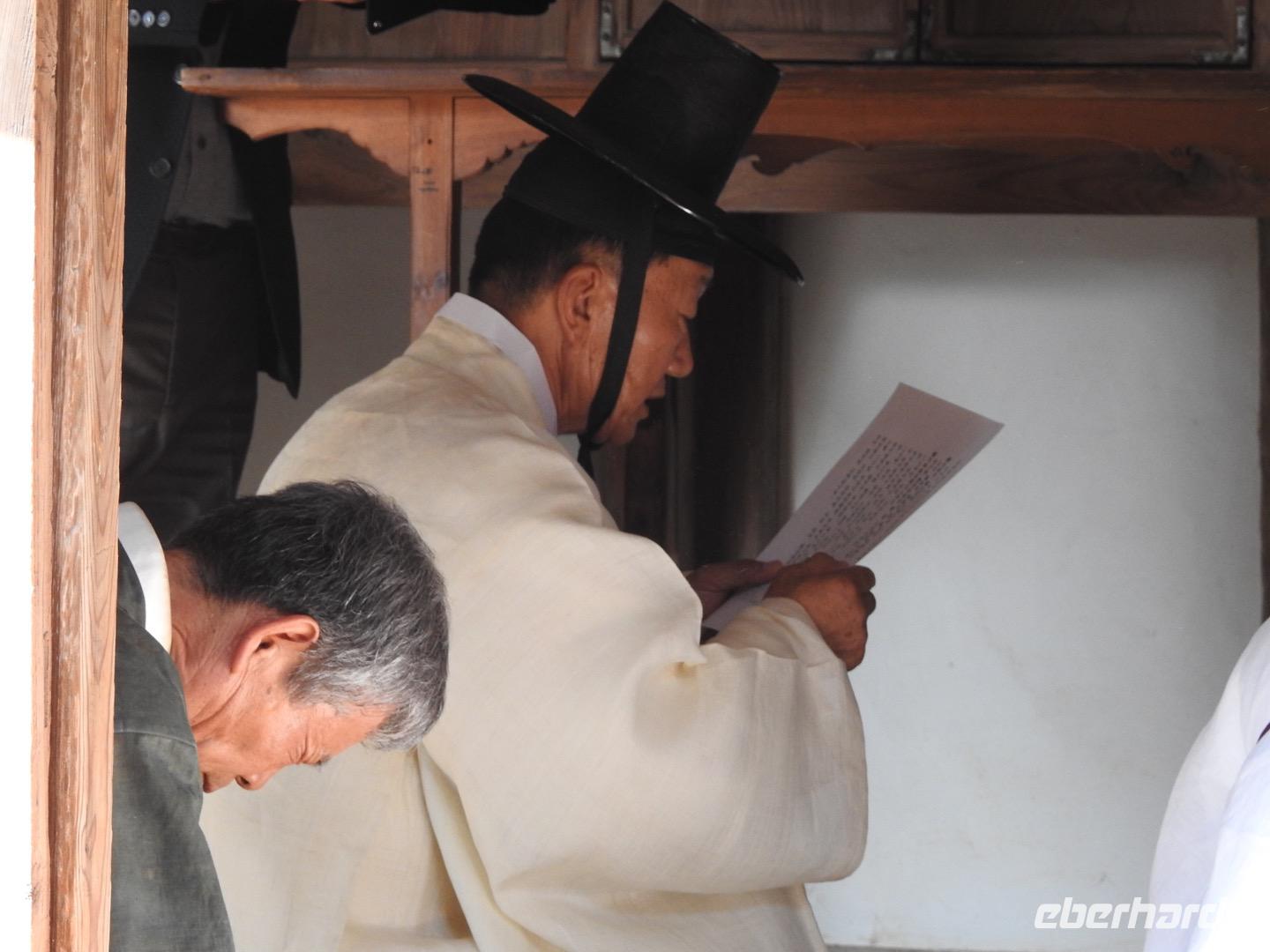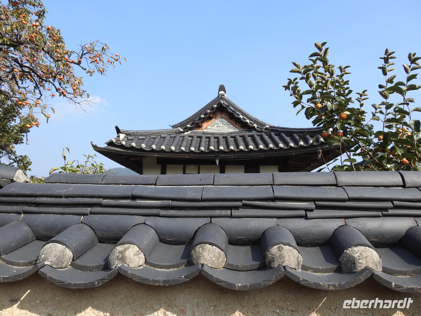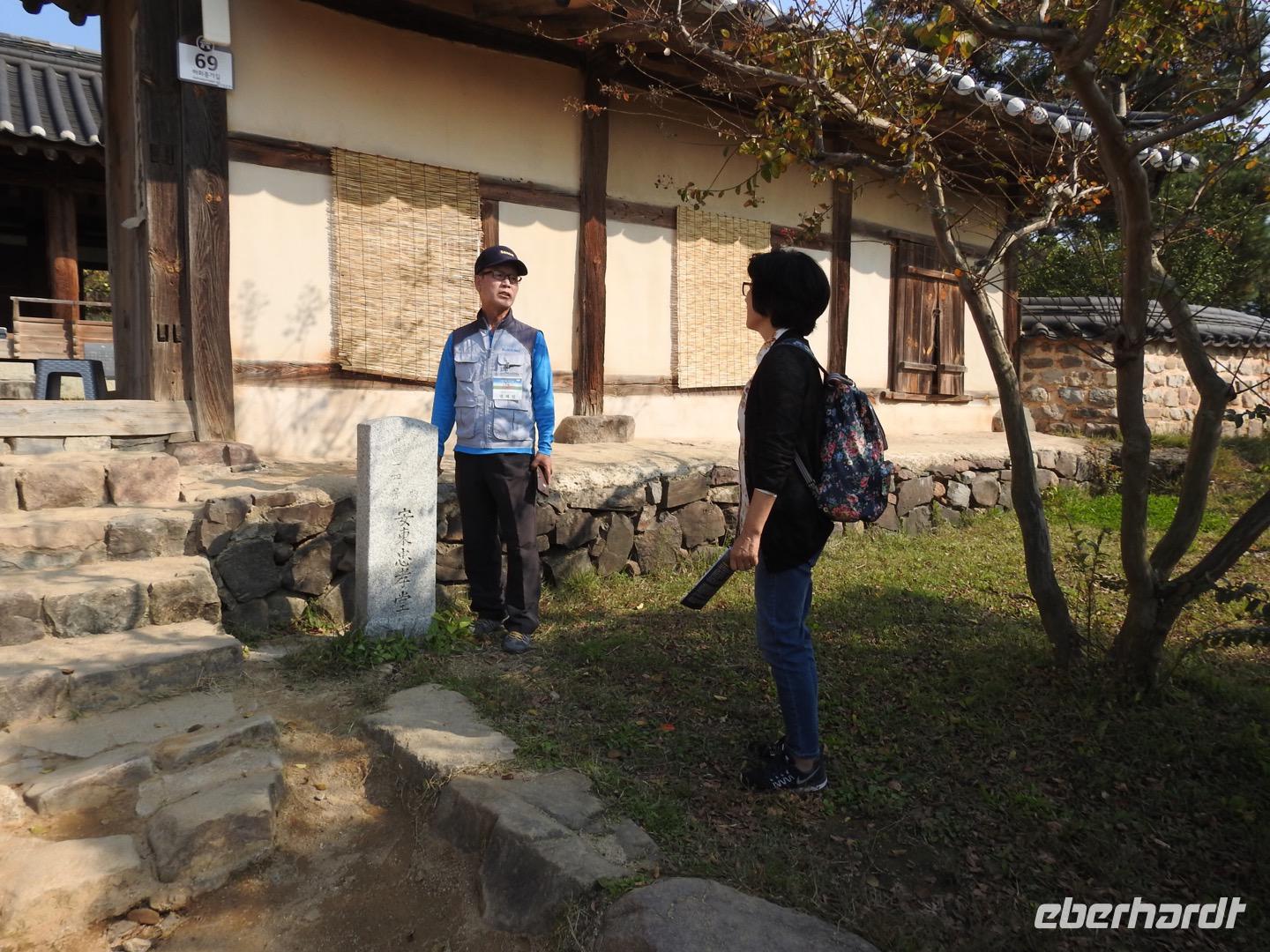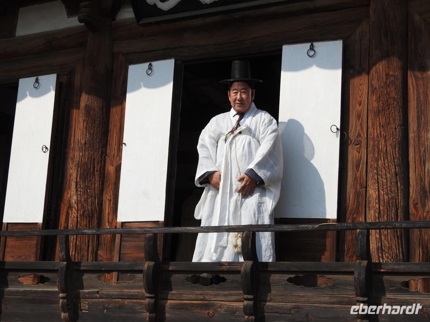 Wir besuchen das Hahoe-Dorf in Andong. Es scheint als wären wir die einzigen Gäste heute. Die Suche nach einem schnellen und preiswerten Mittagessen gestaltet sich komplizierter als gedacht, dennoch können wir uns bald an einer leckeren und liebevoll zubereiteten Nudelsuppe laben. Nun beginnt unser Rundgang durch das Hahoe-Dorf, dass seit 600 Jahren von einer einzigen Familie bewohnt wird. Heute muss man, wenn man das Dorf besichtigen will, Eintritt bezahlen. Viele Häuser stehen leer, einige sind noch bewohnt. Uns erwartet ein besonderes Erlebnis. Zwei Männer, die aus diesem Dorf stammen, sind kürzlich zu Bürgermeistern gewählt worden. Heute sind sie nach Hause gekommen, um ihren Ahnen für ihren Erfolg zu danken. Dies erfolgt in einer Zeremonie im Geisthaus. Als sie mitbekommen, dass wir ihnen mit unseren Fotoapparaten auf den Fersen sind, laden sie uns freundlich ein, an der Zeremonie teilzunehmen. Die Männer sind in traditionelle Kittel gekleidet und außer den Bürgermeistern sind noch einige andere, ähnlich gekleidete, Männer anwesend. Sie nehmen barfuß auf einer Strohmatte vor dem Geisthaus Aufstellung. Drinnen werden Räucherstäbchen angezündet, eine Obstschale ist aufgestellt und per Gesang und vielen Verbeugungen werden die Ahnen informiert. Nach der Zeremonie verlassen die Männer ganz unspektakulär das Gelände und es wird aufgeräumt. Als die Obstschale weggetragen wird, dürfen wir von den Opfergaben naschen.