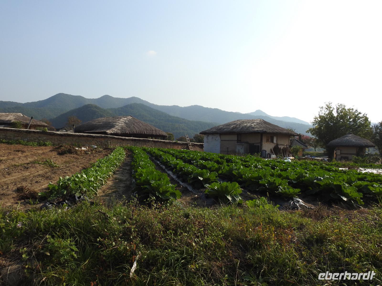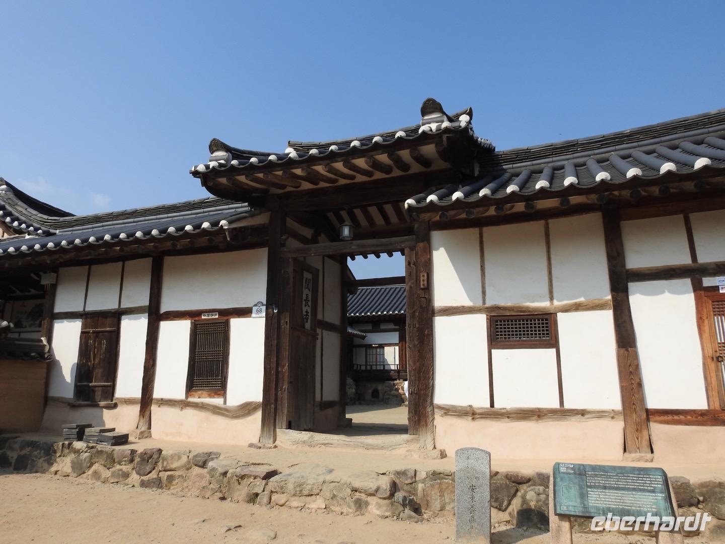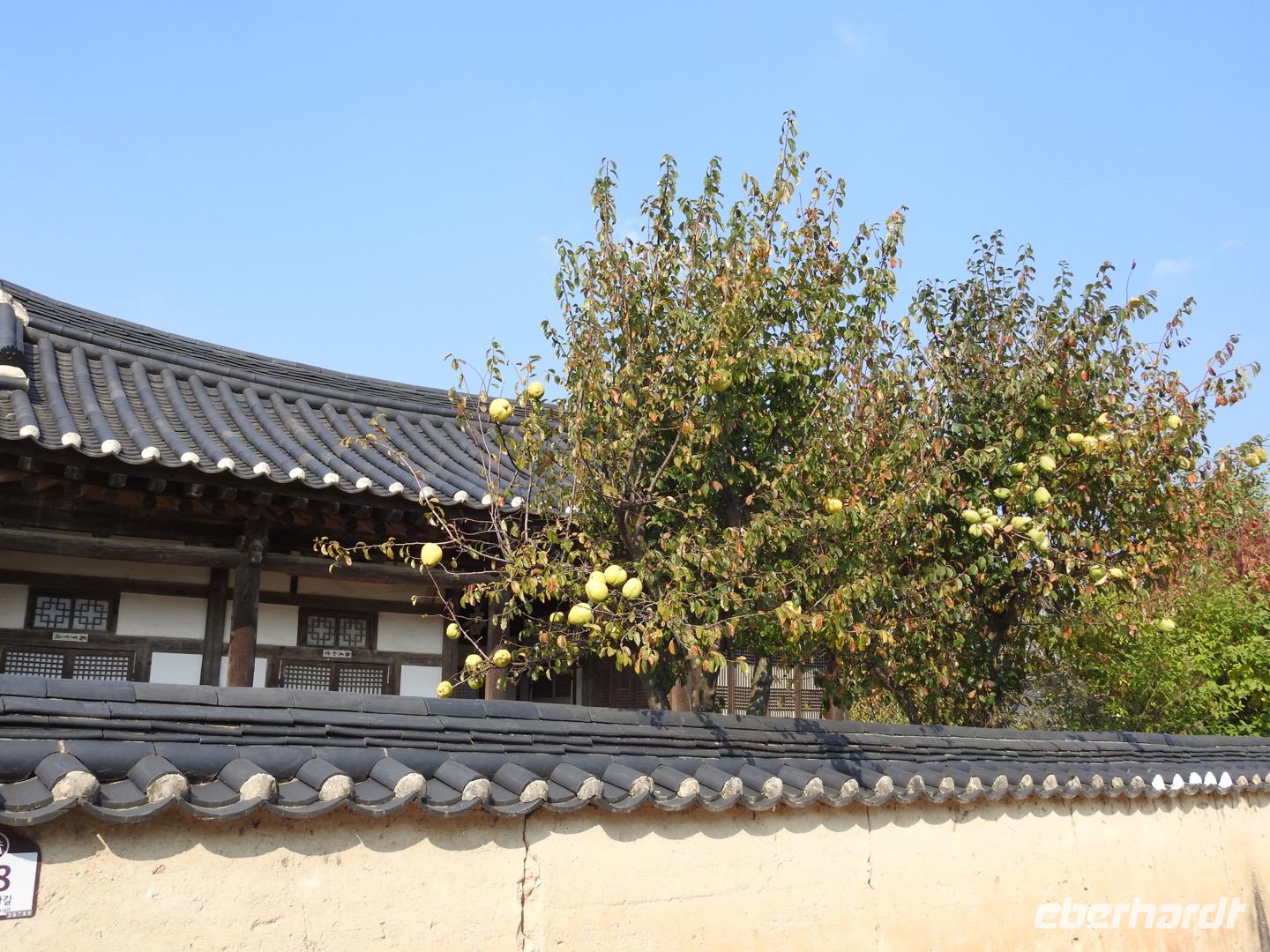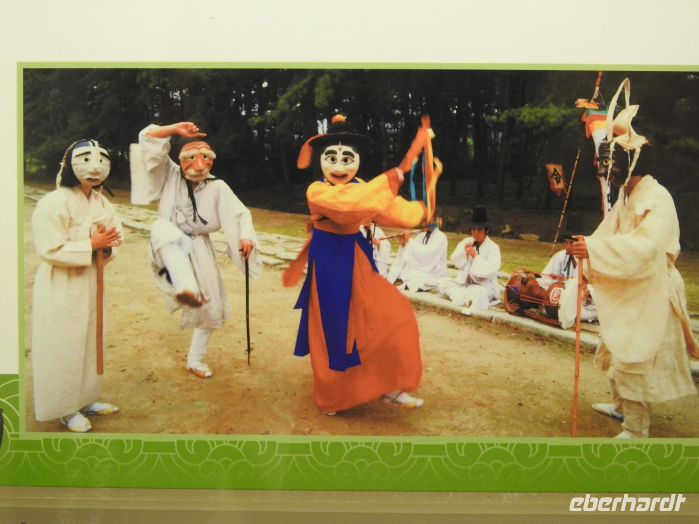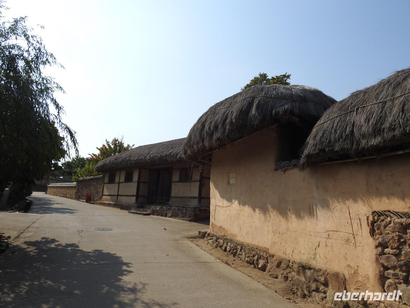 Wir besuchen das Hahoe-Dorf in Andong. Es scheint als wären wir die einzigen Gäste heute. Die Suche nach einem schnellen und preiswerten Mittagessen gestaltet sich komplizierter als gedacht, dennoch können wir uns bald an einer leckeren und liebevoll zubereiteten Nudelsuppe laben. Nun beginnt unser Rundgang durch das Hahoe-Dorf, dass seit 600 Jahren von einer einzigen Familie bewohnt wird. Heute muss man, wenn man das Dorf besichtigen will, Eintritt bezahlen. Viele Häuser stehen leer, einige sind noch bewohnt. Uns erwartet ein besonderes Erlebnis. Zwei Männer, die aus diesem Dorf stammen, sind kürzlich zu Bürgermeistern gewählt worden. Heute sind sie nach Hause gekommen, um ihren Ahnen für ihren Erfolg zu danken. Dies erfolgt in einer Zeremonie im Geisthaus. Als sie mitbekommen, dass wir ihnen mit unseren Fotoapparaten auf den Fersen sind, laden sie uns freundlich ein, an der Zeremonie teilzunehmen. Die Männer sind in traditionelle Kittel gekleidet und außer den Bürgermeistern sind noch einige andere, ähnlich gekleidete, Männer anwesend. Sie nehmen barfuß auf einer Strohmatte vor dem Geisthaus Aufstellung. Drinnen werden Räucherstäbchen angezündet, eine Obstschale ist aufgestellt und per Gesang und vielen Verbeugungen werden die Ahnen informiert. Nach der Zeremonie verlassen die Männer ganz unspektakulär das Gelände und es wird aufgeräumt. Als die Obstschale weggetragen wird, dürfen wir von den Opfergaben naschen.