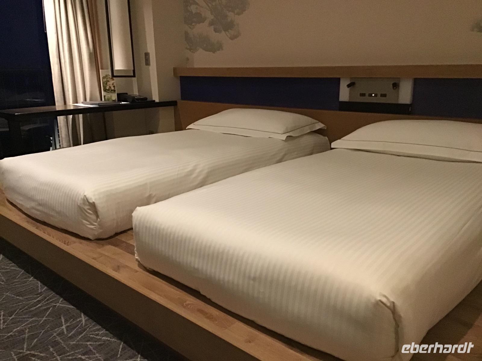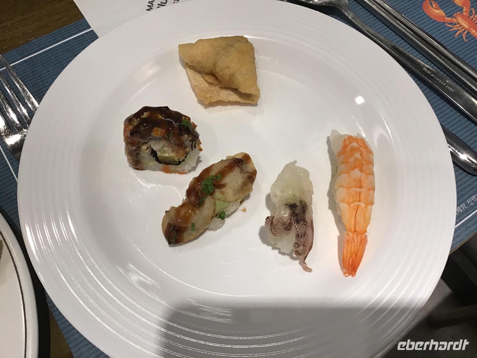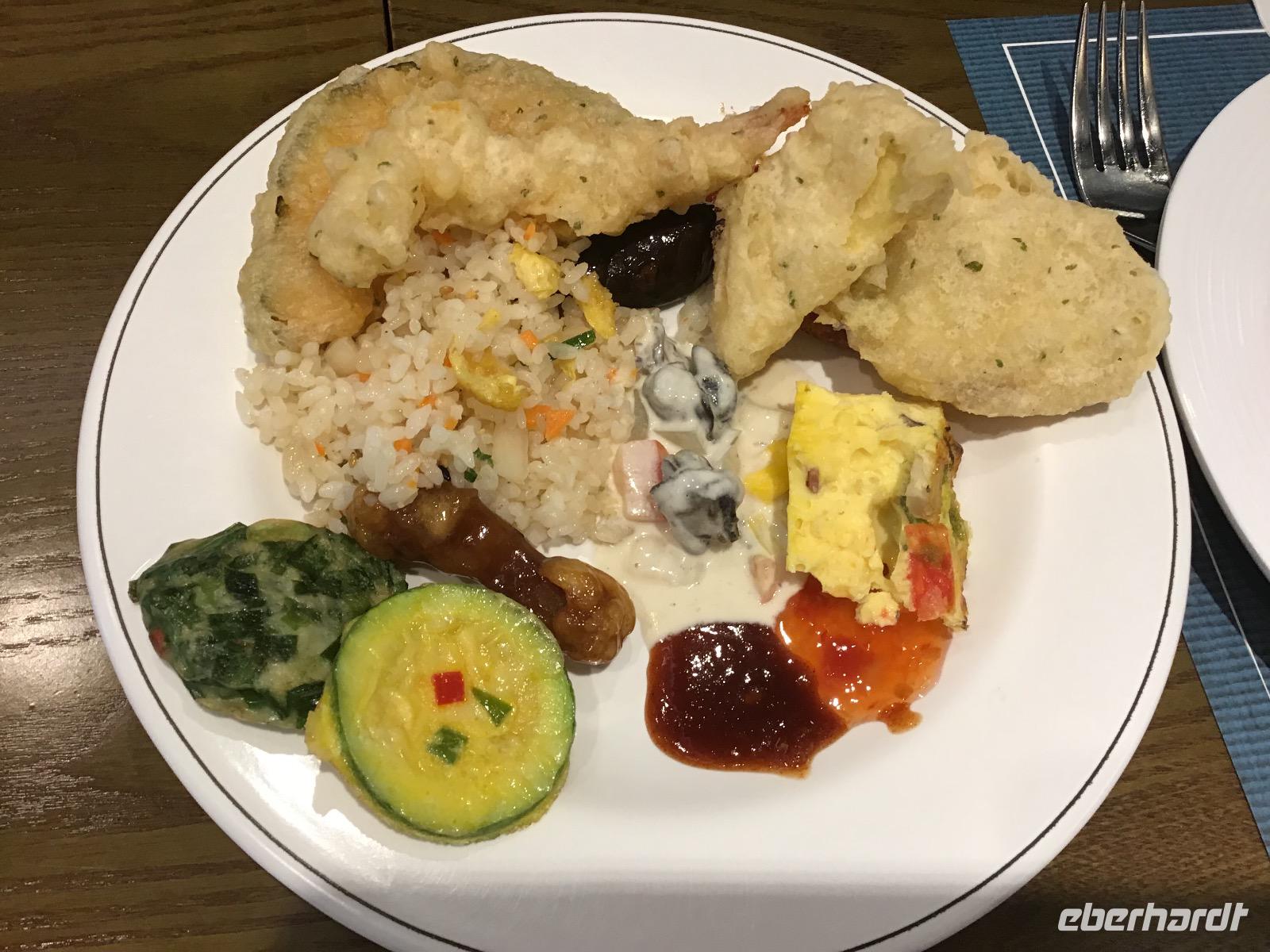 Das Abendessen nehmen wir im Hotelrestaurant ein. Am Buffet gibt es feine japanische Speisen, aber auch Nudeln mit Tomatensoße.