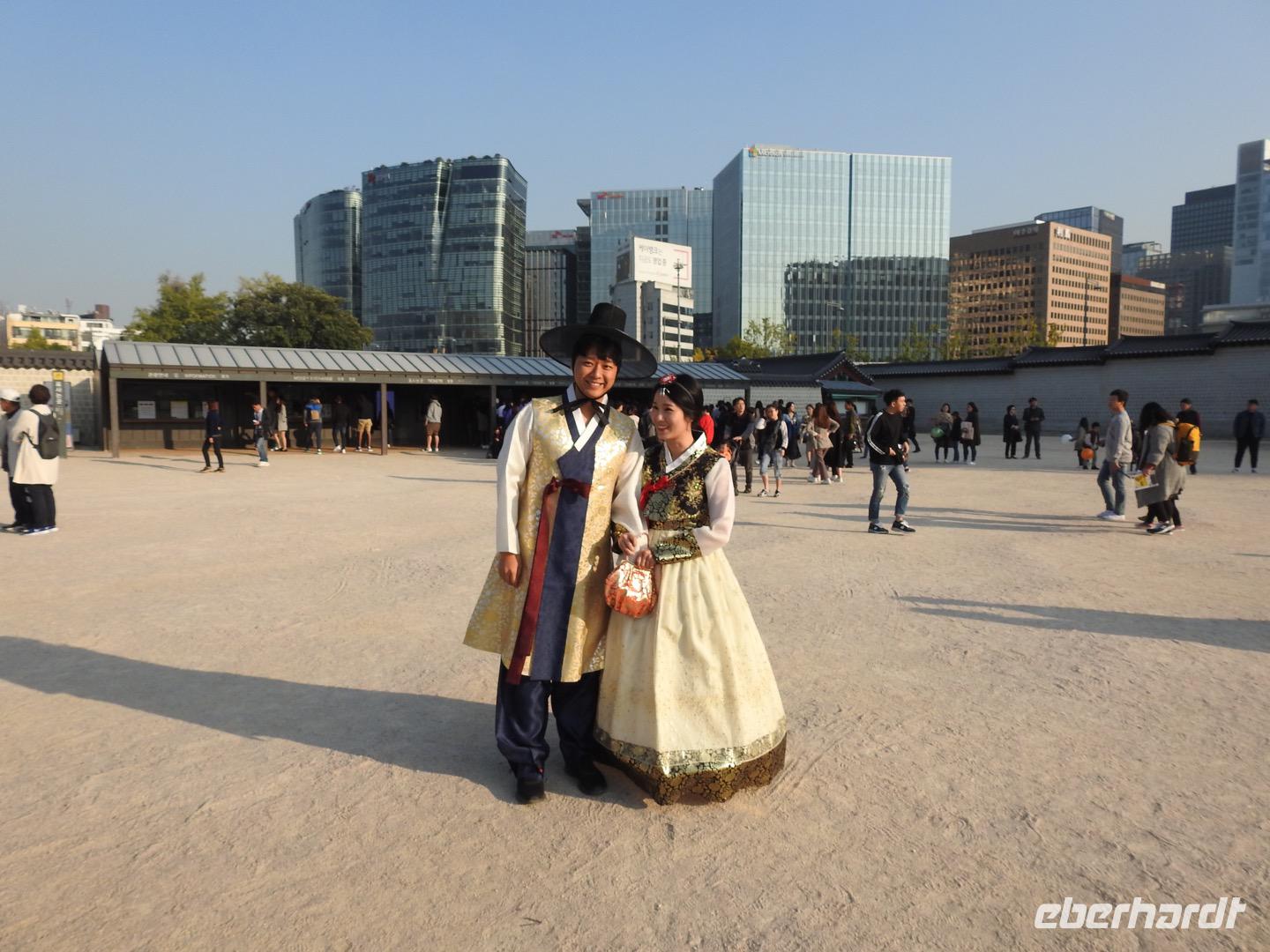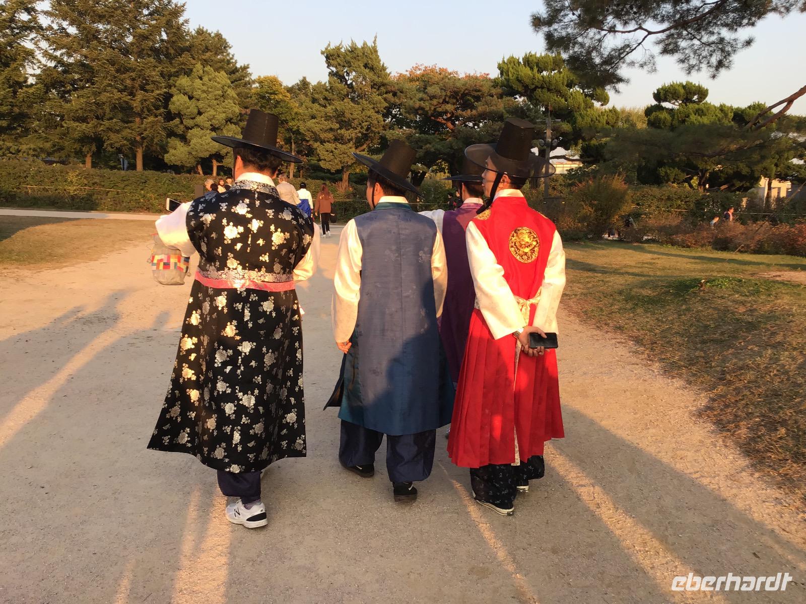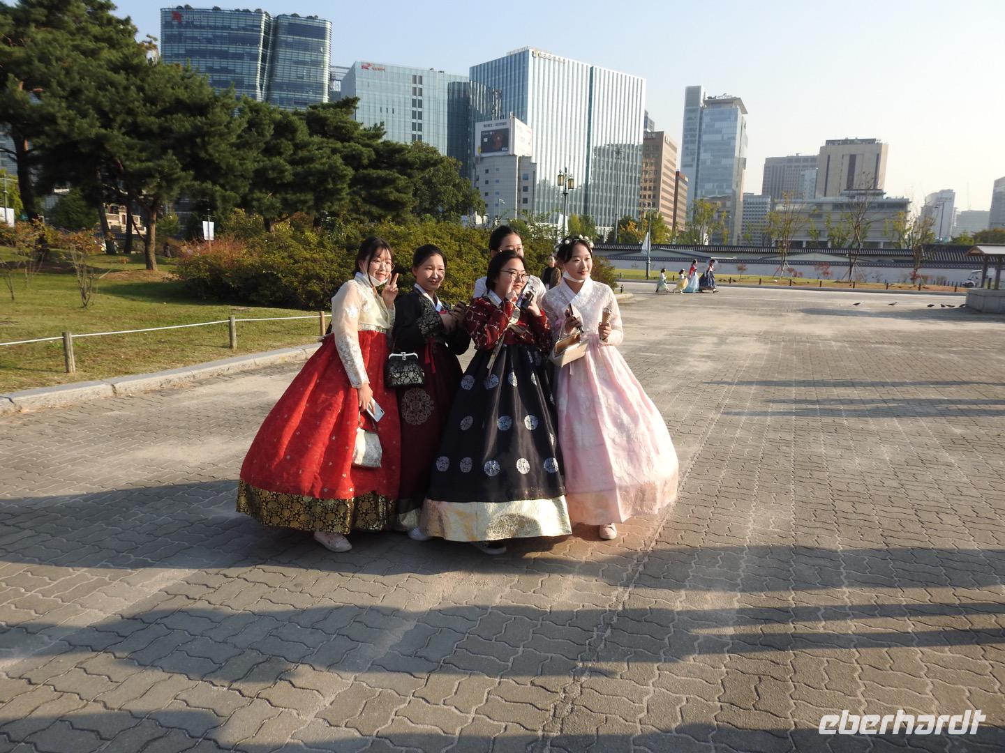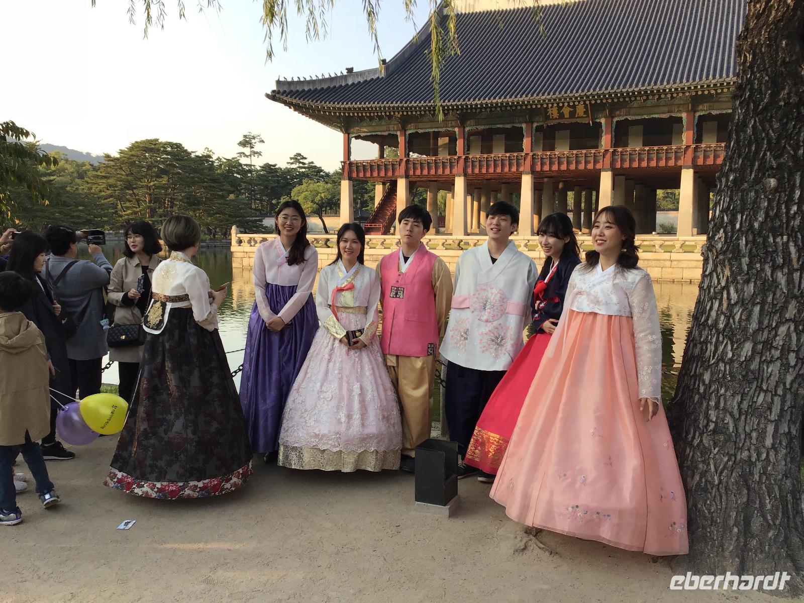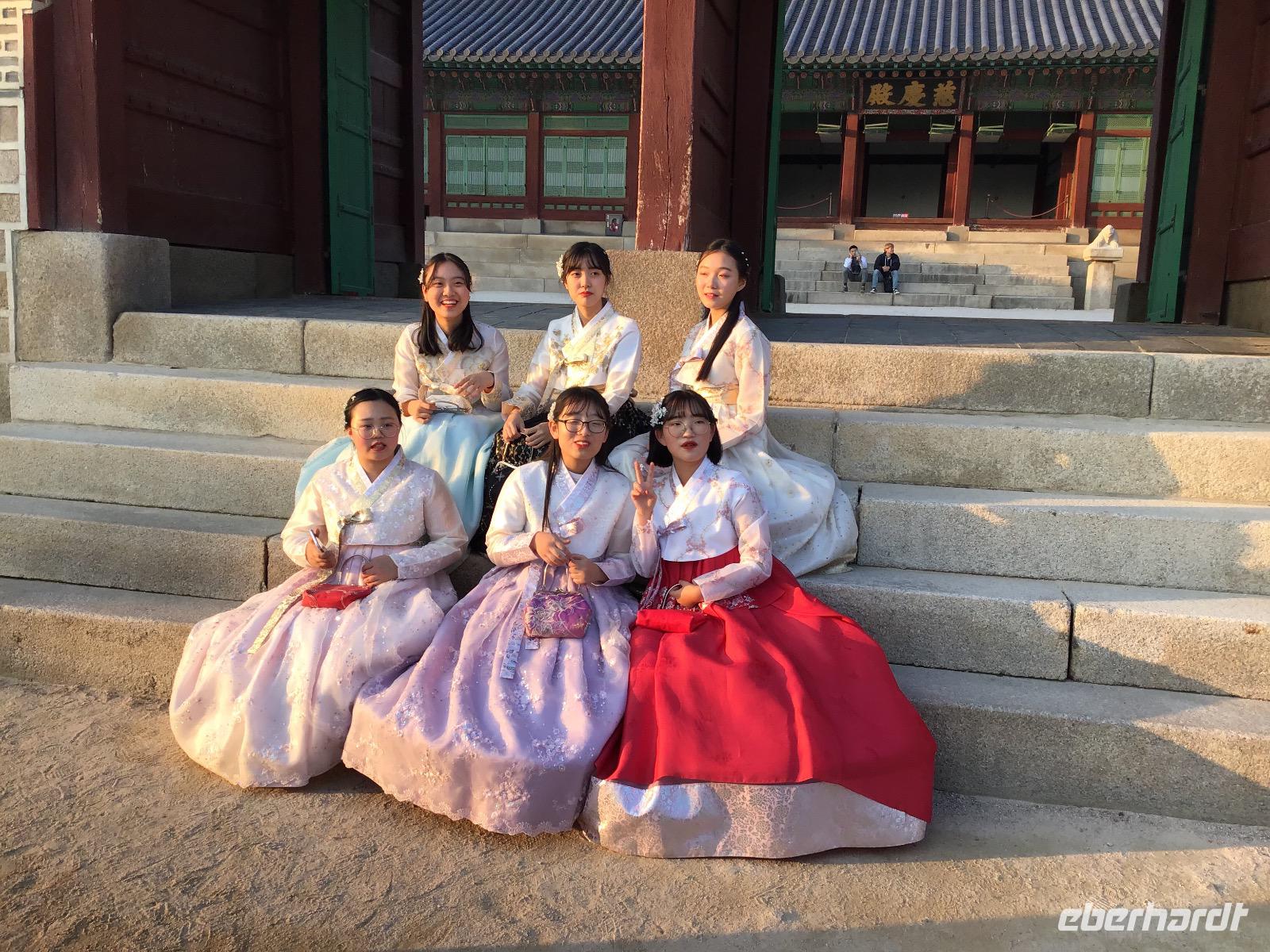 O.K. - das mit dem Weckruf war wohl nichts. Jedenfalls hat bei mir das Telefon nicht geklingelt. Ich bin trotzdem wach, wie immer, wenn es ans Fliegen oder Weiterreisen geht. Jedoch mache ich mir Sorgen, ob auch alle anderen einen eigenen Wecker haben. Ich bin also, rein vorsorglich, schon fünfzehn Minuten vor der Zeit an der Rezeption und erkundige mich bei dem Nachtwächter, was denn mit unserem Weckruf sei. Erstaunt meint er, es wäre noch nicht so weit. Gut, dann bitte jetzt. Nach und nach treffen die Reisenden unserer Gruppe ein. Der Bus, der uns zum Flughafen bringt, ist auch schon da. Jedoch vermissen wir einen Gast. Nach einiger Aufregung gelingt es uns aber, auch den letzten Passagier zu wecken und pünktlich zum Flughafen zu fahren. Beim Einchecken müssen wir hier eine Besonderheit beachten. Nachdem wir die Koffer aufgegeben haben, müssen wir noch am Ende der Schalterreihe warten. Auf einem Bildschirm ist zu erkennen, welcher Koffer durchleuchtet wurde. Sollte etwas Verdächtiges entdeckt werden, wäre hier noch die Chance, das Objekt (zum Beispiel eine Powerbank) aus dem aufgegebenen Gepäck zu entfernen. Uns betrifft das nicht, alle Koffer gehen durch. Nun verabschieden wir uns vom immer freundlichen Li, verputzen unsere Lunchpakete und fliegen nach Seoul. Im Flugzeug werden Einreisekarte und Zollerklärung ausgeteilt und dank guter Vorbereitung gibt es auch keine Probleme beim Ausfüllen. Bei Ankunft werden wir von Ko begrüßt, die uns in den nächsten Tagen in Südkorea begleiten wird. Bis zum Hotel sind es circa 80 Minuten, wir checken ein und gönnen uns eine Stunde Pause. Nun besuchen wir den Gyeong-Palast. Neben den wirklich beeindruckenden Gebäuden, begeistern wir uns aber für die vielen Menschen, die in der traditionellen koreanischen Tracht Hanbok unterwegs sind. Wir können uns kaum satt fotografieren, so schön sehen sie alle aus. Im Anschluss daran besuchen wir noch das Volkskundemuseum. Am Abend kehren wir ins Choi de kam - Restaurant ein, wo wir Chabu Chabu essen, was bedeutet, dass wir die gereichten Zutaten wie Chinakohl, Pilze, Nudeln und Rindfleisch eigenständig kochen und zwar in einem sich in der Mitte des Tisches befindlichen Topfes mit Bouillon.