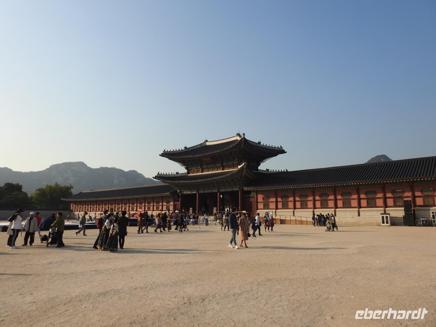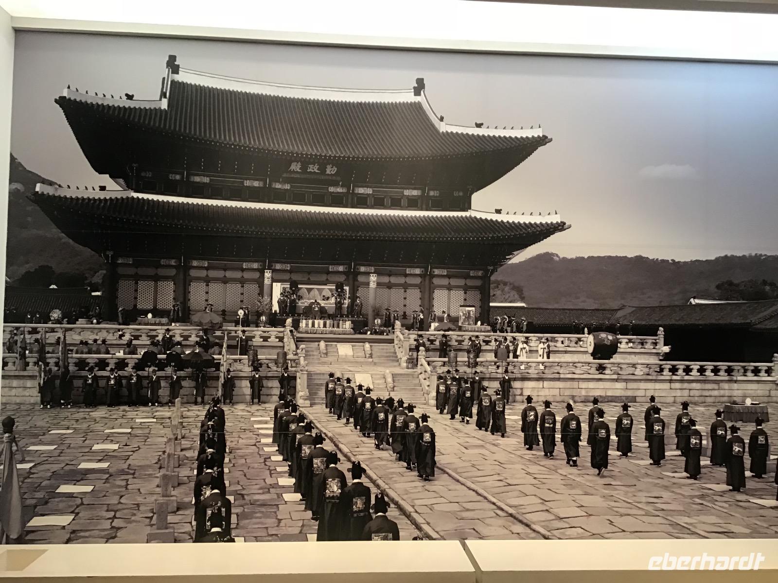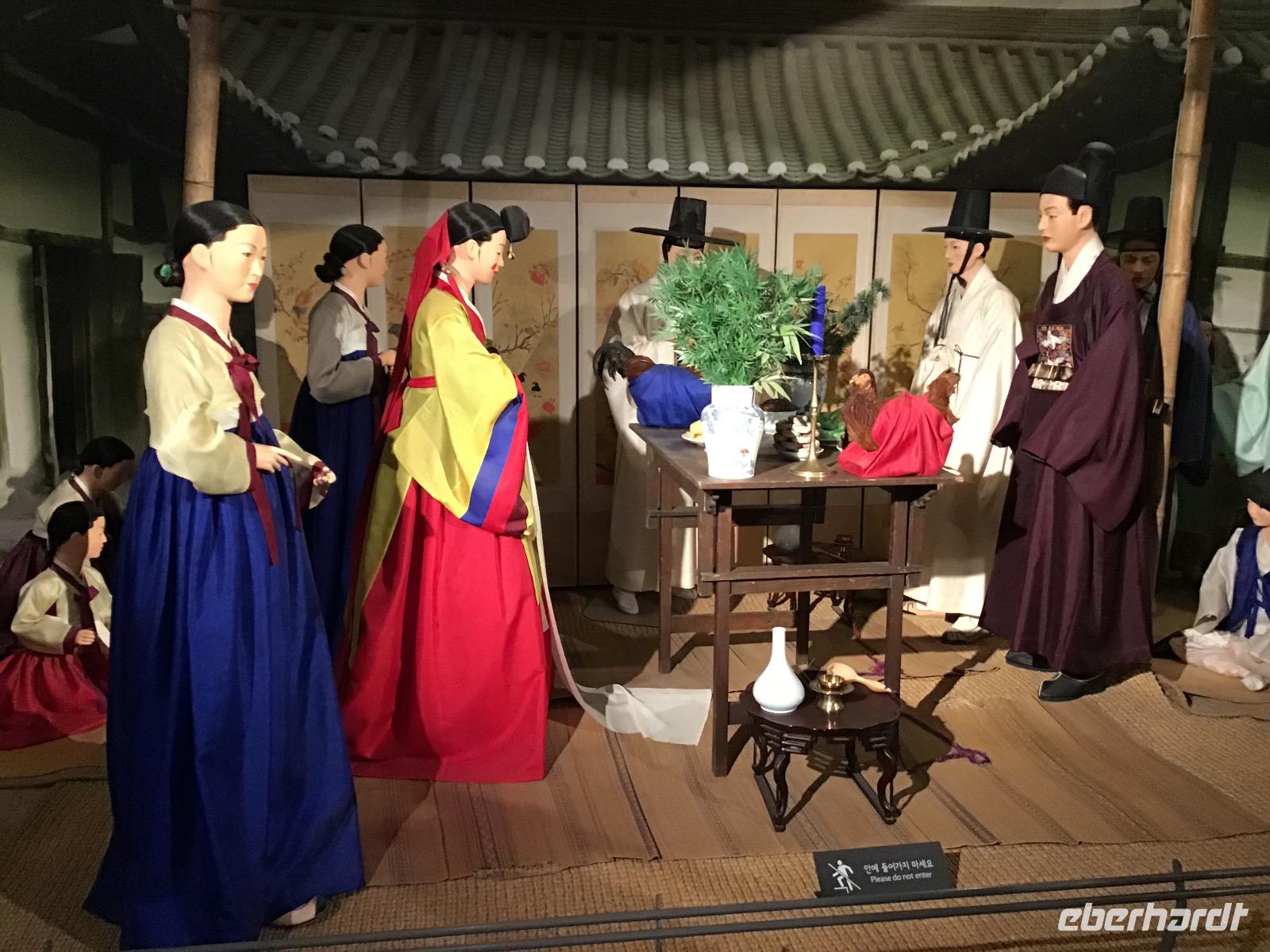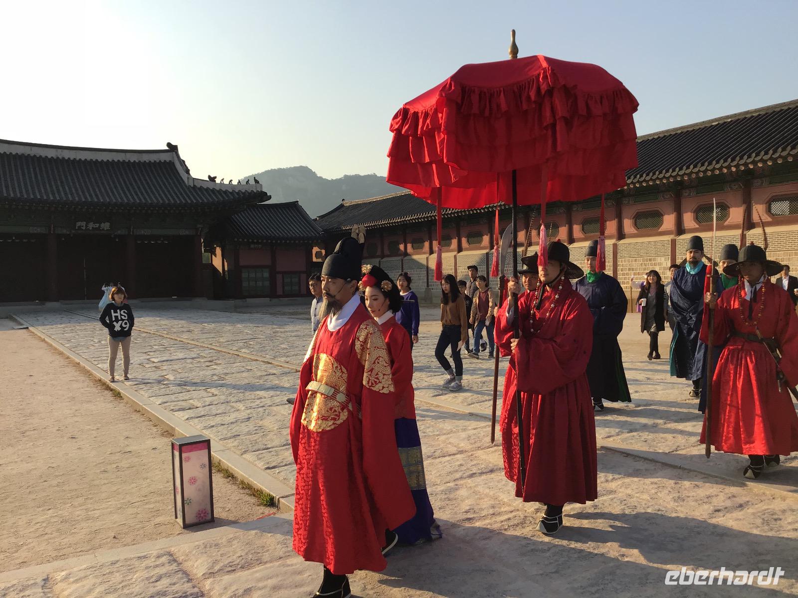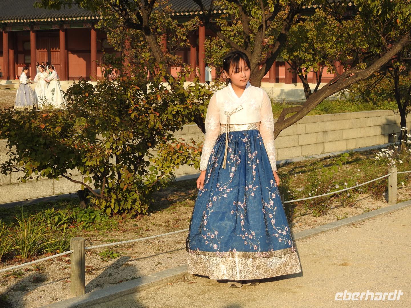 O.K. - das mit dem Weckruf war wohl nichts. Jedenfalls hat bei mir das Telefon nicht geklingelt. Ich bin trotzdem wach, wie immer, wenn es ans Fliegen oder Weiterreisen geht. Jedoch mache ich mir Sorgen, ob auch alle anderen einen eigenen Wecker haben. Ich bin also, rein vorsorglich, schon fünfzehn Minuten vor der Zeit an der Rezeption und erkundige mich bei dem Nachtwächter, was denn mit unserem Weckruf sei. Erstaunt meint er, es wäre noch nicht so weit. Gut, dann bitte jetzt. Nach und nach treffen die Reisenden unserer Gruppe ein. Der Bus, der uns zum Flughafen bringt, ist auch schon da. Jedoch vermissen wir einen Gast. Nach einiger Aufregung gelingt es uns aber, auch den letzten Passagier zu wecken und pünktlich zum Flughafen zu fahren. Beim Einchecken müssen wir hier eine Besonderheit beachten. Nachdem wir die Koffer aufgegeben haben, müssen wir noch am Ende der Schalterreihe warten. Auf einem Bildschirm ist zu erkennen, welcher Koffer durchleuchtet wurde. Sollte etwas Verdächtiges entdeckt werden, wäre hier noch die Chance, das Objekt (zum Beispiel eine Powerbank) aus dem aufgegebenen Gepäck zu entfernen. Uns betrifft das nicht, alle Koffer gehen durch. Nun verabschieden wir uns vom immer freundlichen Li, verputzen unsere Lunchpakete und fliegen nach Seoul. Im Flugzeug werden Einreisekarte und Zollerklärung ausgeteilt und dank guter Vorbereitung gibt es auch keine Probleme beim Ausfüllen. Bei Ankunft werden wir von Ko begrüßt, die uns in den nächsten Tagen in Südkorea begleiten wird. Bis zum Hotel sind es circa 80 Minuten, wir checken ein und gönnen uns eine Stunde Pause. Nun besuchen wir den Gyeong-Palast. Neben den wirklich beeindruckenden Gebäuden, begeistern wir uns aber für die vielen Menschen, die in der traditionellen koreanischen Tracht Hanbok unterwegs sind. Wir können uns kaum satt fotografieren, so schön sehen sie alle aus. Im Anschluss daran besuchen wir noch das Volkskundemuseum. Am Abend kehren wir ins Choi de kam - Restaurant ein, wo wir Chabu Chabu essen, was bedeutet, dass wir die gereichten Zutaten wie Chinakohl, Pilze, Nudeln und Rindfleisch eigenständig kochen und zwar in einem sich in der Mitte des Tisches befindlichen Topfes mit Bouillon.