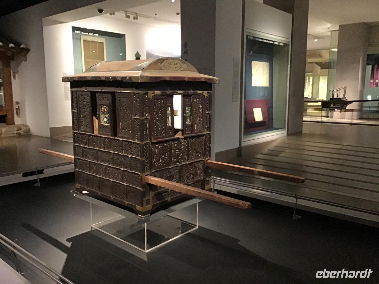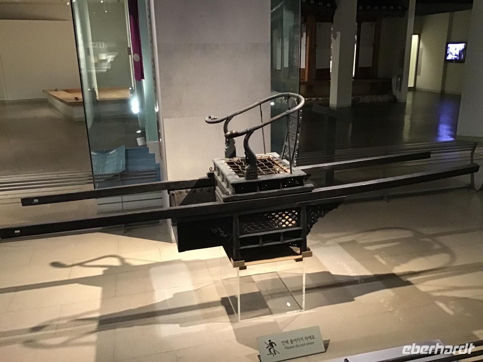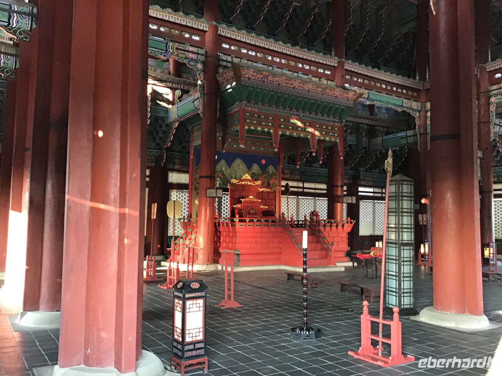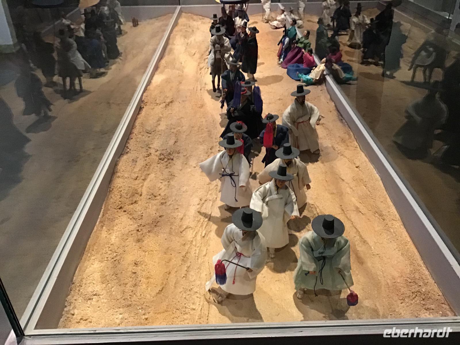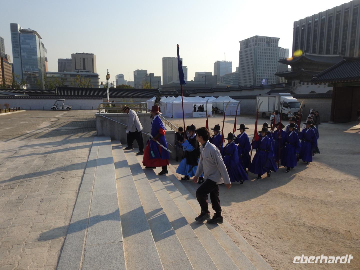 O.K. - das mit dem Weckruf war wohl nichts. Jedenfalls hat bei mir das Telefon nicht geklingelt. Ich bin trotzdem wach, wie immer, wenn es ans Fliegen oder Weiterreisen geht. Jedoch mache ich mir Sorgen, ob auch alle anderen einen eigenen Wecker haben. Ich bin also, rein vorsorglich, schon fünfzehn Minuten vor der Zeit an der Rezeption und erkundige mich bei dem Nachtwächter, was denn mit unserem Weckruf sei. Erstaunt meint er, es wäre noch nicht so weit. Gut, dann bitte jetzt. Nach und nach treffen die Reisenden unserer Gruppe ein. Der Bus, der uns zum Flughafen bringt, ist auch schon da. Jedoch vermissen wir einen Gast. Nach einiger Aufregung gelingt es uns aber, auch den letzten Passagier zu wecken und pünktlich zum Flughafen zu fahren. Beim Einchecken müssen wir hier eine Besonderheit beachten. Nachdem wir die Koffer aufgegeben haben, müssen wir noch am Ende der Schalterreihe warten. Auf einem Bildschirm ist zu erkennen, welcher Koffer durchleuchtet wurde. Sollte etwas Verdächtiges entdeckt werden, wäre hier noch die Chance, das Objekt (zum Beispiel eine Powerbank) aus dem aufgegebenen Gepäck zu entfernen. Uns betrifft das nicht, alle Koffer gehen durch. Nun verabschieden wir uns vom immer freundlichen Li, verputzen unsere Lunchpakete und fliegen nach Seoul. Im Flugzeug werden Einreisekarte und Zollerklärung ausgeteilt und dank guter Vorbereitung gibt es auch keine Probleme beim Ausfüllen. Bei Ankunft werden wir von Ko begrüßt, die uns in den nächsten Tagen in Südkorea begleiten wird. Bis zum Hotel sind es circa 80 Minuten, wir checken ein und gönnen uns eine Stunde Pause. Nun besuchen wir den Gyeong-Palast. Neben den wirklich beeindruckenden Gebäuden, begeistern wir uns aber für die vielen Menschen, die in der traditionellen koreanischen Tracht Hanbok unterwegs sind. Wir können uns kaum satt fotografieren, so schön sehen sie alle aus. Im Anschluss daran besuchen wir noch das Volkskundemuseum. Am Abend kehren wir ins Choi de kam - Restaurant ein, wo wir Chabu Chabu essen, was bedeutet, dass wir die gereichten Zutaten wie Chinakohl, Pilze, Nudeln und Rindfleisch eigenständig kochen und zwar in einem sich in der Mitte des Tisches befindlichen Topfes mit Bouillon.
