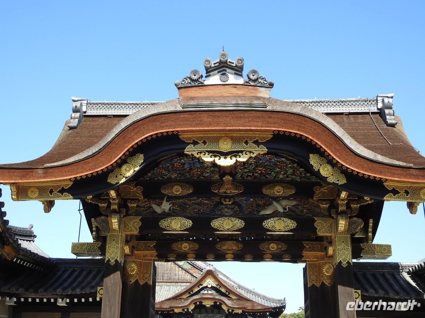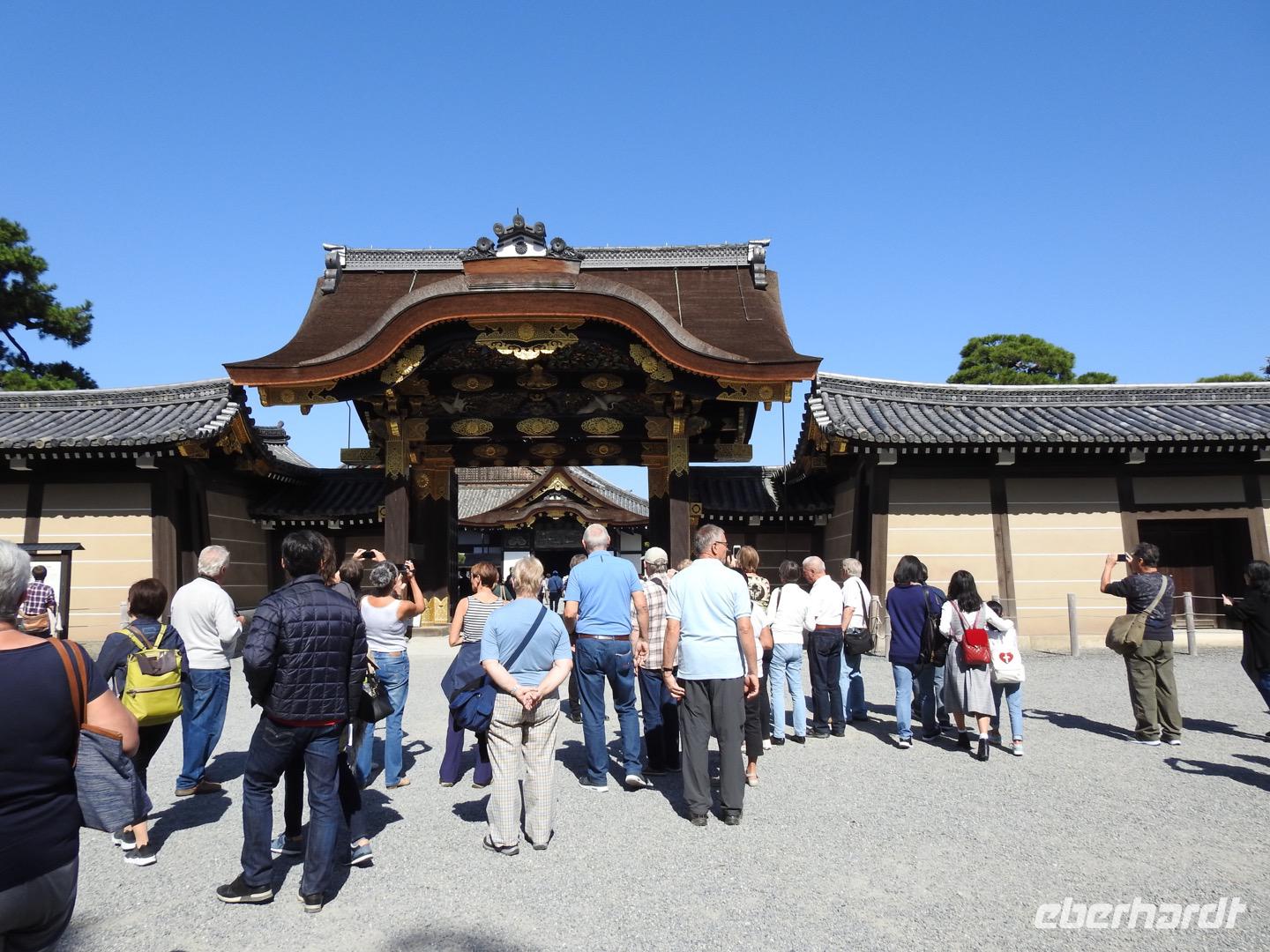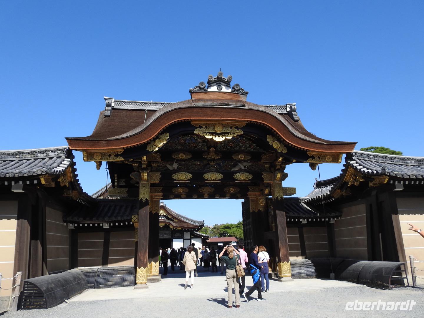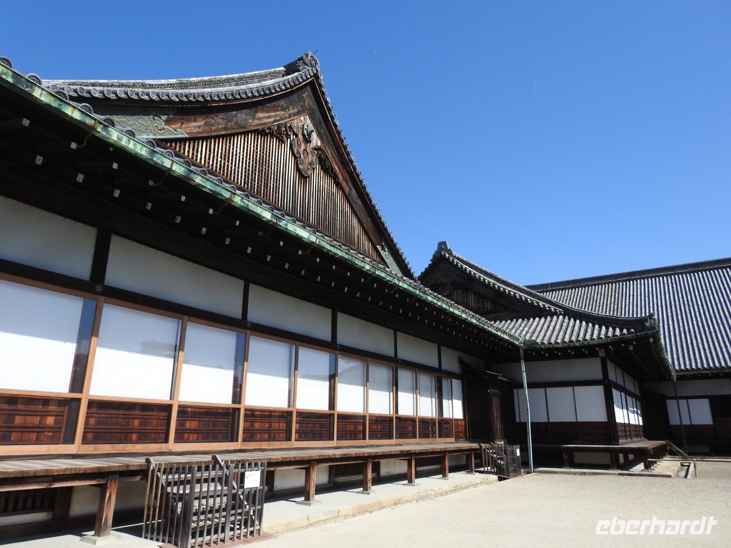 Wir besuchen jetzt die Nijo-Burg und der berühmte Nachtigallenflur, macht das, wofür er bekannt ist und quietscht bei jedem Schritt. Dies sollte ursprünglich dazu dienen, unerwarteten und eventuell unerwünschten Besuch anzukündigen. Wir laufen die L-förmig angelegten Räume entlang, in denen vor allem die kunstvoll bemalten Wände begeistern.