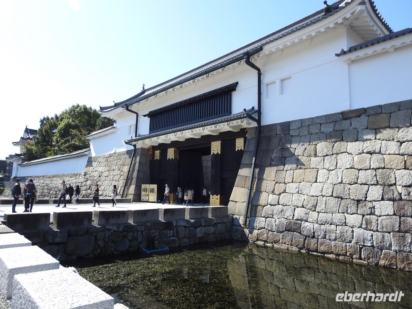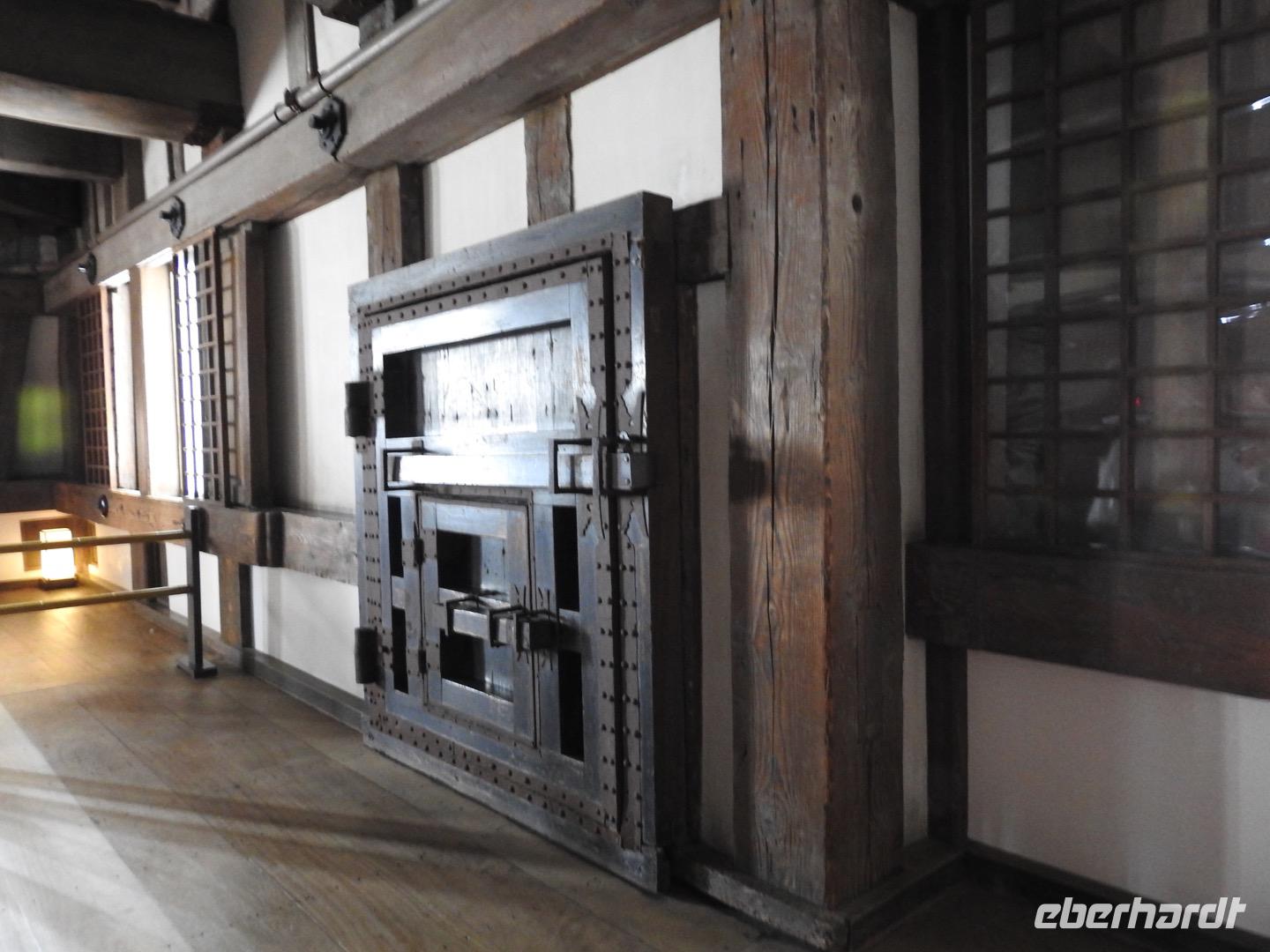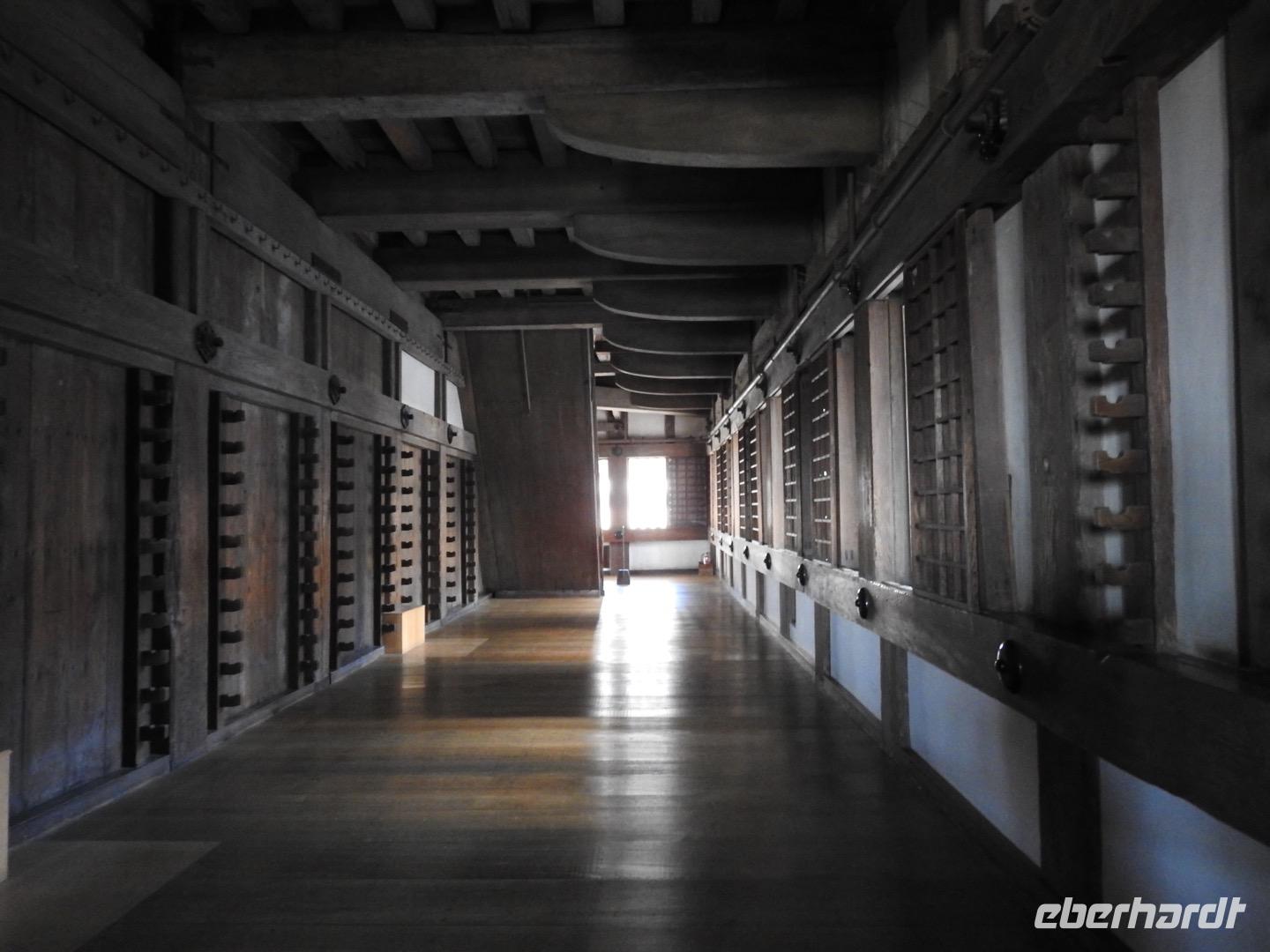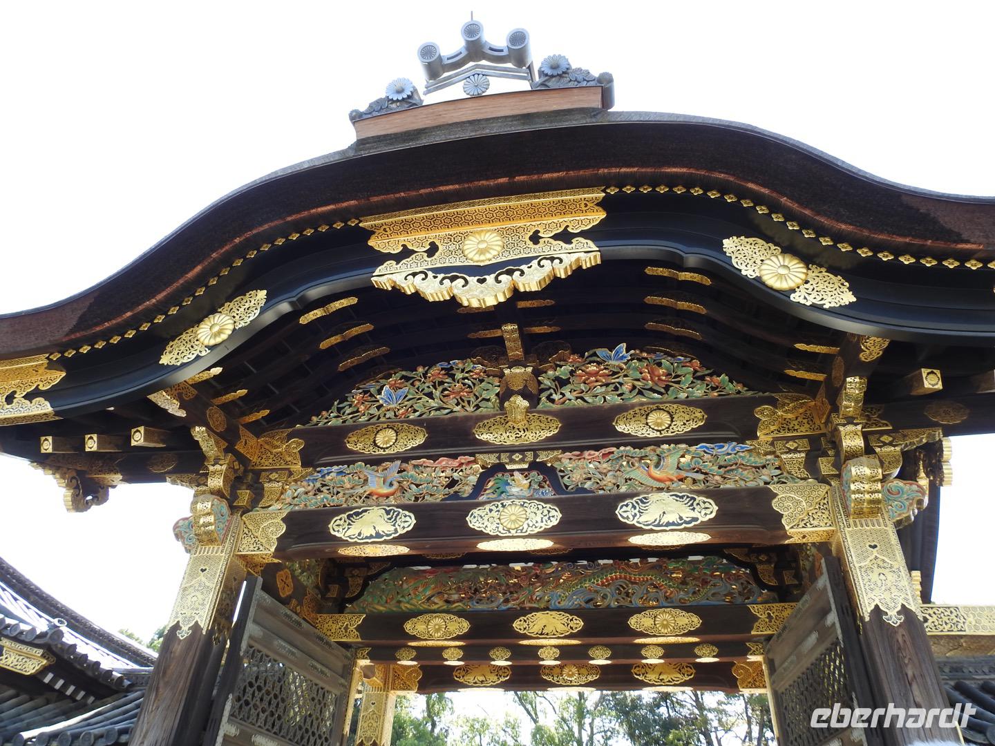 Wir besuchen jetzt die Nijo-Burg und der berühmte Nachtigallenflur, macht das, wofür er bekannt ist und quietscht bei jedem Schritt. Dies sollte ursprünglich dazu dienen, unerwarteten und eventuell unerwünschten Besuch anzukündigen. Wir laufen die L-förmig angelegten Räume entlang, in denen vor allem die kunstvoll bemalten Wände begeistern.