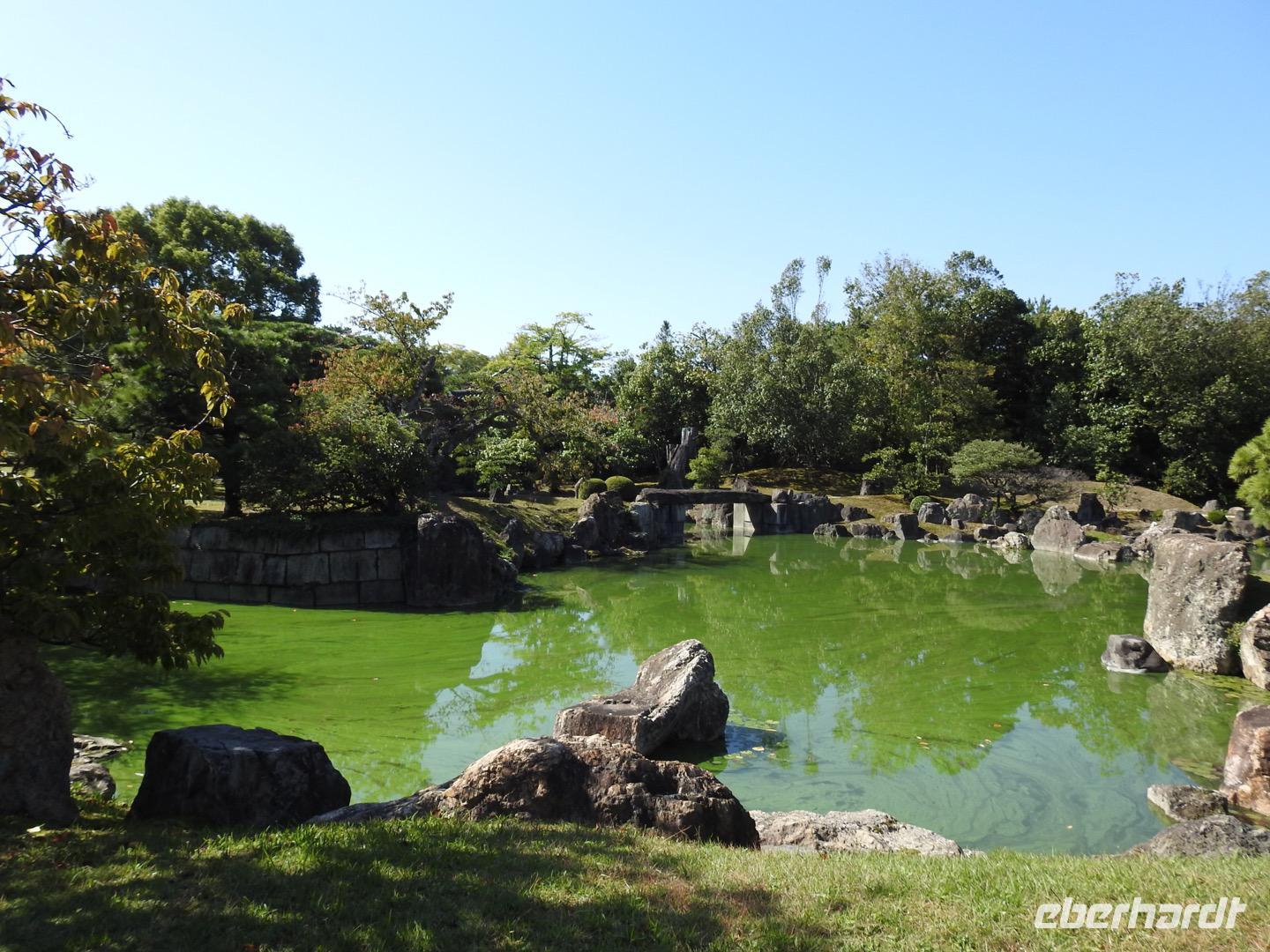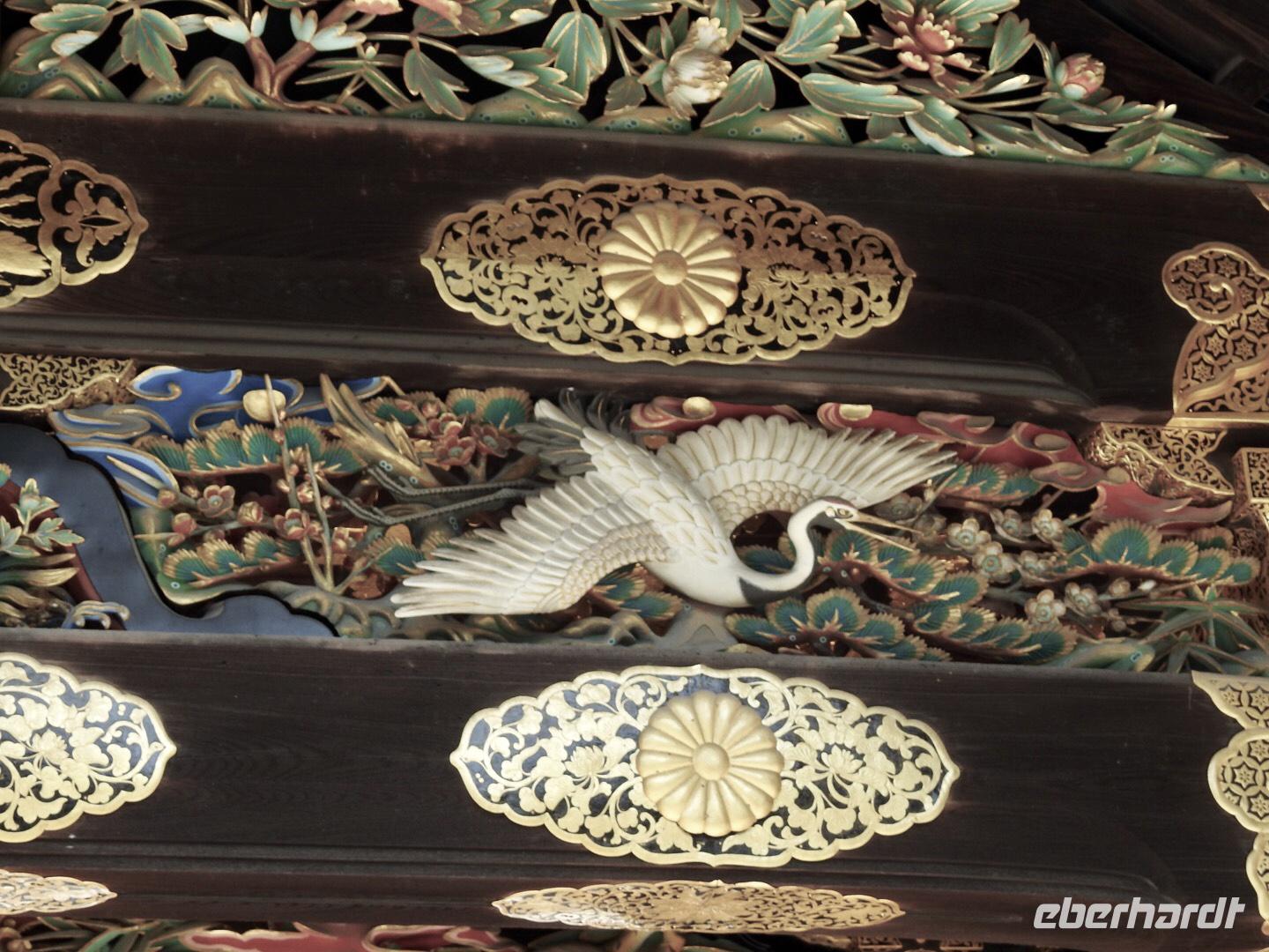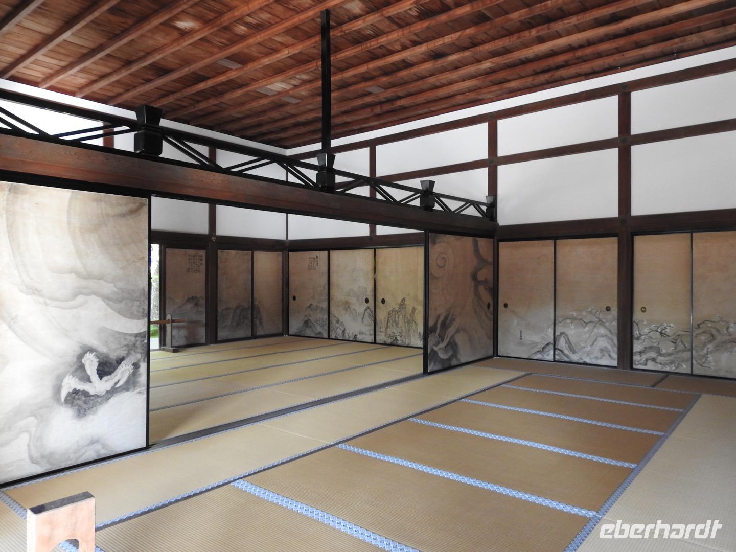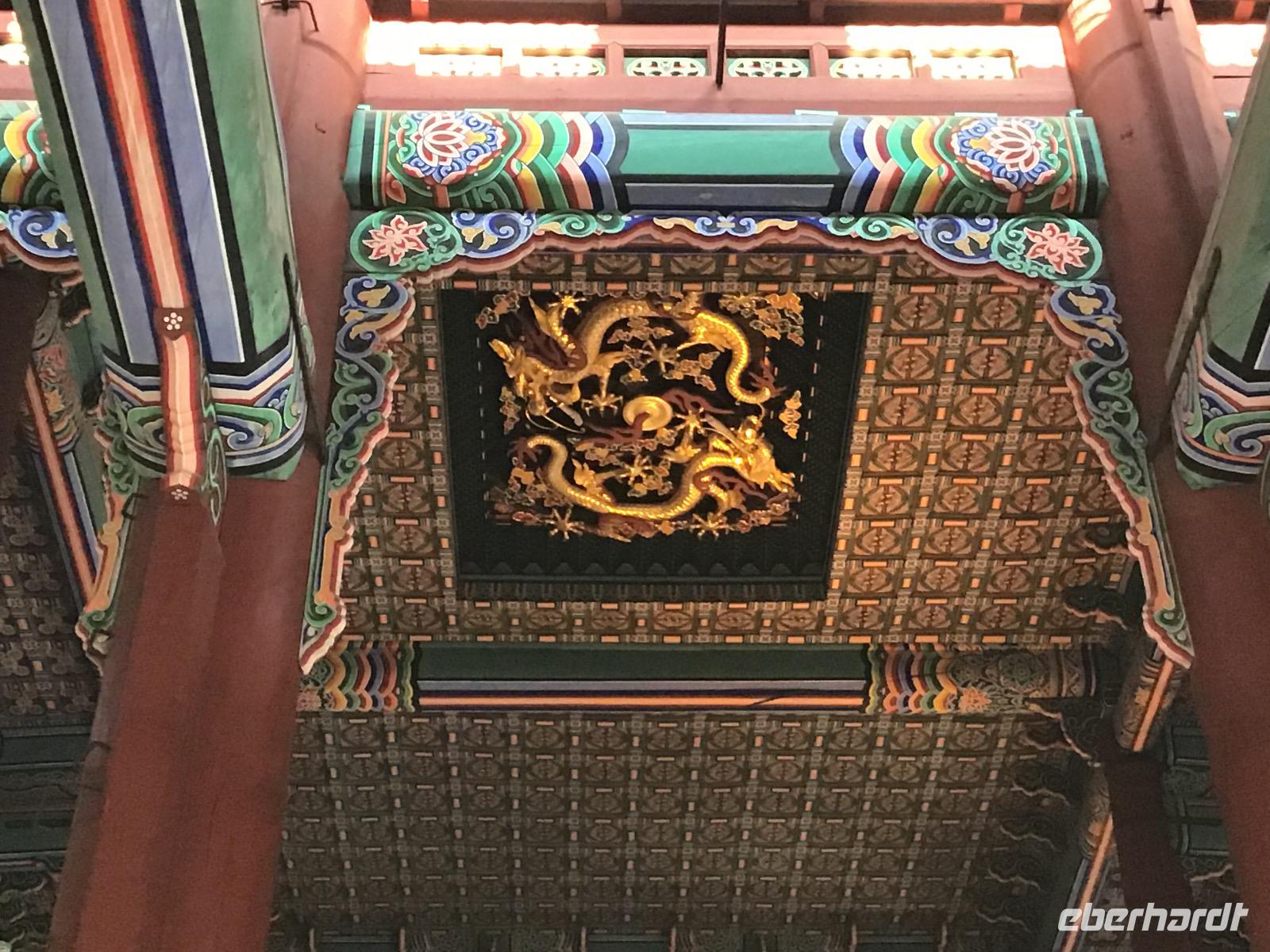 Wir besuchen jetzt die Nijo-Burg und der berühmte Nachtigallenflur, macht das, wofür er bekannt ist und quietscht bei jedem Schritt. Dies sollte ursprünglich dazu dienen, unerwarteten und eventuell unerwünschten Besuch anzukündigen. Wir laufen die L-förmig angelegten Räume entlang, in denen vor allem die kunstvoll bemalten Wände begeistern.