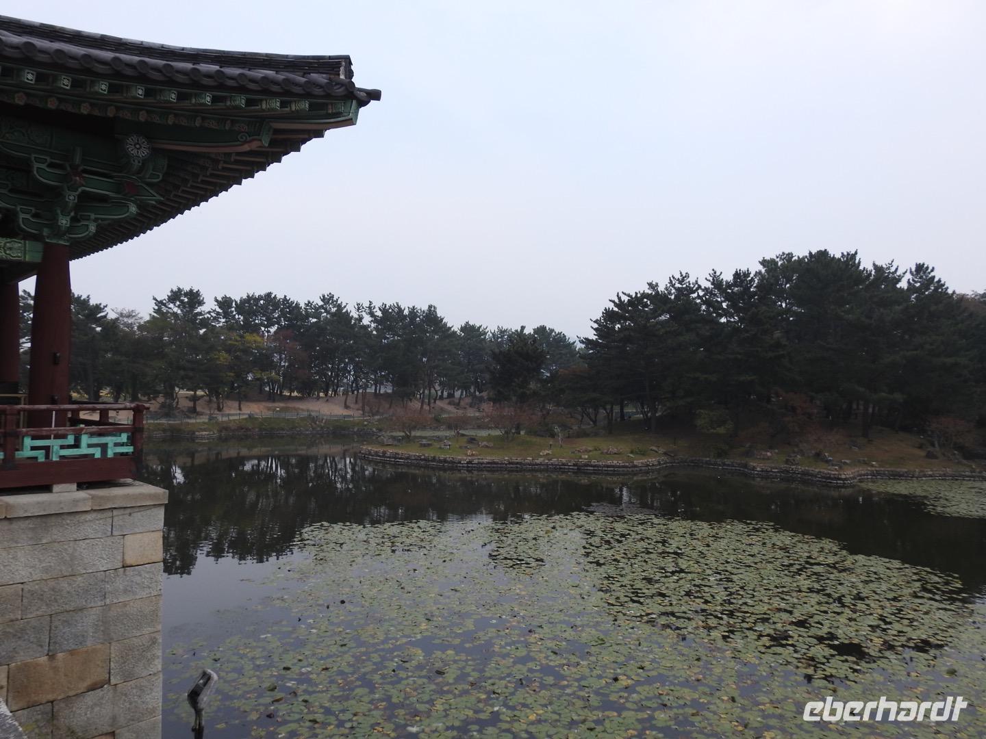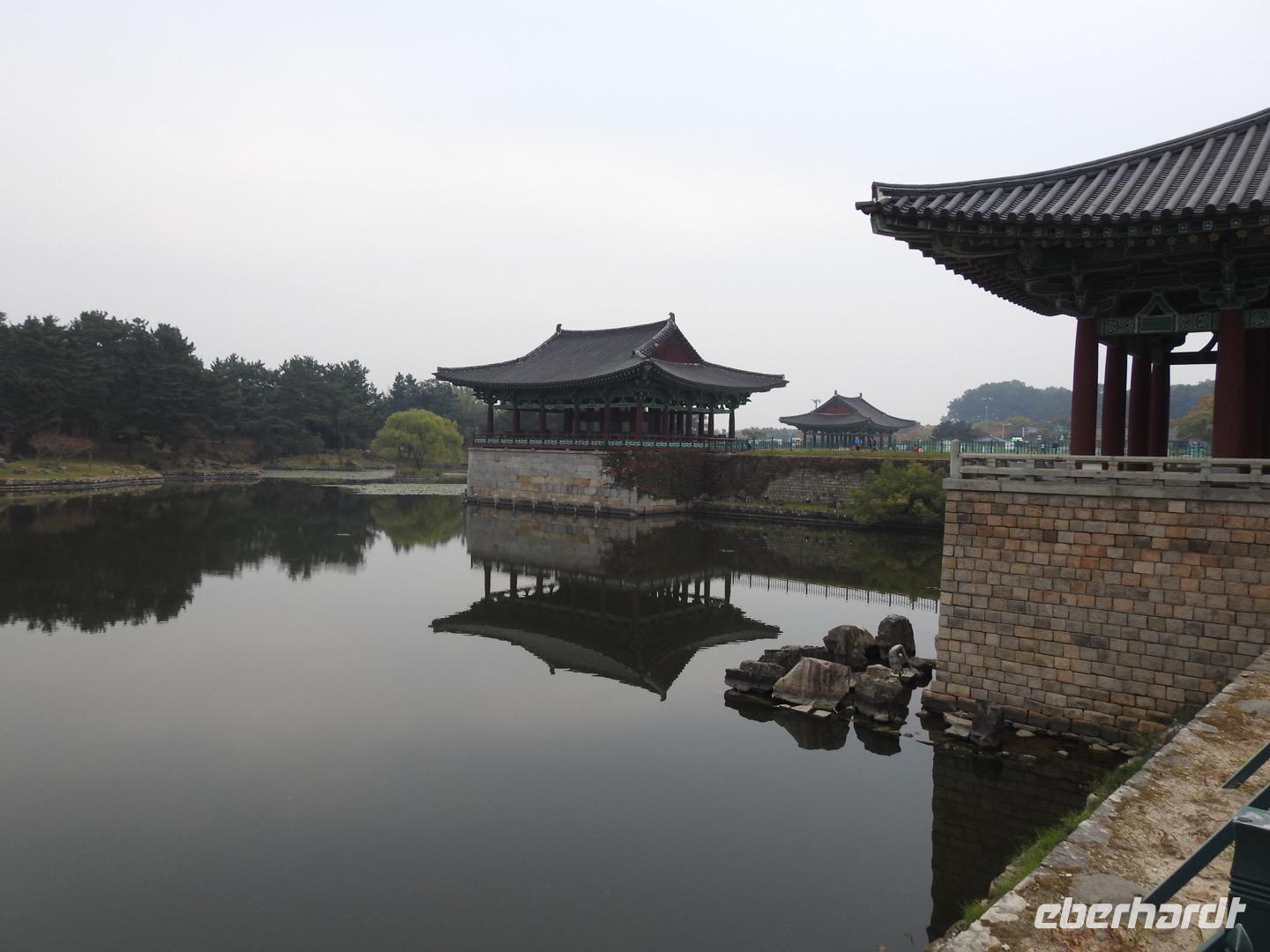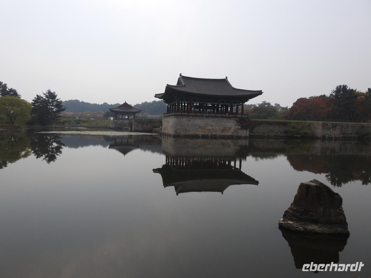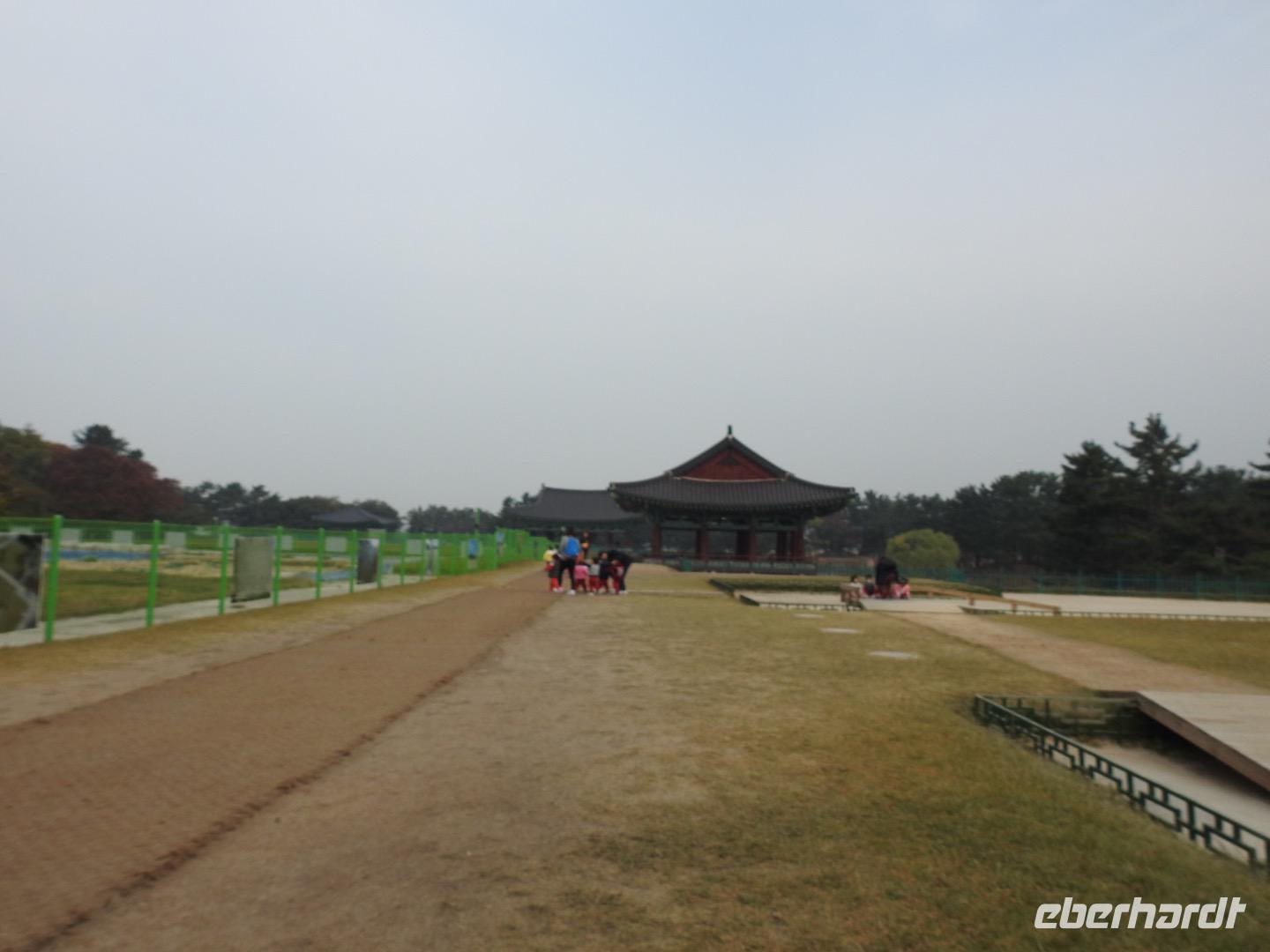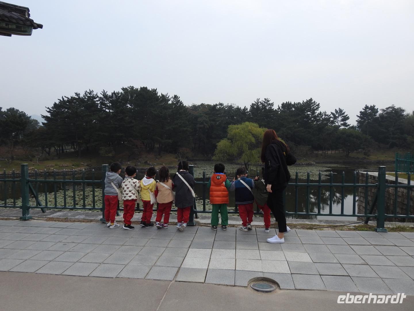 146 Kilometer liegen vor uns. Es ist Herbst geworden. Nebelschwaden liegen über buntgefärbten Bäumen. Wir fahren nach Gyeongju, einst die Hauptstadt des Silla-Reiches. Im Jahr 676 war Gyeongju ein weltweit bedeutendes kulturelles Zentrum. Heute gibt es so viele historische Sehenswürdigkeiten, dass man die Gegend als Freilichtmuseum bezeichnet. Wir fahren zuerst zum Anapij Teich. Verwirrend ist hier die unterschiedliche Bezeichnung, manchmal taucht auch der Name Wolji auf. Wolji bedeutet: Teich, in dem sich der Mond spiegelt. Zu Zeiten des Silla Reiches stand hier eine Palastvilla, wo der Kronprinz wichtige Gäste empfing. Am Abend war alles schön beleuchtet und im Wasser spiegelte sich der Mond. Nach dem Untergang des Silla-Reiches verfiel die Anlage und Gänse und Enten ließen sich an dem schönen Teich nieder. Und das bedeutet Anapij: Gänse-Enten-Teich. Bis 1980 wurde der Name Anapij verwendet, dann fanden Archäologen ein Keramikgeschirr mit der Aufschrift Wolji und der Ort bekam seinen historischen Namen zurück. Wir spazieren durch den Park, mit uns eine Kindergartengruppe, deren Kleinen unser Herz erfreuen.