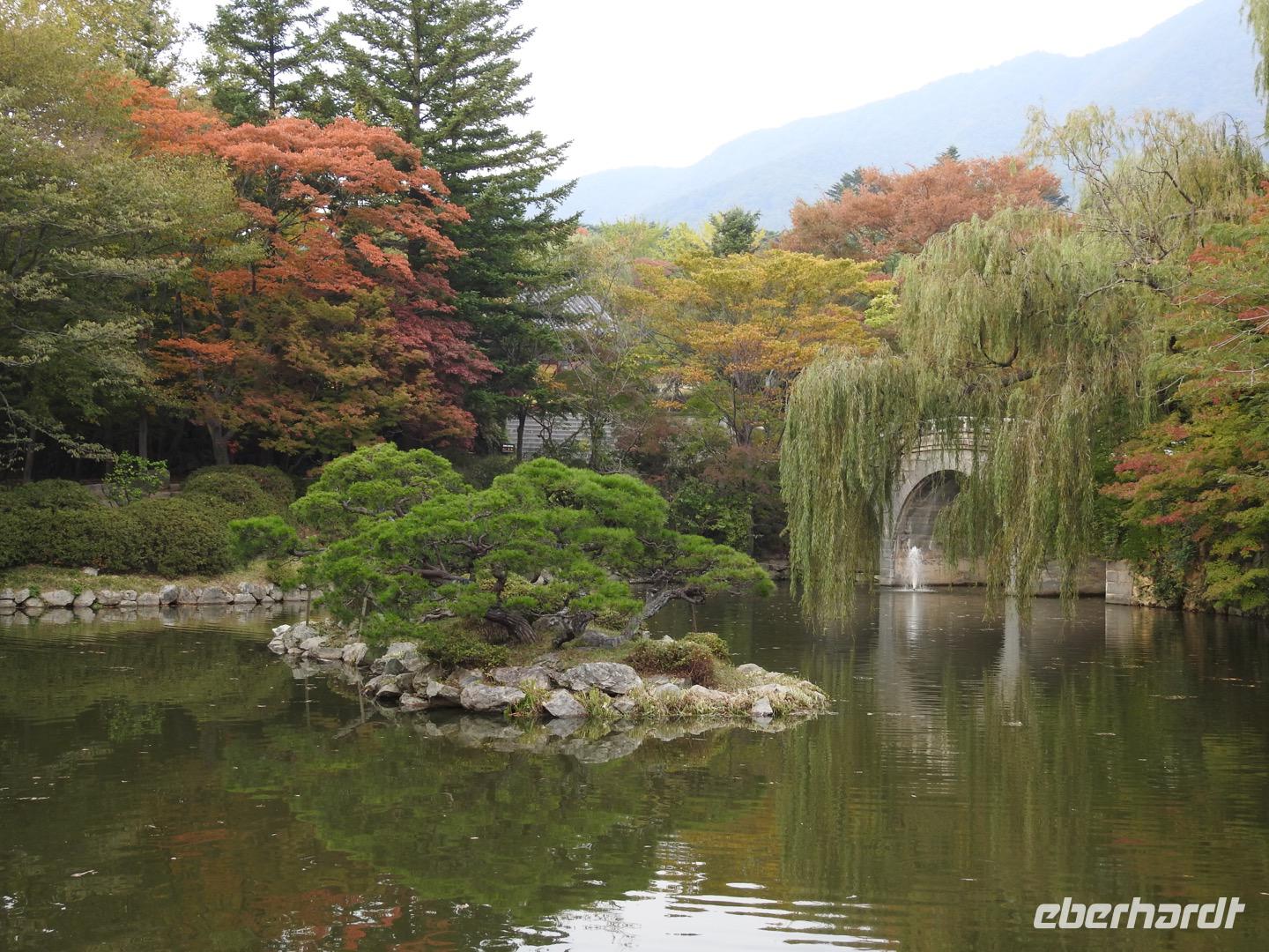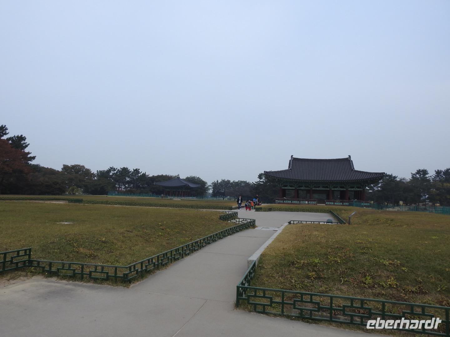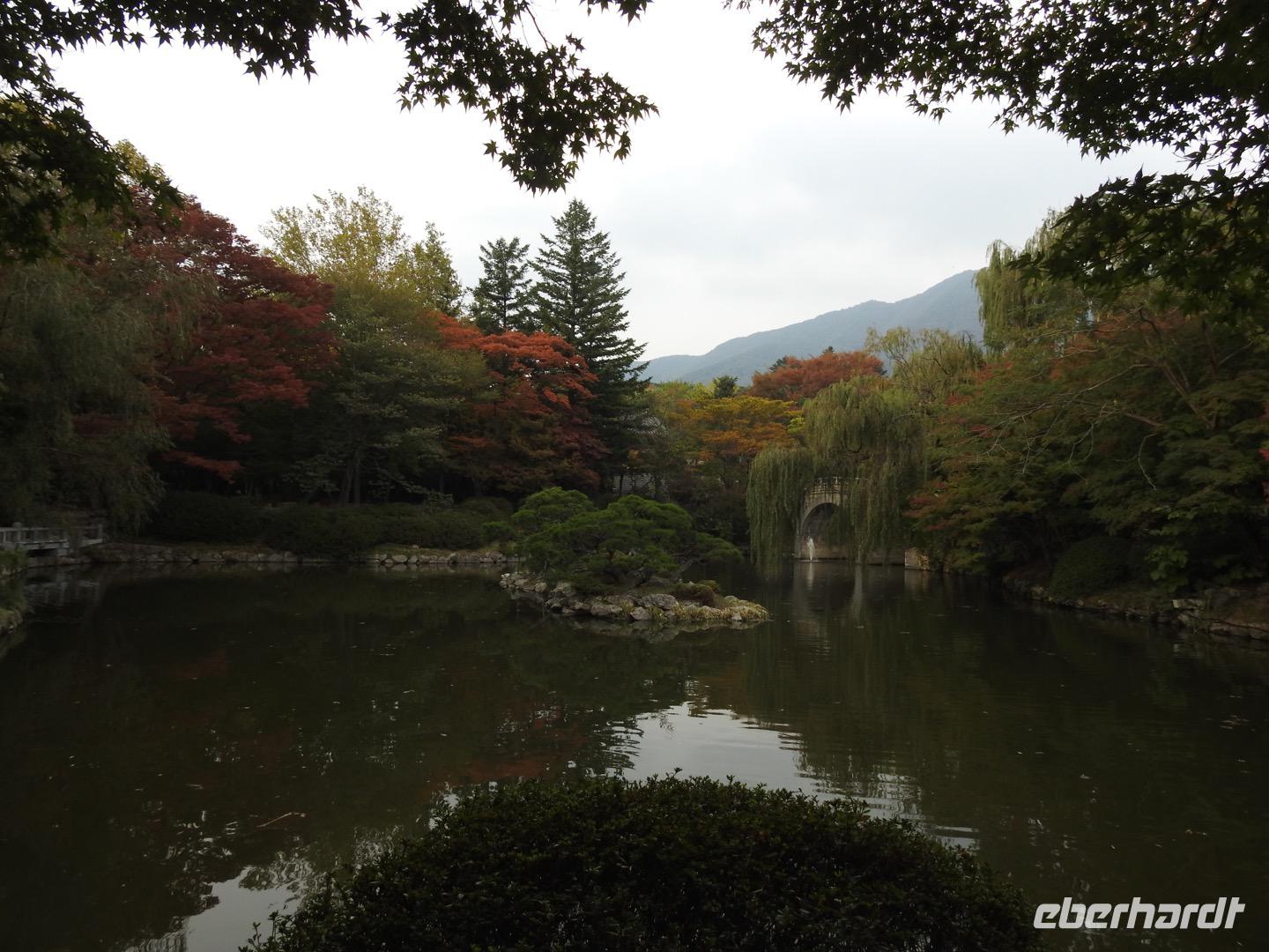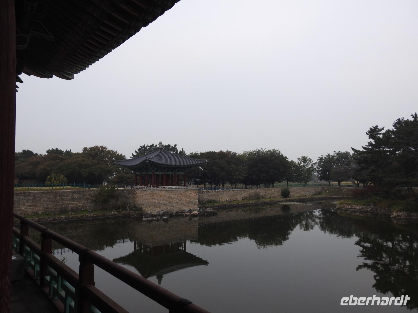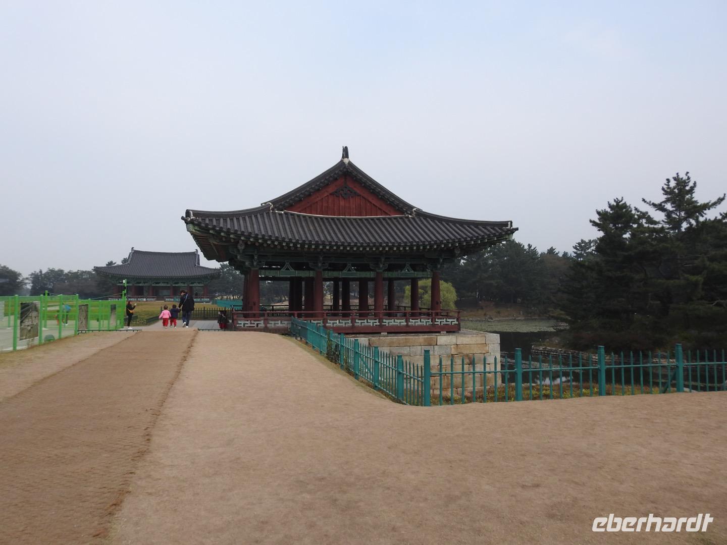 146 Kilometer liegen vor uns. Es ist Herbst geworden. Nebelschwaden liegen über buntgefärbten Bäumen. Wir fahren nach Gyeongju, einst die Hauptstadt des Silla-Reiches. Im Jahr 676 war Gyeongju ein weltweit bedeutendes kulturelles Zentrum. Heute gibt es so viele historische Sehenswürdigkeiten, dass man die Gegend als Freilichtmuseum bezeichnet. Wir fahren zuerst zum Anapij Teich. Verwirrend ist hier die unterschiedliche Bezeichnung, manchmal taucht auch der Name Wolji auf. Wolji bedeutet: Teich, in dem sich der Mond spiegelt. Zu Zeiten des Silla Reiches stand hier eine Palastvilla, wo der Kronprinz wichtige Gäste empfing. Am Abend war alles schön beleuchtet und im Wasser spiegelte sich der Mond. Nach dem Untergang des Silla-Reiches verfiel die Anlage und Gänse und Enten ließen sich an dem schönen Teich nieder. Und das bedeutet Anapij: Gänse-Enten-Teich. Bis 1980 wurde der Name Anapij verwendet, dann fanden Archäologen ein Keramikgeschirr mit der Aufschrift Wolji und der Ort bekam seinen historischen Namen zurück. Wir spazieren durch den Park, mit uns eine Kindergartengruppe, deren Kleinen unser Herz erfreuen.