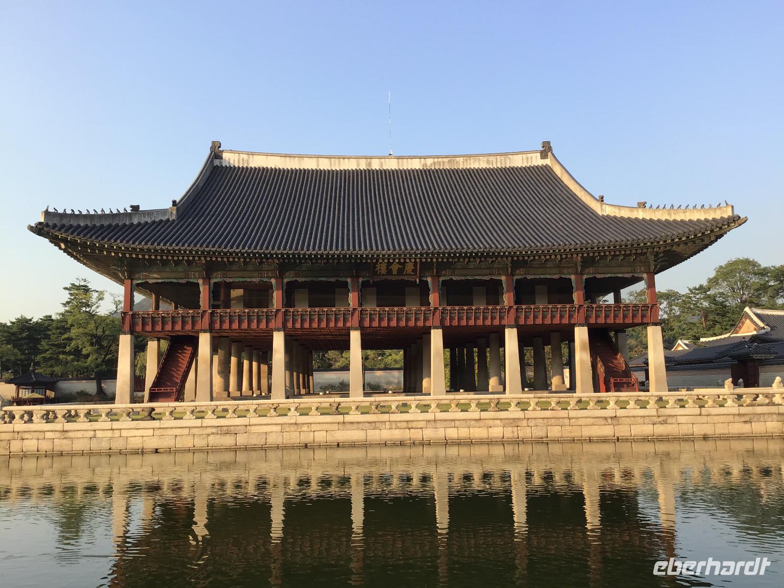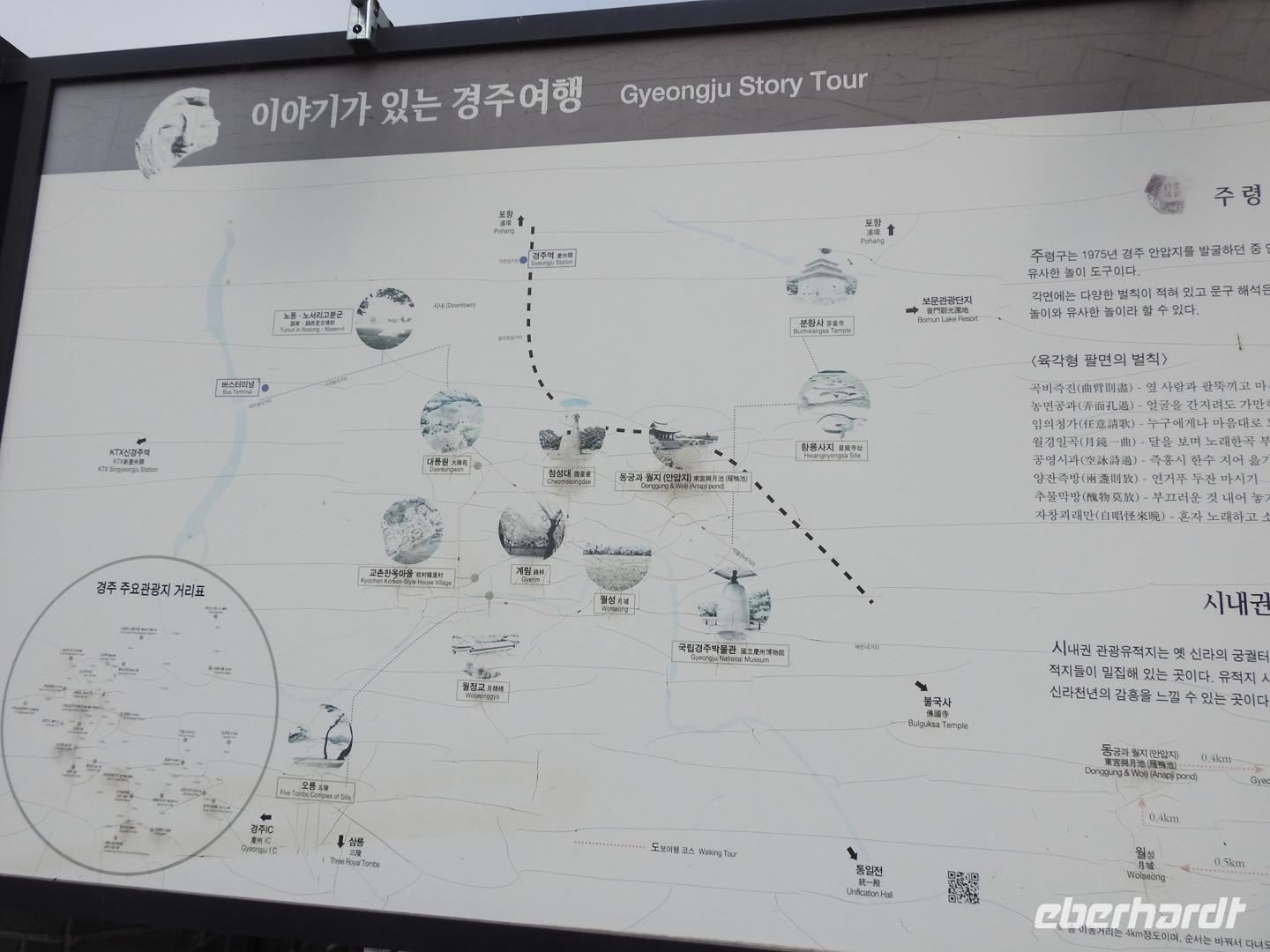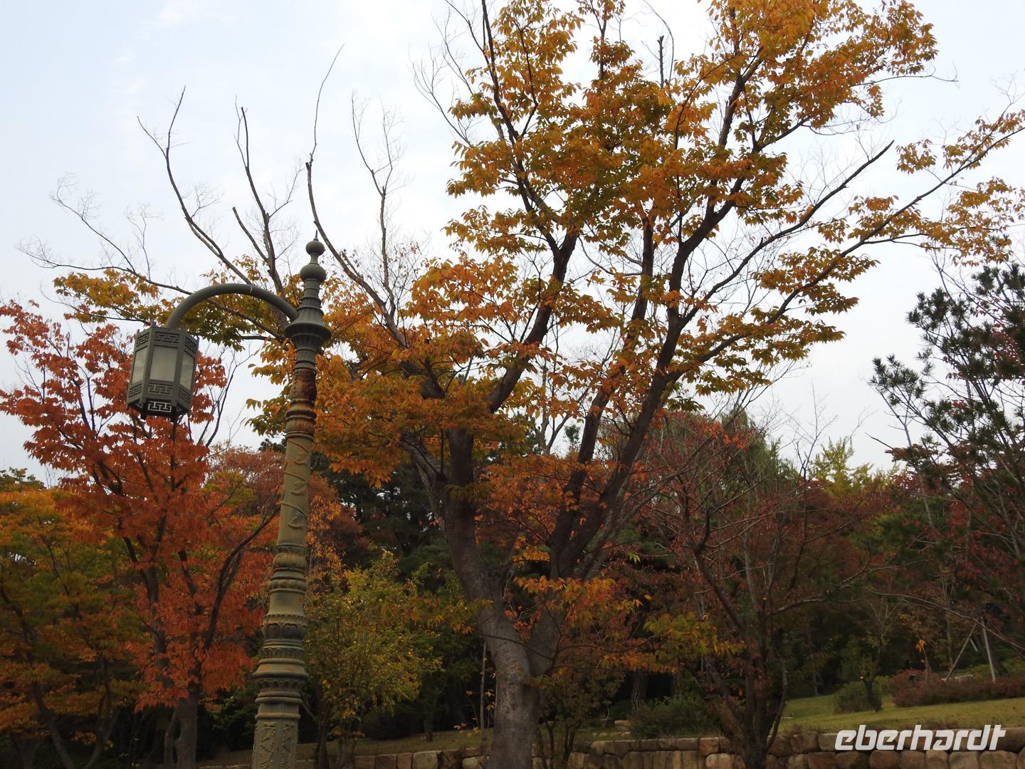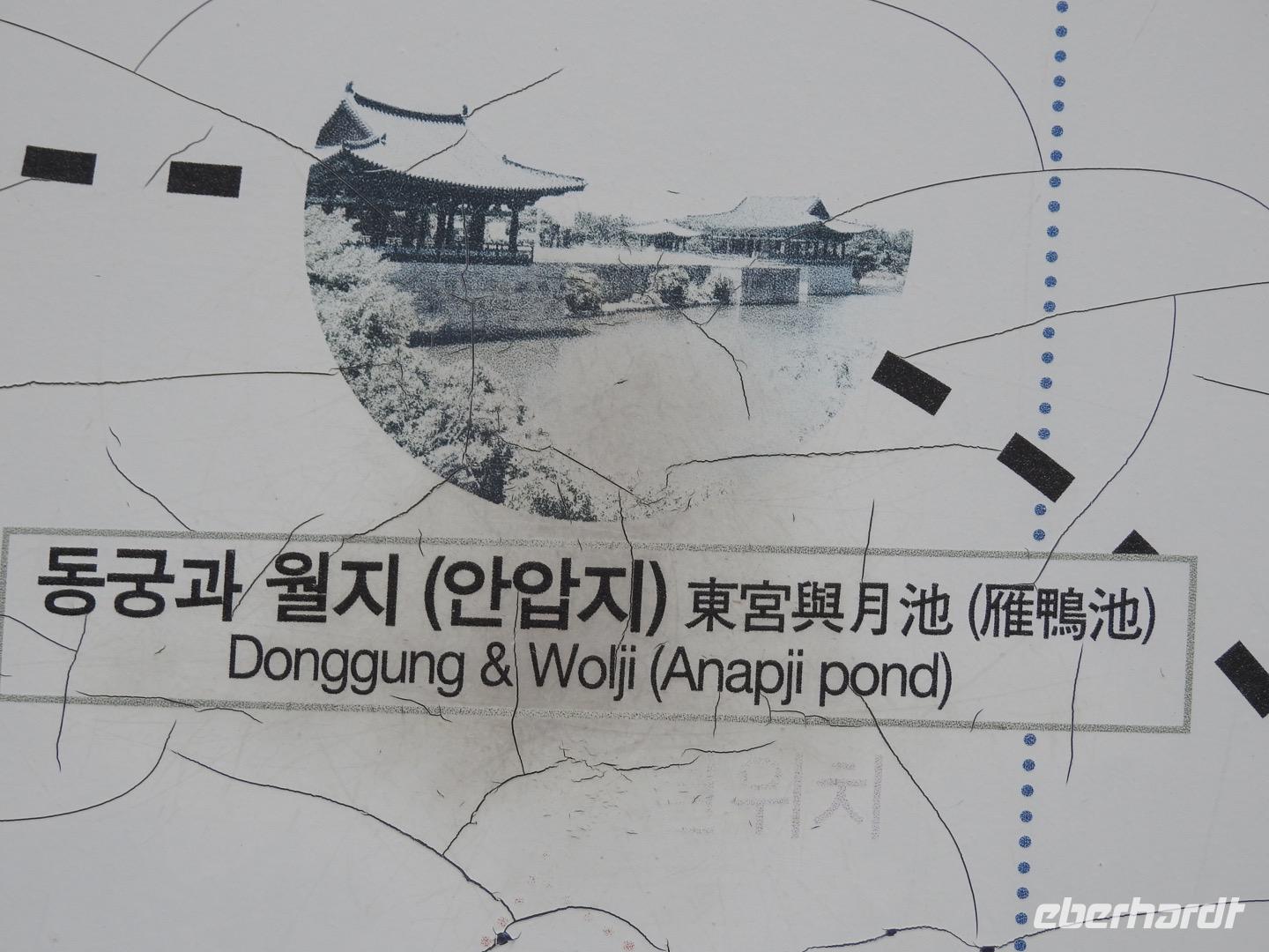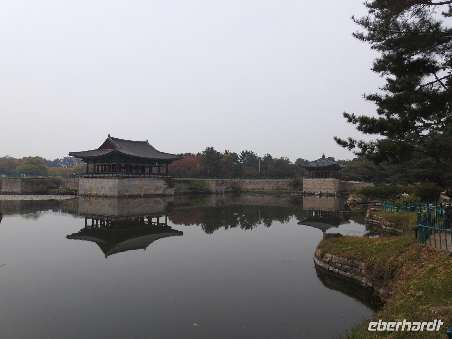 146 Kilometer liegen vor uns. Es ist Herbst geworden. Nebelschwaden liegen über buntgefärbten Bäumen. Wir fahren nach Gyeongju, einst die Hauptstadt des Silla-Reiches. Im Jahr 676 war Gyeongju ein weltweit bedeutendes kulturelles Zentrum. Heute gibt es so viele historische Sehenswürdigkeiten, dass man die Gegend als Freilichtmuseum bezeichnet. Wir fahren zuerst zum Anapij Teich. Verwirrend ist hier die unterschiedliche Bezeichnung, manchmal taucht auch der Name Wolji auf. Wolji bedeutet: Teich, in dem sich der Mond spiegelt. Zu Zeiten des Silla Reiches stand hier eine Palastvilla, wo der Kronprinz wichtige Gäste empfing. Am Abend war alles schön beleuchtet und im Wasser spiegelte sich der Mond. Nach dem Untergang des Silla-Reiches verfiel die Anlage und Gänse und Enten ließen sich an dem schönen Teich nieder. Und das bedeutet Anapij: Gänse-Enten-Teich. Bis 1980 wurde der Name Anapij verwendet, dann fanden Archäologen ein Keramikgeschirr mit der Aufschrift Wolji und der Ort bekam seinen historischen Namen zurück. Wir spazieren durch den Park, mit uns eine Kindergartengruppe, deren Kleinen unser Herz erfreuen.