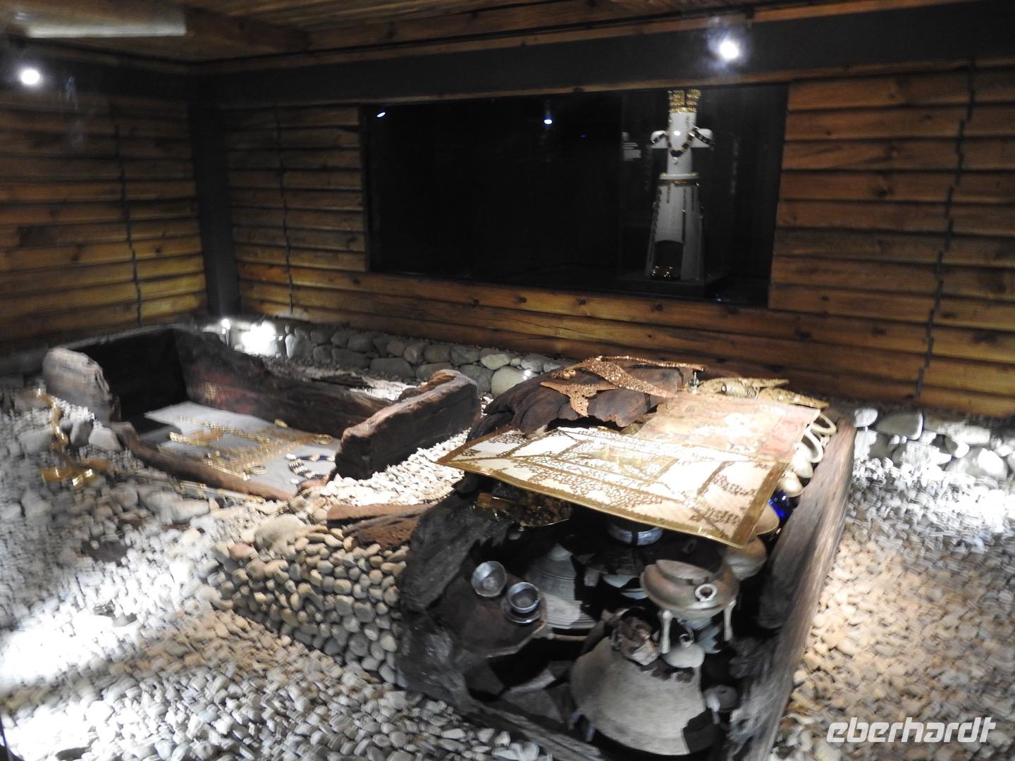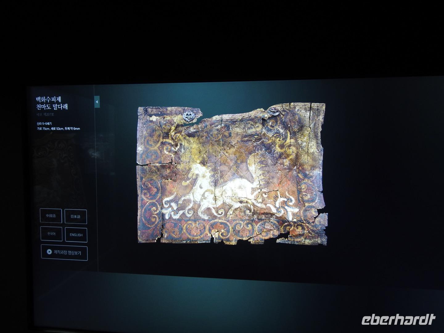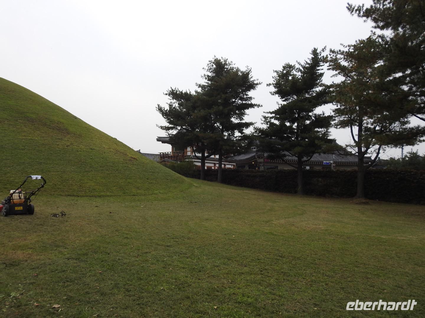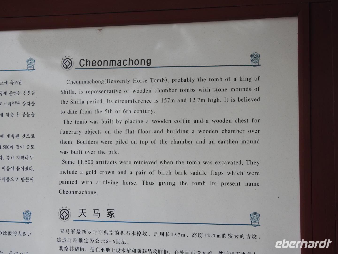 Unser nächstes Ziel ist der Tumuli Park. Unter vielen grünen Hügeln sind hier Mitglieder einer Königsfamilie begraben. 1974 wurde das Himmelspferdegrab ausgegraben. Mehr als zehntausend Kunstgegenstände wurden geborgen. Wir gehen in das Grab hinein und können uns ein Bild davon machen, wie der Sarkophag ausgestattet und die Schmuckstücke angeordnet waren. In der folgenden Ausstellung kann man in einem kurzen Video sehen, wie so ein Grab errichtet und wie die goldene Krone angefertigt wurde. Außerdem sind Nachbildungen der Krone, eines silbernen Gürtels und anderer Schätze zu sehen.