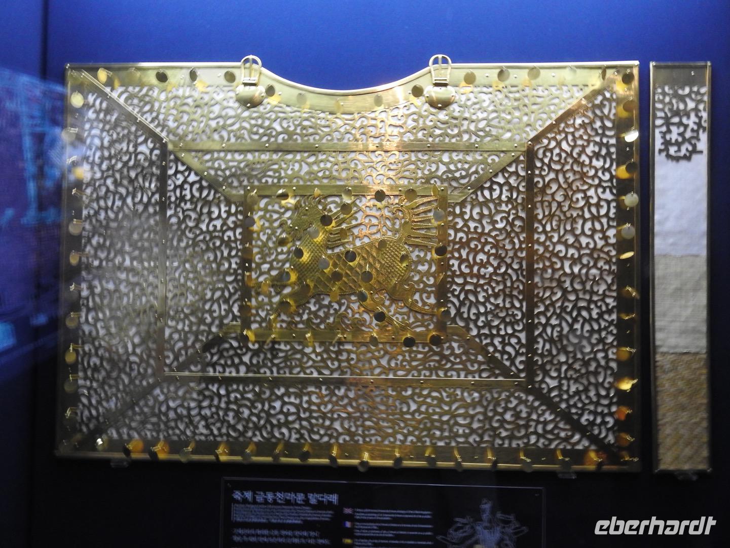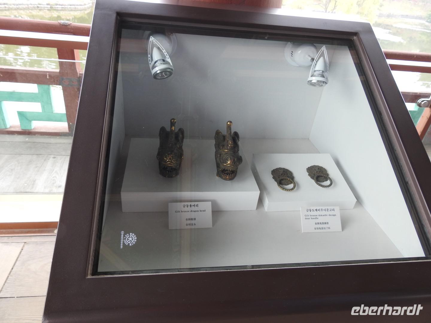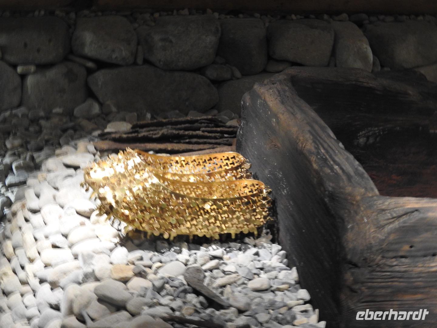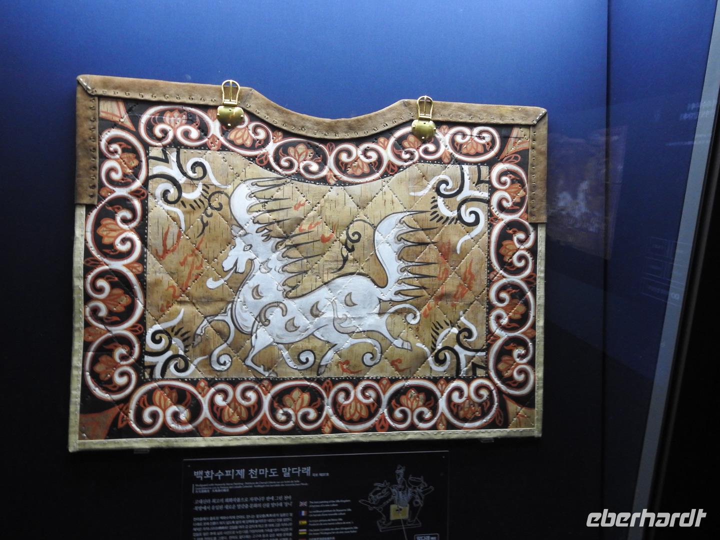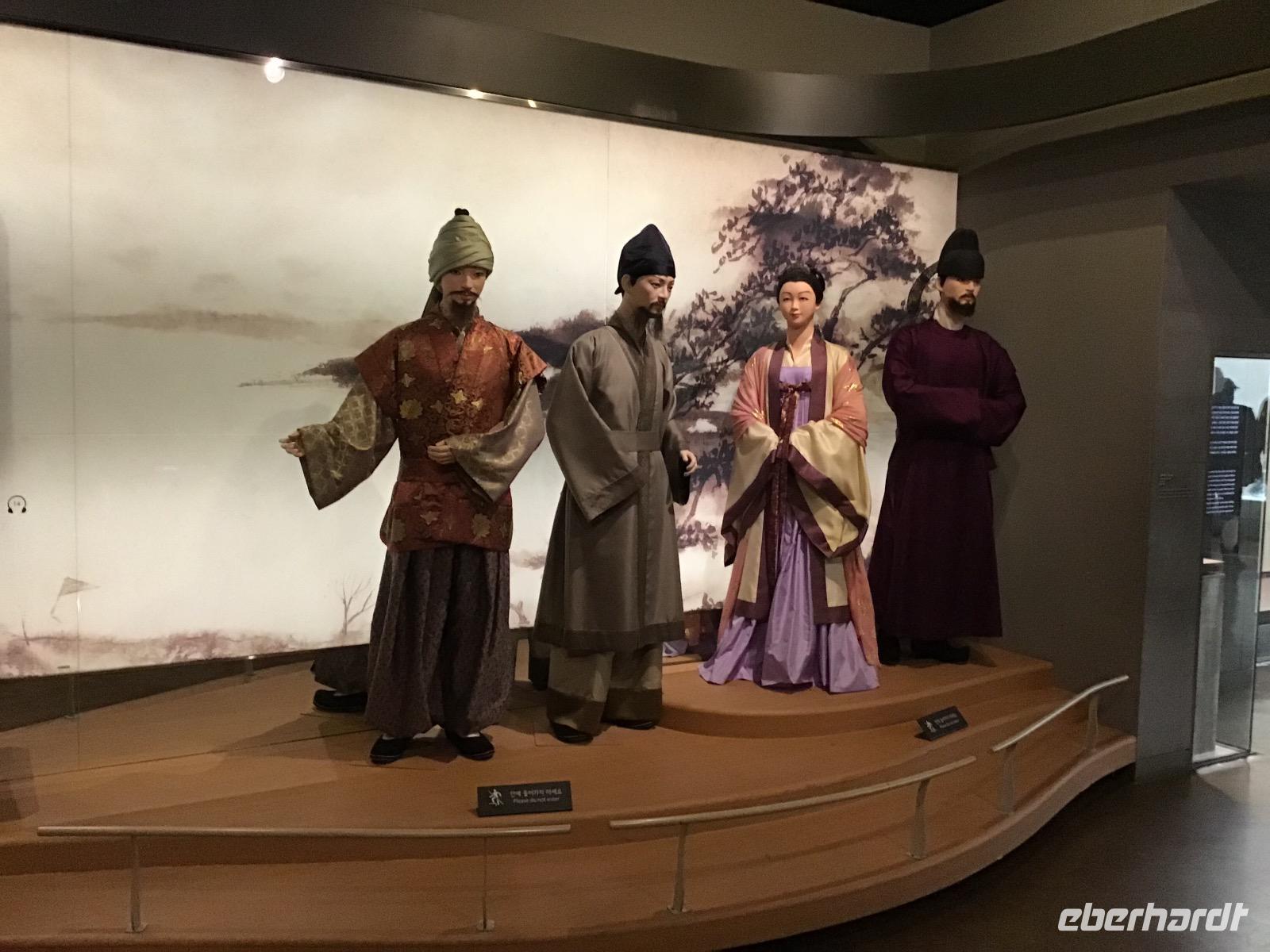 Unser nächstes Ziel ist der Tumuli Park. Unter vielen grünen Hügeln sind hier Mitglieder einer Königsfamilie begraben. 1974 wurde das Himmelspferdegrab ausgegraben. Mehr als zehntausend Kunstgegenstände wurden geborgen. Wir gehen in das Grab hinein und können uns ein Bild davon machen, wie der Sarkophag ausgestattet und die Schmuckstücke angeordnet waren. In der folgenden Ausstellung kann man in einem kurzen Video sehen, wie so ein Grab errichtet und wie die goldene Krone angefertigt wurde. Außerdem sind Nachbildungen der Krone, eines silbernen Gürtels und anderer Schätze zu sehen.