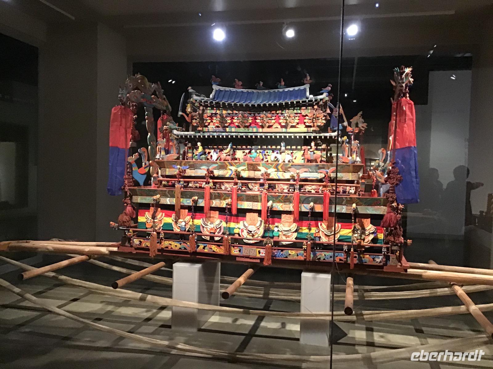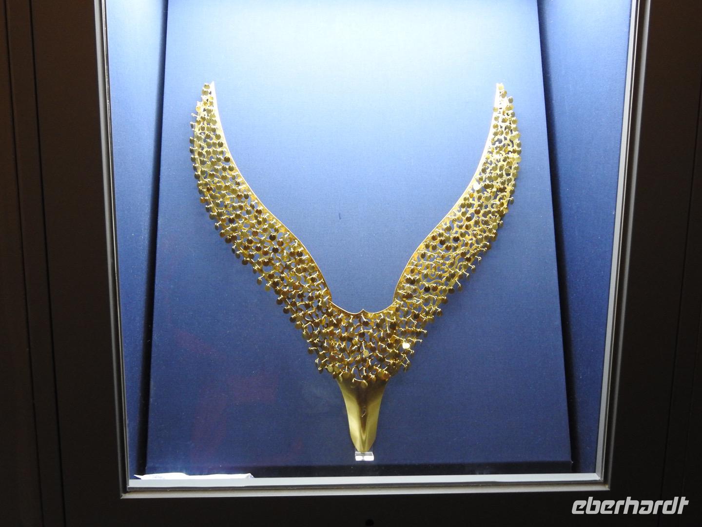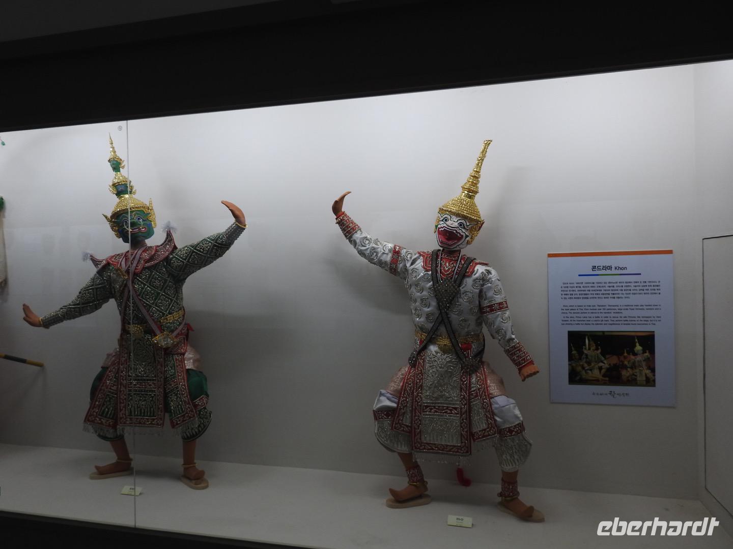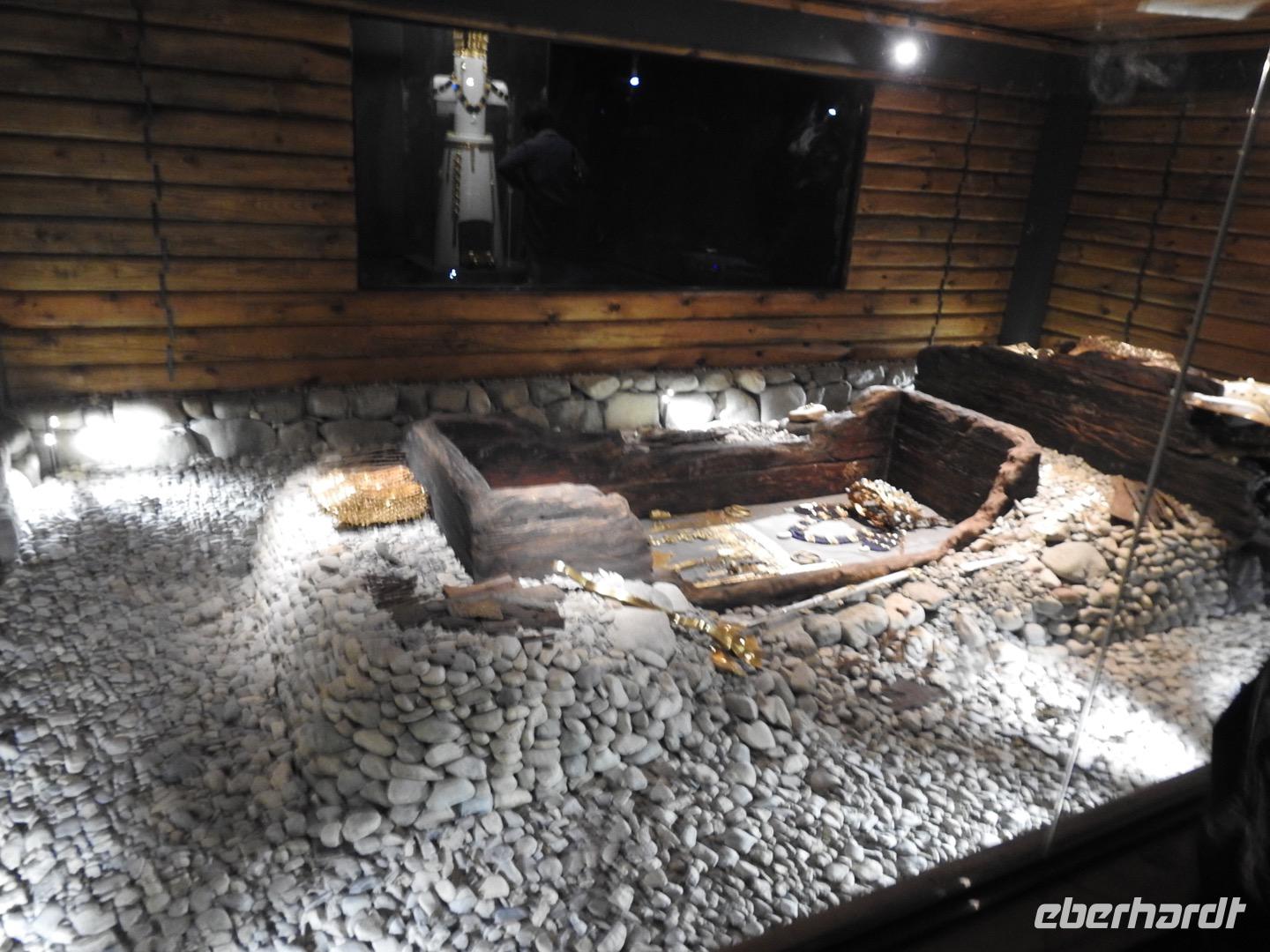 Unser nächstes Ziel ist der Tumuli Park. Unter vielen grünen Hügeln sind hier Mitglieder einer Königsfamilie begraben. 1974 wurde das Himmelspferdegrab ausgegraben. Mehr als zehntausend Kunstgegenstände wurden geborgen. Wir gehen in das Grab hinein und können uns ein Bild davon machen, wie der Sarkophag ausgestattet und die Schmuckstücke angeordnet waren. In der folgenden Ausstellung kann man in einem kurzen Video sehen, wie so ein Grab errichtet und wie die goldene Krone angefertigt wurde. Außerdem sind Nachbildungen der Krone, eines silbernen Gürtels und anderer Schätze zu sehen.