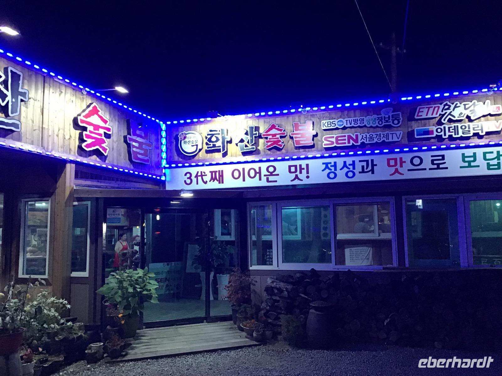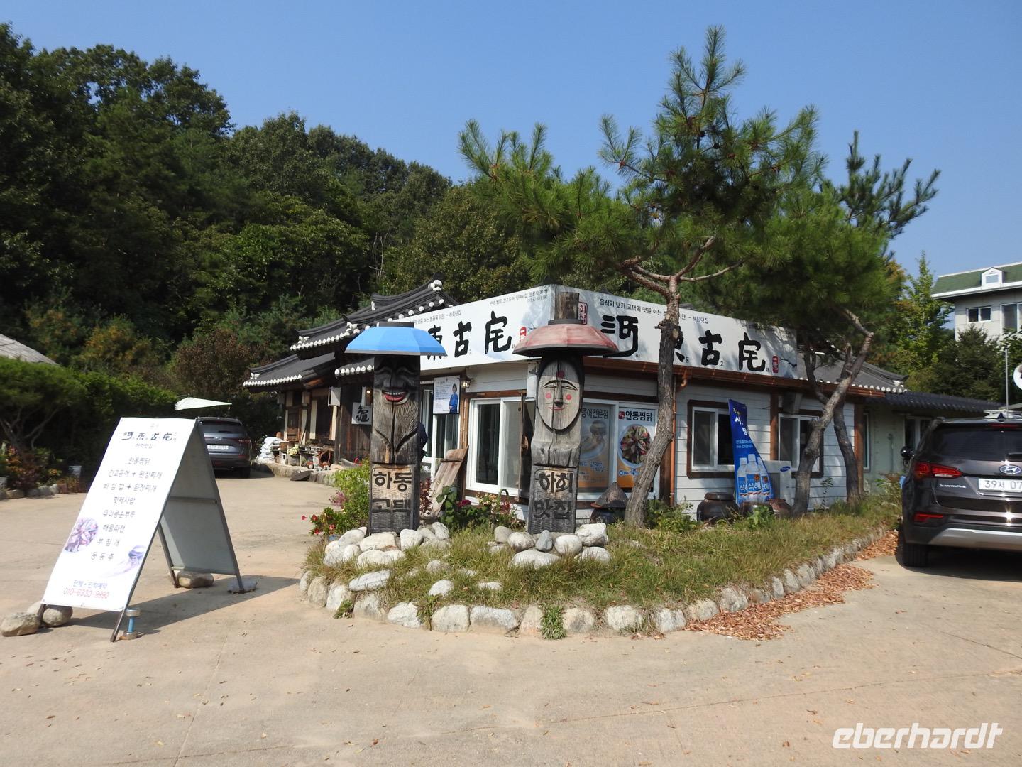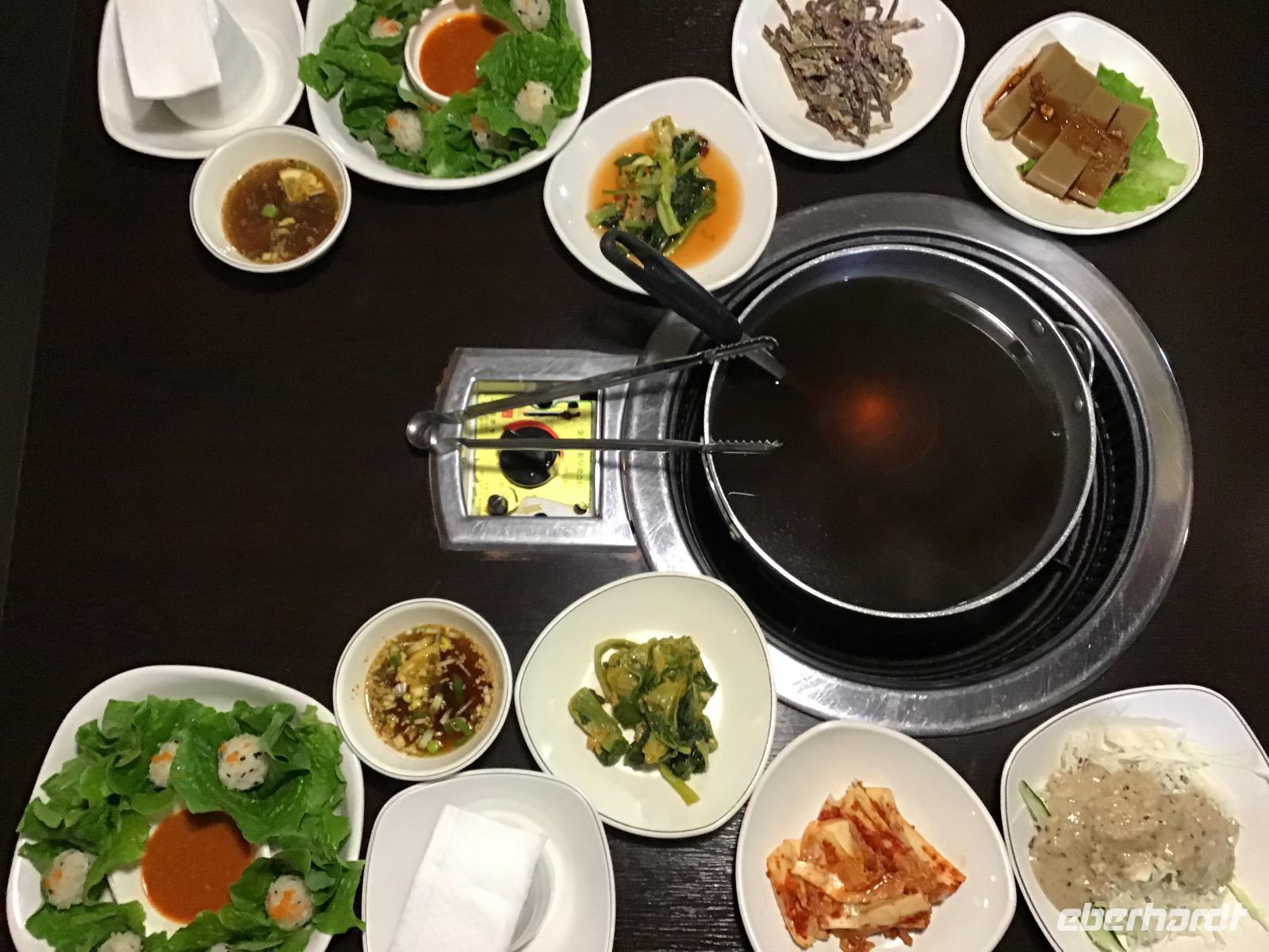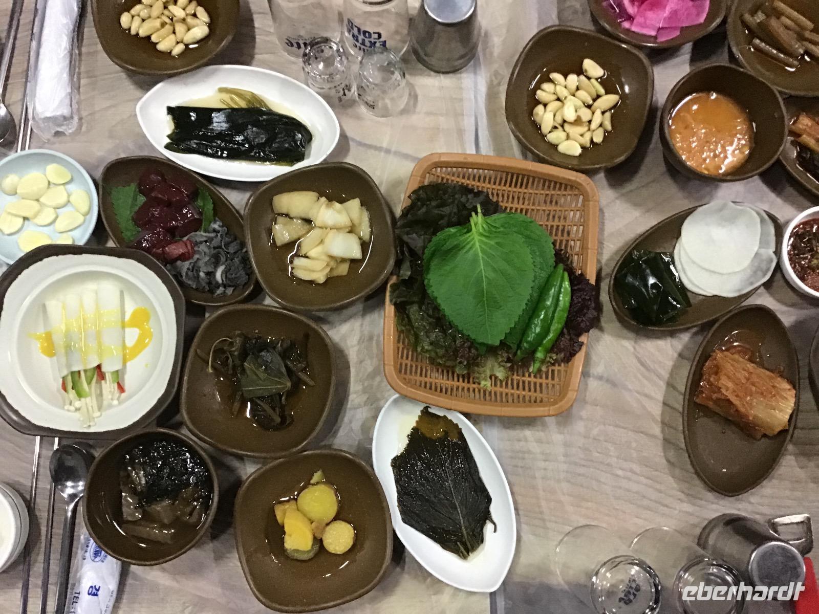 Am Abend verkosten wir wieder eine Spezialität der Region. Da es von hier aus weit ist bis zum Meer, mussten Fische speziell behandelt werden, um den Transport zu überstehen. Hauptspeise ist heute eine äußerst schmackhafte Makrele, dazu gibt es die bereits bekannten kalten Vorspeisen und eine heiße Suppe. Der Reis wird heute in einem Eisentopf serviert, der bis zum Ende der Mahlzeit heiß bleibt. Koreaner lieben es, den am Topf angeklebten Reis mit Wasser abzuweichen und dann zu essen. Andere Länder andere Sitten.