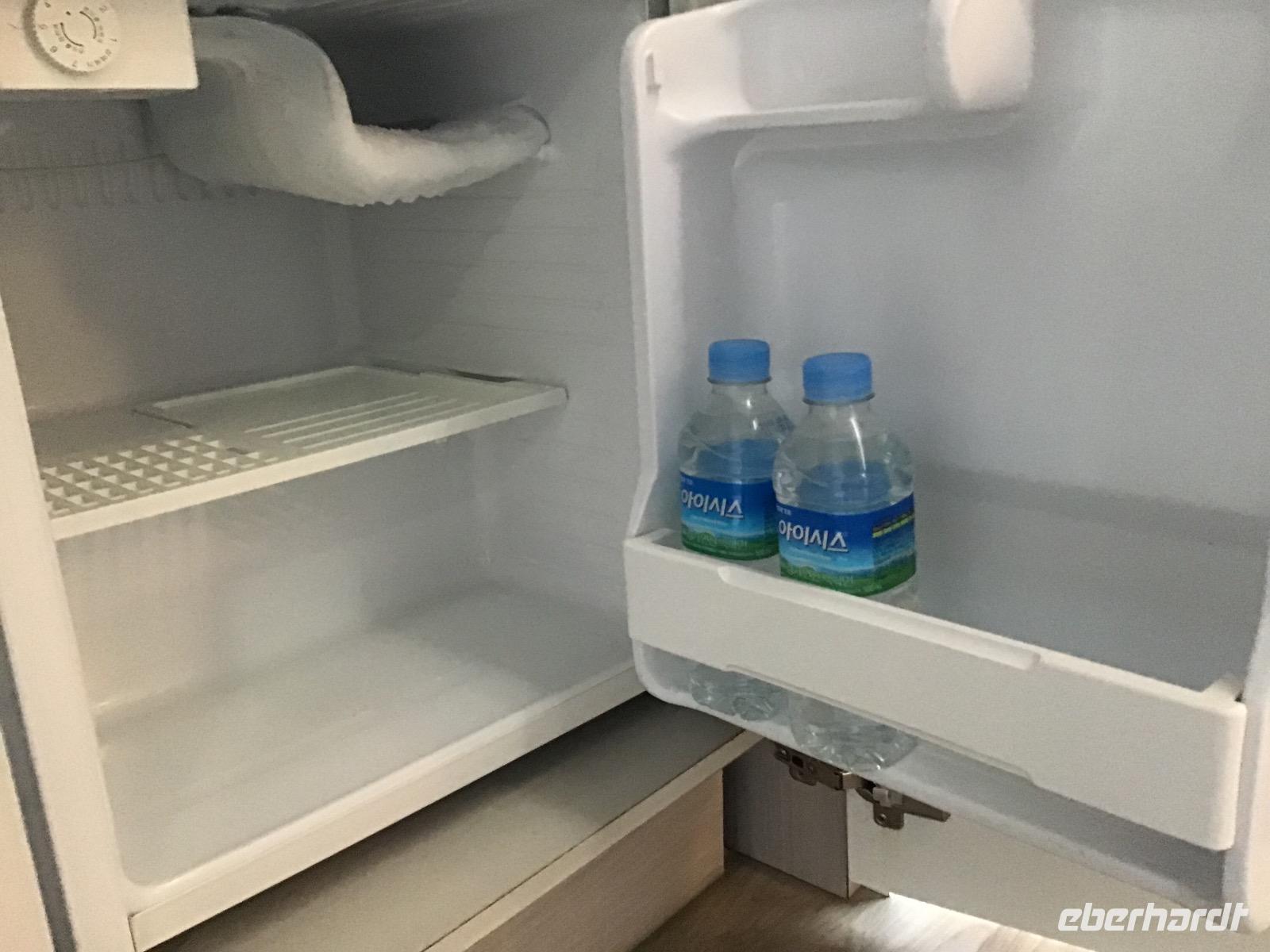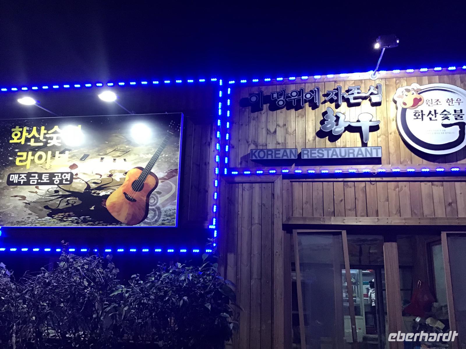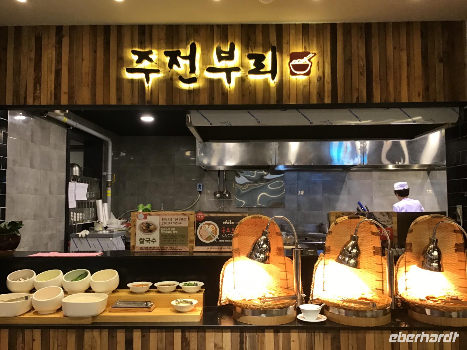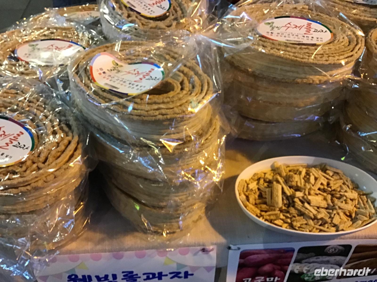 Am Abend verkosten wir wieder eine Spezialität der Region. Da es von hier aus weit ist bis zum Meer, mussten Fische speziell behandelt werden, um den Transport zu überstehen. Hauptspeise ist heute eine äußerst schmackhafte Makrele, dazu gibt es die bereits bekannten kalten Vorspeisen und eine heiße Suppe. Der Reis wird heute in einem Eisentopf serviert, der bis zum Ende der Mahlzeit heiß bleibt. Koreaner lieben es, den am Topf angeklebten Reis mit Wasser abzuweichen und dann zu essen. Andere Länder andere Sitten.