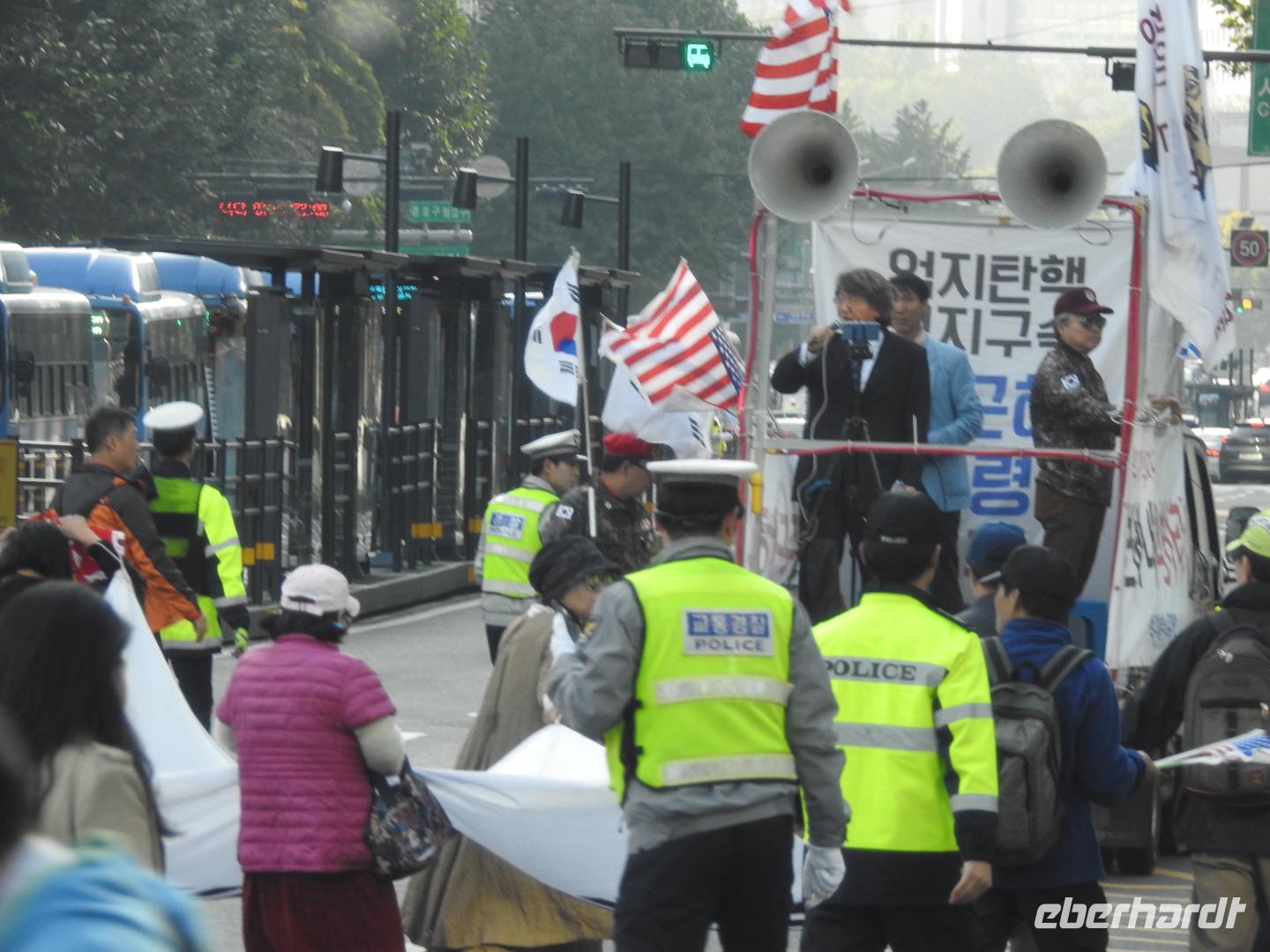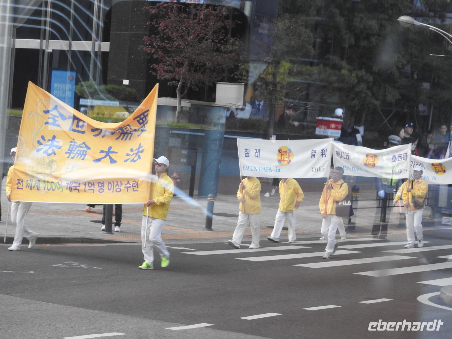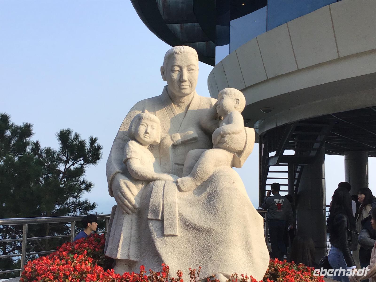 Heute begegnen wir auf unheimliche Art unserer eigenen Geschichte. 1945, als Japan nach dem Abwurf der Atombomben kapitulieren musste, hatte das auch Folgen für Korea, das seit 1910 von Japan besetzt und eine japanische Provinz war. Der UN-Treuhandrat setzte im Norden die Sowjetunion und im Süden die USA als treuhänderische Verwalter ein. Prompt teilen die beiden Großmächte das Land unter sich auf. Anstelle eines freien und unabhängigen Staates entstanden zwei Staaten mit jeweils einer eigenen Regierung und dem Machtanspruch auf die gesamte Insel. 1950 versuchte Nordkorea diesen Anspruch militärisch durchzusetzen. (Dieser Teil ist den Deutschen zum Glück erspart geblieben). 1953 kam es dann, nach großen Verlusten auf beiden Seiten, zu einem Waffenstillstand, der bis heute anhält. Entlang des 38. Breitengrades verläuft eine Demarkationslinie. Um diese herum wurde eine demilitarisierte Zone errichtet, die wir heute besuchen. Womit wir wieder bei unserem Reiseprogramm wären. Bereits um 7.30 Uhr fahren wir los. Ziel ist es, die Bahn, die in den dritten Tunnel fährt, für 9.20 Uhr zu erreichen. Wir sind, trotz frühem Losfahrens, zu spät. Die ersten Züge sind ausgebucht. Wir müssen bis 11.00 Uhr warten. In dieser Zeit besichtigen wir zunächst allein und dann mit Ko zusammen, das Gelände. Hier befindet sich unter anderem eine Gedenkstätte, die daran erinnert, dass es dreißig Jahre nach der Teilung Koreas eine Zusammenführung von Familienangehörigen gab, die sehr dramatisch abgelaufen sein muss. Auf vielen weißen Zetteln beschrieben die Menschen sich selbst, wo sie herkamen, wie alt sie sind, wer ihre Freunde waren u.s.w.. Anhand dieser Beschreibungen versuchten sie dann ihre Angehörigen und Freunde wieder zu finden. Diese Szenen sind auf Fotos rund um das Denkmal dargestellt. Weiterhin besichtigen wir die Friedensbrücke, eine Holzbrücke, auf der Gefangene ausgetauscht wurden und eine Lokomotive mit tausendzweihundert Einschusslöchern, die an den Krieg erinnert. Um elf fahren wir nun mit dem Shuttlebus zum Tunnel Nummer drei. Als Nordkorea immer noch die Absicht hatte, das Land mit Gewalt zu vereinigen, wurden mehrere Tunnel heimlich von Norden nach Süden gegraben. Diese befinden sich in ca. siebzig Metern Tiefe und waren so gebaut, dass pro Stunde dreißigtausend Soldaten hätten eingeschleust werden können. Verraten wurde dieses Vorhaben von einem geflüchteten Nordkoreaner. Vier Jahre brauchten die Südkoreaner bis sie den ersten Tunnel entdeckten. Erst 1990 wurde der vierte Tunnel entdeckt, es wird vermutet, dass es noch weitere gibt. Wir werden mit blauen Schutzhelmen ausgestattet und fahren mit einem kleinen Zug in den Tunnel. Für uns geht es dreihundert Meter bergab. Der Tunnel ist eng und ab und zu müssen wir die Köpfe einziehen. Unten angekommen, geht es zu Fuß weiter, noch zweihundert Meter, wo der Tunnel endet. Dann das Ganze wieder zurück. Ein kurzer Film gibt einen erschütternden Einblick in den Koreakrieg. Nun fahren wir weiter mit dem Shuttlebus zum Observatorium. Hier können wir das gesamte Grenzgebiet, also die demilitarisierte Zone überblicken. Weiter geht es zum Bahnhof Dorasan. Dieser wurde gebaut, als Nord- und Südkorea vor einigen Jahren beschlossen, eine zerstörte Eisenbahnlinie wieder aufzubauen. Das Ende vom Lied war, dass nur der Probezug einmal gefahren ist, dann hat Nordkorea beschlossen, dass sie die Bahnstrecke doch nicht erlauben wollen. Eigentlich wäre unsere Tour jetzt zu Ende, jedoch muss der Busfahrer eine Mittagspause einlegen und damit pausieren wir ebenfalls zwanzig Minuten an einem Supermarkt mit angeschlossener Kantine. Dieses Etablissement ist wohl eher für Einheimische, jedoch sind einige von uns wagemutig und wollen Fertignudeln probieren. Die gibt es in Pappbechern in verschiedenen Größen und Geschmacksrichtungen. Leider ist das heiße Wasser gerade alle und so müssen wir uns mit Keksen begnügen. Am Ausgangspunkt wieder angekommen, wechseln wir wieder zu unserem Bus und fahren zurück nach Seoul. Jetzt ist der berühmte N-Tower unser Ziel. Der Turm ist ca. 237 Meter hoch und steht auf dem Namsan Berg, woher auch die Bezeichnung Namsan Tower stammt. Von der Aussichtsplattform in 138 Metern Höhe haben wir einen fantastischen Ausblick auf Seoul. Auch die Toiletten verfügen über große Fenster und man kann, während man sich erleichtert, die Aussicht genießen.