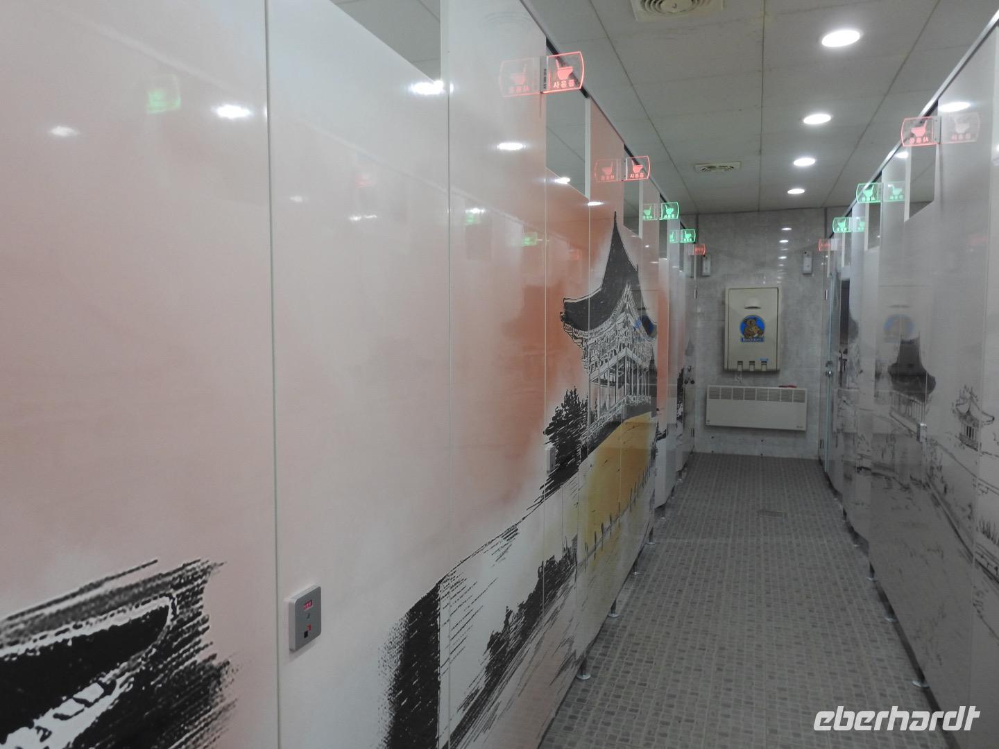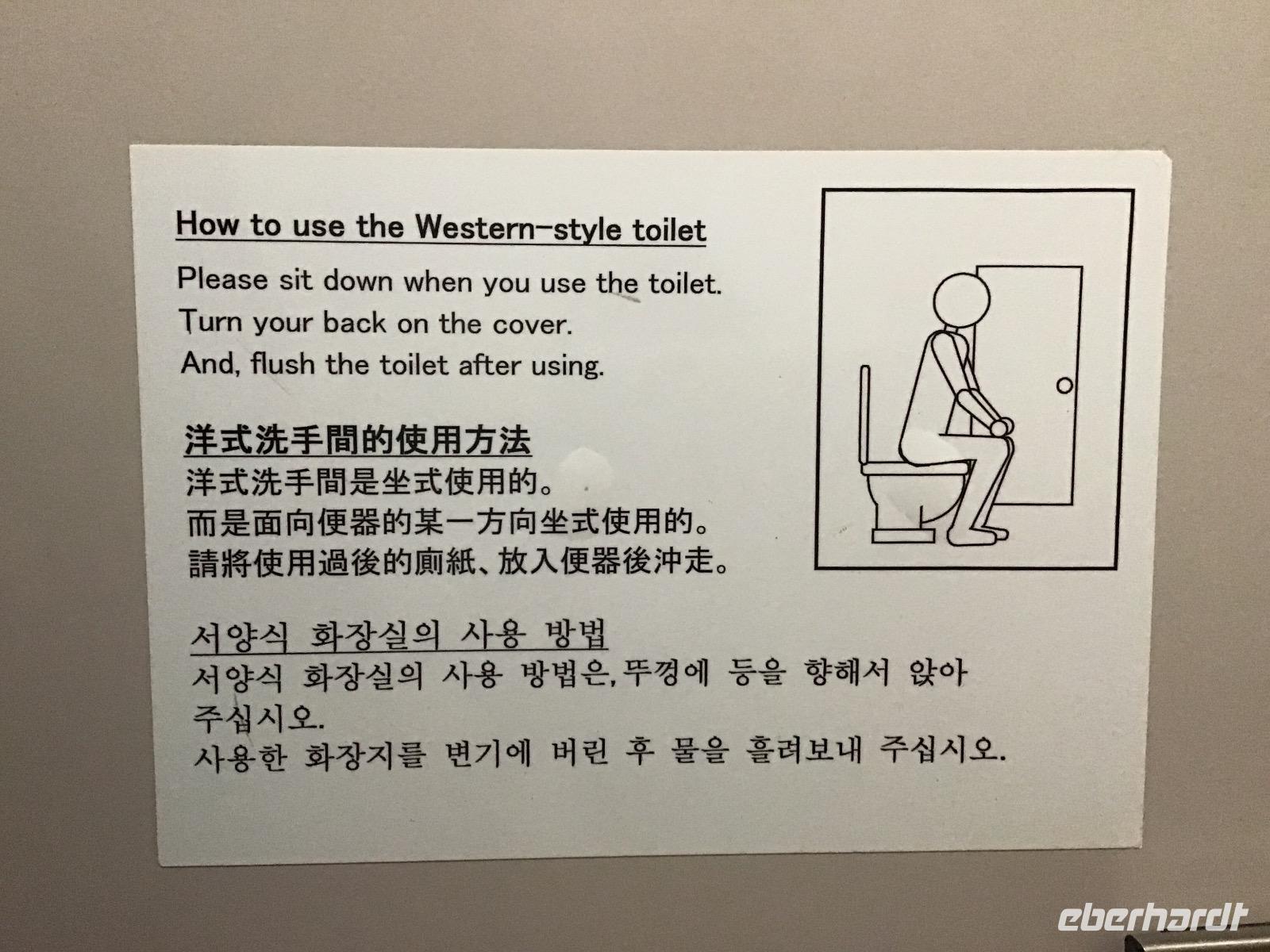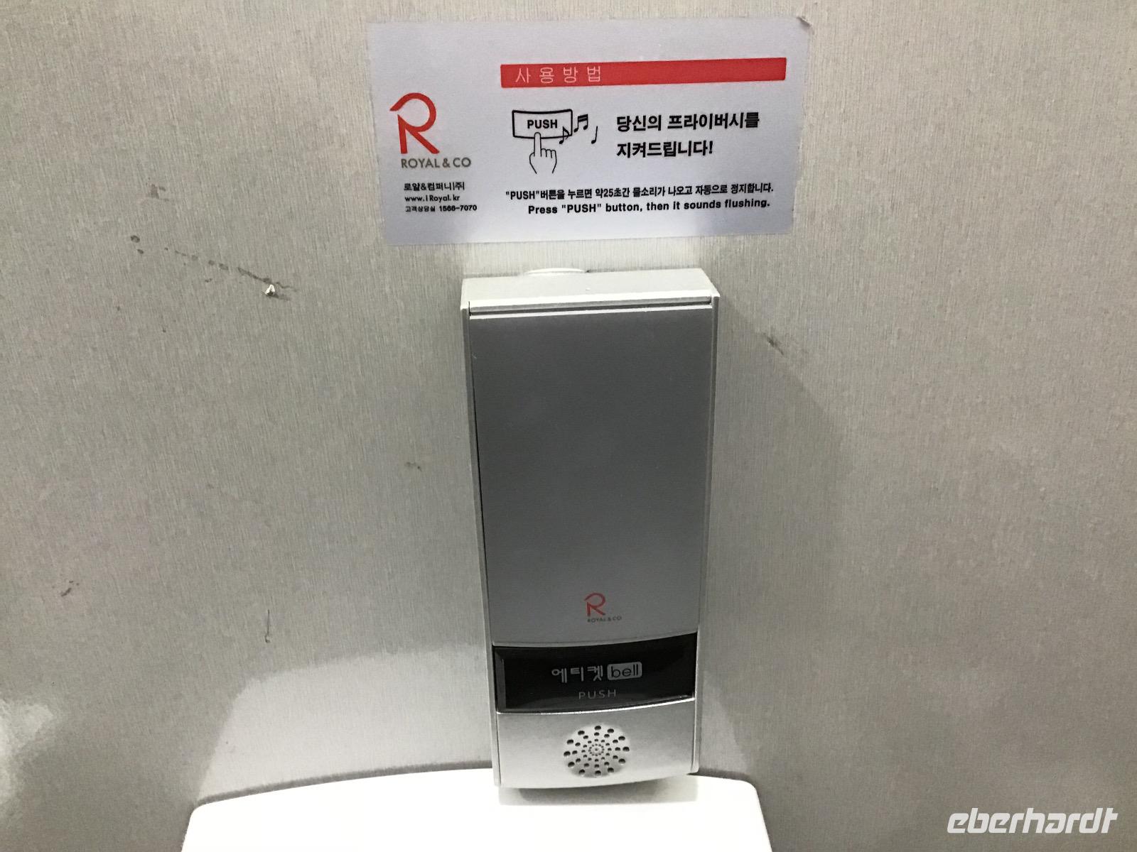 Diese Koreaner! Während der Kulturpause an einem Rastplatz ist auf dem WC (zumindest bei den Damen) ein silbernes Kästchen an der Wand, die eine Toilette von der anderen trennt. Drückt man aufs Knöpfchen ertönt ein Spülgeräusch (ohne dass Wasser verschwendet wird) und man kann privat seinen Sound ablassen ohne sich dafür zu schämen :-).