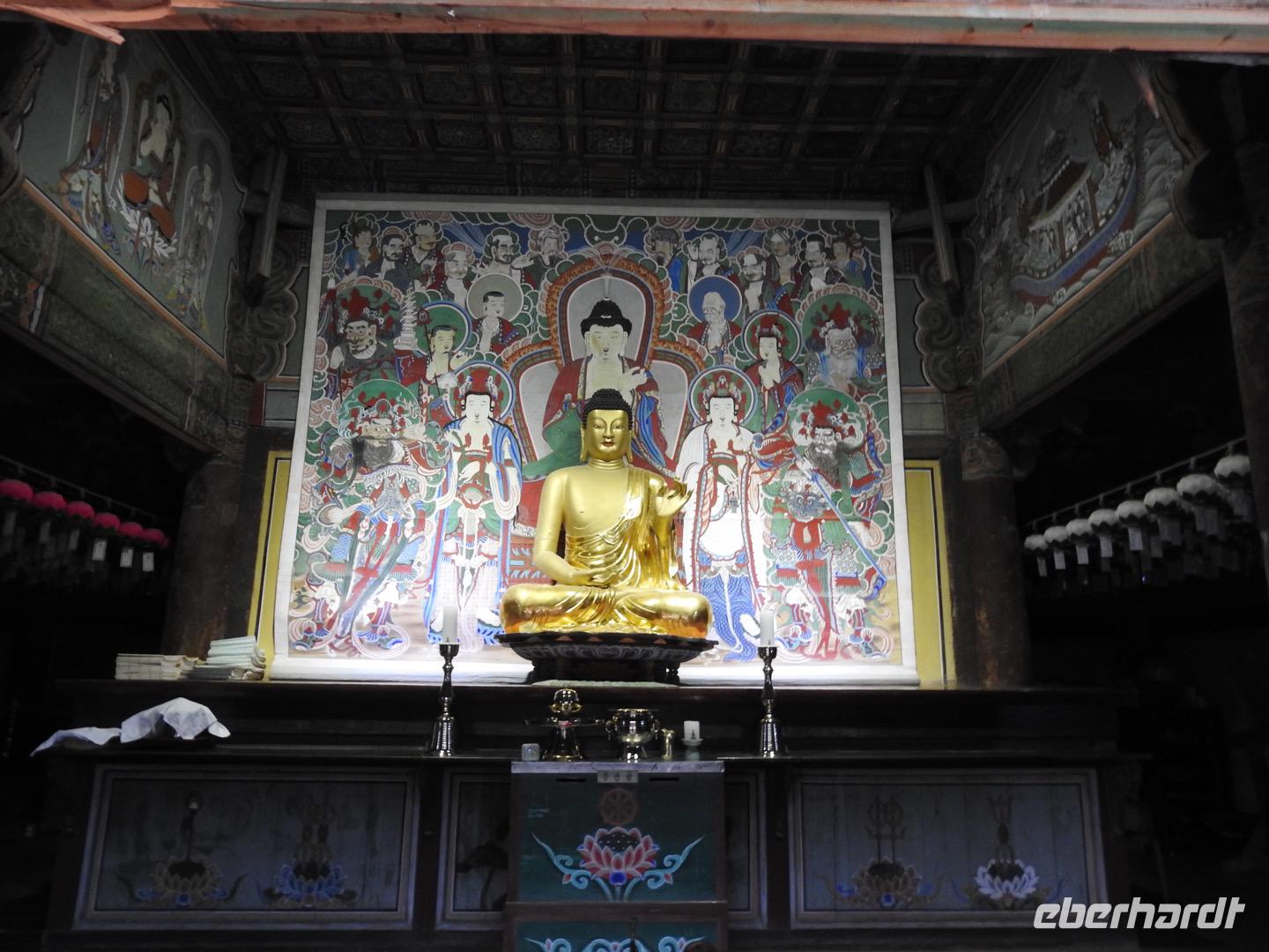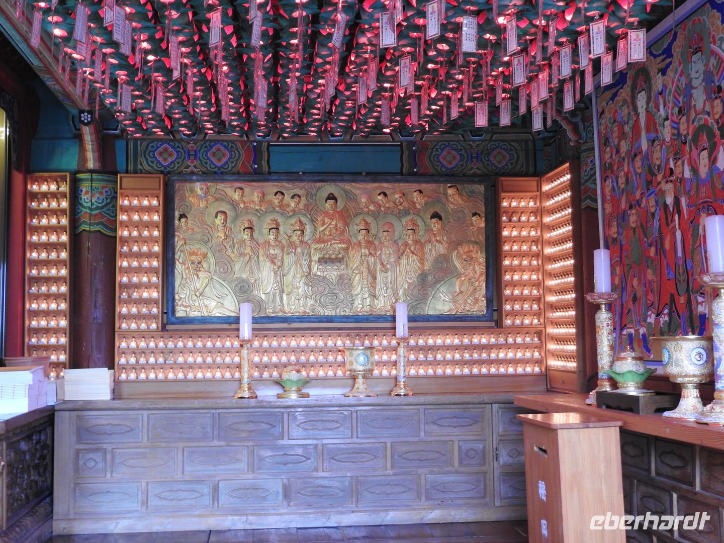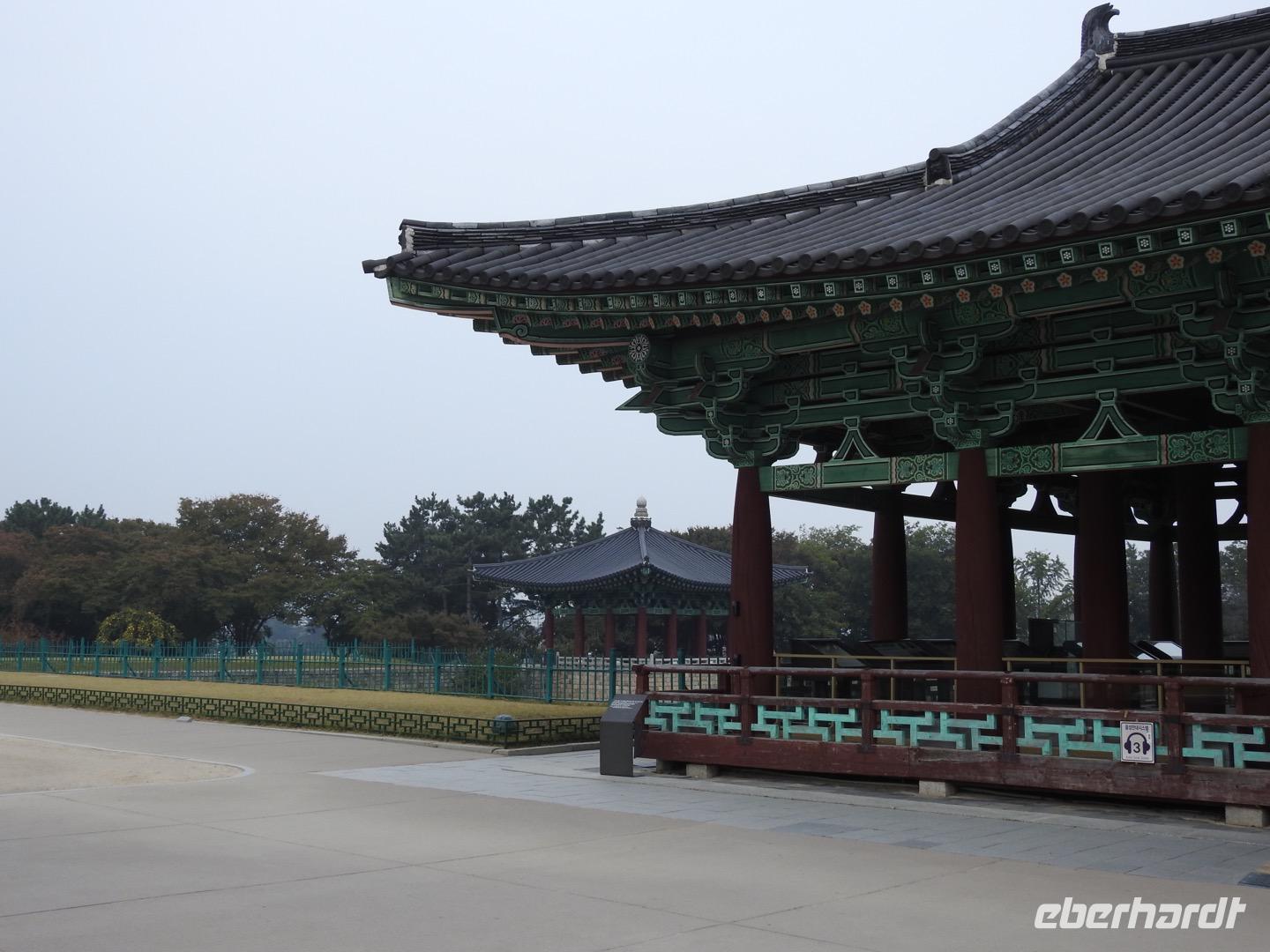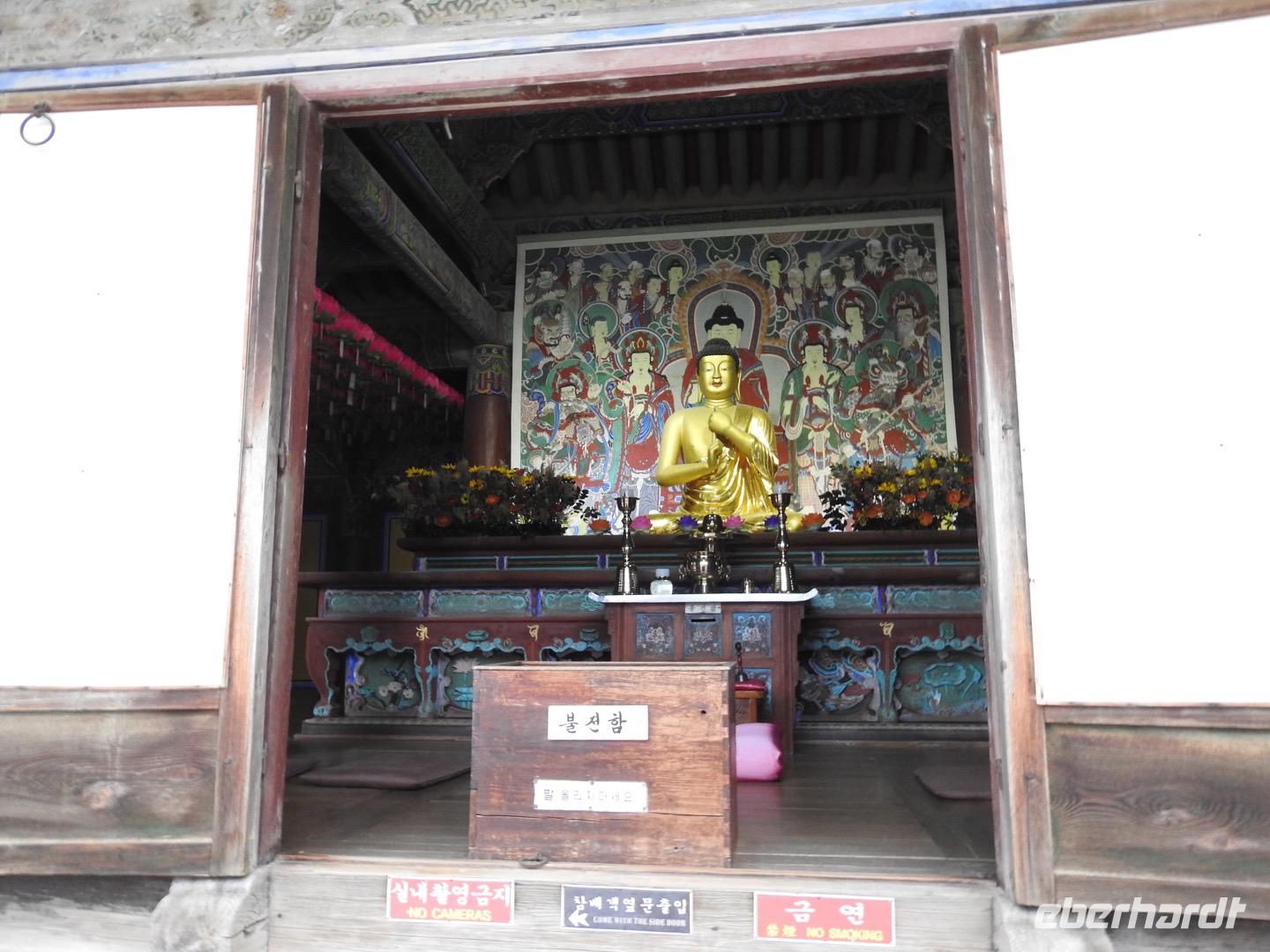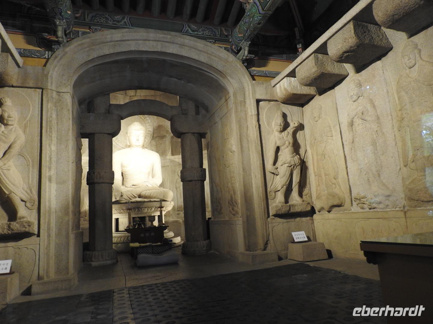 Zur Seokguram-Grotte geht es mit dem Bus über Serpentinen hinauf. Die Konstruktion des Granitgewölbes gilt als architektonische Meisterleistung. Bis vor kurzem konnte der, sich darin befindende, Buddha über die bewaldeten Hügel und das Ostmeer bis zum Horizont schauen. Heute sitzt er in einem Häuschen, das ihn und die ihn umgebenden Boddhisatvas schützen soll. Vorbei ist es mit dem Blick auf den traumhaften Sonnenaufgang.