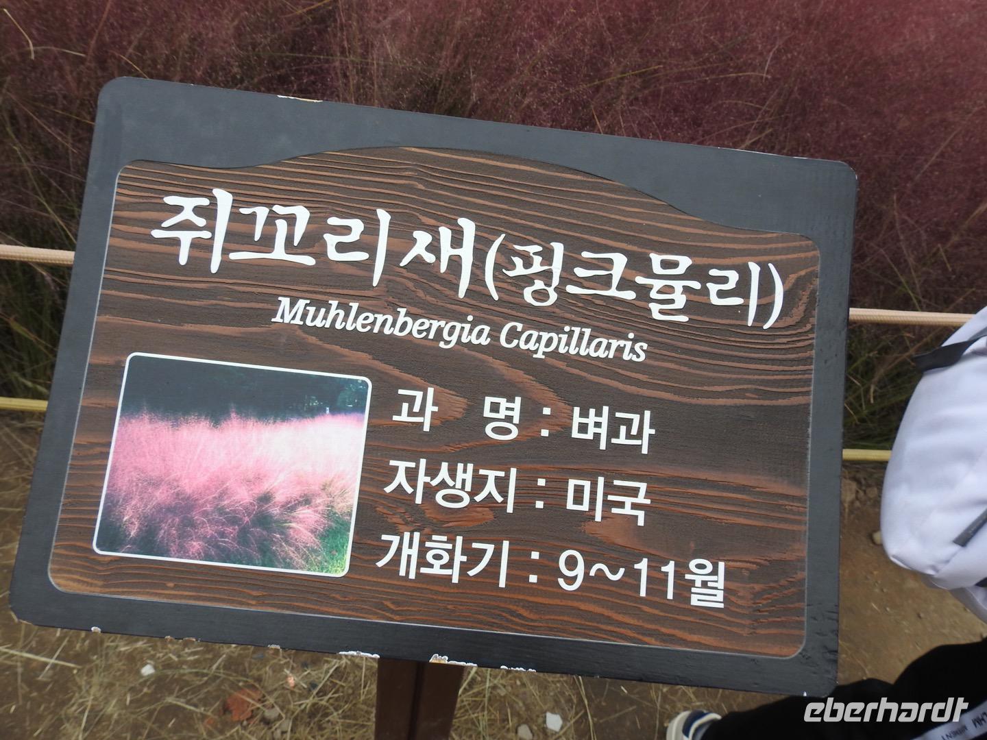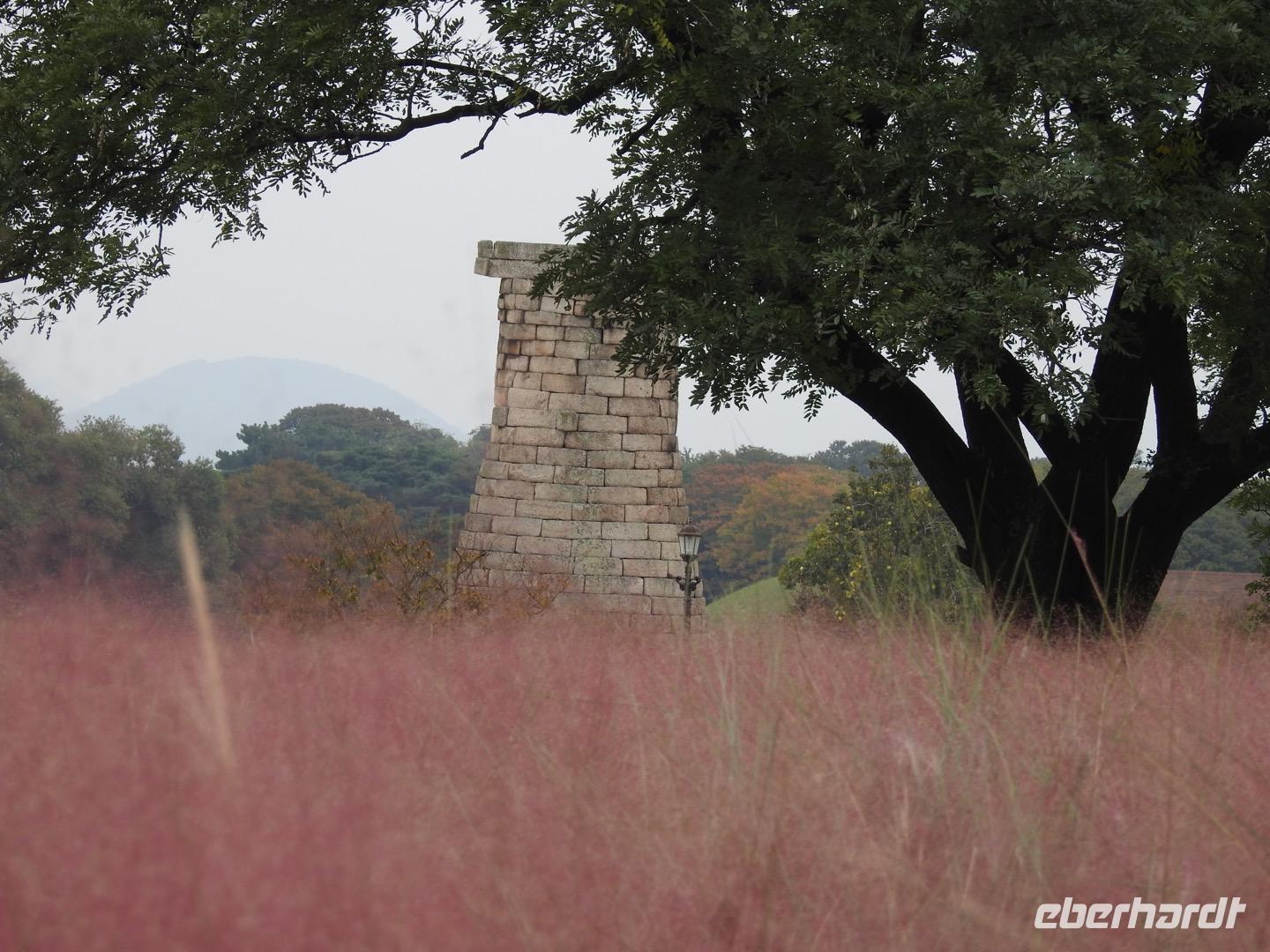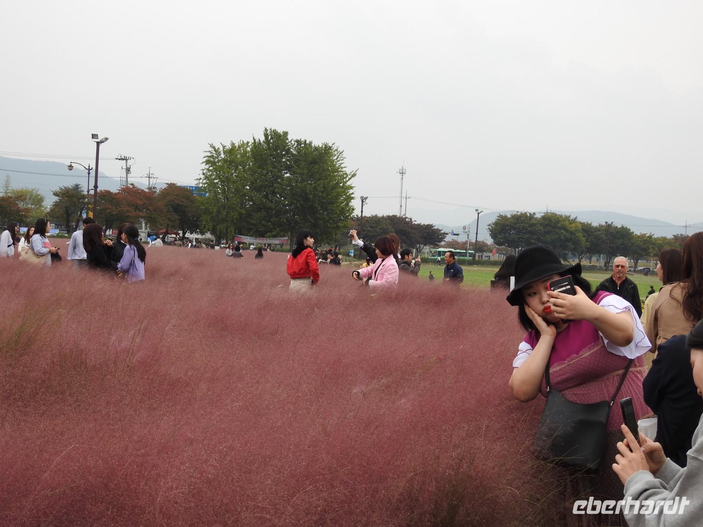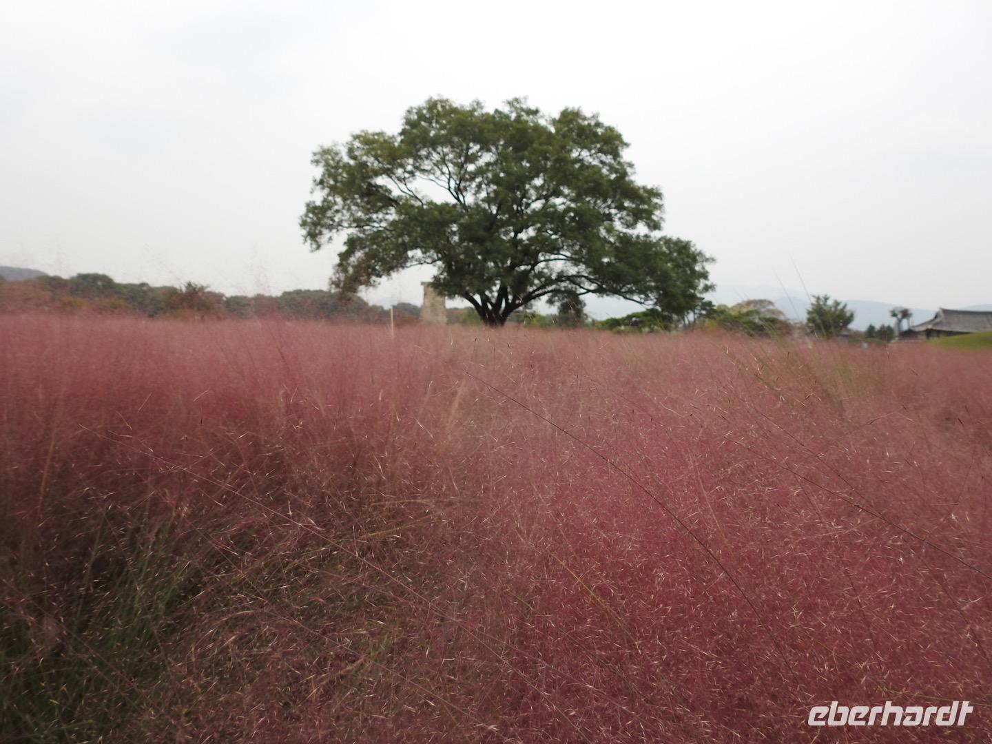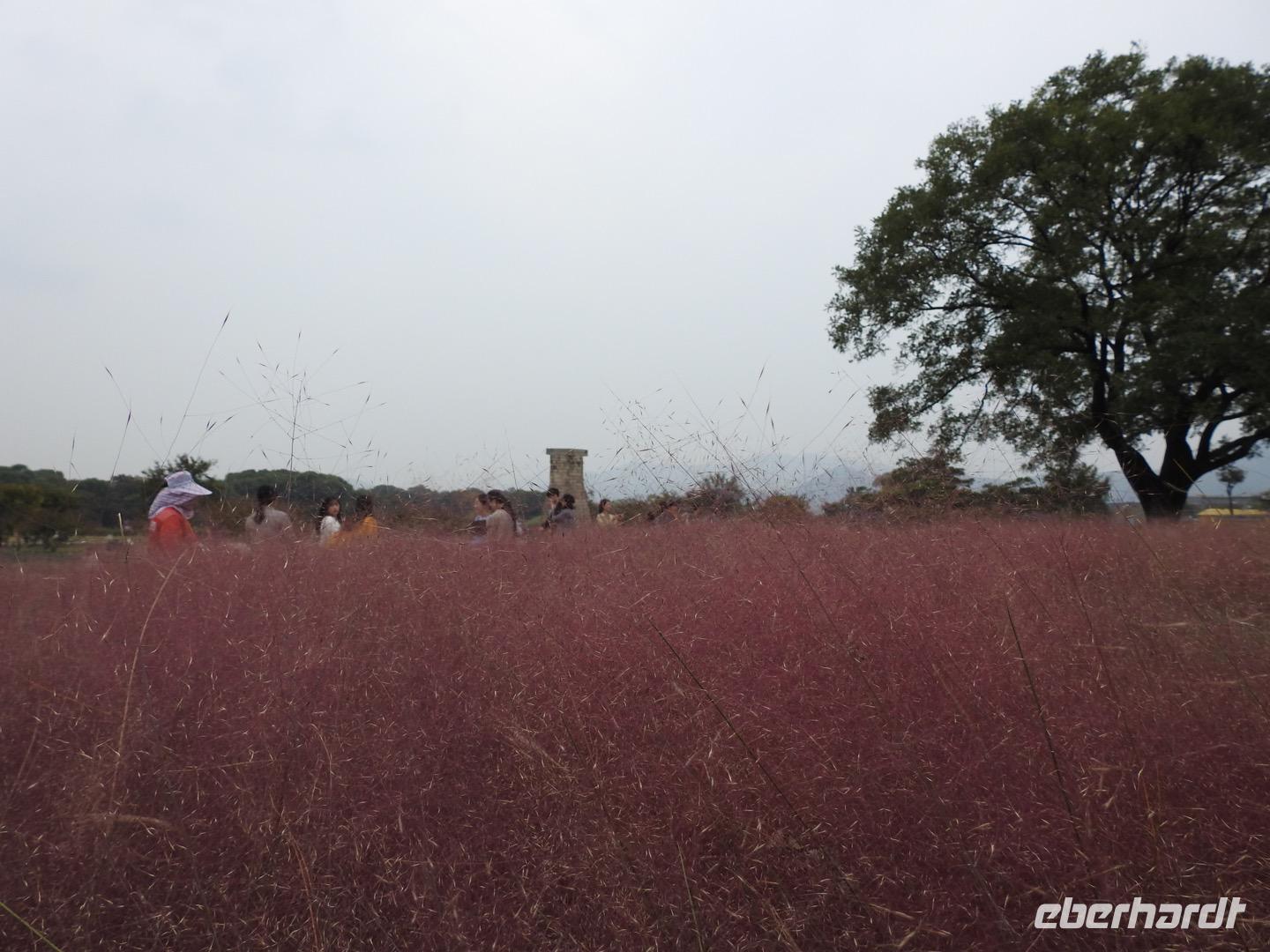 An der ältesten Sternwarte der Welt, tummelt sich heute die koreanische Jugend. Dieser unscheinbare Steinbau, wird wohl von Archäologen der ganzen Welt bewundert und taucht in jedem koreanischen Schulbuch auf. Jedes koreanische Kind muss mindestens einmal während der Schulzeit hierher. Uns interessiert viel mehr der sich anschließende Blumengarten mit seinem weinroten Gras, dass in deutschen Reiseprospekten, die für Korea werben, auftaucht.