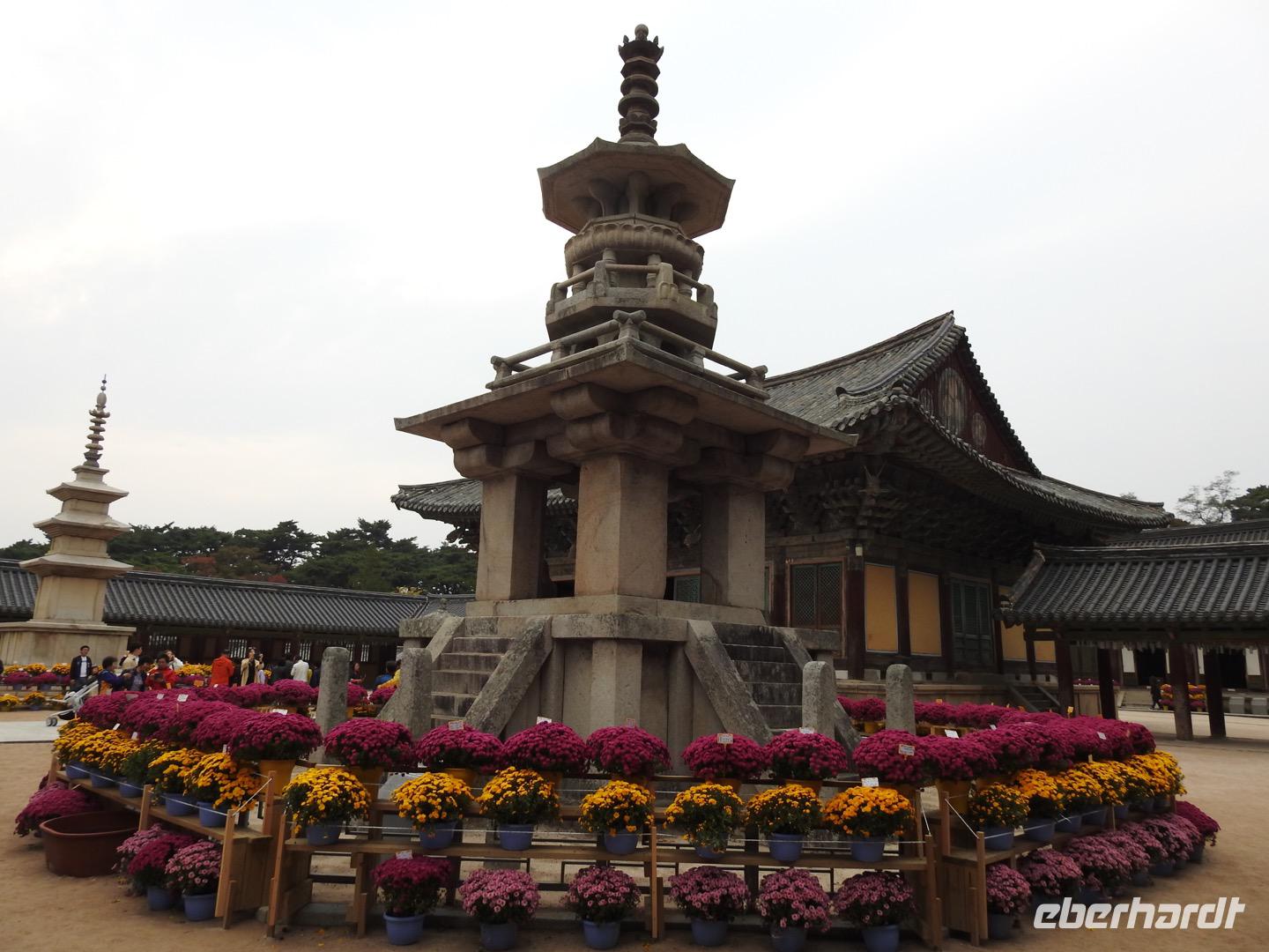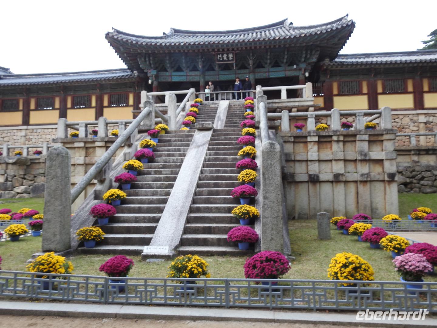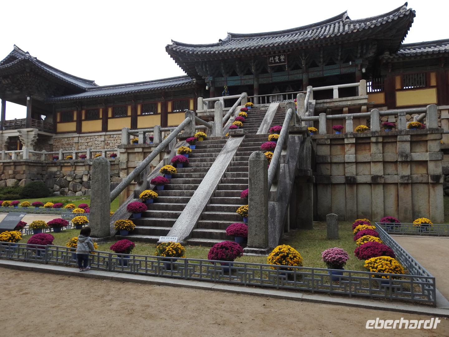 Zum Schluss besuchen wir heute noch den Bulguksa Tempel. Es ist der bekannteste koreanische Tempel und beherbergt sieben koreanische Nationalschätze. Zwei Treppen, zwei Pagoden, zwei Buddhas und einen Reliquienbehälter. Alles Originale aus der Silla-Zeit. Erbaut wurde der Tempel 535 und seit 752 hat er die heutigen Ausmaße.