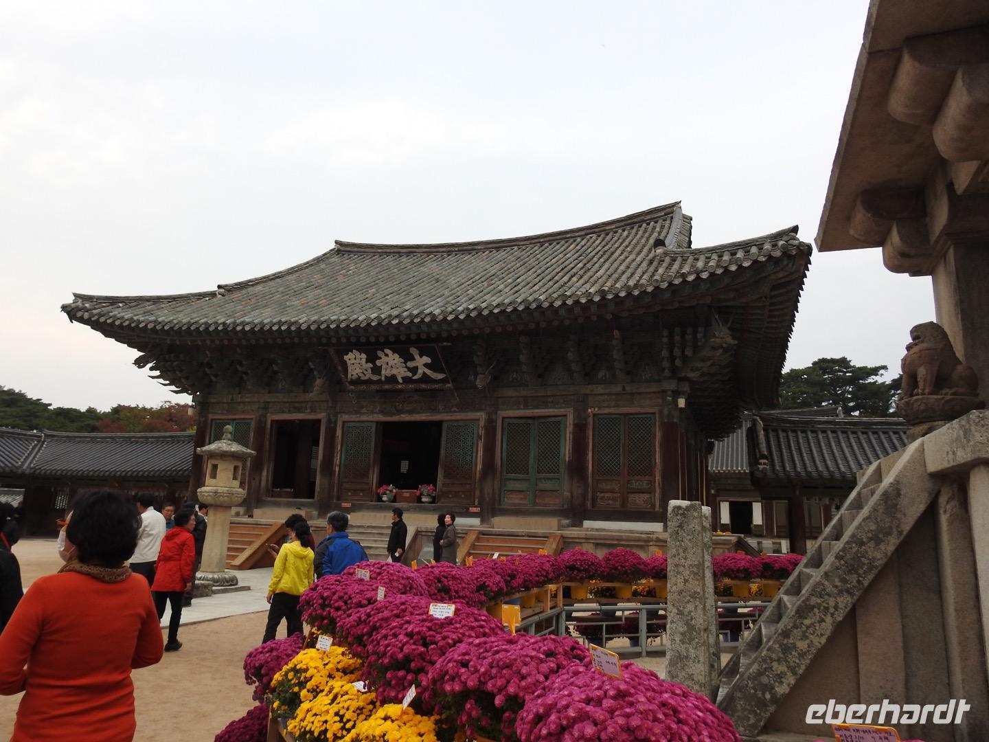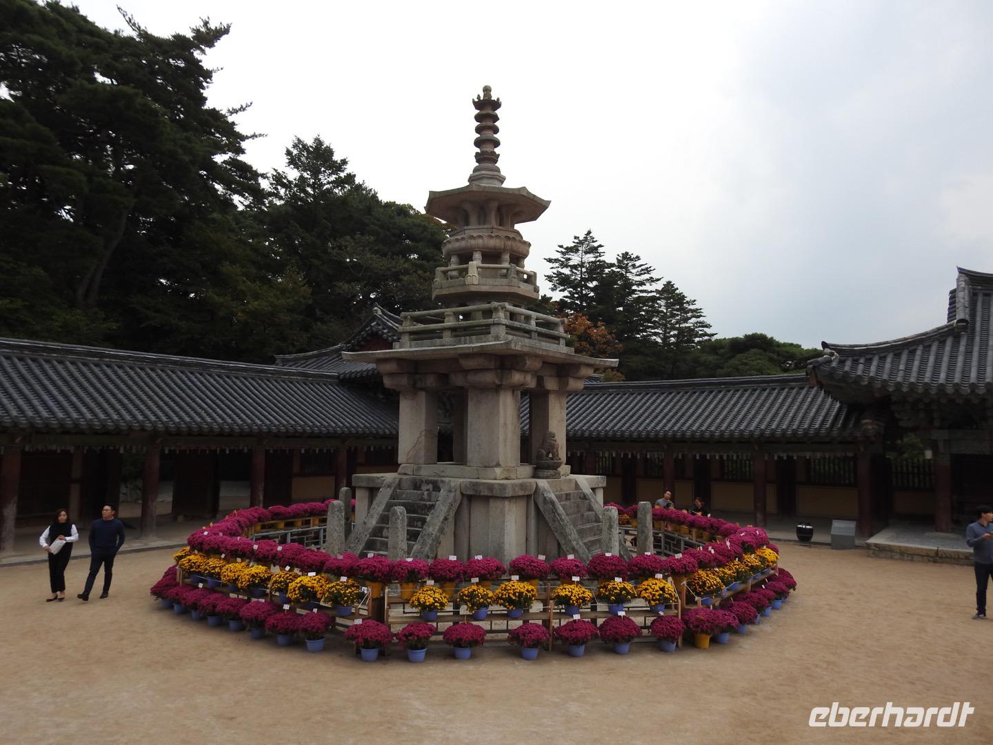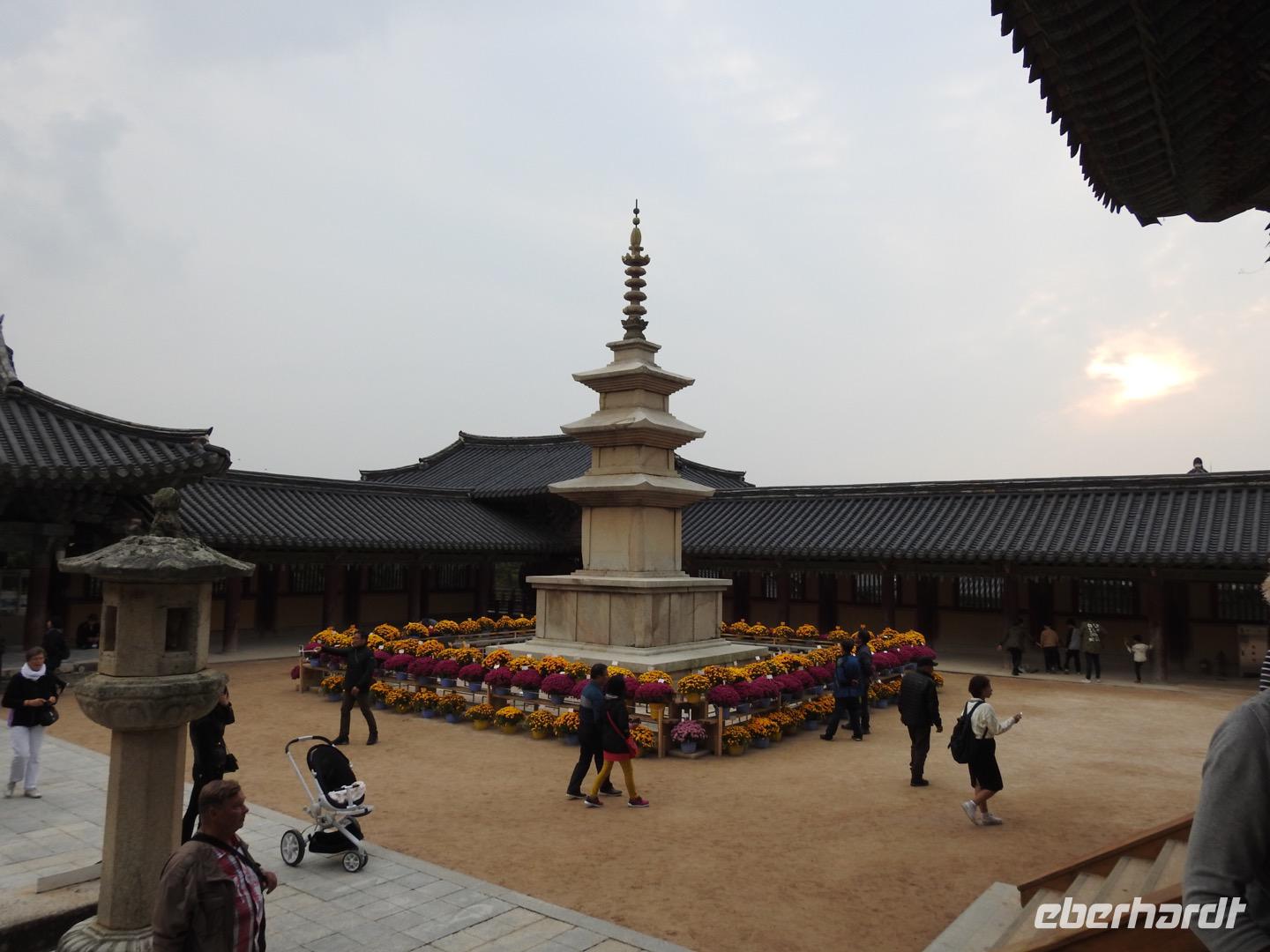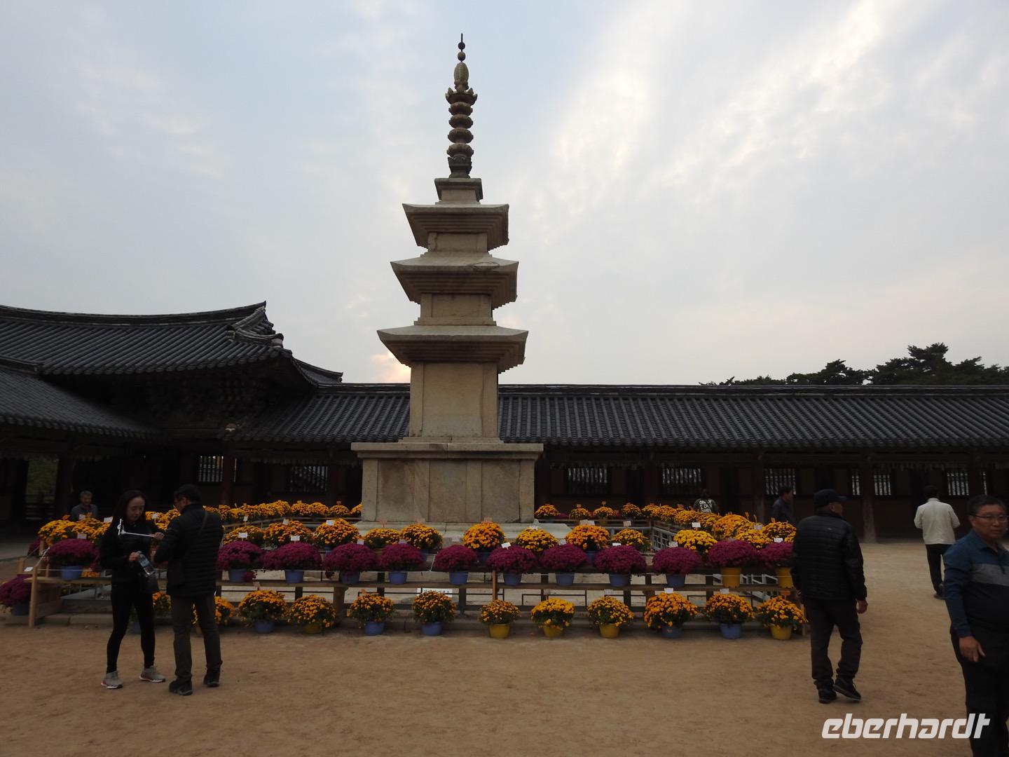 Zum Schluss besuchen wir heute noch den Bulguksa Tempel. Es ist der bekannteste koreanische Tempel und beherbergt sieben koreanische Nationalschätze. Zwei Treppen, zwei Pagoden, zwei Buddhas und einen Reliquienbehälter. Alles Originale aus der Silla-Zeit. Erbaut wurde der Tempel 535 und seit 752 hat er die heutigen Ausmaße.