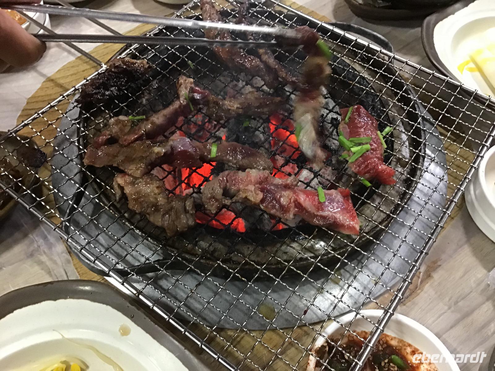 In der Hauptstraße von Insadong legen wir eine halbstündige Pause zum Schlendern und Shoppen ein, bevor wir zum Abendessen fahren. Anstatt der Suppentöpfe, wie gestern, ist heute ein Grill in den Tisch eingelassen. Hier wird bereits vorgegartes Fleisch knusprig gebraten. Kalte Vorspeisen kennen wir jetzt schon, aber folgende Konstruktion ist neu: in ein Salatblatt, dass mit scharfer Soße eingerieben wird, packt man das Fleisch und Zutaten seiner Wahl, zum Beispiel Knoblauchzehen, wabbelige Geleespalten (aus kleinen grünen Bohnen hergestellt) oder Gemüse, alles was auf dem Tisch steht eben, dann wird das Blatt zusammen gerollt - fertig. Jetzt kann man es sich schmecken lassen. Für Ungeübte etwas schwierig, bei mir fällt alles wieder auseinander und alles ist vollgeschmaddert, aber es ist sehr lustig. Mit Stäbchen und Löffel erreichen die Zutaten letztendlich doch meinen Mund und es schmeckt köstlich (wenn auch nicht jedem).