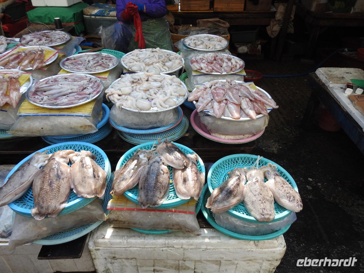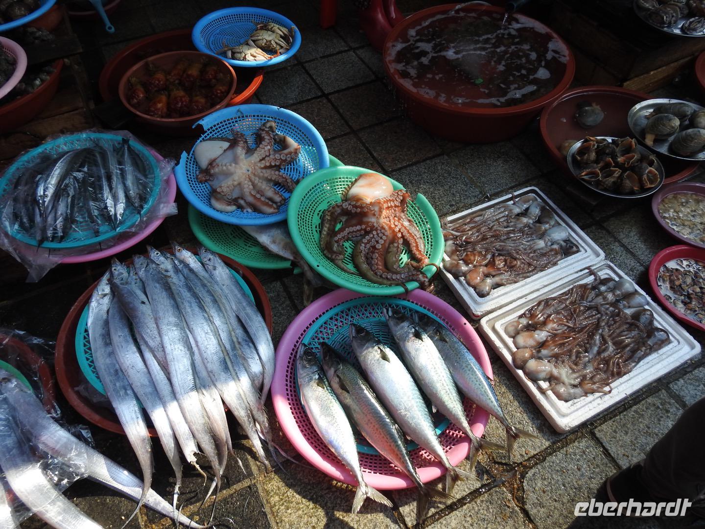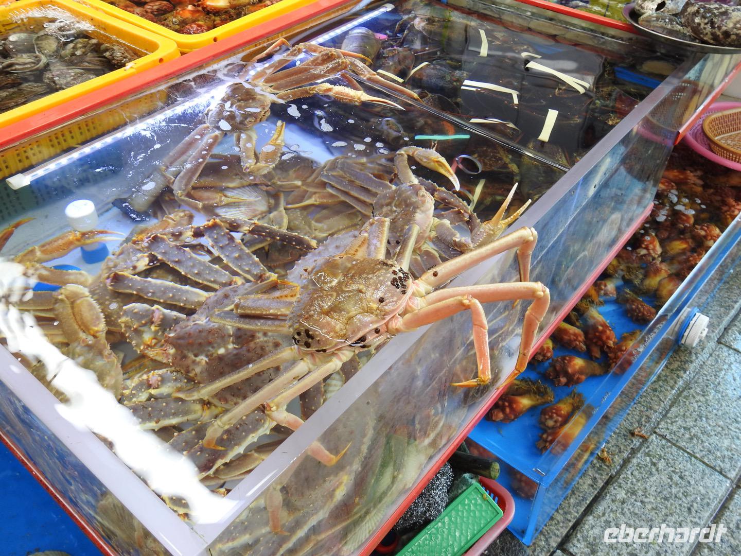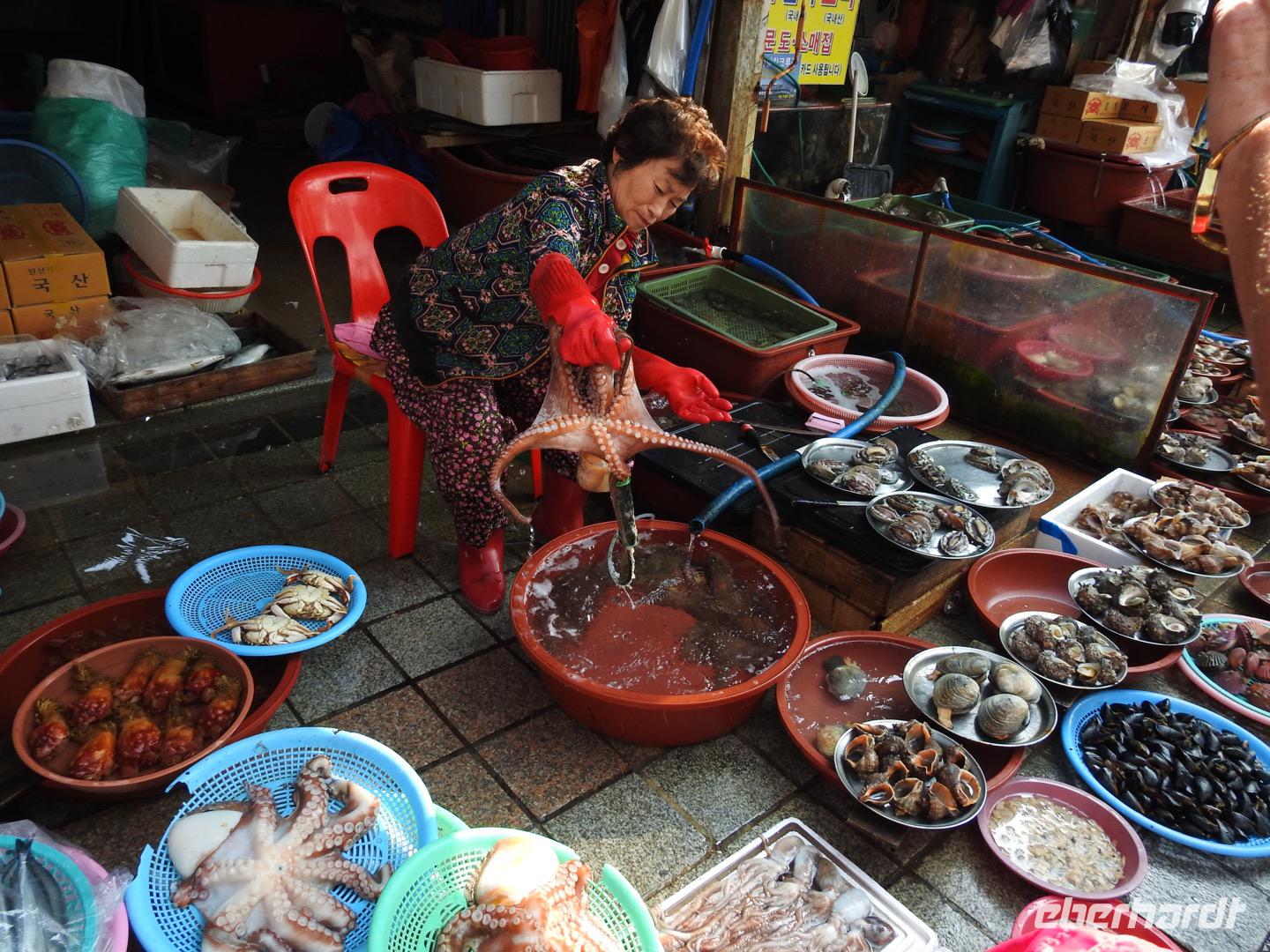 Seescheide, Abalone, Seegurke, Degenfisch sind nur einige Spezialitäten, die auf dem großen Fischmarkt von Busan angeboten werden. Wir haben Glück, es ist leer. Die Käufer für die Restaurants kommen früh um vier, die Hausfrauen nachmittags und die Geschäftsleute abends. So können wir fast gemütlich über den Fischmarkt spazieren und alles nach Herzenslust fotografieren. Viele Tintenfische, Oktopusse, Riesenkrabben und Muscheln jeglicher Couleur warten darauf, verkauft zu werden und später im Kochtopf zu landen. Manches kann man auch loh essen :-).