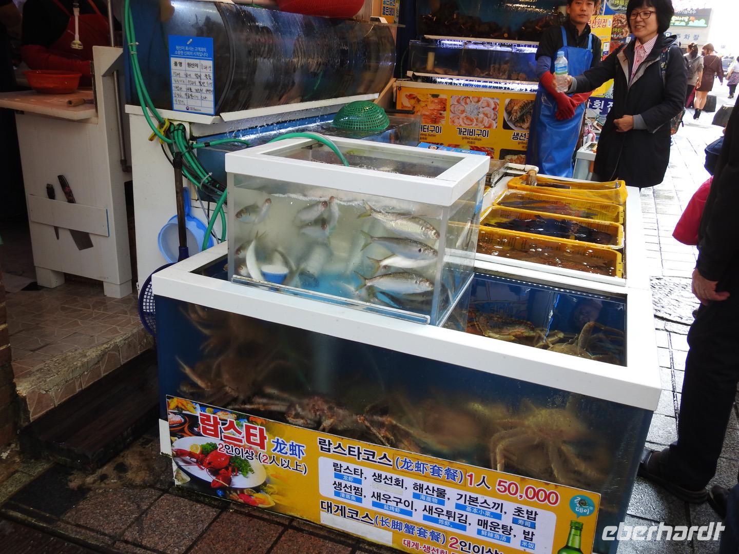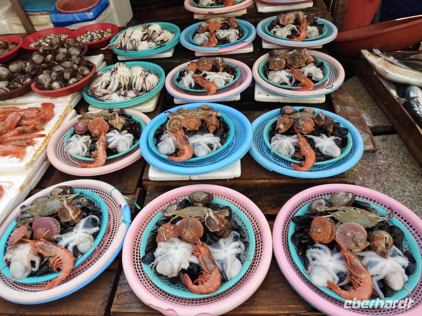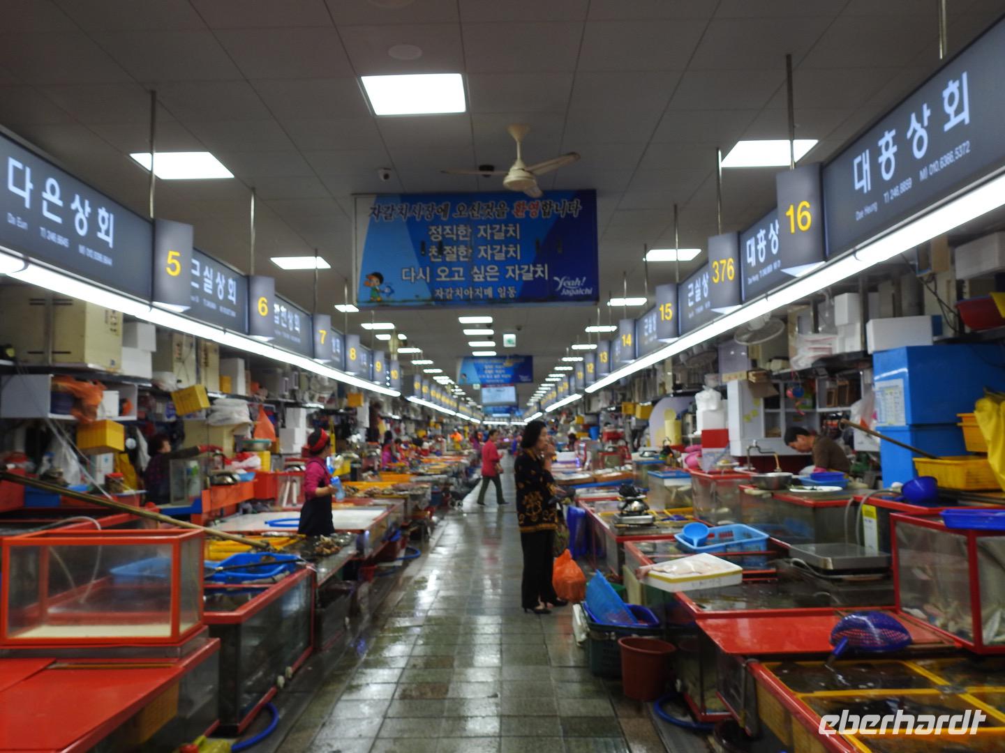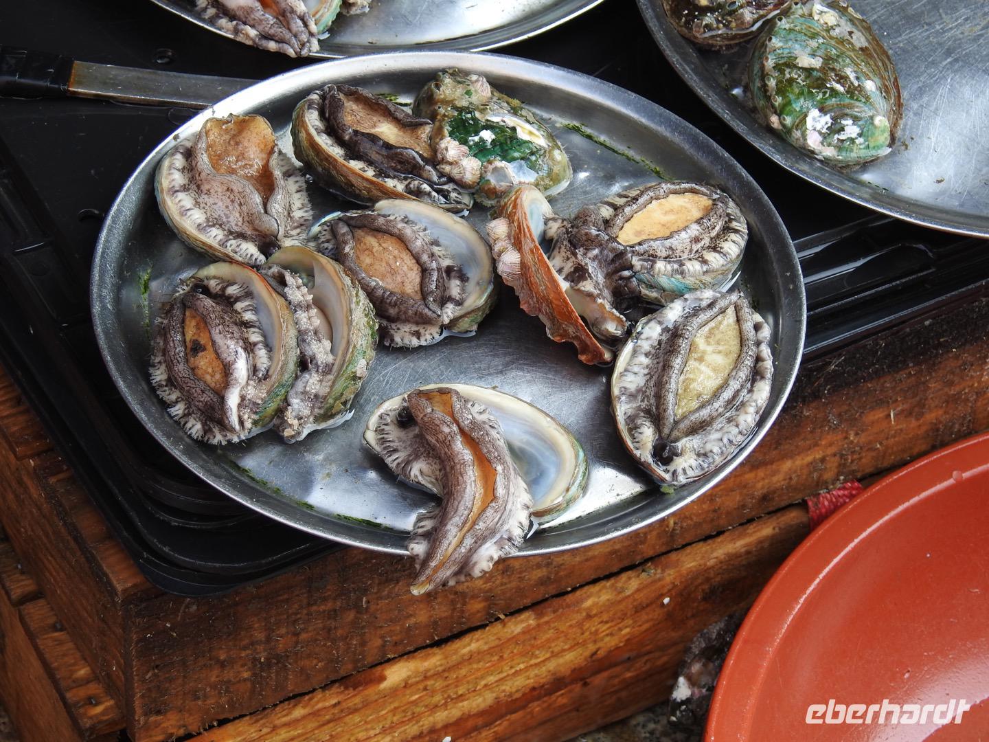 Seescheide, Abalone, Seegurke, Degenfisch sind nur einige Spezialitäten, die auf dem großen Fischmarkt von Busan angeboten werden. Wir haben Glück, es ist leer. Die Käufer für die Restaurants kommen früh um vier, die Hausfrauen nachmittags und die Geschäftsleute abends. So können wir fast gemütlich über den Fischmarkt spazieren und alles nach Herzenslust fotografieren. Viele Tintenfische, Oktopusse, Riesenkrabben und Muscheln jeglicher Couleur warten darauf, verkauft zu werden und später im Kochtopf zu landen. Manches kann man auch loh essen :-).