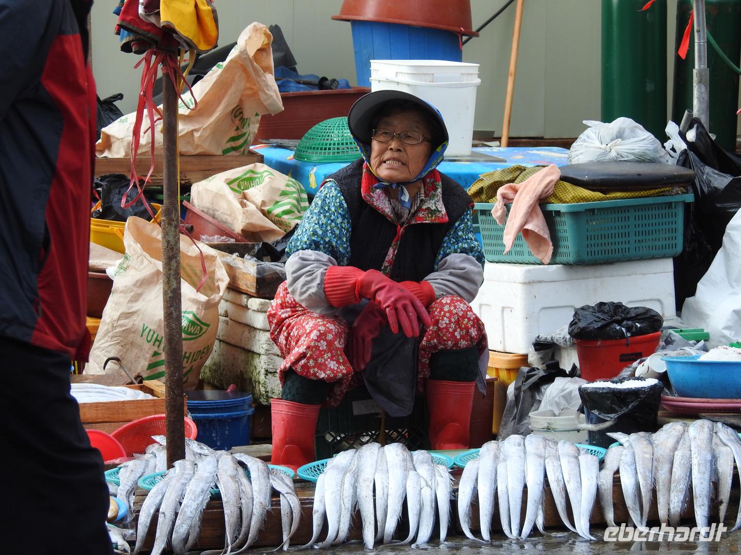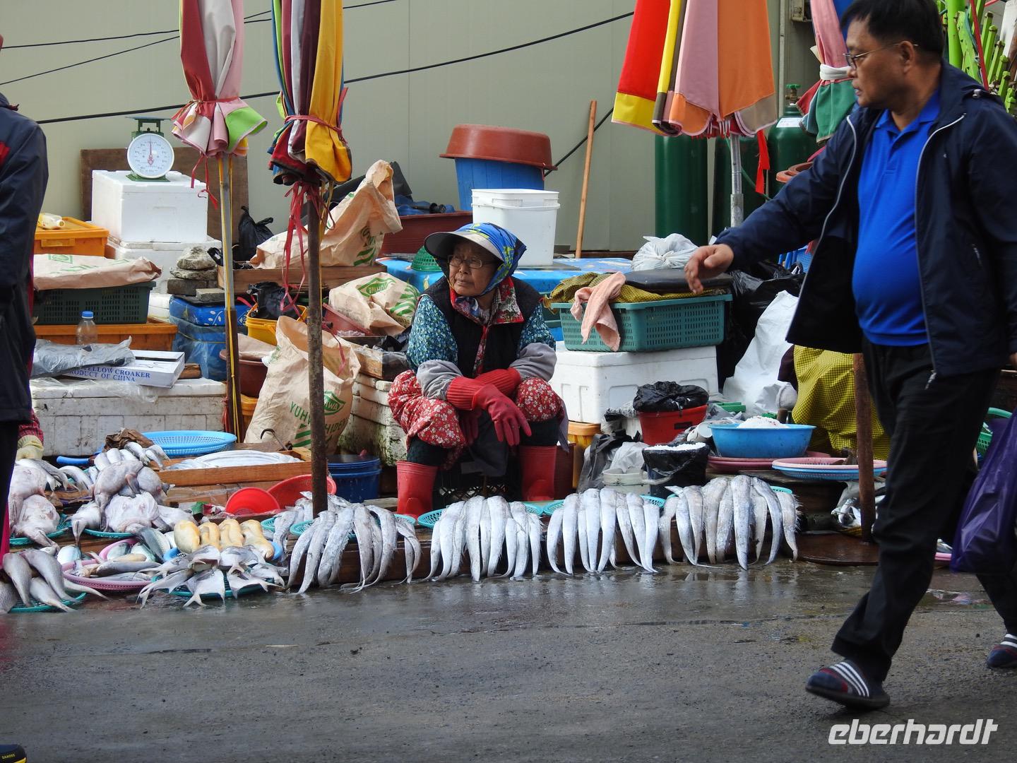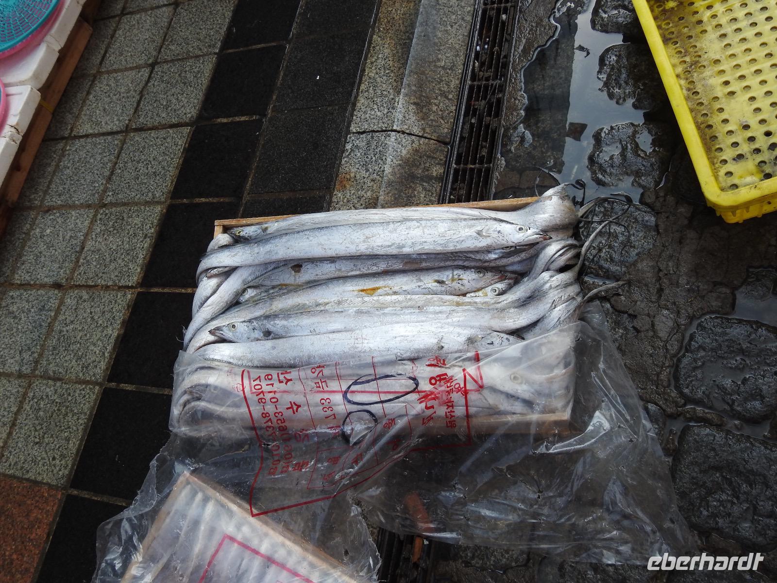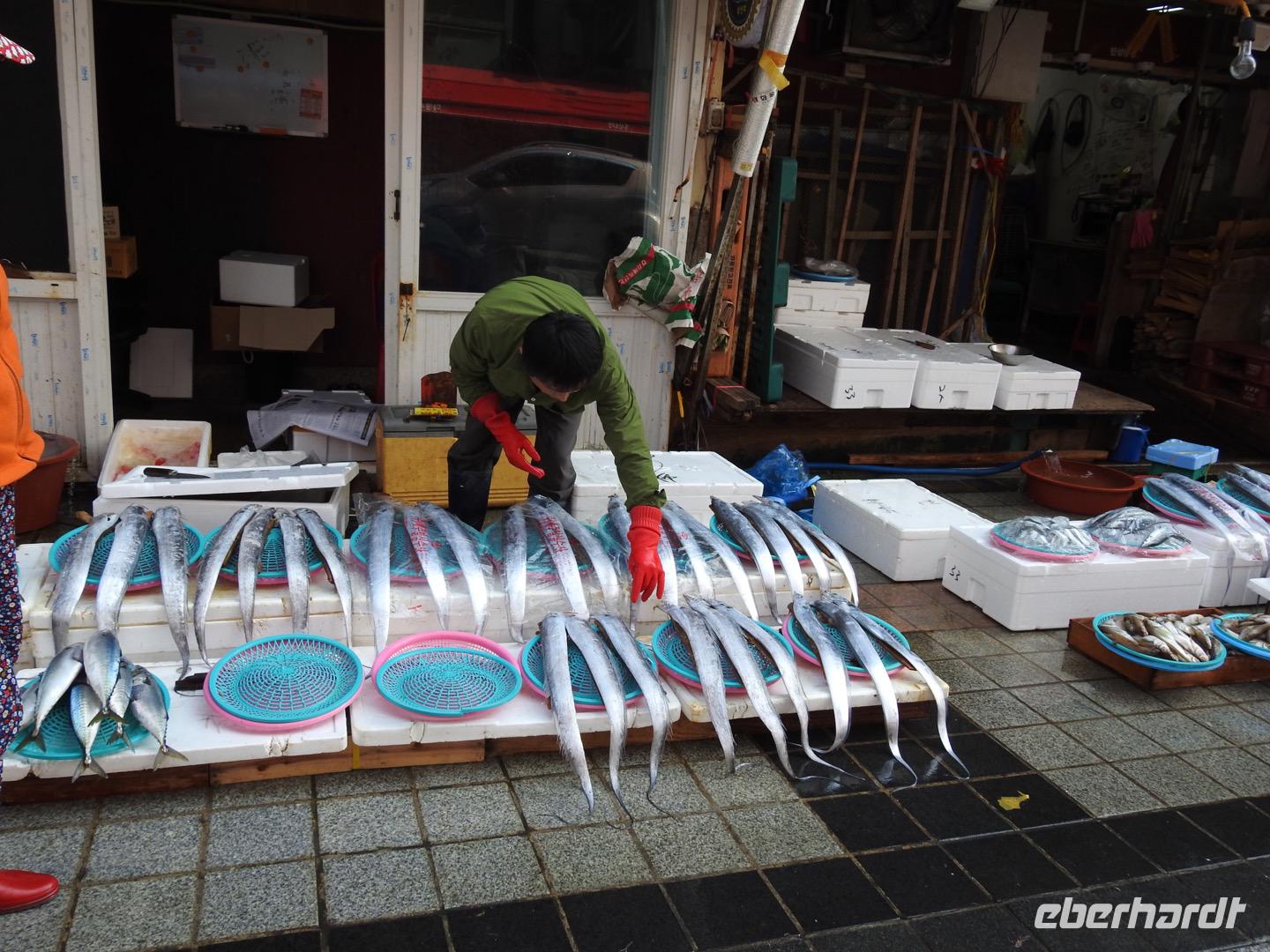 Seescheide, Abalone, Seegurke, Degenfisch sind nur einige Spezialitäten, die auf dem großen Fischmarkt von Busan angeboten werden. Wir haben Glück, es ist leer. Die Käufer für die Restaurants kommen früh um vier, die Hausfrauen nachmittags und die Geschäftsleute abends. So können wir fast gemütlich über den Fischmarkt spazieren und alles nach Herzenslust fotografieren. Viele Tintenfische, Oktopusse, Riesenkrabben und Muscheln jeglicher Couleur warten darauf, verkauft zu werden und später im Kochtopf zu landen. Manches kann man auch loh essen :-).
