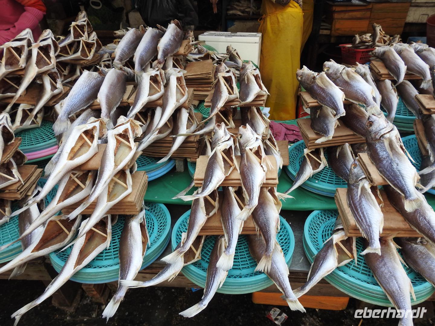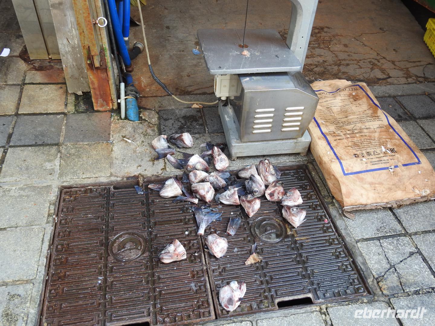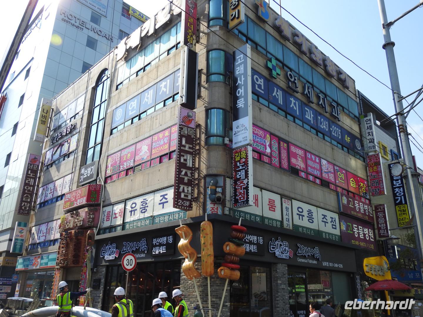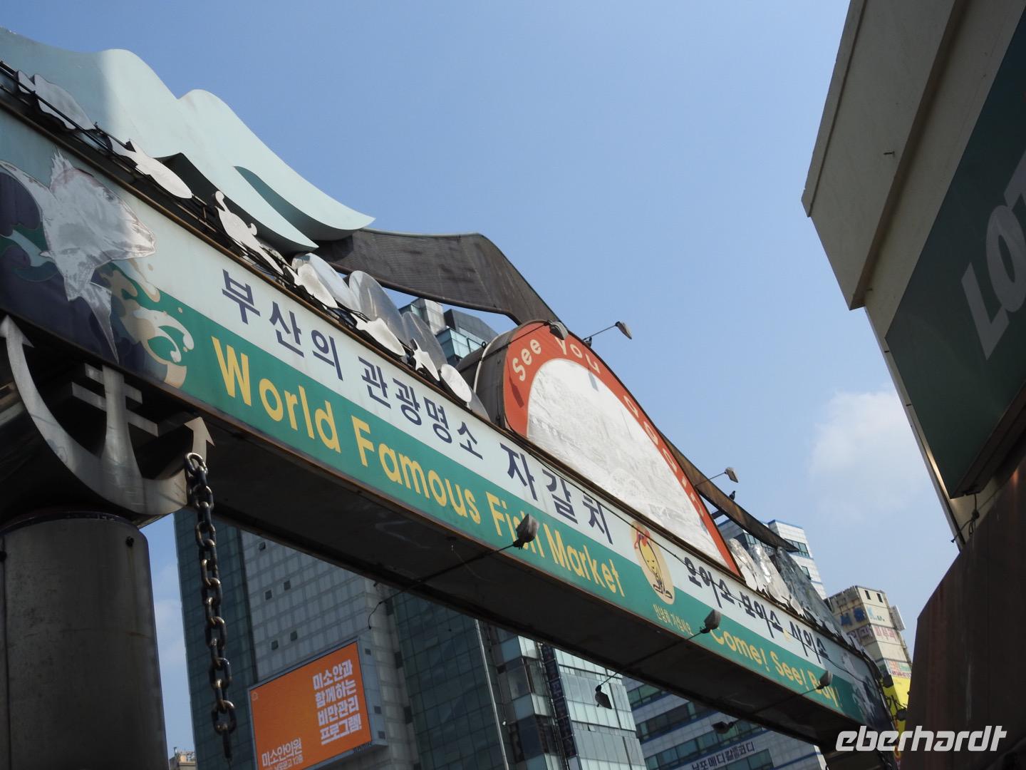 Seescheide, Abalone, Seegurke, Degenfisch sind nur einige Spezialitäten, die auf dem großen Fischmarkt von Busan angeboten werden. Wir haben Glück, es ist leer. Die Käufer für die Restaurants kommen früh um vier, die Hausfrauen nachmittags und die Geschäftsleute abends. So können wir fast gemütlich über den Fischmarkt spazieren und alles nach Herzenslust fotografieren. Viele Tintenfische, Oktopusse, Riesenkrabben und Muscheln jeglicher Couleur warten darauf, verkauft zu werden und später im Kochtopf zu landen. Manches kann man auch loh essen :-).