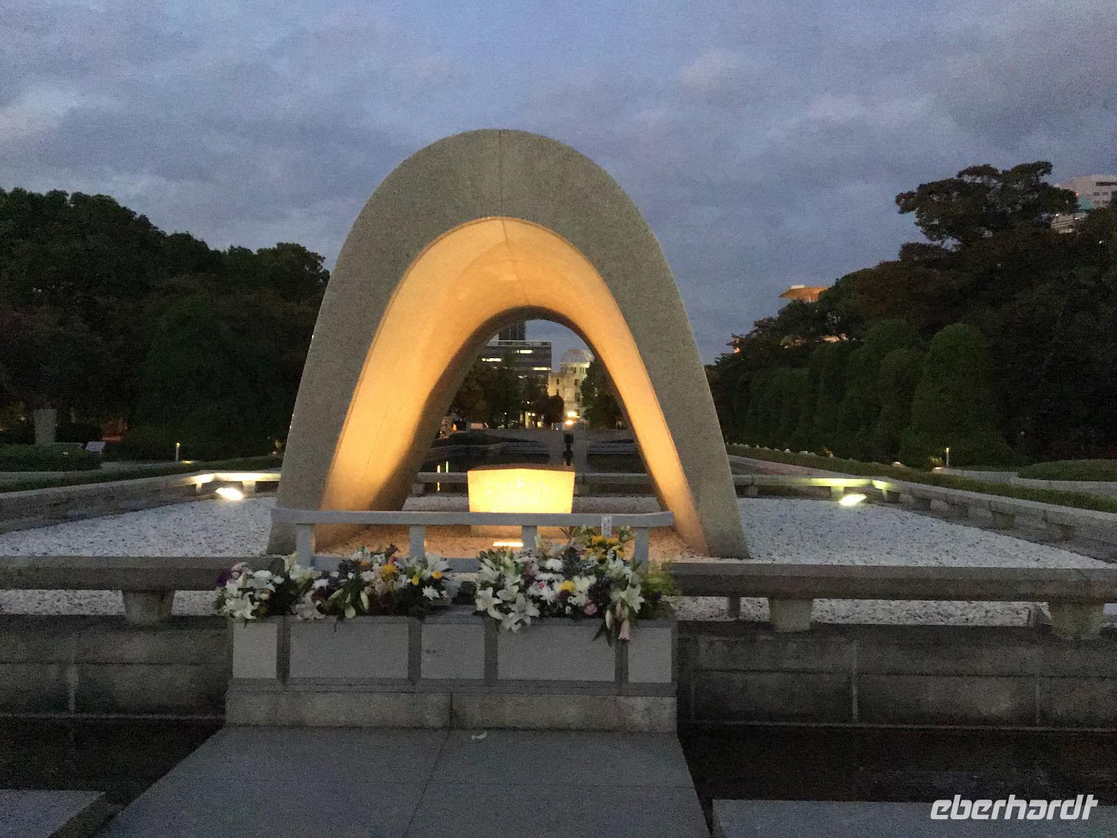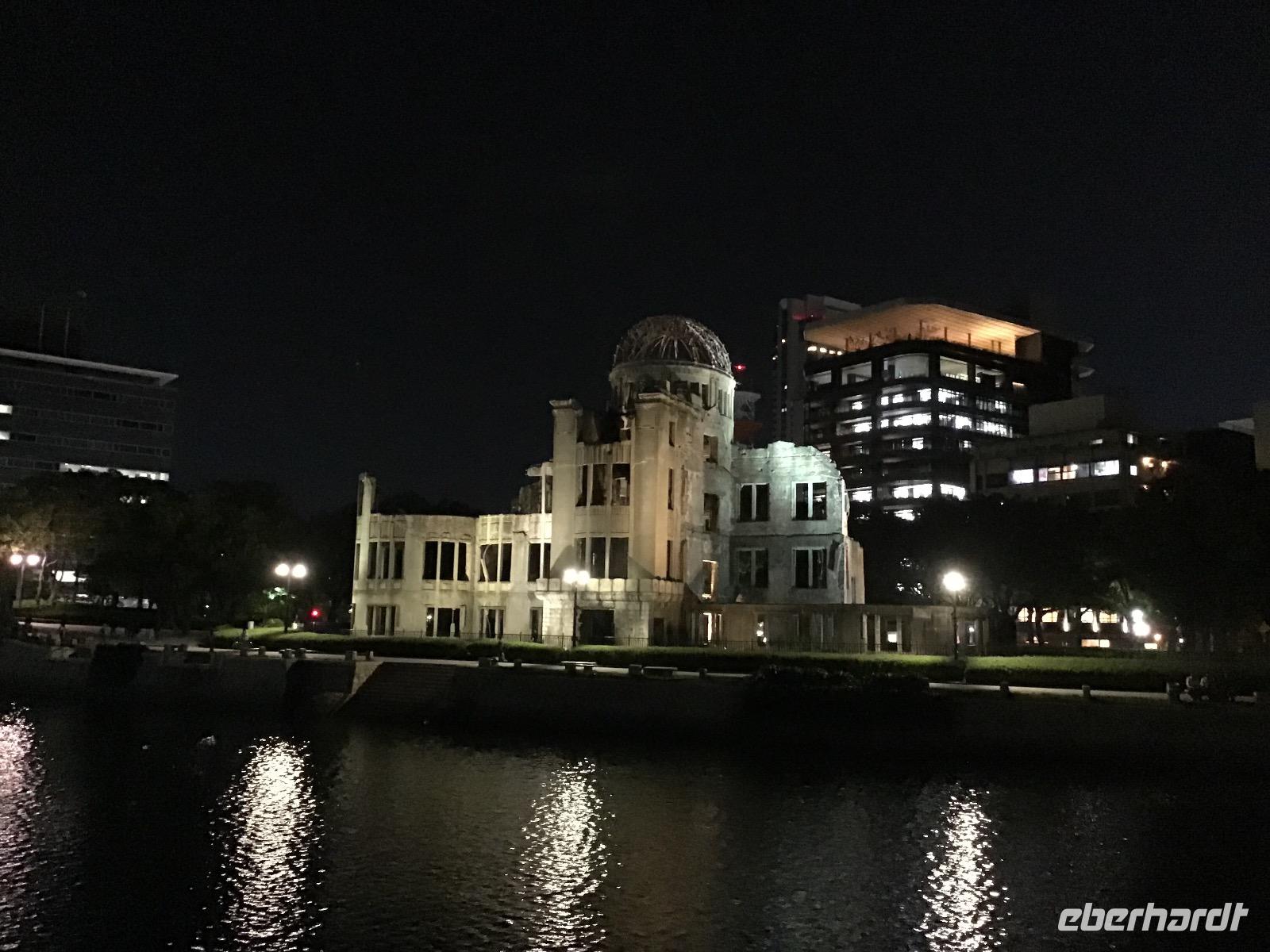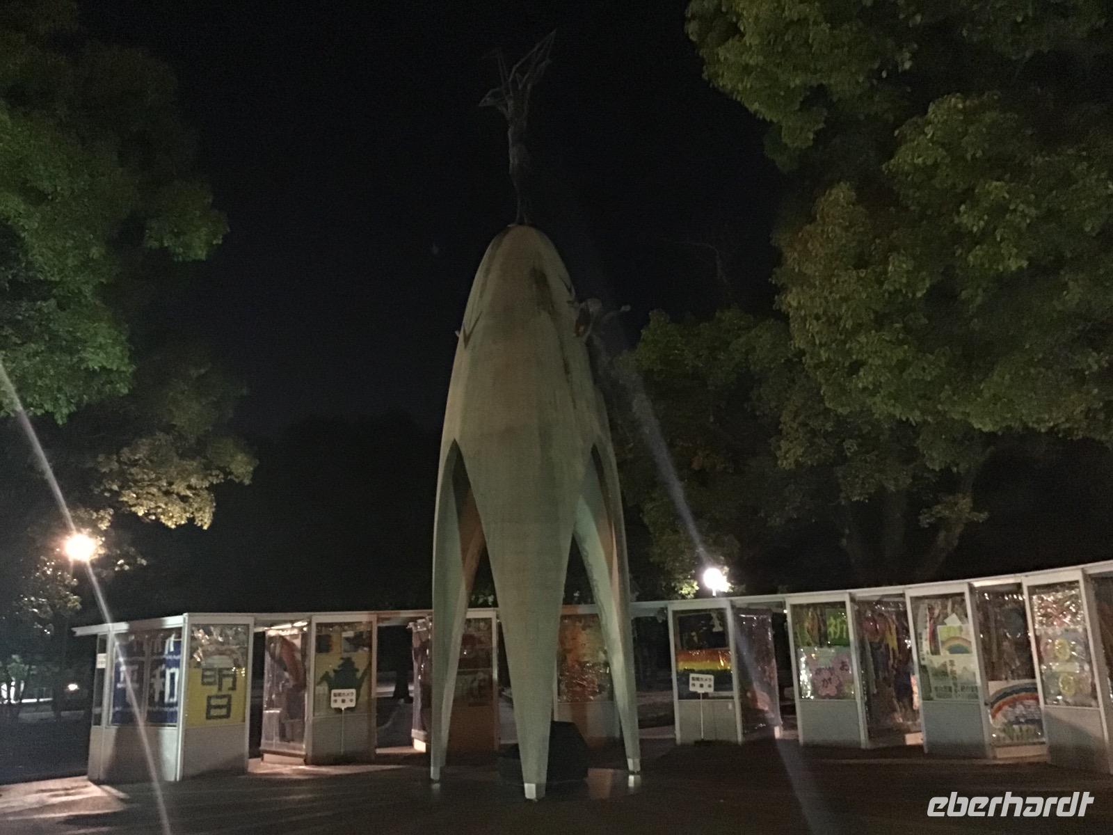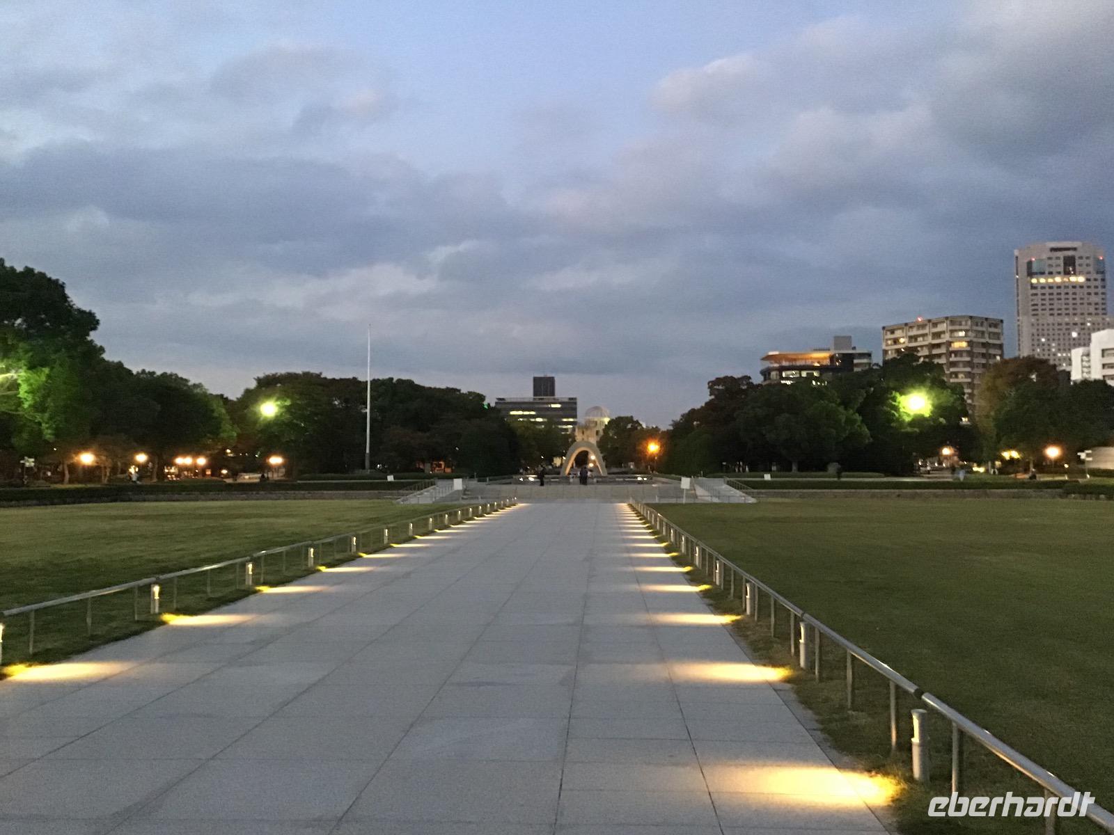 Nach einer Stunde Fahrt mit dem Shinkansen, gemütlich sitzen wir wie in der ersten Klasse, erreichen wir Hiroshima. Das Hotel befindet sich in Bahnhofsnähe, fünf Minuten zu Fuß entfernt. Wir pausieren für eine Stunde, dann geht es wieder mit dem Taxi, zum Friedenspark. Während es dunkel wird, bekommen wir einen ersten Eindruck von den Geschehnissen 1945.