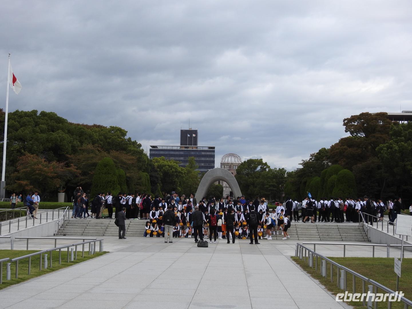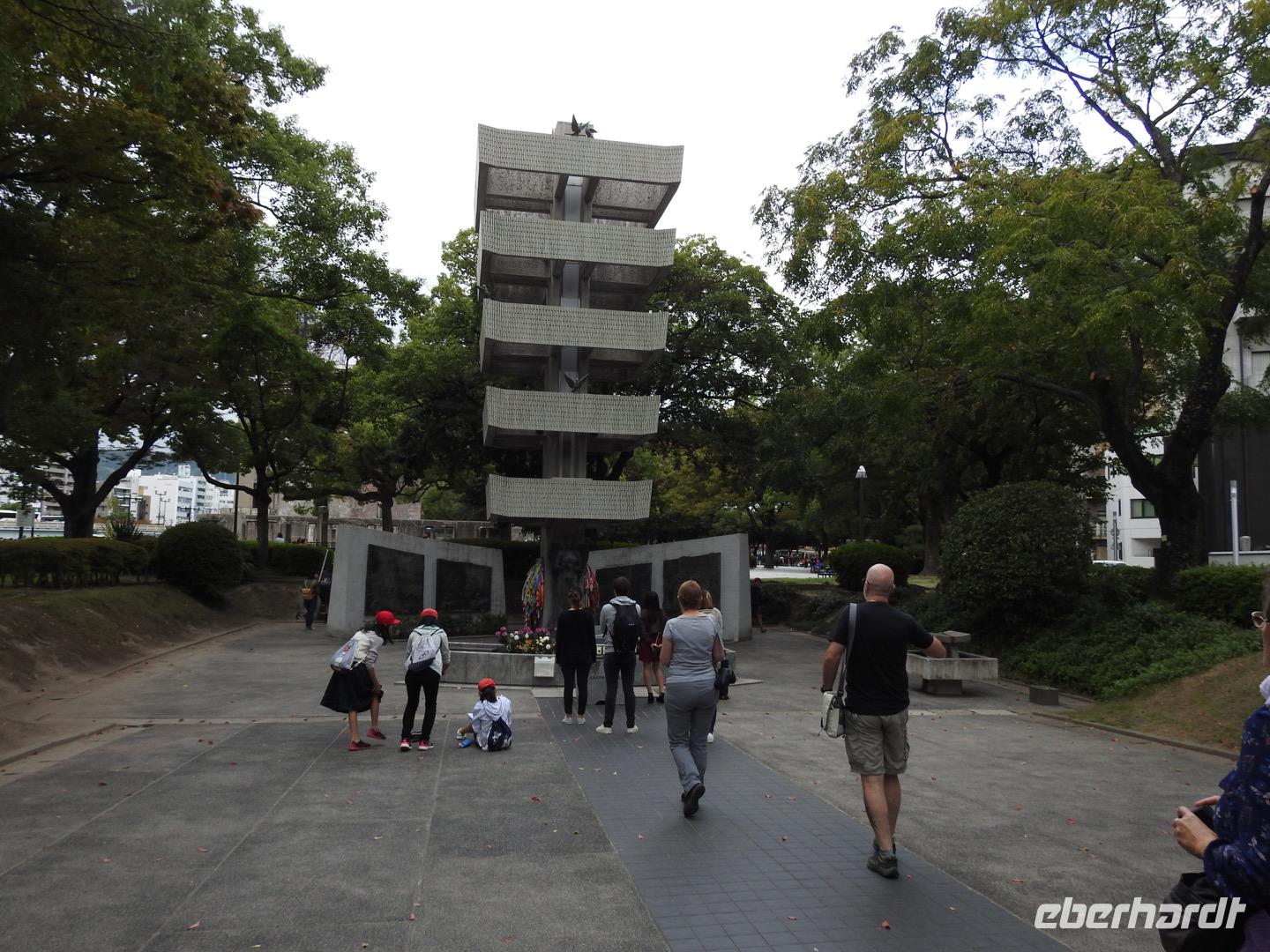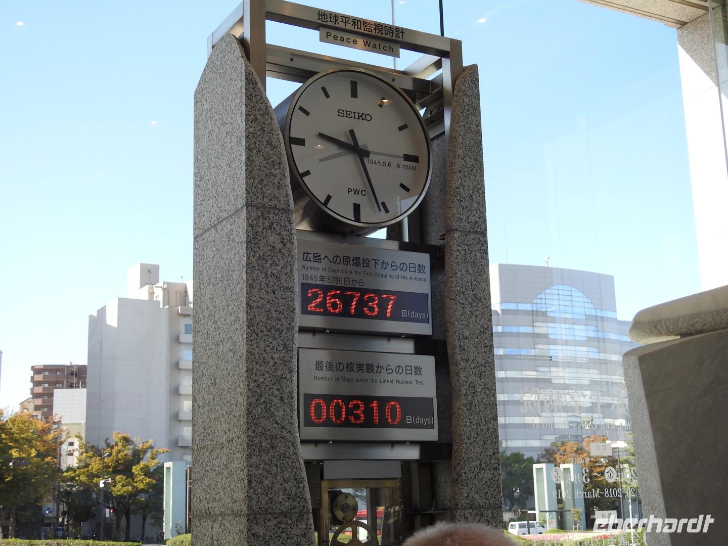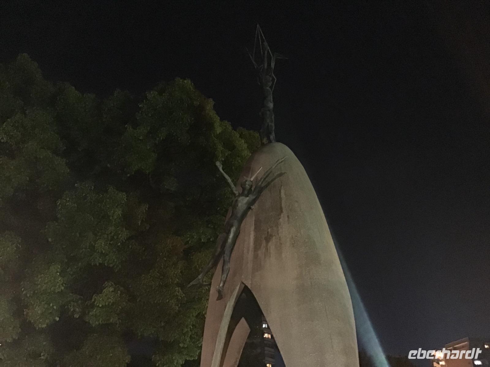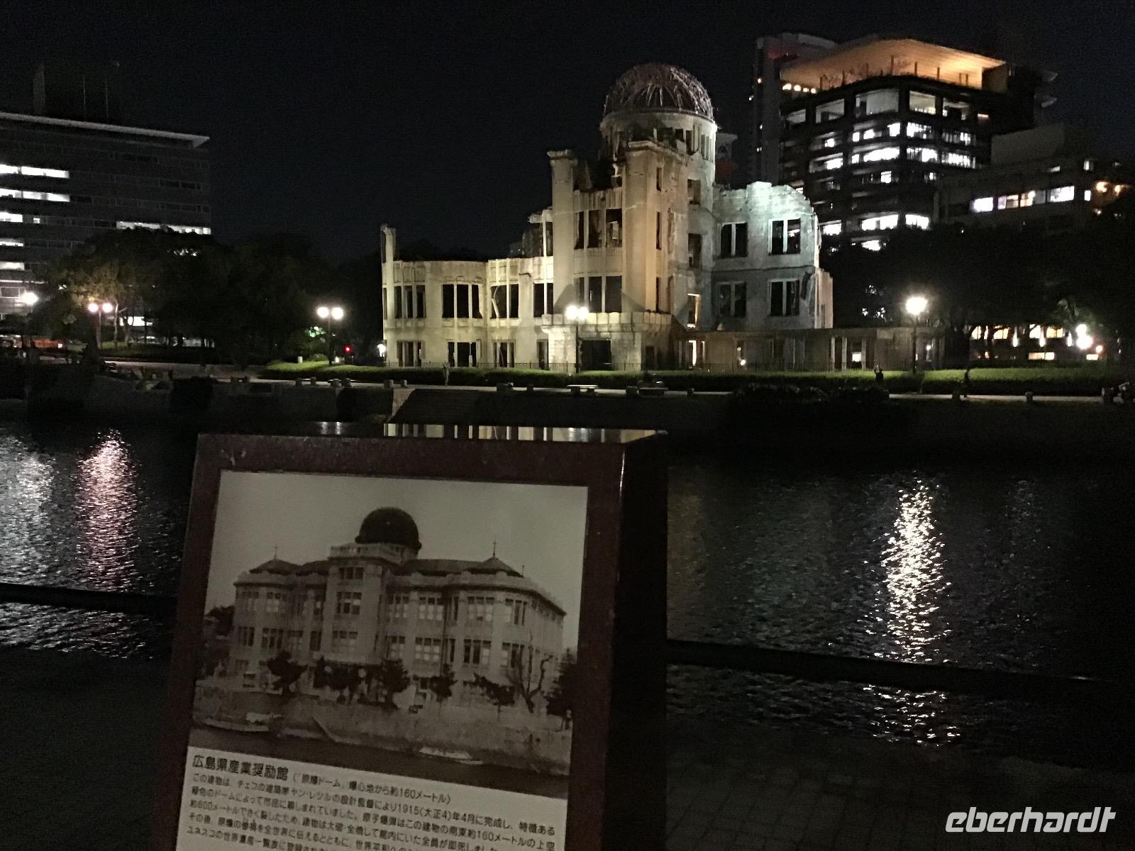 Nach einer Stunde Fahrt mit dem Shinkansen, gemütlich sitzen wir wie in der ersten Klasse, erreichen wir Hiroshima. Das Hotel befindet sich in Bahnhofsnähe, fünf Minuten zu Fuß entfernt. Wir pausieren für eine Stunde, dann geht es wieder mit dem Taxi, zum Friedenspark. Während es dunkel wird, bekommen wir einen ersten Eindruck von den Geschehnissen 1945.