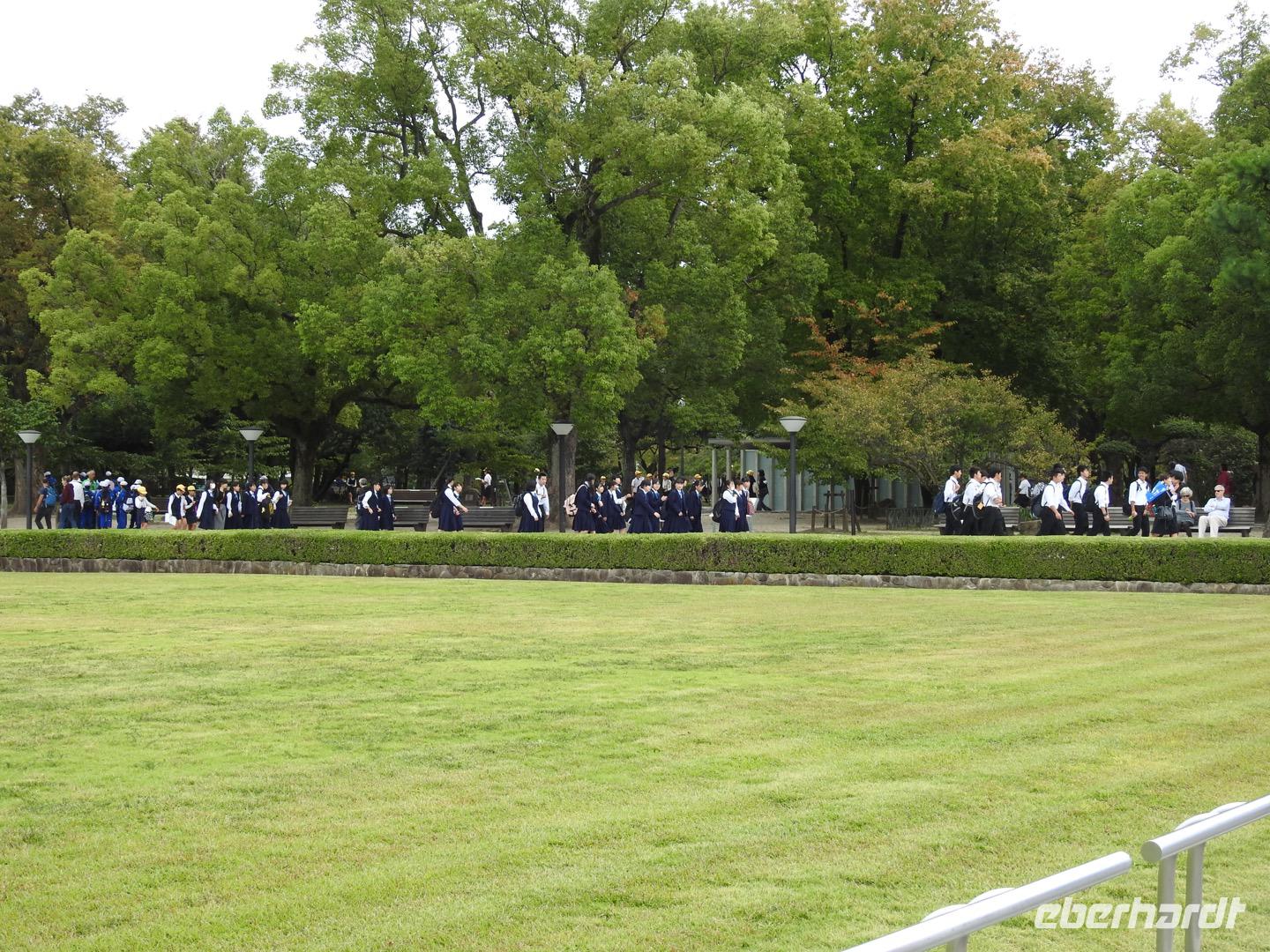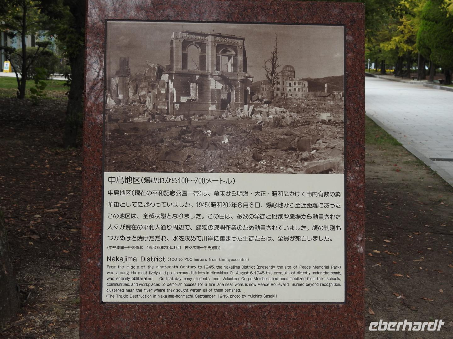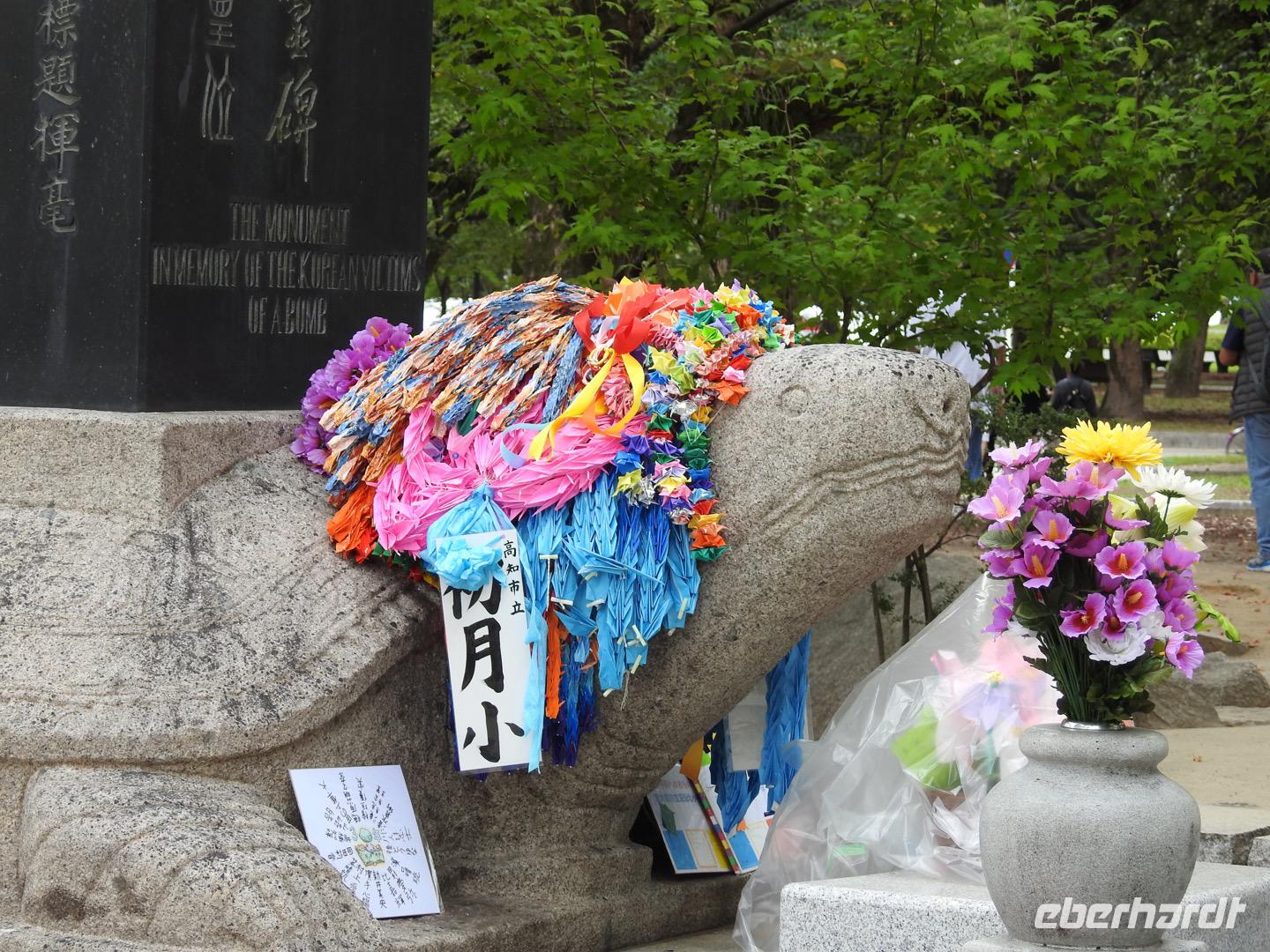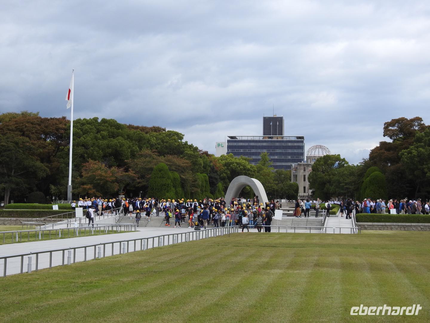 Nach einer Stunde Fahrt mit dem Shinkansen, gemütlich sitzen wir wie in der ersten Klasse, erreichen wir Hiroshima. Das Hotel befindet sich in Bahnhofsnähe, fünf Minuten zu Fuß entfernt. Wir pausieren für eine Stunde, dann geht es wieder mit dem Taxi, zum Friedenspark. Während es dunkel wird, bekommen wir einen ersten Eindruck von den Geschehnissen 1945.
