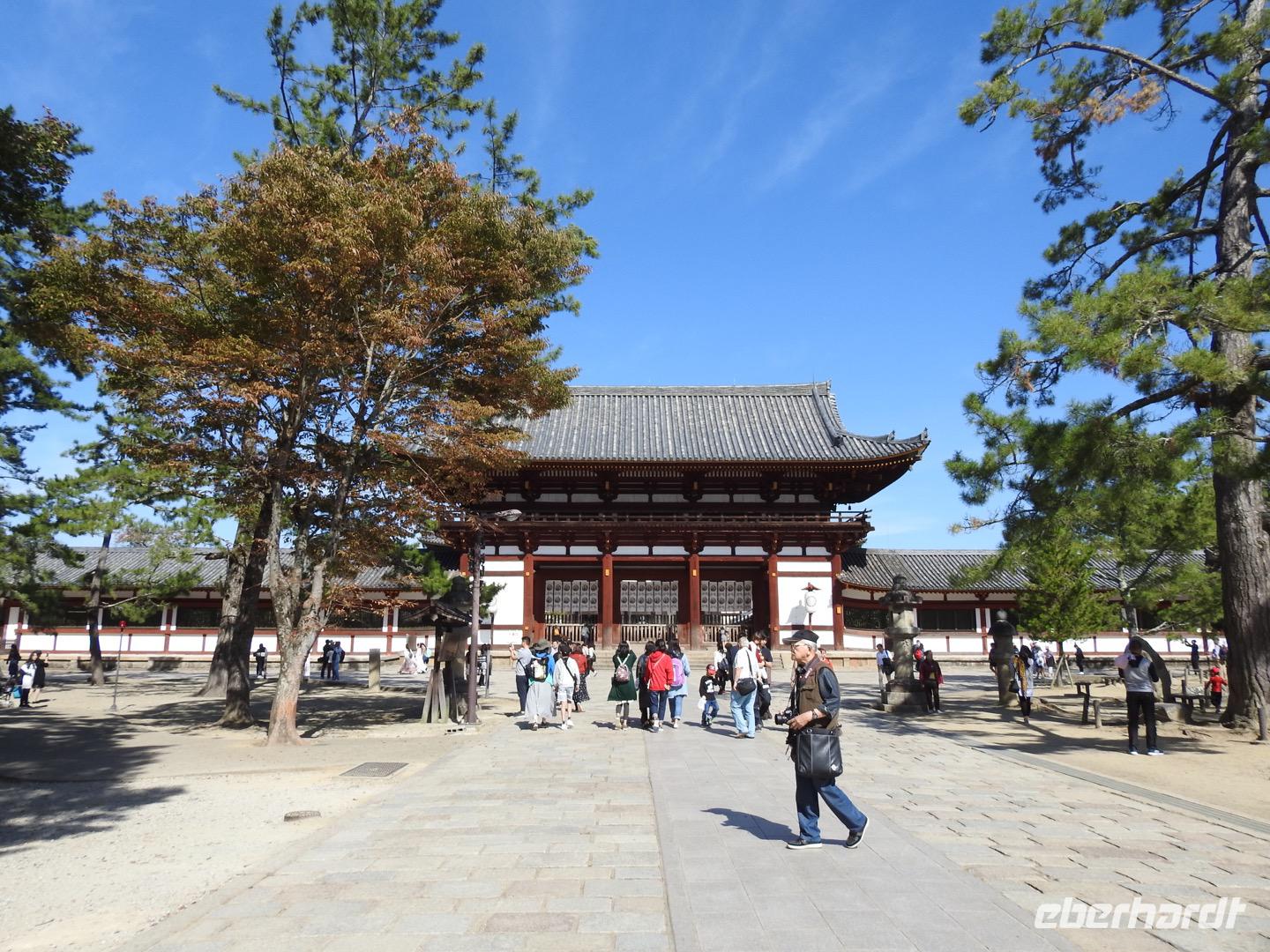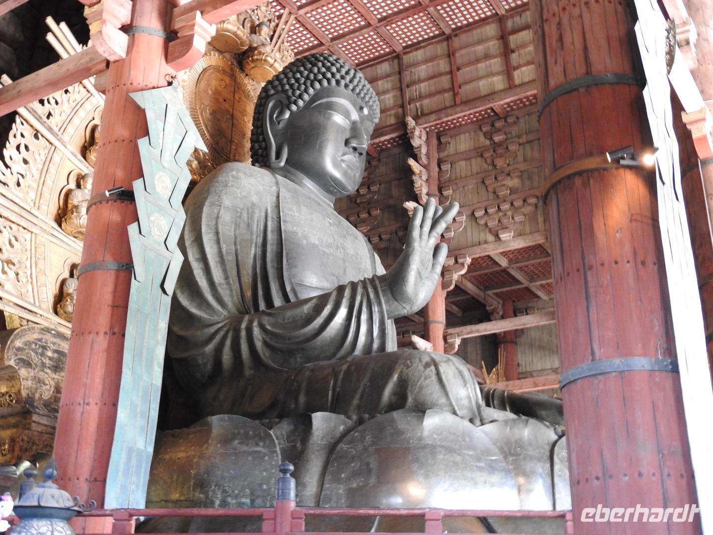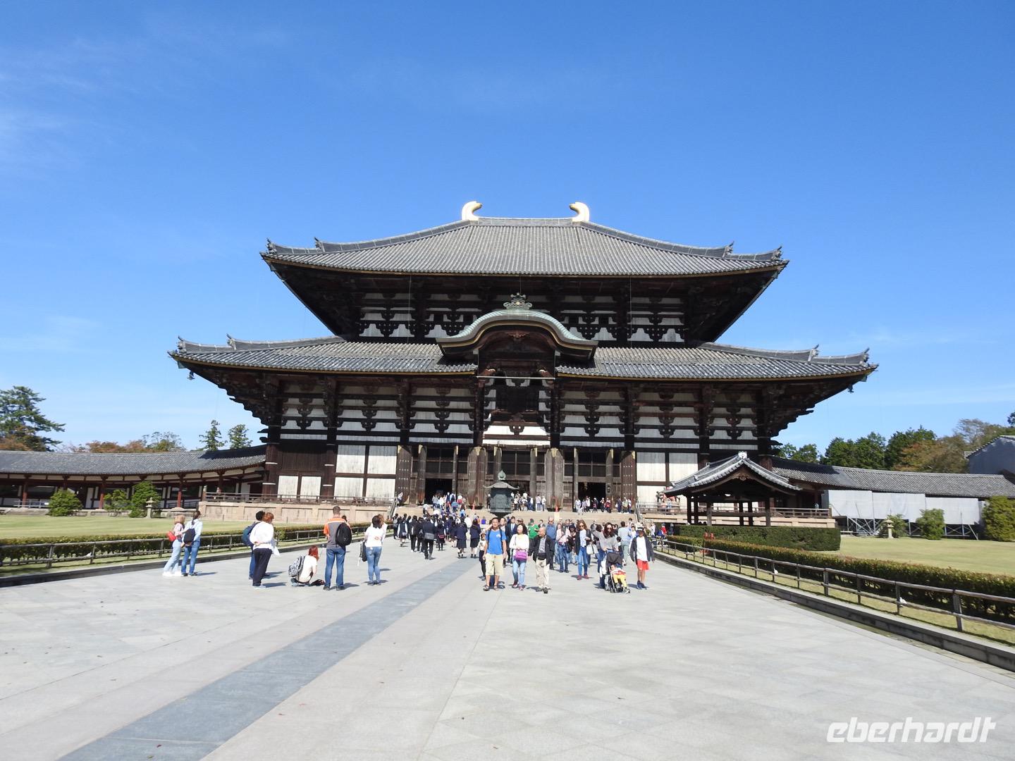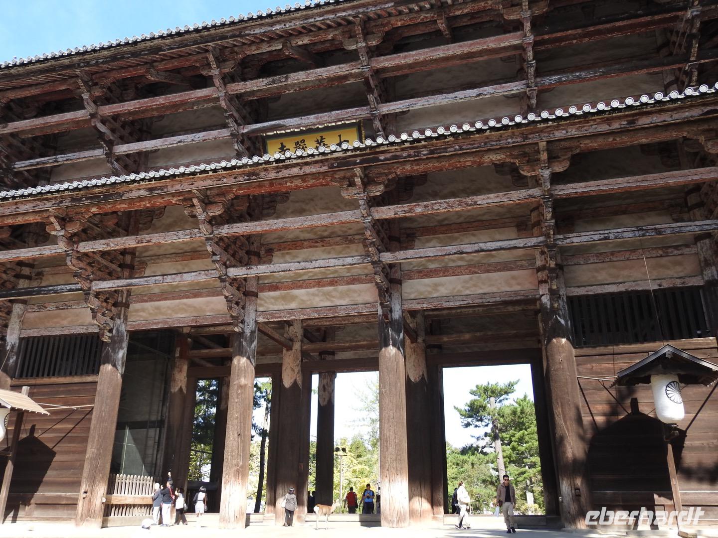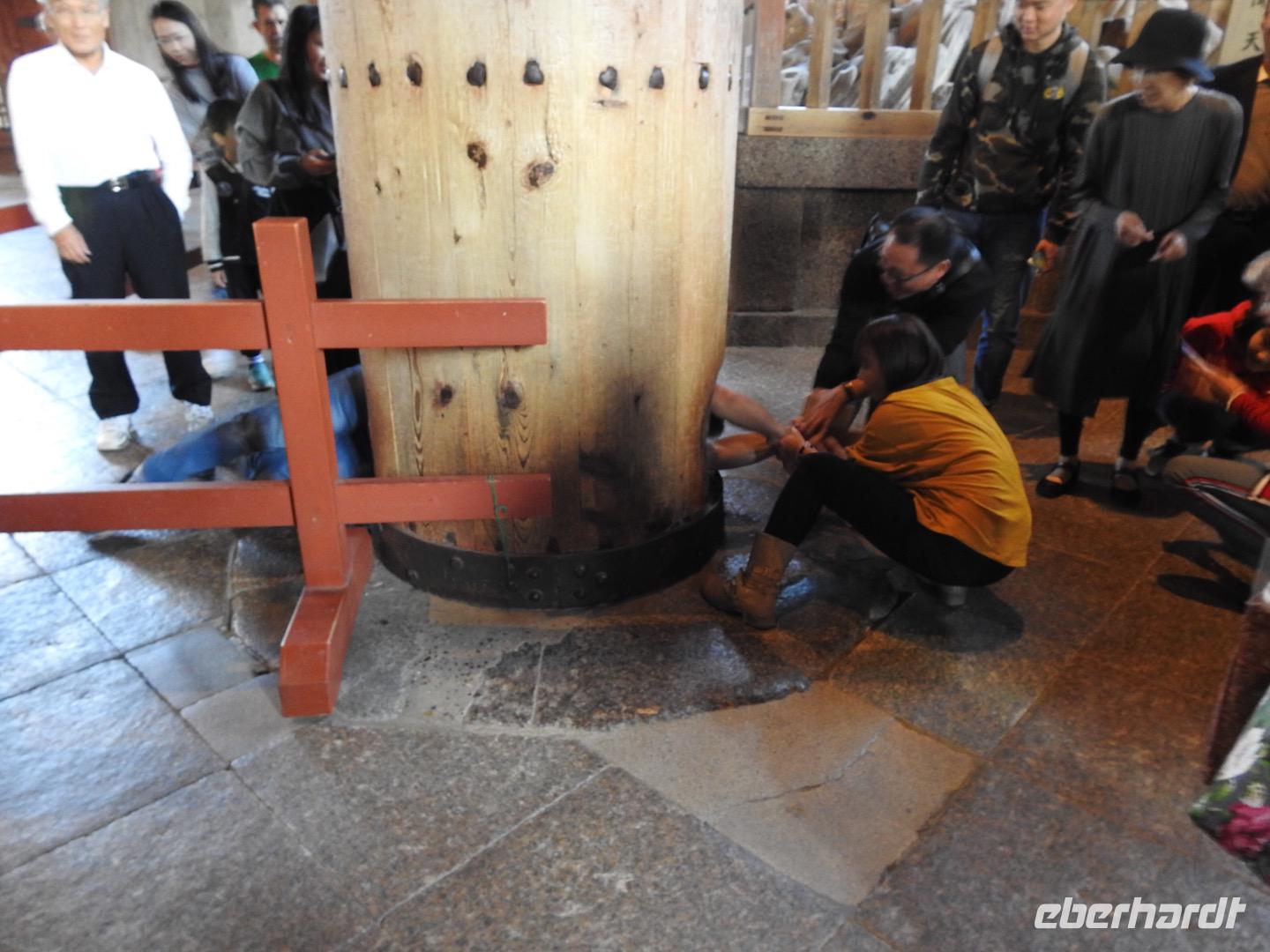 Mit der Regionalbahn fahren wir nach Nara. Obwohl wir keine Platzkarten haben, gelingt es uns diesmal, für jeden einen Sitzplatz zu bekommen. Immerhin fahren wir eine ganze Stunde. Vom Bahnhof in Nara geht es weiter mit dem Linienbus bis zum Todai-ji. Hier befindet sich das größte komplett aus Holz gebaute Gebäude der Welt. Der Tempel ist fast sechzig Meter breit und circa fünfzig Meter hoch und tief. In seinem Inneren befindet sich die größte buddhistische Bronzestatue. In der Umgebung des Tempels sind zahlreiche zahme Sika-Hirsche unterwegs, die es gewohnt sind, von den Besuchern gefüttert zu werden. Sika-Hirsche gelten im Shintoismus als heilige Götterboten und werden deshalb verehrt. An jeder Ecke kann der Besucher für etwa einen Euro Hirschkekse kaufen und diese an die immer hungrige Hirschgemeinde verfüttern. Eine andere Attraktion im Todai-ji ist eine Tempelsäule, die unten ein Loch hat, durch das sich zahlreiche Menschen quetschen, in der Annahme, dass sie damit ins Paradies kommen oder, was wahrscheinlicher ist, weil sie einfach Spaß daran haben.