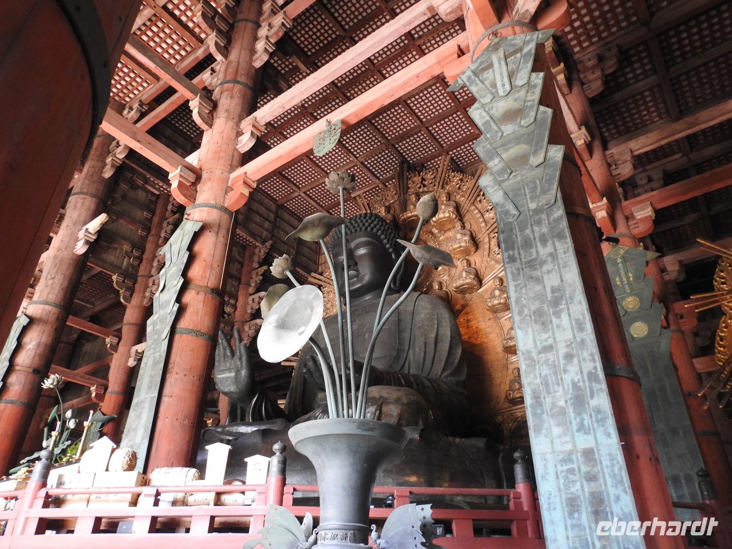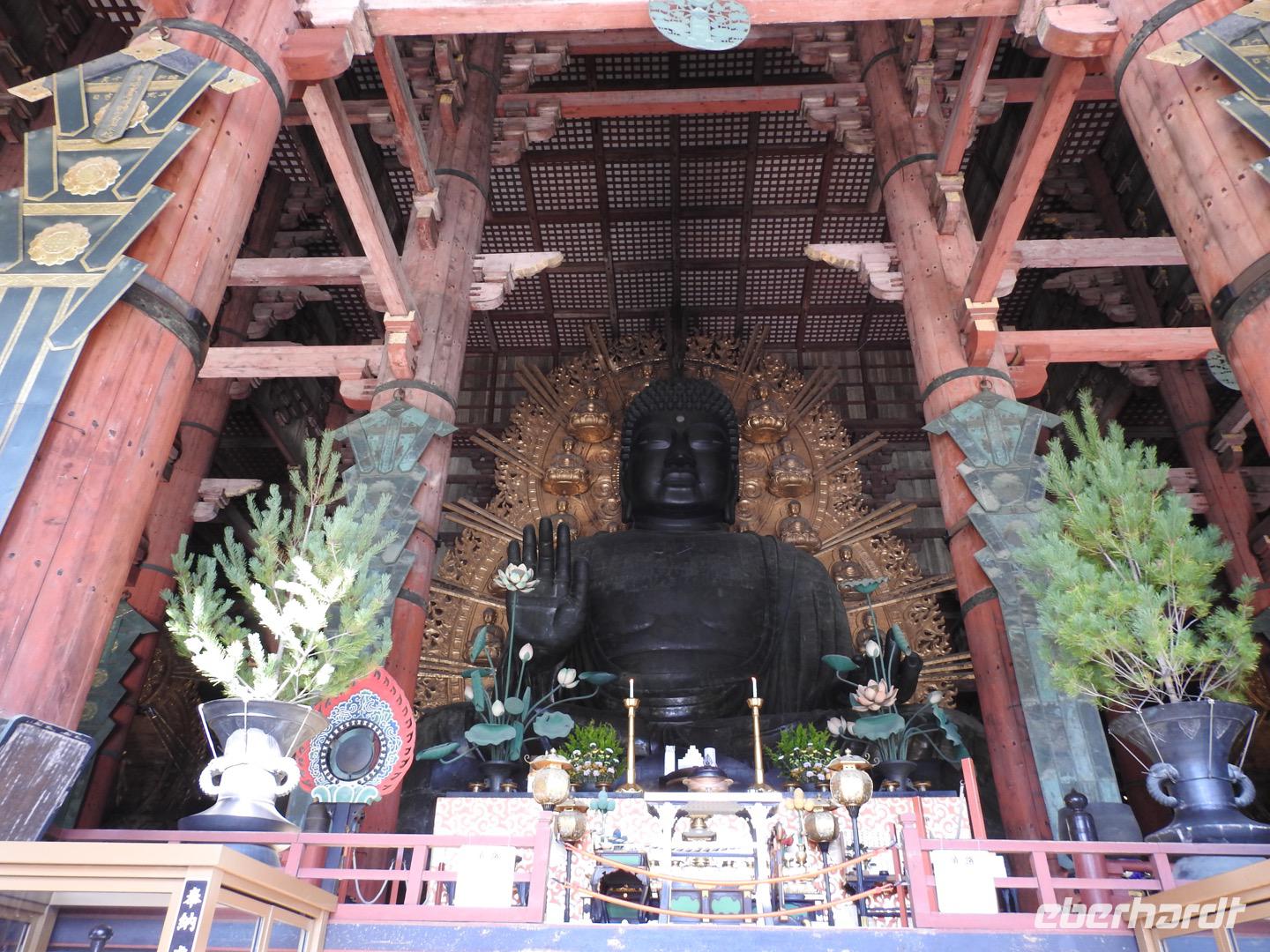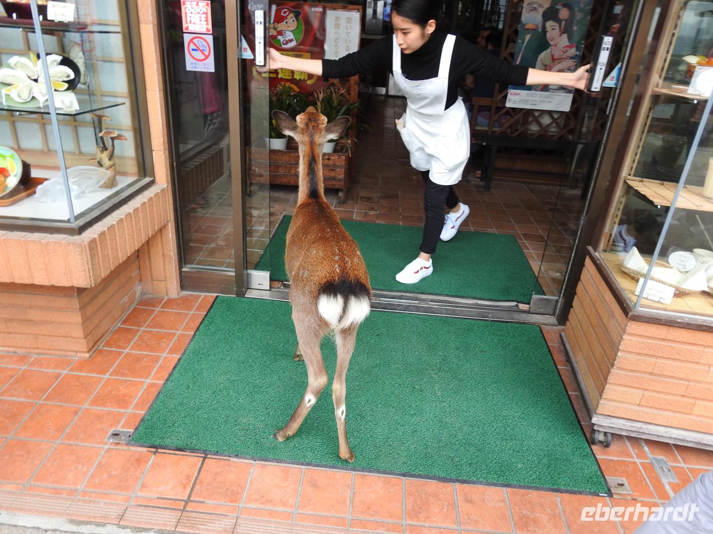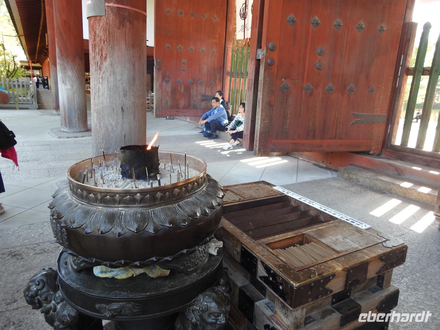 Mit der Regionalbahn fahren wir nach Nara. Obwohl wir keine Platzkarten haben, gelingt es uns diesmal, für jeden einen Sitzplatz zu bekommen. Immerhin fahren wir eine ganze Stunde. Vom Bahnhof in Nara geht es weiter mit dem Linienbus bis zum Todai-ji. Hier befindet sich das größte komplett aus Holz gebaute Gebäude der Welt. Der Tempel ist fast sechzig Meter breit und circa fünfzig Meter hoch und tief. In seinem Inneren befindet sich die größte buddhistische Bronzestatue. In der Umgebung des Tempels sind zahlreiche zahme Sika-Hirsche unterwegs, die es gewohnt sind, von den Besuchern gefüttert zu werden. Sika-Hirsche gelten im Shintoismus als heilige Götterboten und werden deshalb verehrt. An jeder Ecke kann der Besucher für etwa einen Euro Hirschkekse kaufen und diese an die immer hungrige Hirschgemeinde verfüttern. Eine andere Attraktion im Todai-ji ist eine Tempelsäule, die unten ein Loch hat, durch das sich zahlreiche Menschen quetschen, in der Annahme, dass sie damit ins Paradies kommen oder, was wahrscheinlicher ist, weil sie einfach Spaß daran haben.
