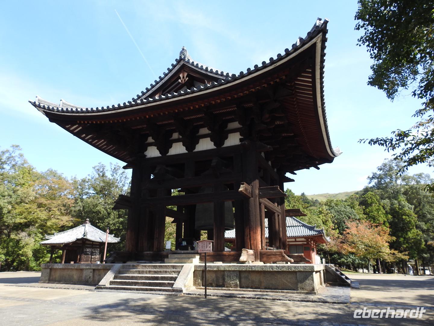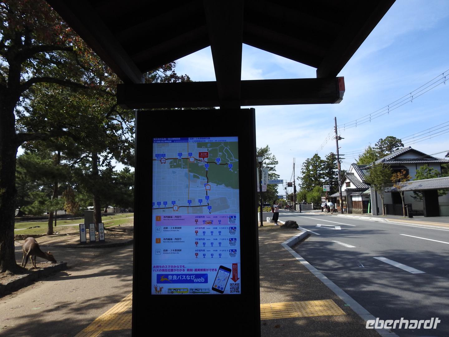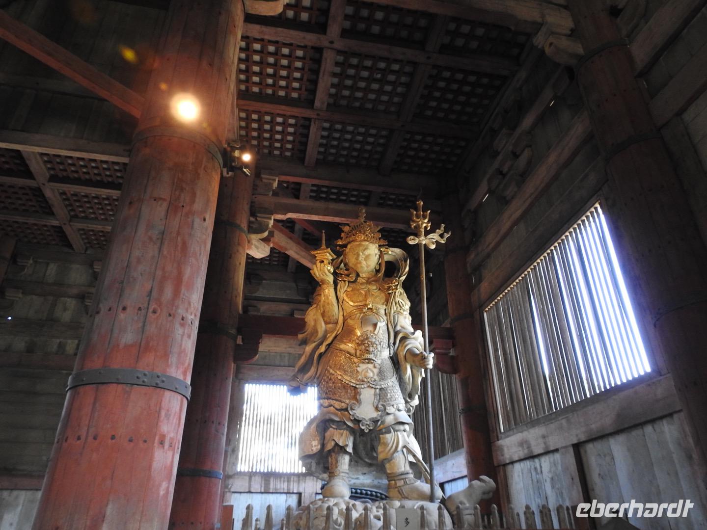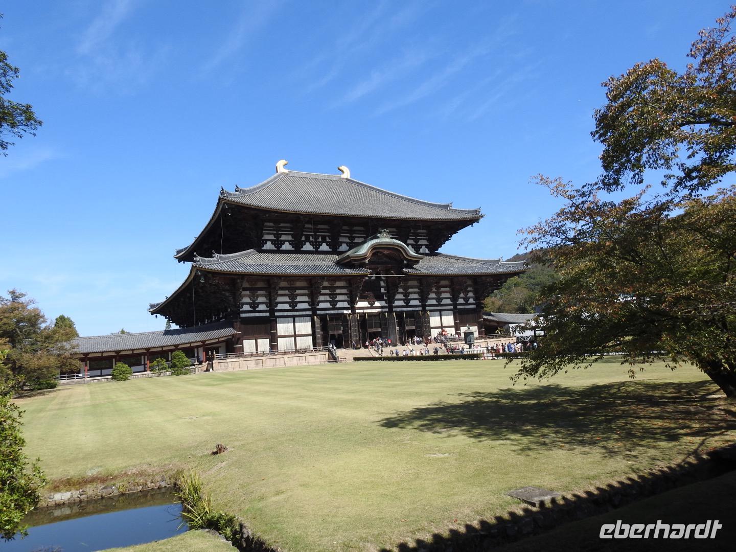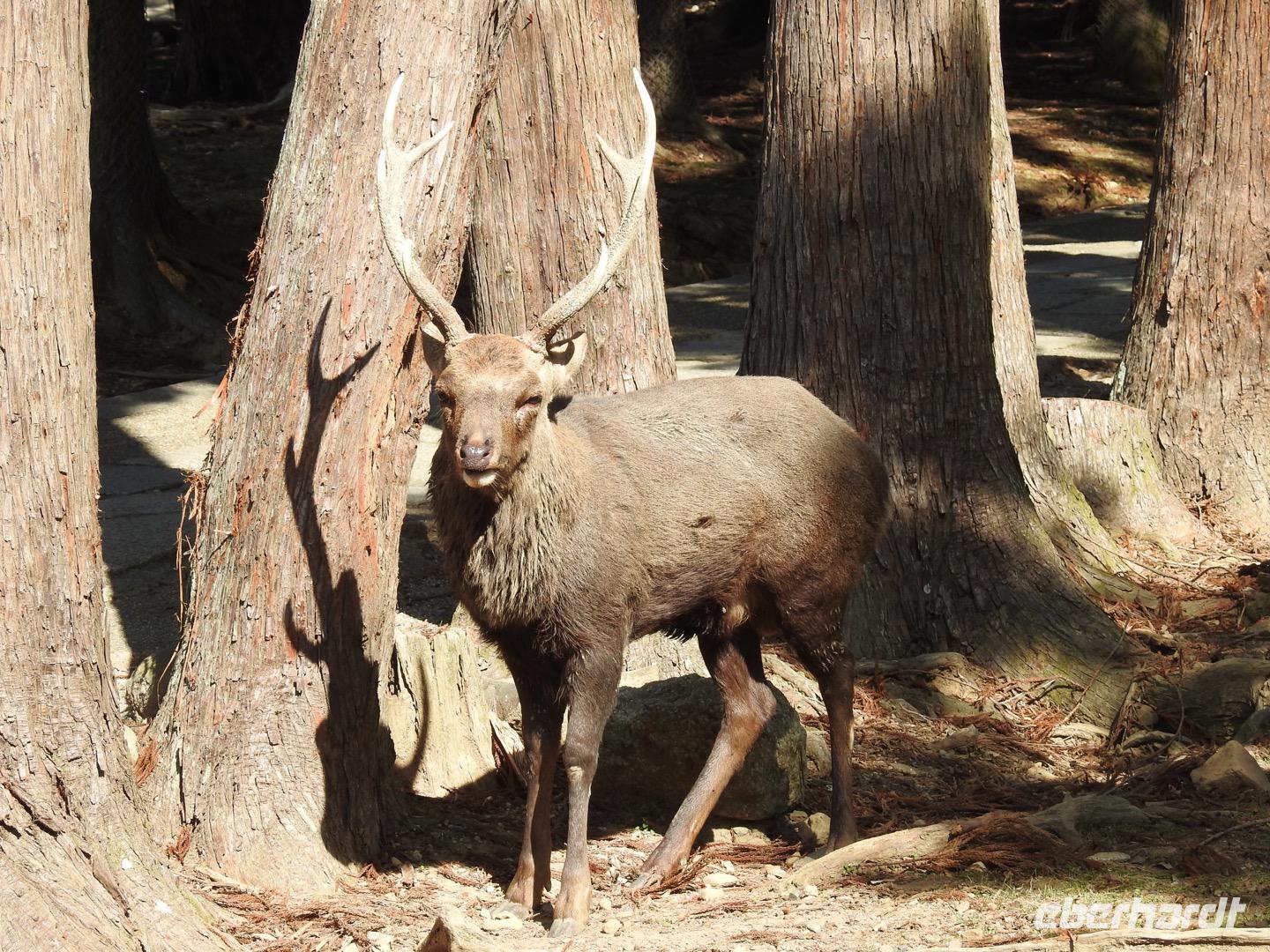 Mit der Regionalbahn fahren wir nach Nara. Obwohl wir keine Platzkarten haben, gelingt es uns diesmal, für jeden einen Sitzplatz zu bekommen. Immerhin fahren wir eine ganze Stunde. Vom Bahnhof in Nara geht es weiter mit dem Linienbus bis zum Todai-ji. Hier befindet sich das größte komplett aus Holz gebaute Gebäude der Welt. Der Tempel ist fast sechzig Meter breit und circa fünfzig Meter hoch und tief. In seinem Inneren befindet sich die größte buddhistische Bronzestatue. In der Umgebung des Tempels sind zahlreiche zahme Sika-Hirsche unterwegs, die es gewohnt sind, von den Besuchern gefüttert zu werden. Sika-Hirsche gelten im Shintoismus als heilige Götterboten und werden deshalb verehrt. An jeder Ecke kann der Besucher für etwa einen Euro Hirschkekse kaufen und diese an die immer hungrige Hirschgemeinde verfüttern. Eine andere Attraktion im Todai-ji ist eine Tempelsäule, die unten ein Loch hat, durch das sich zahlreiche Menschen quetschen, in der Annahme, dass sie damit ins Paradies kommen oder, was wahrscheinlicher ist, weil sie einfach Spaß daran haben.