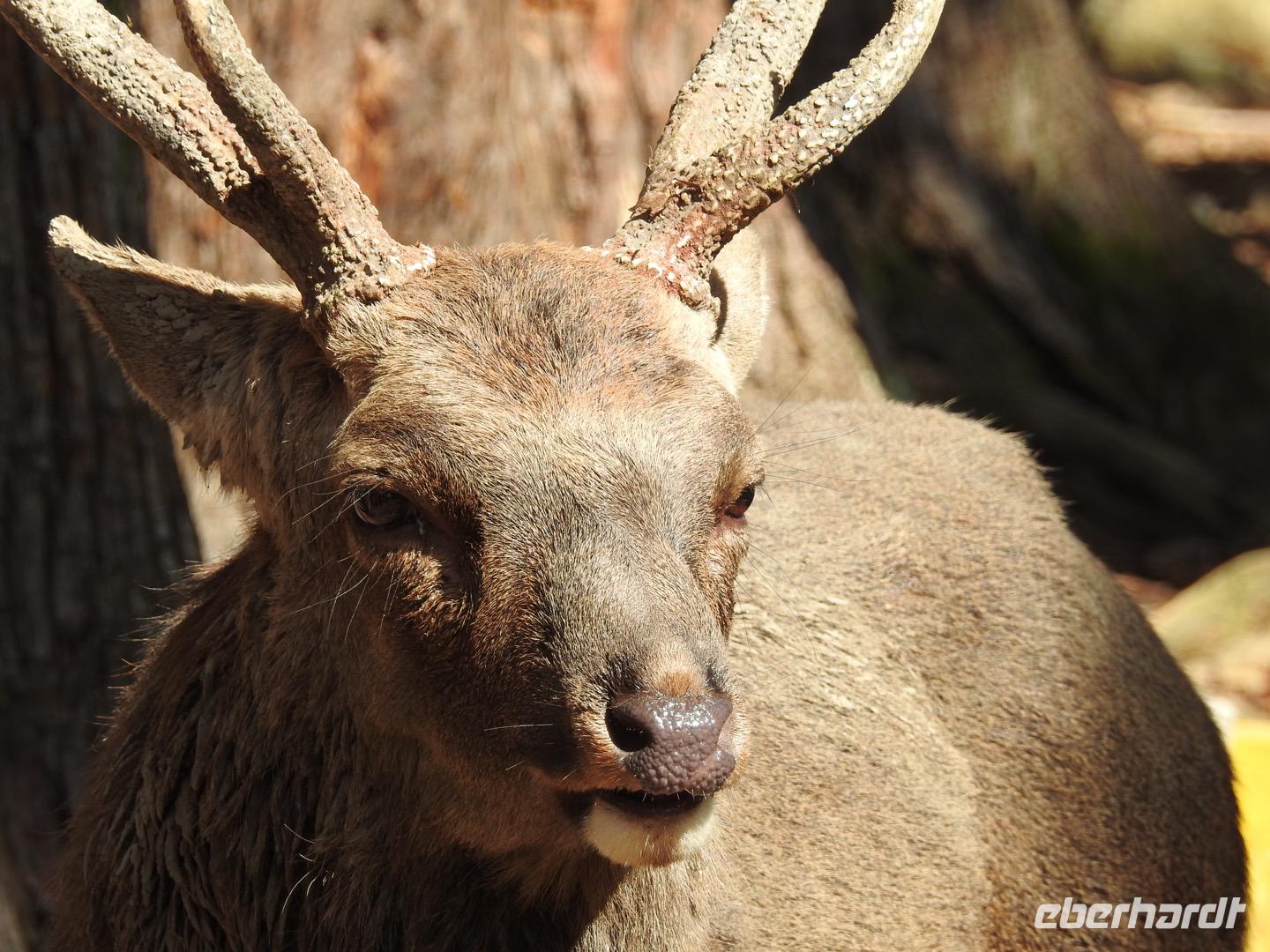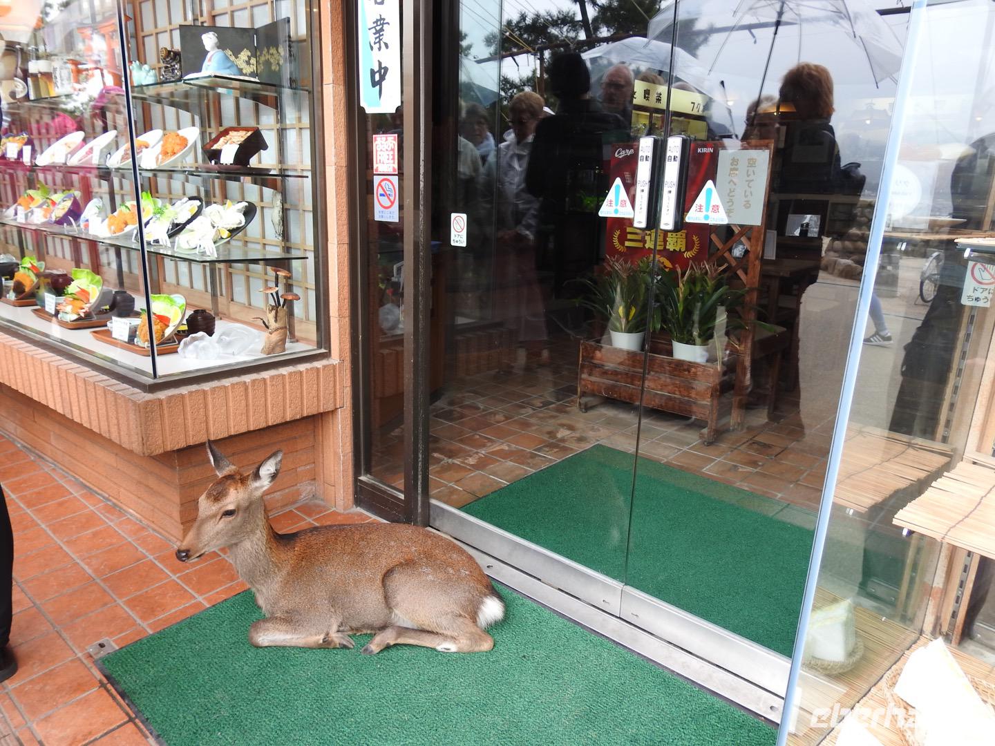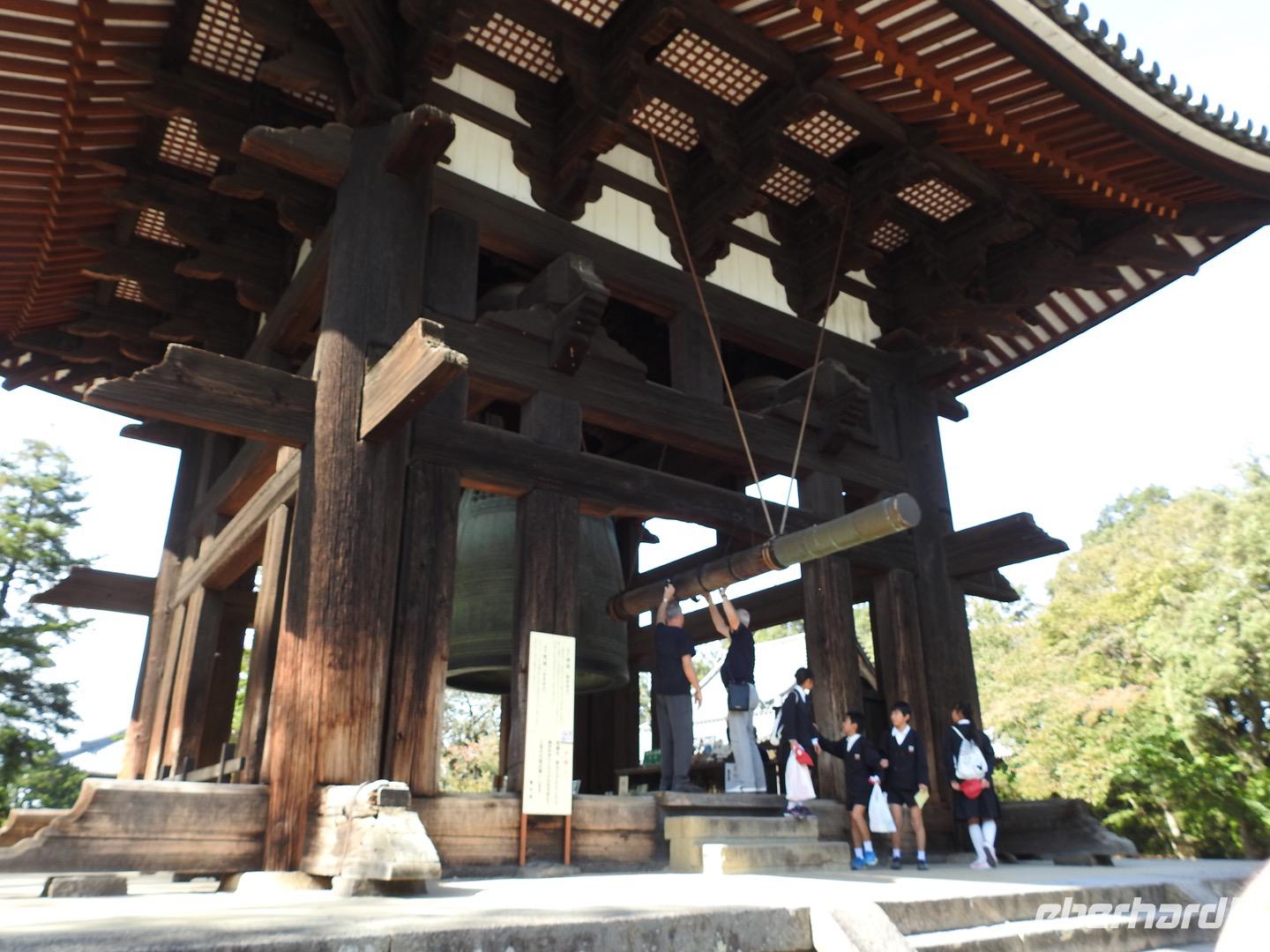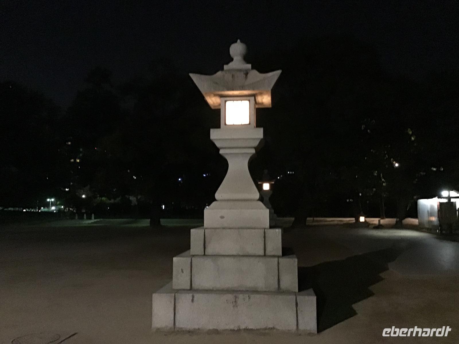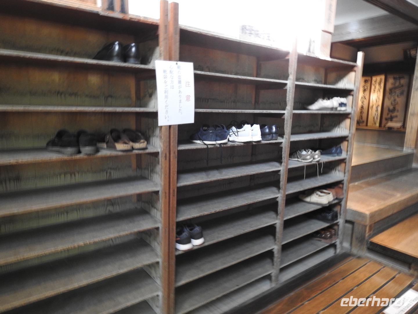 Mit der Regionalbahn fahren wir nach Nara. Obwohl wir keine Platzkarten haben, gelingt es uns diesmal, für jeden einen Sitzplatz zu bekommen. Immerhin fahren wir eine ganze Stunde. Vom Bahnhof in Nara geht es weiter mit dem Linienbus bis zum Todai-ji. Hier befindet sich das größte komplett aus Holz gebaute Gebäude der Welt. Der Tempel ist fast sechzig Meter breit und circa fünfzig Meter hoch und tief. In seinem Inneren befindet sich die größte buddhistische Bronzestatue. In der Umgebung des Tempels sind zahlreiche zahme Sika-Hirsche unterwegs, die es gewohnt sind, von den Besuchern gefüttert zu werden. Sika-Hirsche gelten im Shintoismus als heilige Götterboten und werden deshalb verehrt. An jeder Ecke kann der Besucher für etwa einen Euro Hirschkekse kaufen und diese an die immer hungrige Hirschgemeinde verfüttern. Eine andere Attraktion im Todai-ji ist eine Tempelsäule, die unten ein Loch hat, durch das sich zahlreiche Menschen quetschen, in der Annahme, dass sie damit ins Paradies kommen oder, was wahrscheinlicher ist, weil sie einfach Spaß daran haben.