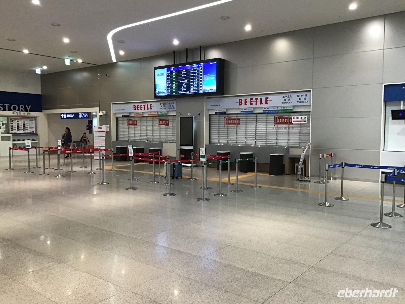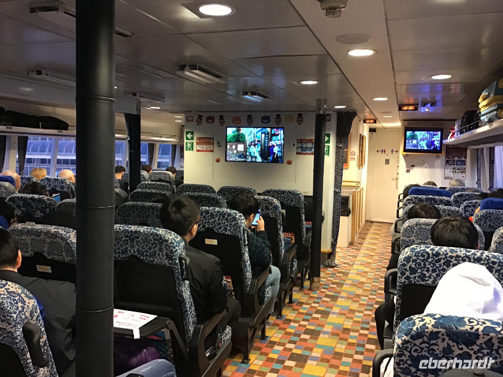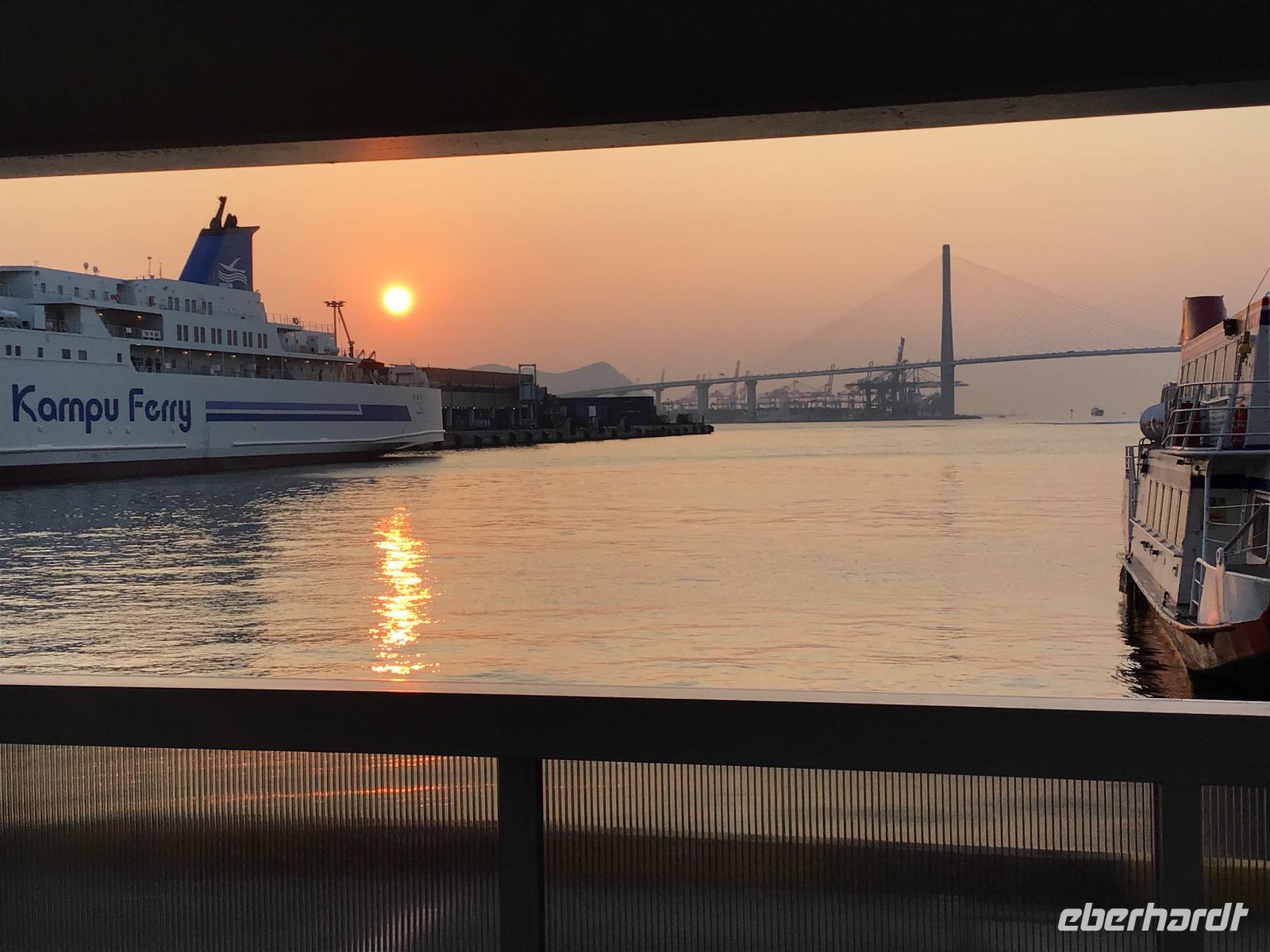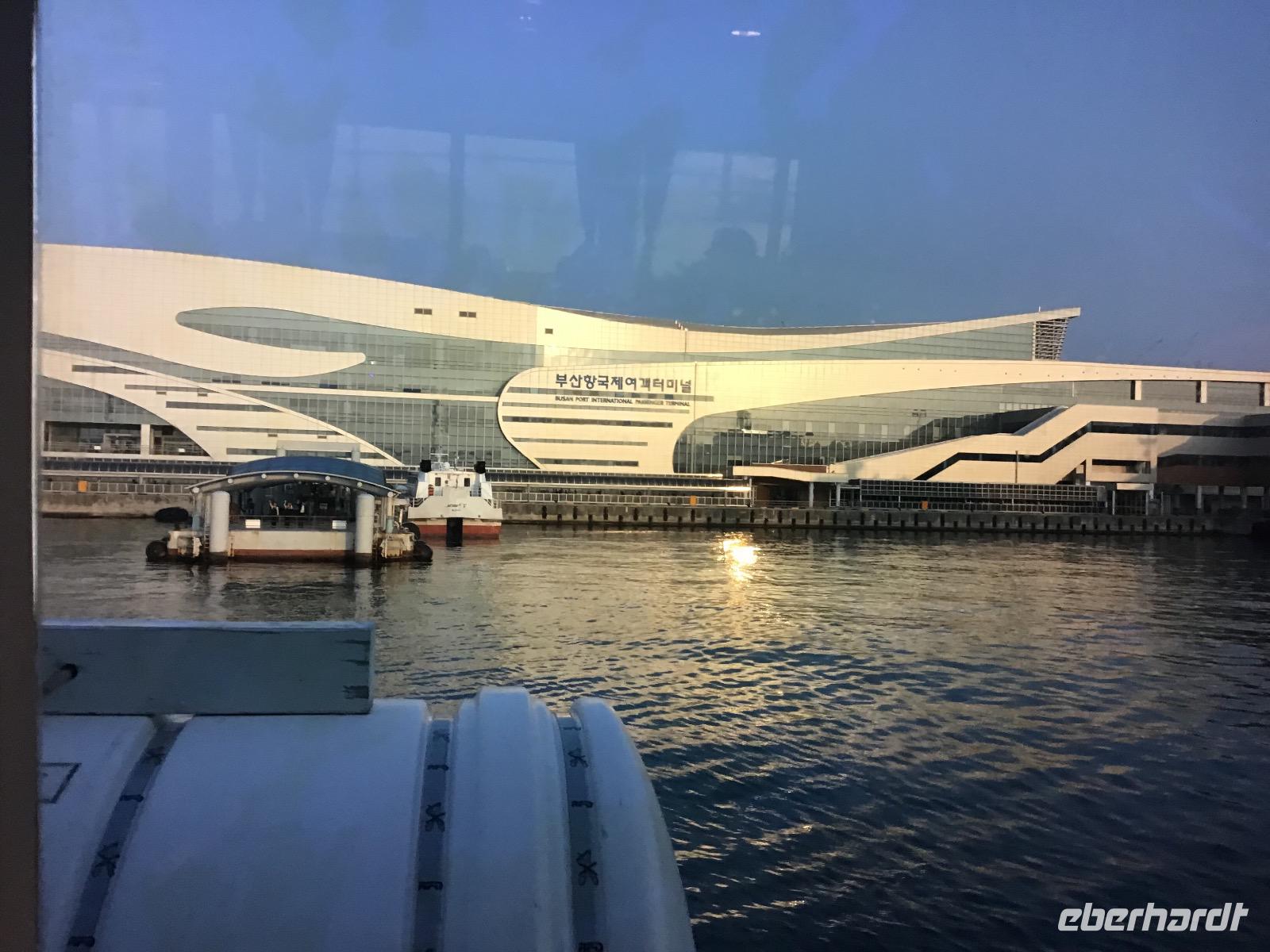 Mit dem Tragflächenboot geht es nach Fukuoka. Anschließend mit dem Shinkansen nach Hiroshima. Da unser Boot bereits 7.10 Uhr abfährt, heißt es heute früh aufstehen. Bereits zehn nach fünf verlassen wir das Hotel. Die Straßen sind leer und wir erreichen das Fährterminal eine halbe Stunde bevor der Schalter öffnet. Auch dann dauert es noch etwas, denn alle Pässe werden gescannt. Wir bekommen Platzkarten, im oberen Deck Zweierreihen. Bei schönstem Sonnenaufgang verabschieden wir uns von Südkorea.
