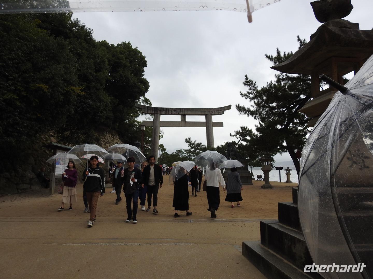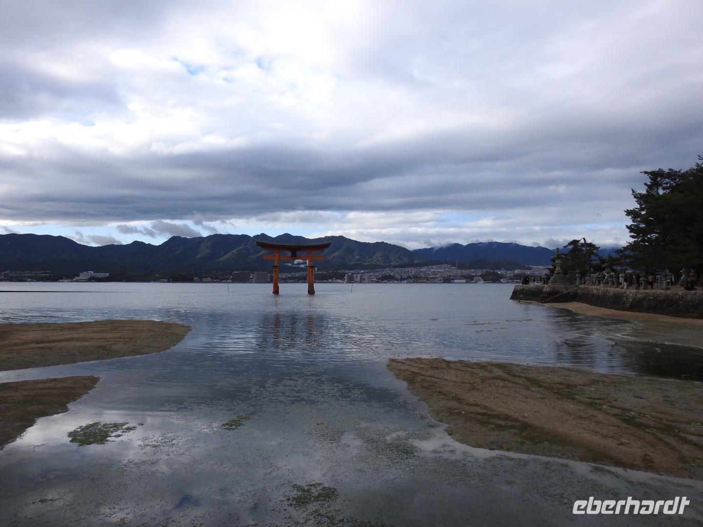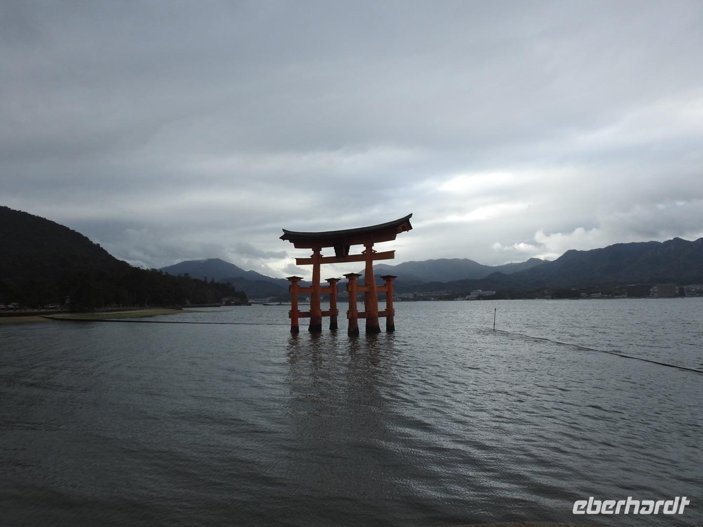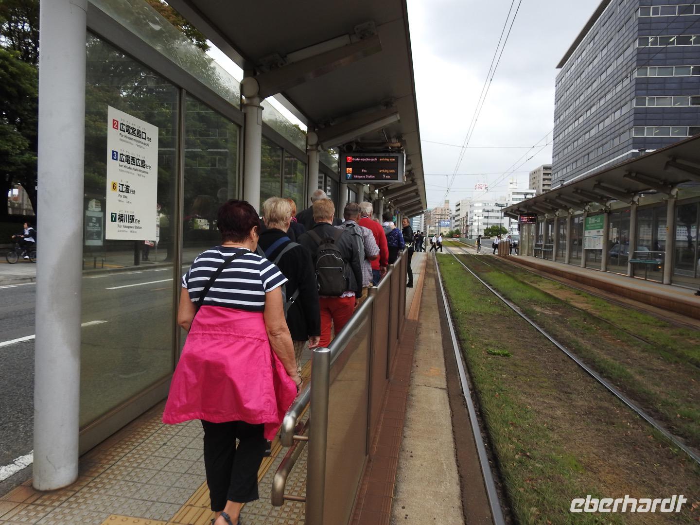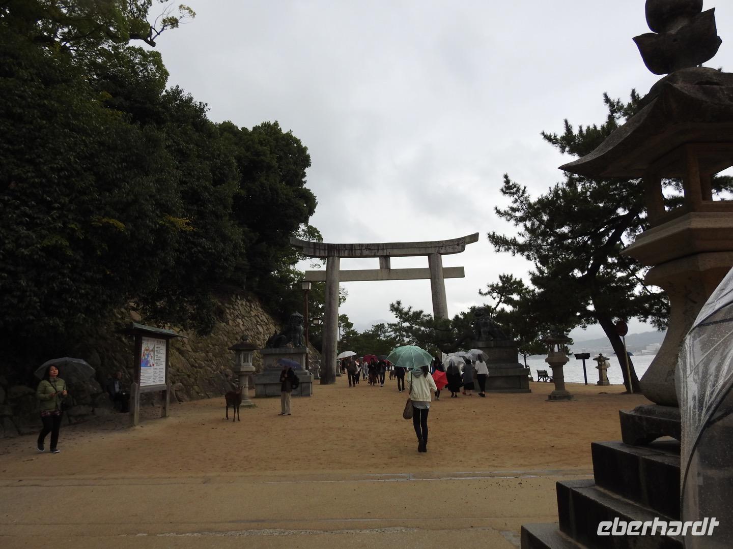 Am Vormittag besuchen wir das Friedensmuseum in Hiroshima. Es ist sehr bedrückend, mit der Geschichte des Atombombenabwurfs konfrontiert zu werden. Fotos und Videos zeigen die Schrecken der Zeit. Kinderkleidung, ein zerstörtes Dreirad rühren das Herz. Es ist kaum möglich, ohne eine Träne im Auge, das Museum zu verlassen. Viele Schulklassen sind heute unterwegs und besuchen ebenfalls den Friedenspark und das Museum.Am Nachmittag steht für uns wieder etwas Erfreuliches auf dem Programm. Zunächst fahren wir mit der Straßenbahn eine Dreiviertelstunde durch die Stadt. Anschließend setzen wir in zehn Minuten auf die Insel Miyajima über. Schon von Bord können wir einen Blick auf das berühmte Torii werfen. Leider ist uns das Wetter nicht hold. Es regnet und dicke Wolken stehen am Himmel. Zunächst legen wir eine Mittagspause ein, Birgit erklärt uns an einer Schaufensterauslage was es hier für Spezialitäten gibt. Alternativ können wir durch die Läden schlendern und uns nach Souveniren umschauen. Am Stein-Torii treffen wir uns wieder und besuchen den Itsukushima-Schrein. Die Hauptgebäude der Anlage stehen auf Pfählen im Wasser. Heute hat sich hier eine Hochzeitsgesellschaft zum Fototermin eingefunden. So können wir das schöne traditionelle Brautkleid bewundern. Circa einhundertsechzig Meter vom Ufer entfernt steht das berühmte Torii, eine der am meist fotografierten Sehenswürdigkeiten Japans. Auch unser Linsen klicken ununterbrochen. Wir haben genügend Zeit für eigene Erkundungen. Erst am Nachmittag um fünf kehren wir, inzwischen bei strahlendem Sonnenschein, der Insel den Rücken.