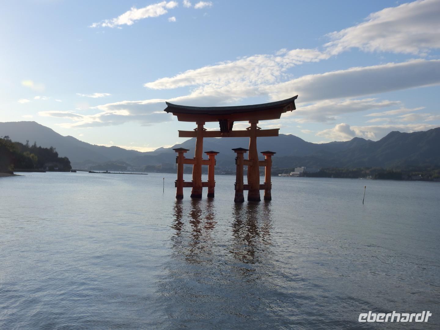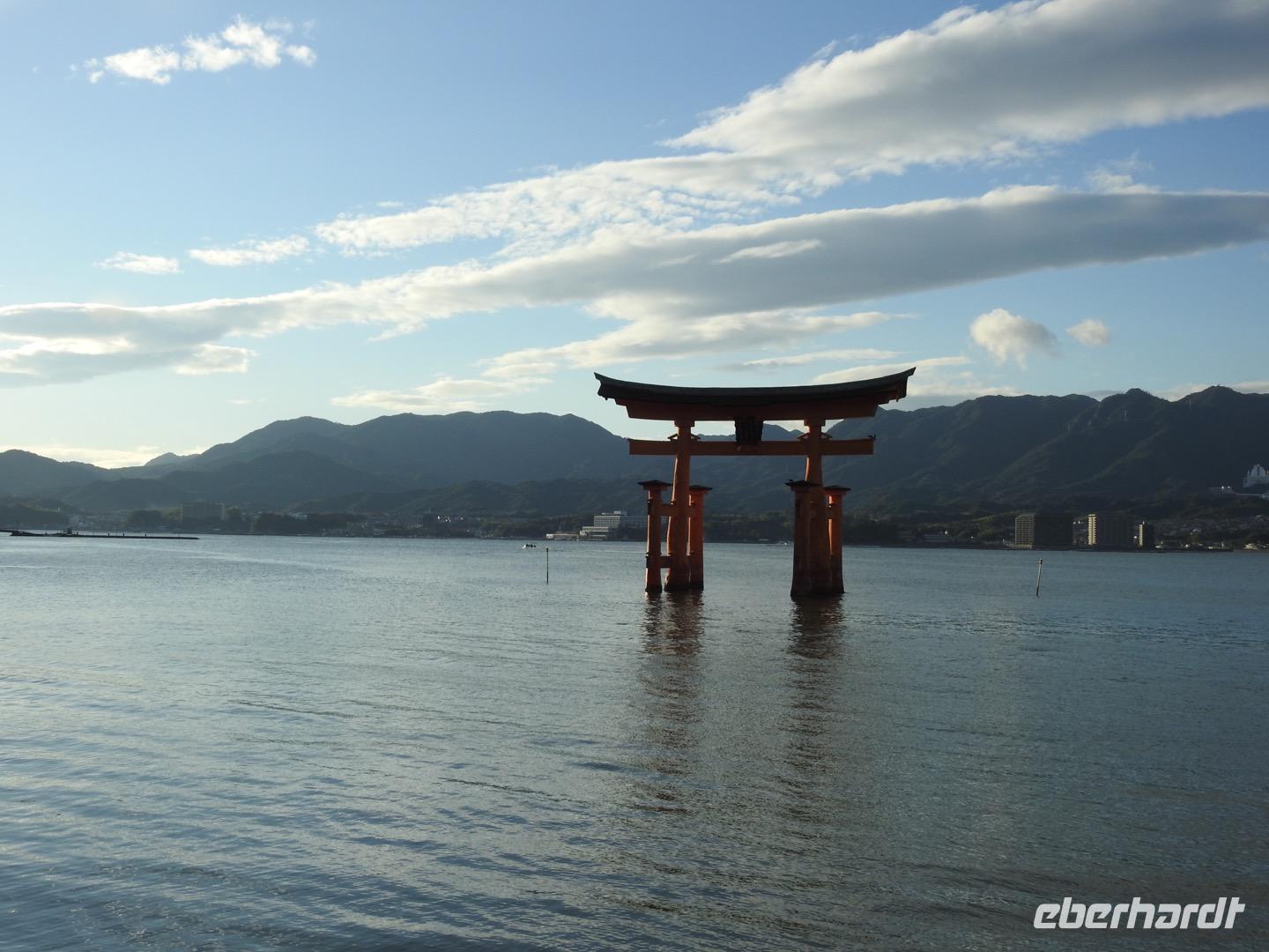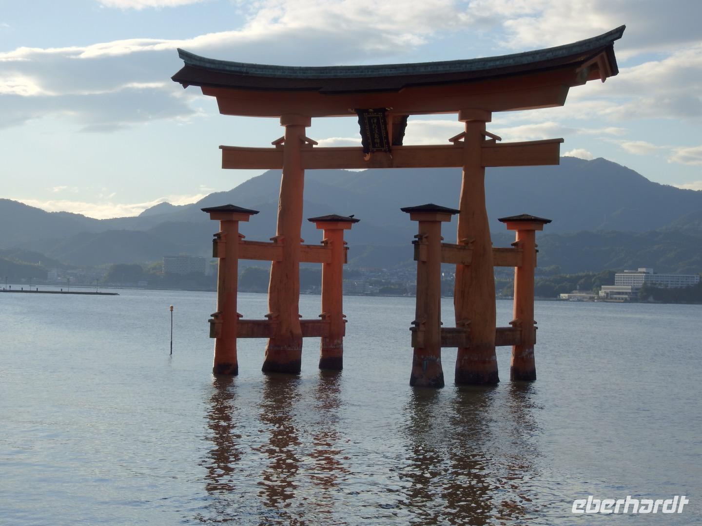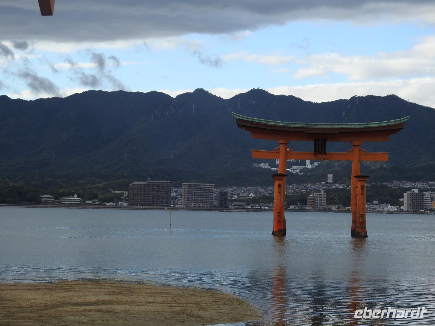 Am Vormittag besuchen wir das Friedensmuseum in Hiroshima. Es ist sehr bedrückend, mit der Geschichte des Atombombenabwurfs konfrontiert zu werden. Fotos und Videos zeigen die Schrecken der Zeit. Kinderkleidung, ein zerstörtes Dreirad rühren das Herz. Es ist kaum möglich, ohne eine Träne im Auge, das Museum zu verlassen. Viele Schulklassen sind heute unterwegs und besuchen ebenfalls den Friedenspark und das Museum.Am Nachmittag steht für uns wieder etwas Erfreuliches auf dem Programm. Zunächst fahren wir mit der Straßenbahn eine Dreiviertelstunde durch die Stadt. Anschließend setzen wir in zehn Minuten auf die Insel Miyajima über. Schon von Bord können wir einen Blick auf das berühmte Torii werfen. Leider ist uns das Wetter nicht hold. Es regnet und dicke Wolken stehen am Himmel. Zunächst legen wir eine Mittagspause ein, Birgit erklärt uns an einer Schaufensterauslage was es hier für Spezialitäten gibt. Alternativ können wir durch die Läden schlendern und uns nach Souveniren umschauen. Am Stein-Torii treffen wir uns wieder und besuchen den Itsukushima-Schrein. Die Hauptgebäude der Anlage stehen auf Pfählen im Wasser. Heute hat sich hier eine Hochzeitsgesellschaft zum Fototermin eingefunden. So können wir das schöne traditionelle Brautkleid bewundern. Circa einhundertsechzig Meter vom Ufer entfernt steht das berühmte Torii, eine der am meist fotografierten Sehenswürdigkeiten Japans. Auch unser Linsen klicken ununterbrochen. Wir haben genügend Zeit für eigene Erkundungen. Erst am Nachmittag um fünf kehren wir, inzwischen bei strahlendem Sonnenschein, der Insel den Rücken.
