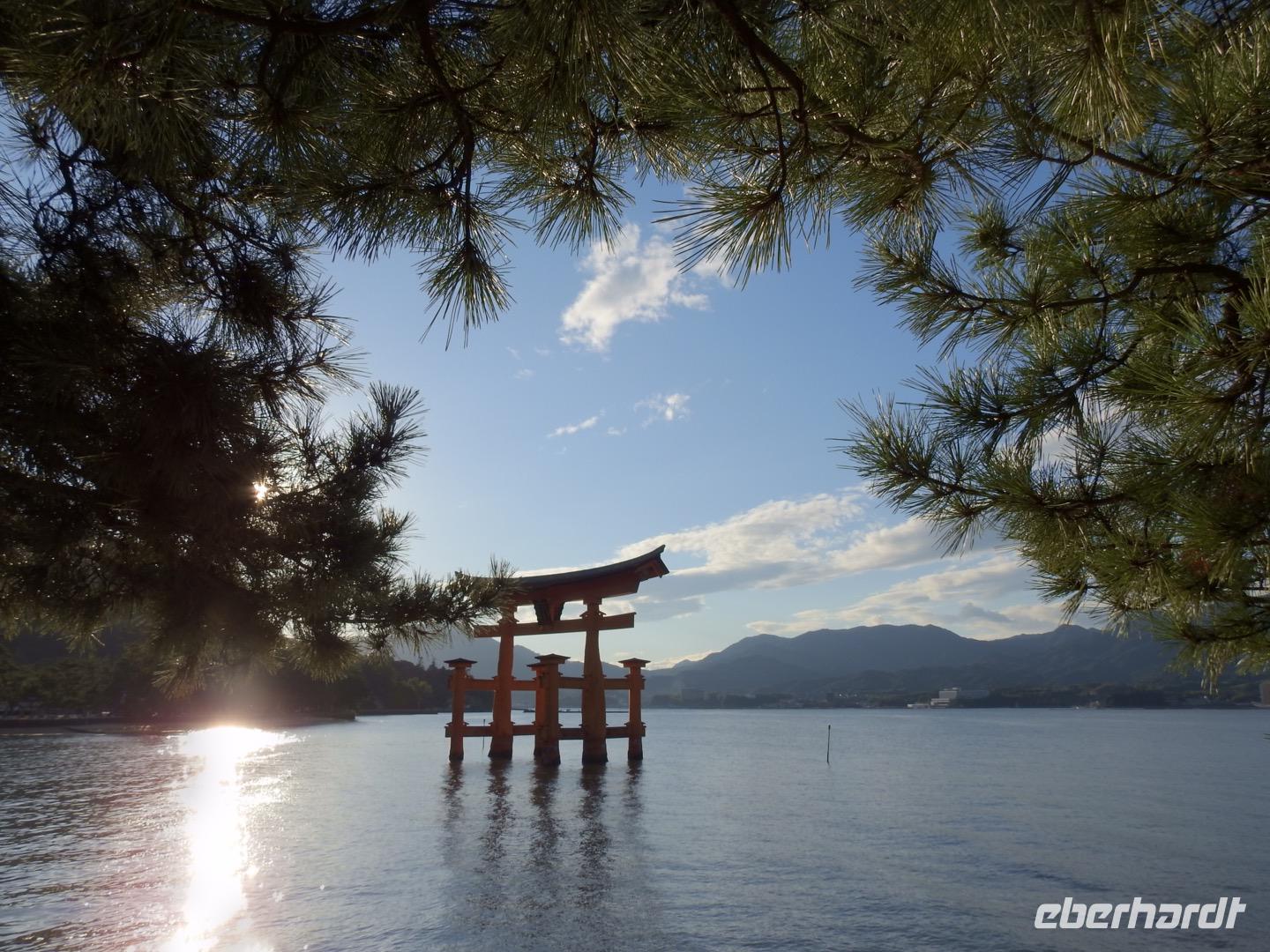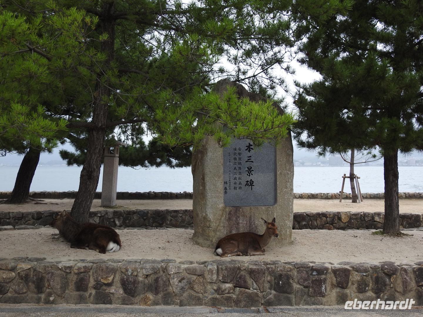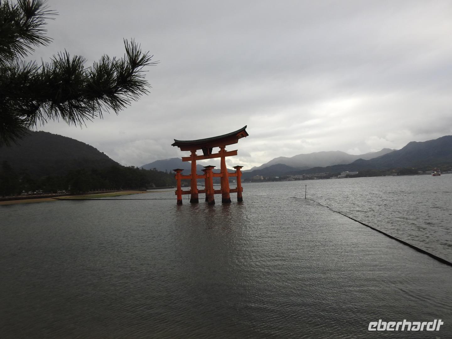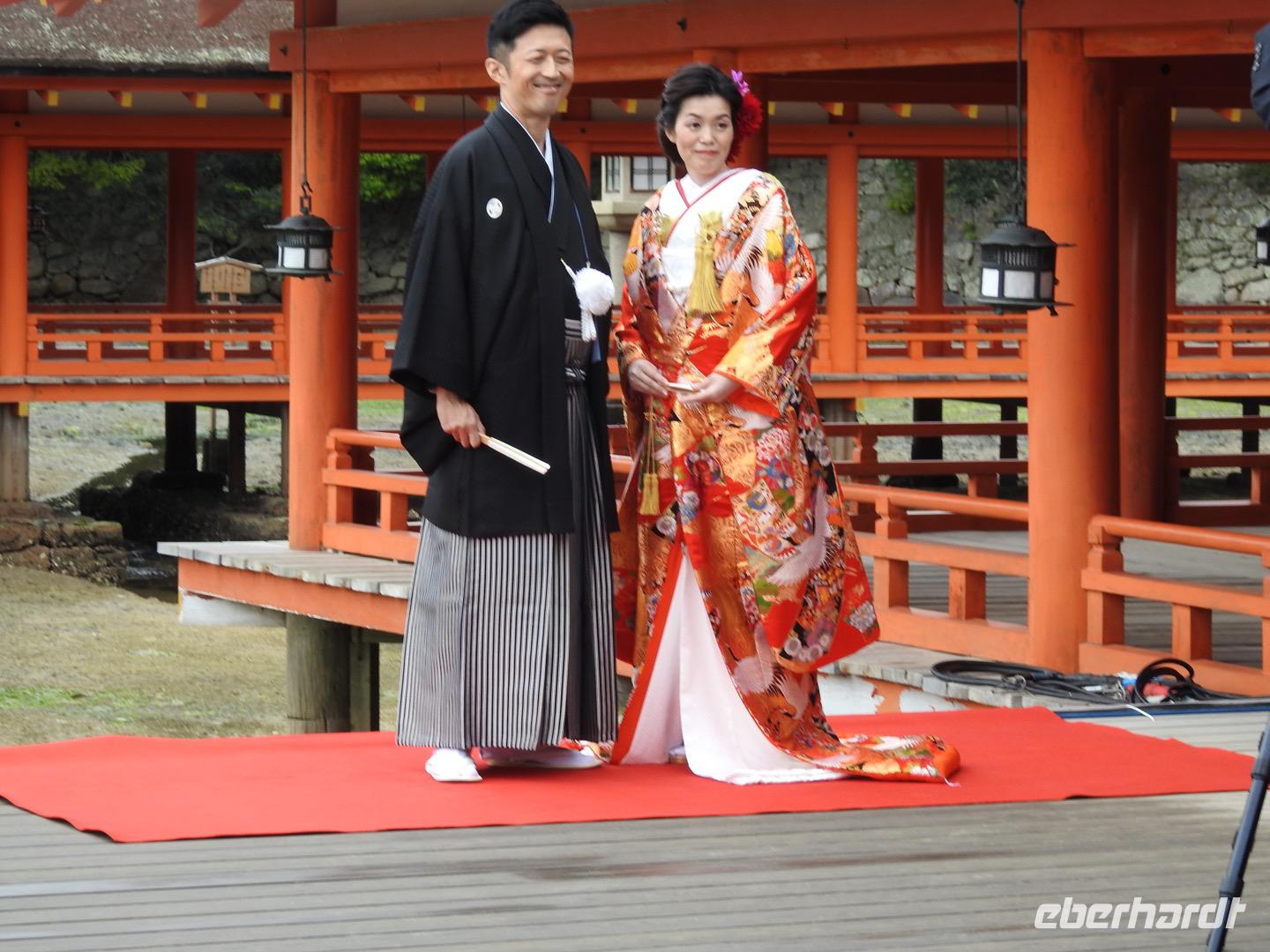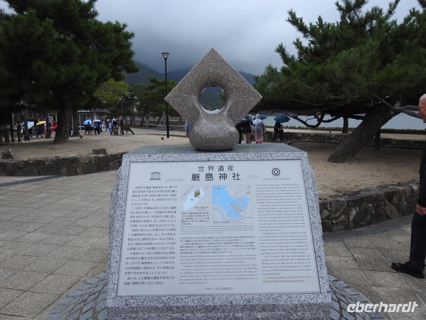 Am Vormittag besuchen wir das Friedensmuseum in Hiroshima. Es ist sehr bedrückend, mit der Geschichte des Atombombenabwurfs konfrontiert zu werden. Fotos und Videos zeigen die Schrecken der Zeit. Kinderkleidung, ein zerstörtes Dreirad rühren das Herz. Es ist kaum möglich, ohne eine Träne im Auge, das Museum zu verlassen. Viele Schulklassen sind heute unterwegs und besuchen ebenfalls den Friedenspark und das Museum.Am Nachmittag steht für uns wieder etwas Erfreuliches auf dem Programm. Zunächst fahren wir mit der Straßenbahn eine Dreiviertelstunde durch die Stadt. Anschließend setzen wir in zehn Minuten auf die Insel Miyajima über. Schon von Bord können wir einen Blick auf das berühmte Torii werfen. Leider ist uns das Wetter nicht hold. Es regnet und dicke Wolken stehen am Himmel. Zunächst legen wir eine Mittagspause ein, Birgit erklärt uns an einer Schaufensterauslage was es hier für Spezialitäten gibt. Alternativ können wir durch die Läden schlendern und uns nach Souveniren umschauen. Am Stein-Torii treffen wir uns wieder und besuchen den Itsukushima-Schrein. Die Hauptgebäude der Anlage stehen auf Pfählen im Wasser. Heute hat sich hier eine Hochzeitsgesellschaft zum Fototermin eingefunden. So können wir das schöne traditionelle Brautkleid bewundern. Circa einhundertsechzig Meter vom Ufer entfernt steht das berühmte Torii, eine der am meist fotografierten Sehenswürdigkeiten Japans. Auch unser Linsen klicken ununterbrochen. Wir haben genügend Zeit für eigene Erkundungen. Erst am Nachmittag um fünf kehren wir, inzwischen bei strahlendem Sonnenschein, der Insel den Rücken.