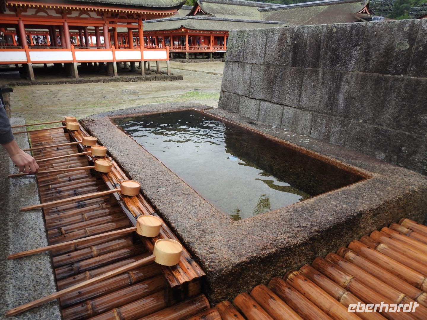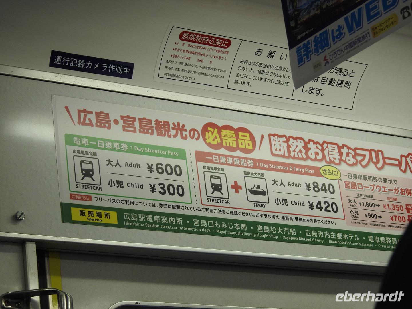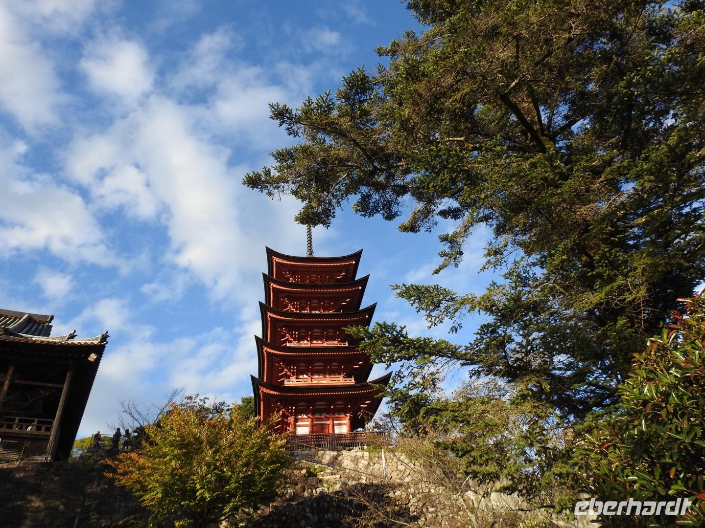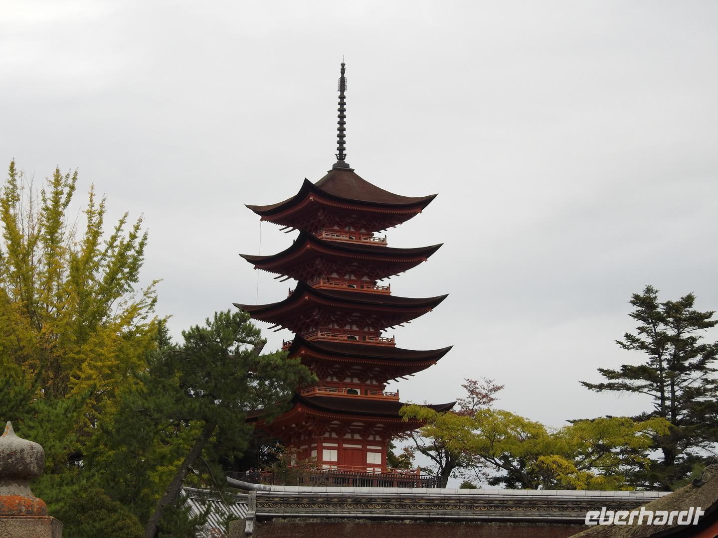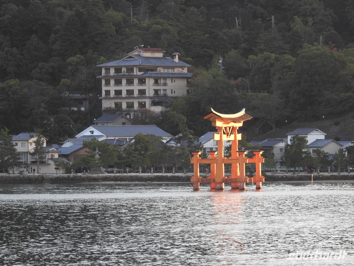 Am Vormittag besuchen wir das Friedensmuseum in Hiroshima. Es ist sehr bedrückend, mit der Geschichte des Atombombenabwurfs konfrontiert zu werden. Fotos und Videos zeigen die Schrecken der Zeit. Kinderkleidung, ein zerstörtes Dreirad rühren das Herz. Es ist kaum möglich, ohne eine Träne im Auge, das Museum zu verlassen. Viele Schulklassen sind heute unterwegs und besuchen ebenfalls den Friedenspark und das Museum.Am Nachmittag steht für uns wieder etwas Erfreuliches auf dem Programm. Zunächst fahren wir mit der Straßenbahn eine Dreiviertelstunde durch die Stadt. Anschließend setzen wir in zehn Minuten auf die Insel Miyajima über. Schon von Bord können wir einen Blick auf das berühmte Torii werfen. Leider ist uns das Wetter nicht hold. Es regnet und dicke Wolken stehen am Himmel. Zunächst legen wir eine Mittagspause ein, Birgit erklärt uns an einer Schaufensterauslage was es hier für Spezialitäten gibt. Alternativ können wir durch die Läden schlendern und uns nach Souveniren umschauen. Am Stein-Torii treffen wir uns wieder und besuchen den Itsukushima-Schrein. Die Hauptgebäude der Anlage stehen auf Pfählen im Wasser. Heute hat sich hier eine Hochzeitsgesellschaft zum Fototermin eingefunden. So können wir das schöne traditionelle Brautkleid bewundern. Circa einhundertsechzig Meter vom Ufer entfernt steht das berühmte Torii, eine der am meist fotografierten Sehenswürdigkeiten Japans. Auch unser Linsen klicken ununterbrochen. Wir haben genügend Zeit für eigene Erkundungen. Erst am Nachmittag um fünf kehren wir, inzwischen bei strahlendem Sonnenschein, der Insel den Rücken.
