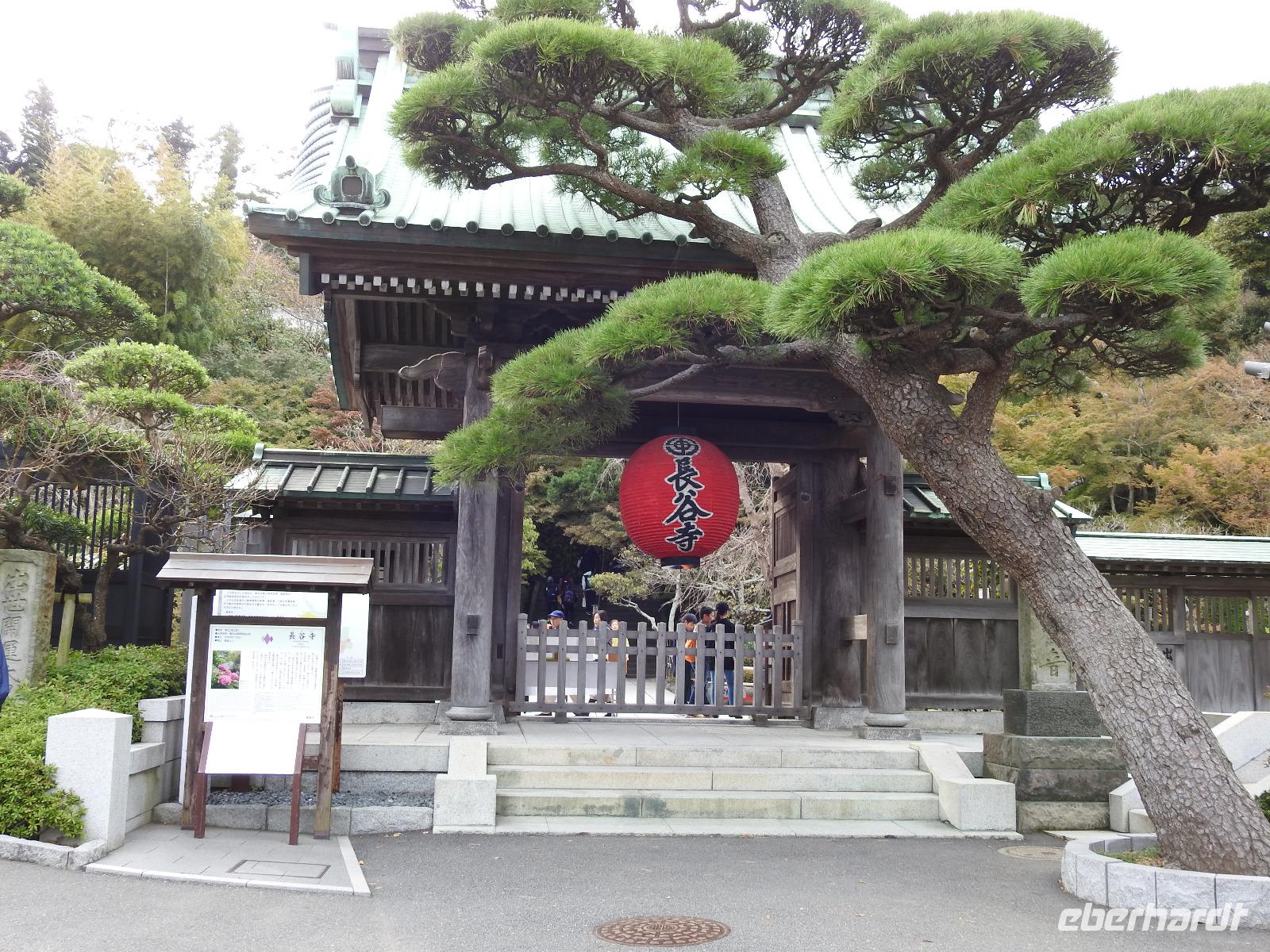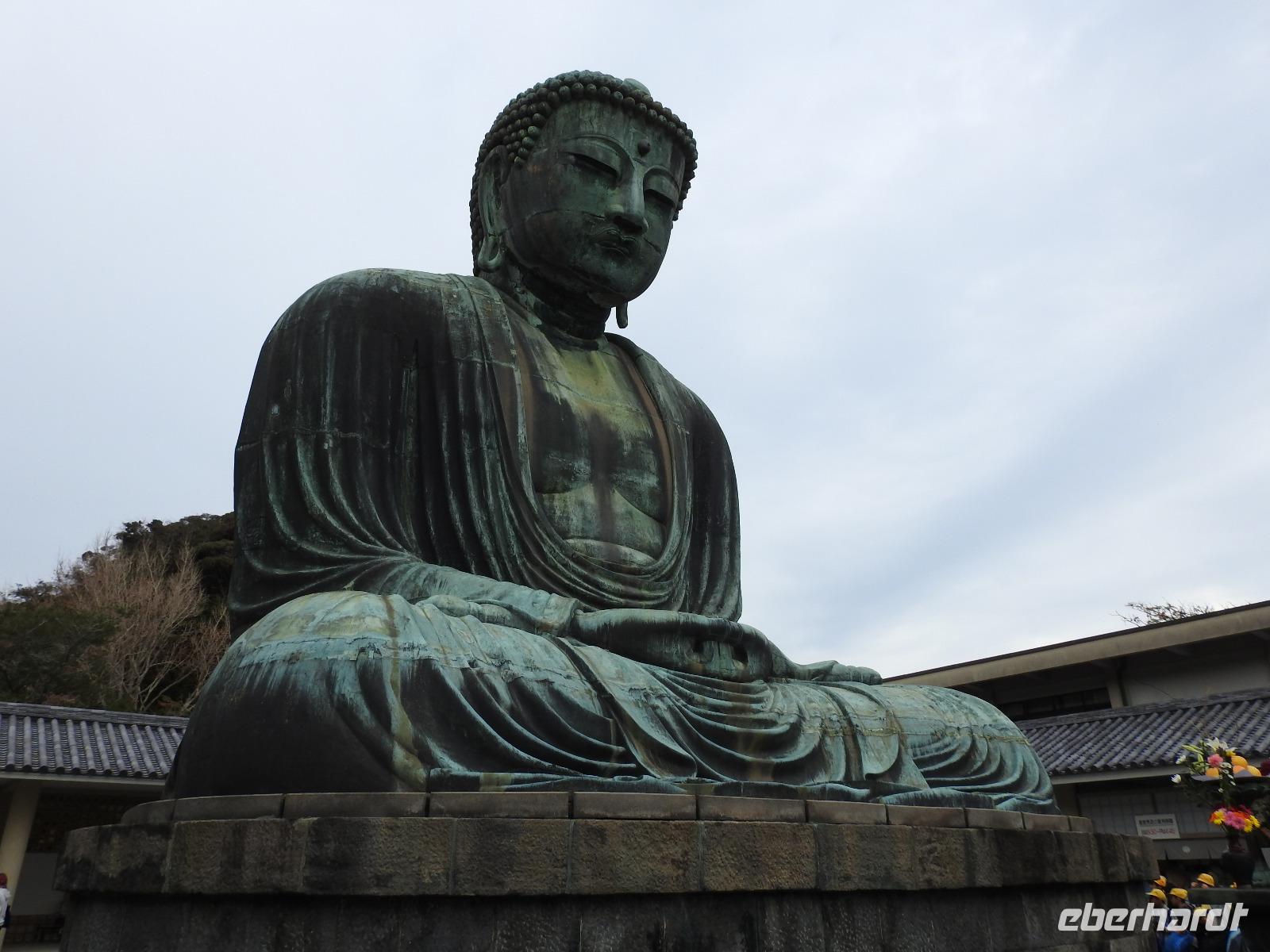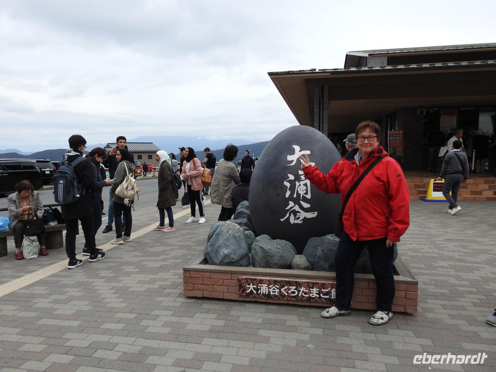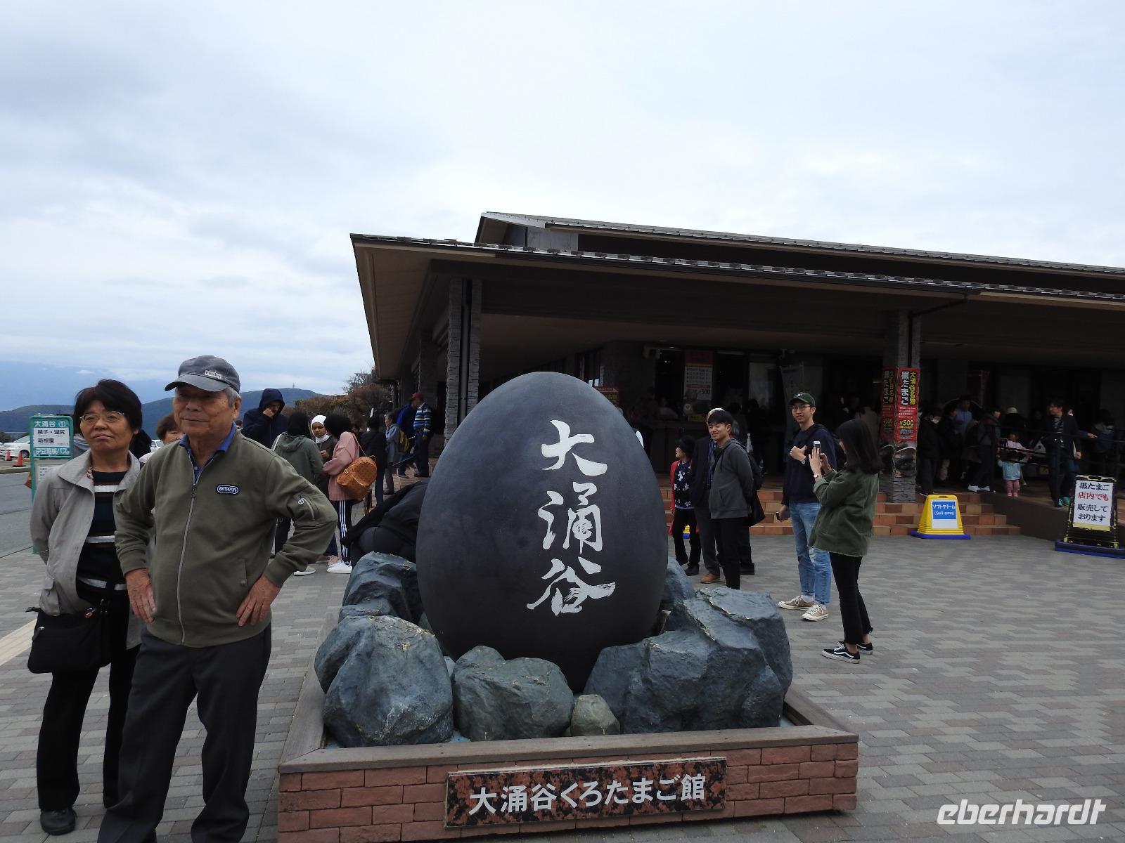 Von Togendai-ko geht es weiter mit dem Bus auf tausend Meter Höhe bis nach Owakudani. Hier dringt Schwefeldampf aus allen Löchern und es riecht entsprechend. Eine Spezialität sind hier die schwarzen Eier, deren Schale vom Kochen in Schwefelwasser schwarz ist. Für fünfhundert Yen könnte man fünf Eier erwerben und kosten, worauf wir jedoch vorsichtig verzichten. Die Touristenindustrie hat das Potenzial der schwarzen Eier auch entdeckt, nicht nur, dass es riesige Eiermodelle zum Fotografieren gibt, es stehen auch überall Hocker in Schwarzeierform herum und in den Geschäften gibt es alles, was man nur zum Thema schwarze Eier herstellen kann, angefangen von Schlüsselanhängern über Drops und Schokolade bis zu Plüscheiern für die Kleinen. Wir verlassen jetzt die Berge und fahren immer an der Küste entlang bis nach Kamakura, das wir nach anderthalb Stunden erreichen. Kamakura war von 1185 bis 1333 Regierungssitz Japans und ist heute ein beliebtes Reiseziel. Viele buddhistische Tempel und Shintoschreine gibt es hier zu sehen. Wir besuchen zuerst Daibutsu, eine überdimensionale frei stehende Buddhastatue. Anschließend spazieren wir zum Tempel Hase-dera. Die Statue ist eine von zwei, die aus einem großen Baumstamm angefertigt wurden. Während der einen ein Tempel in Nara gebaut wurde, musste diese, im Meer schwimmend, ihren Platz selbst suchen und landete sechzehn Jahre später in der Nähe von Kamakura. Sie wurde geborgen und bekam nun ebenfalls ihren Schrein.