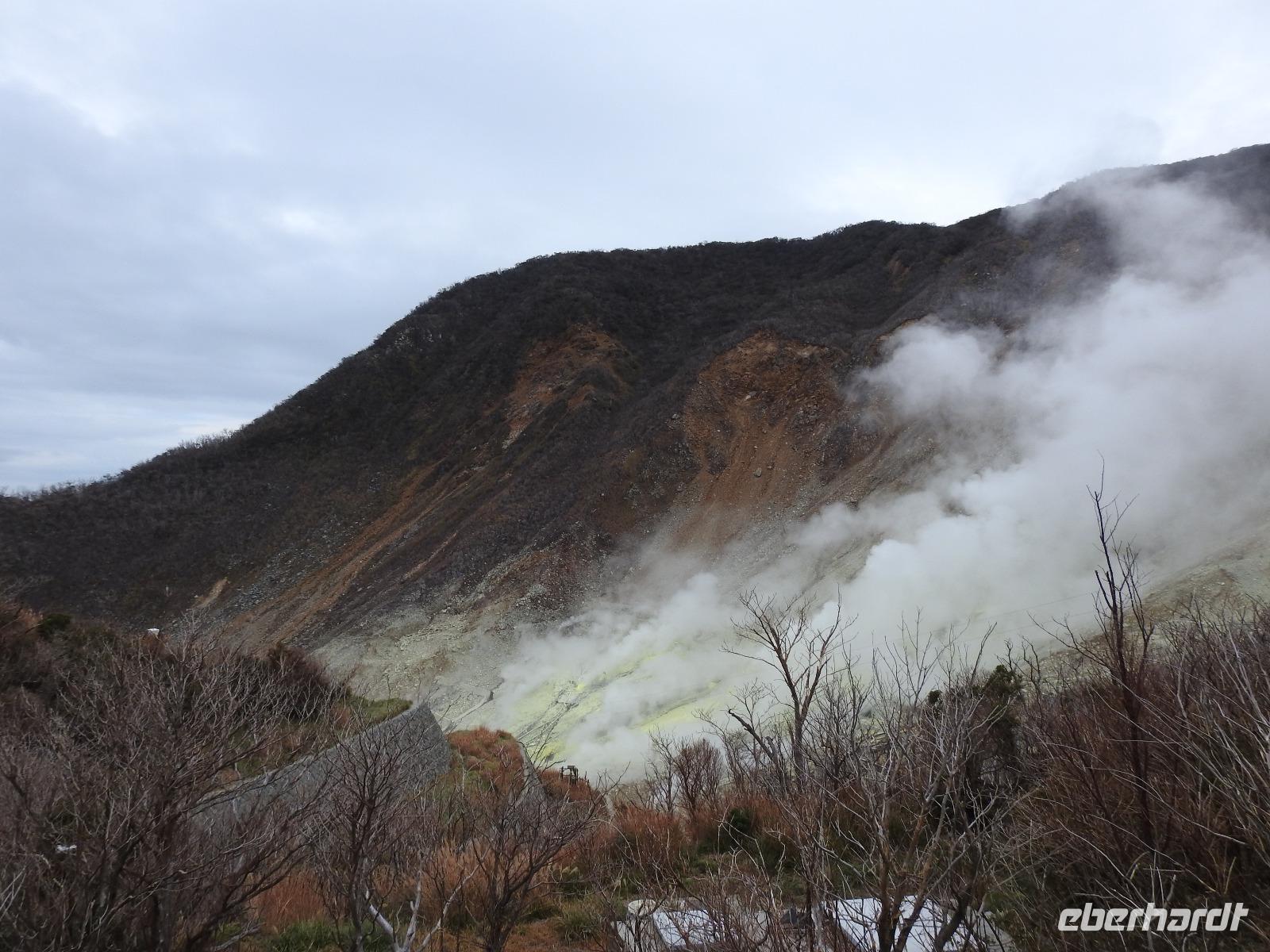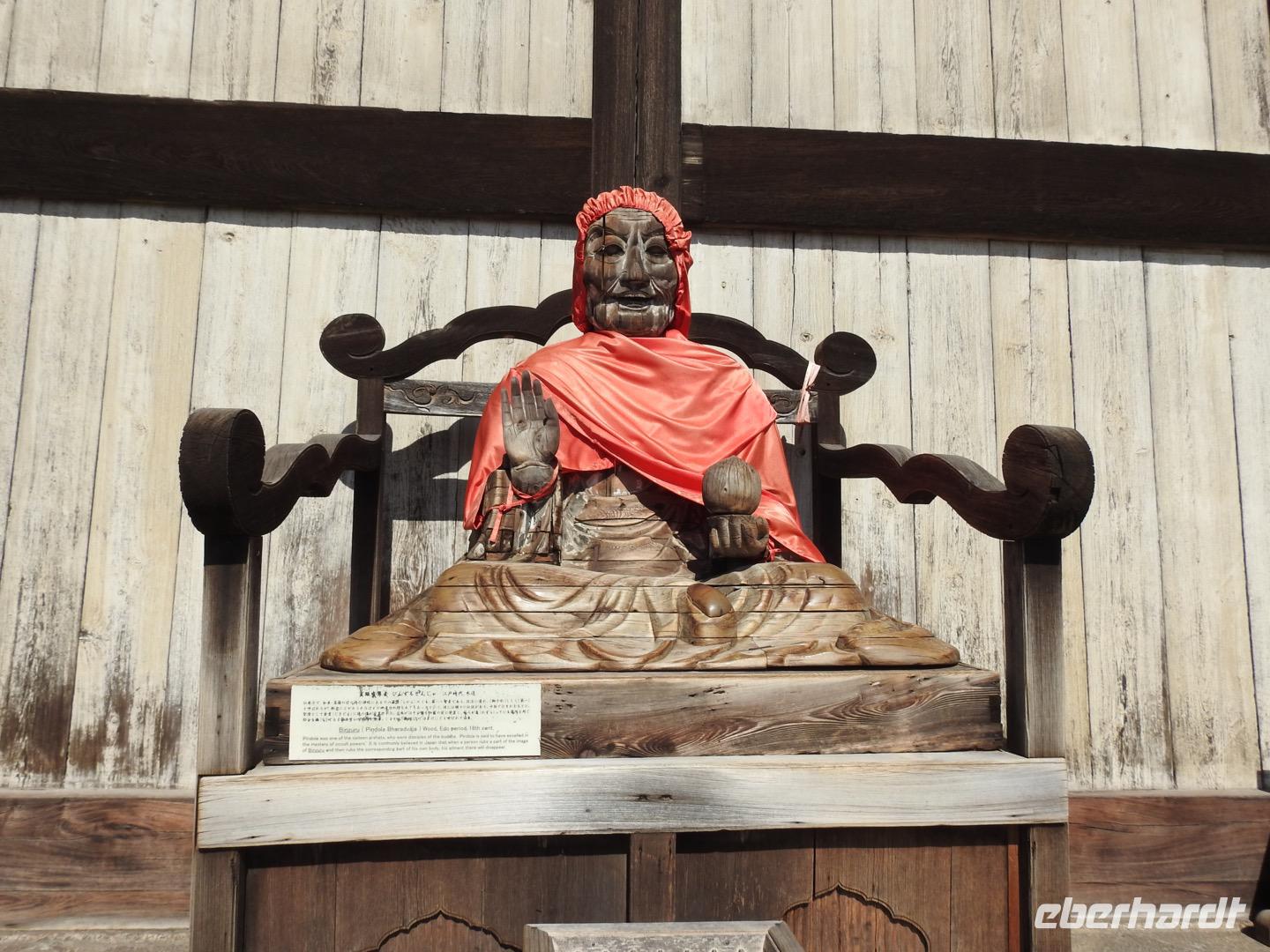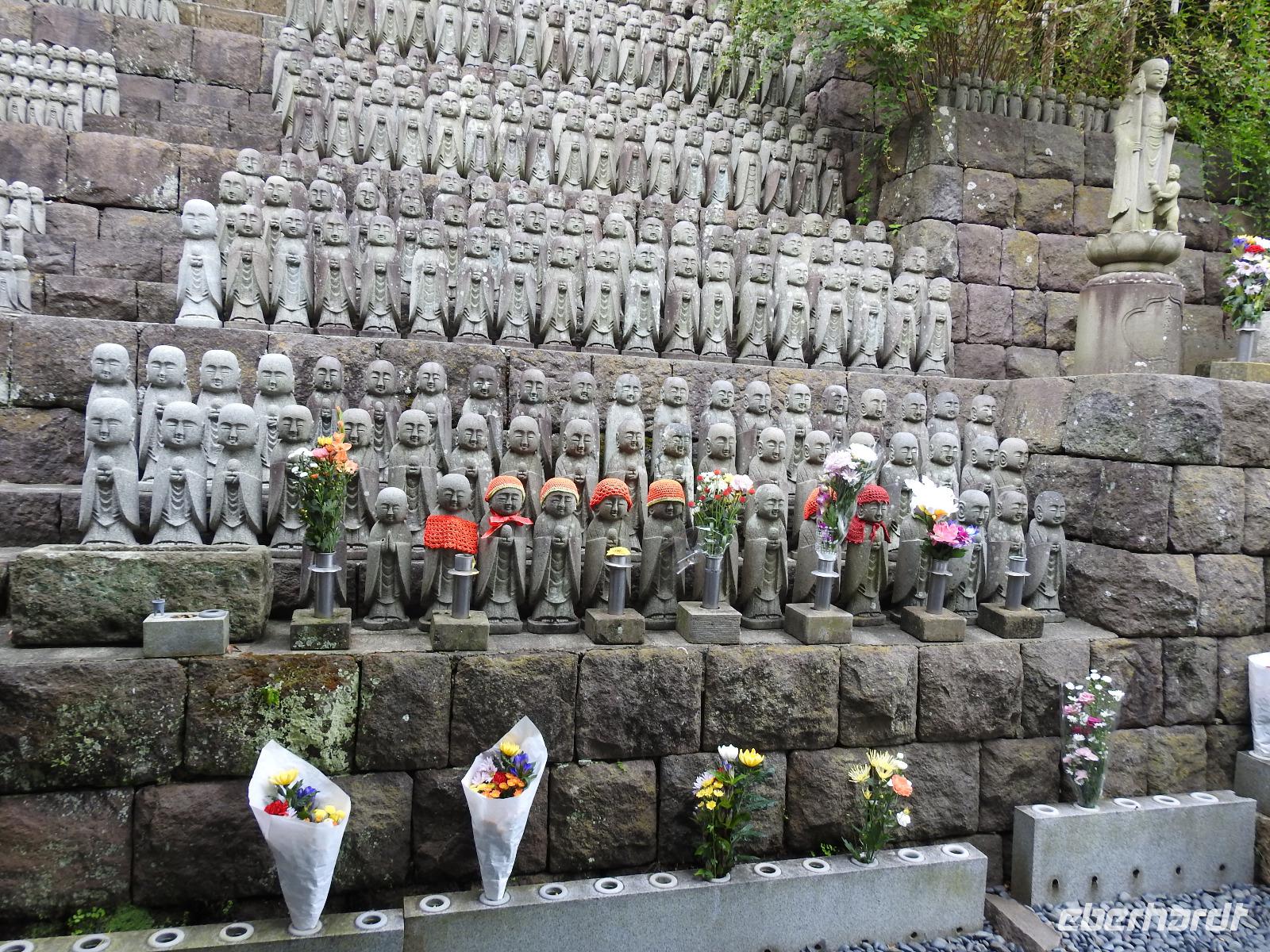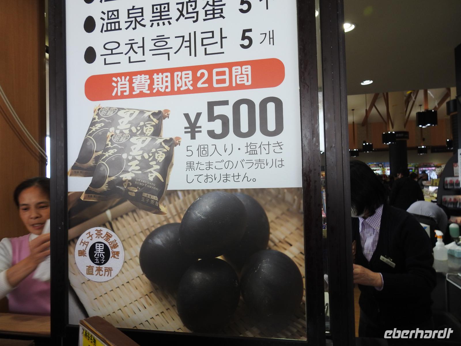 Von Togendai-ko geht es weiter mit dem Bus auf tausend Meter Höhe bis nach Owakudani. Hier dringt Schwefeldampf aus allen Löchern und es riecht entsprechend. Eine Spezialität sind hier die schwarzen Eier, deren Schale vom Kochen in Schwefelwasser schwarz ist. Für fünfhundert Yen könnte man fünf Eier erwerben und kosten, worauf wir jedoch vorsichtig verzichten. Die Touristenindustrie hat das Potenzial der schwarzen Eier auch entdeckt, nicht nur, dass es riesige Eiermodelle zum Fotografieren gibt, es stehen auch überall Hocker in Schwarzeierform herum und in den Geschäften gibt es alles, was man nur zum Thema schwarze Eier herstellen kann, angefangen von Schlüsselanhängern über Drops und Schokolade bis zu Plüscheiern für die Kleinen. Wir verlassen jetzt die Berge und fahren immer an der Küste entlang bis nach Kamakura, das wir nach anderthalb Stunden erreichen. Kamakura war von 1185 bis 1333 Regierungssitz Japans und ist heute ein beliebtes Reiseziel. Viele buddhistische Tempel und Shintoschreine gibt es hier zu sehen. Wir besuchen zuerst Daibutsu, eine überdimensionale frei stehende Buddhastatue. Anschließend spazieren wir zum Tempel Hase-dera. Die Statue ist eine von zwei, die aus einem großen Baumstamm angefertigt wurden. Während der einen ein Tempel in Nara gebaut wurde, musste diese, im Meer schwimmend, ihren Platz selbst suchen und landete sechzehn Jahre später in der Nähe von Kamakura. Sie wurde geborgen und bekam nun ebenfalls ihren Schrein.