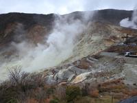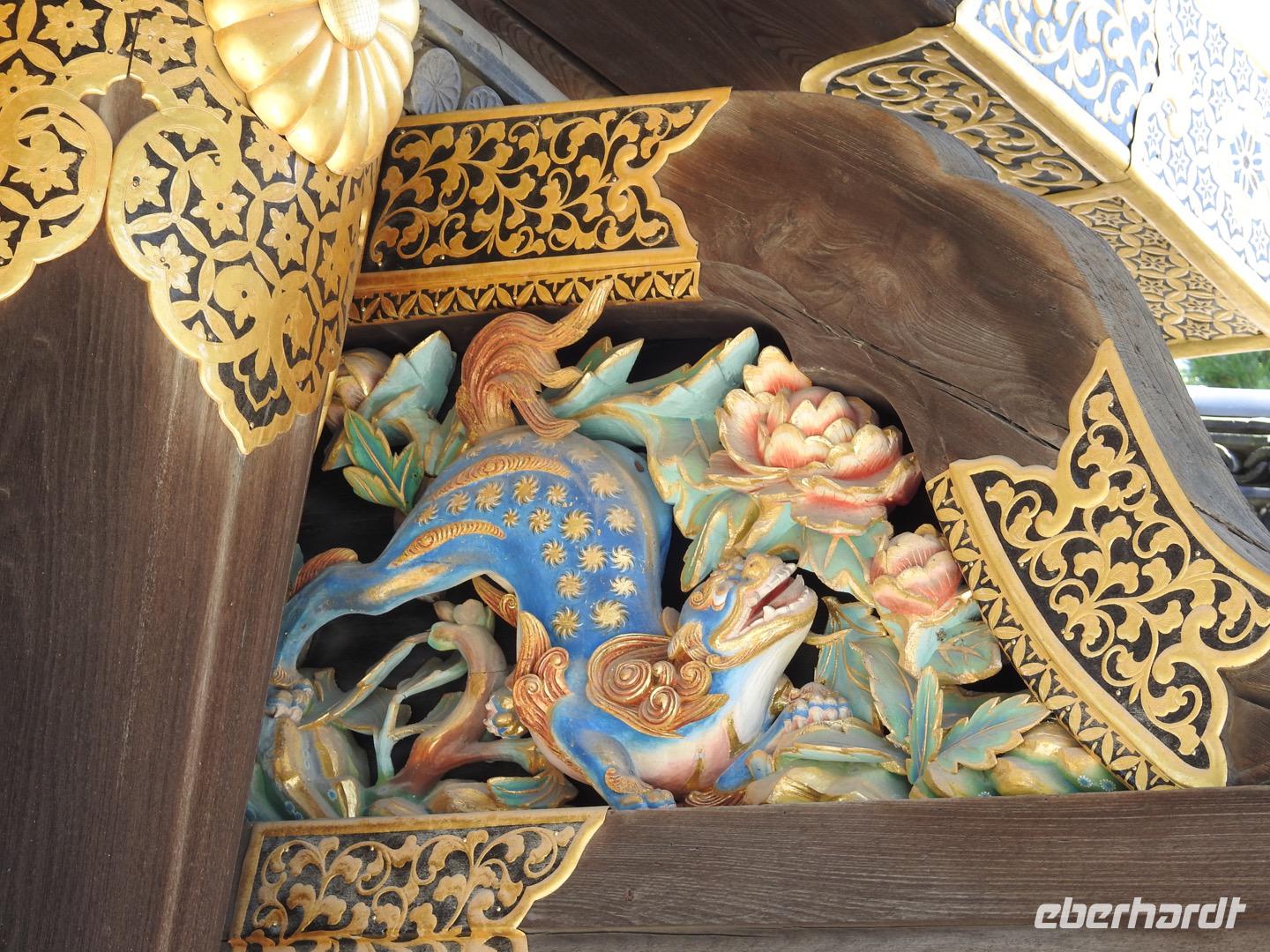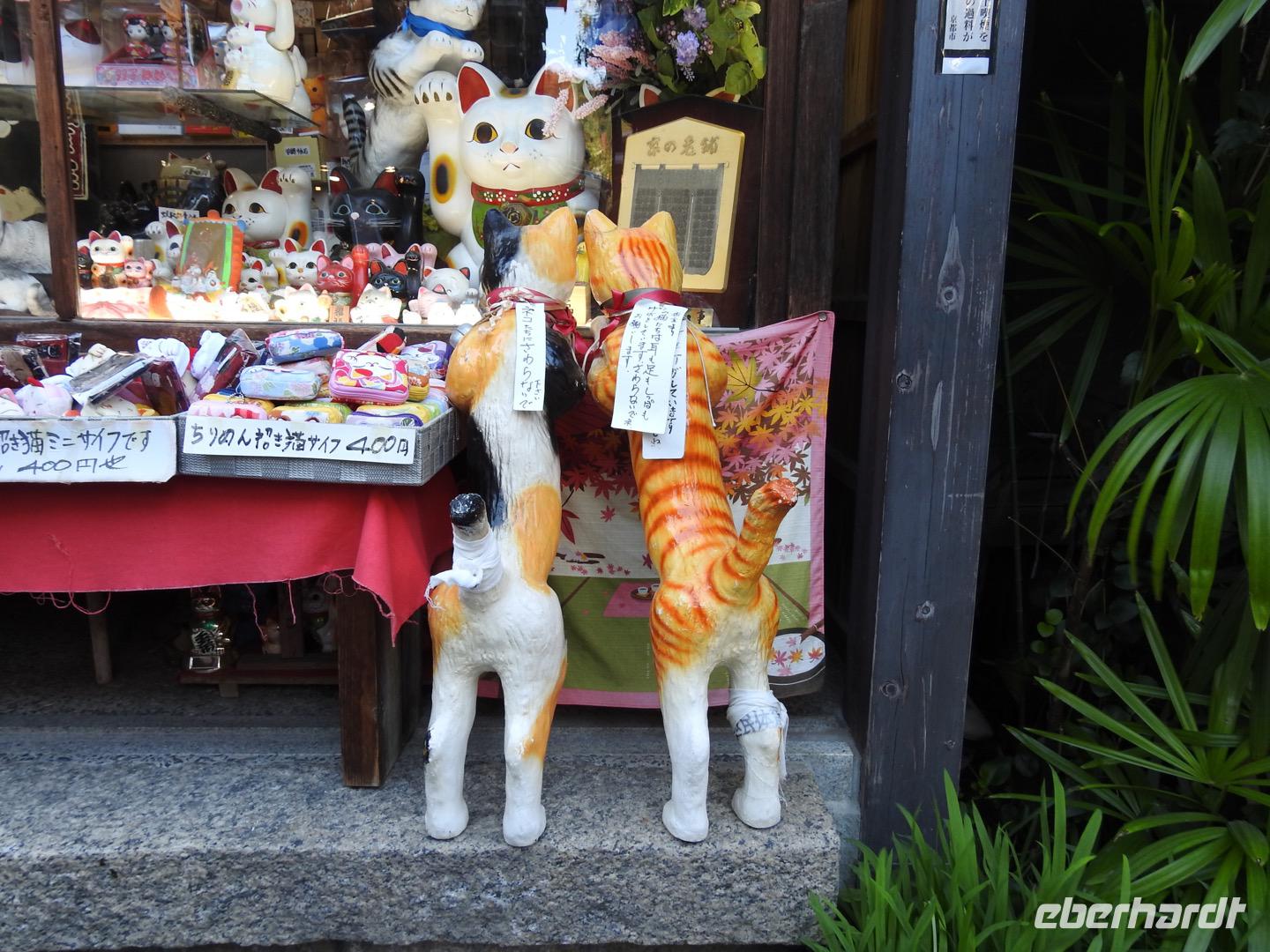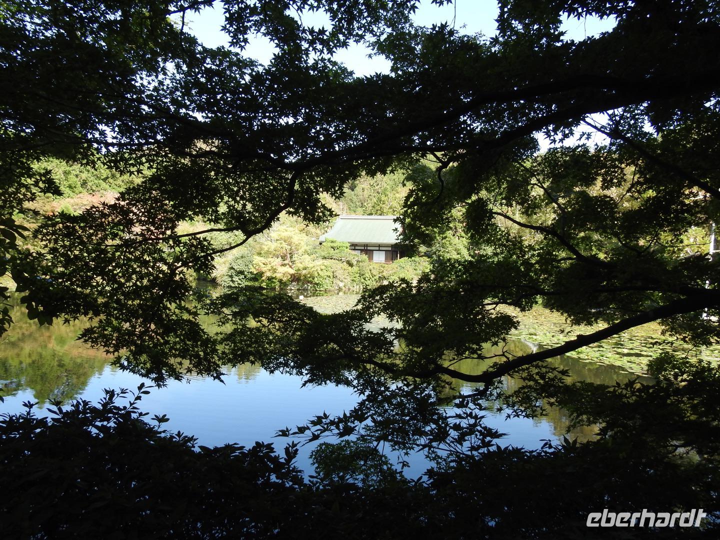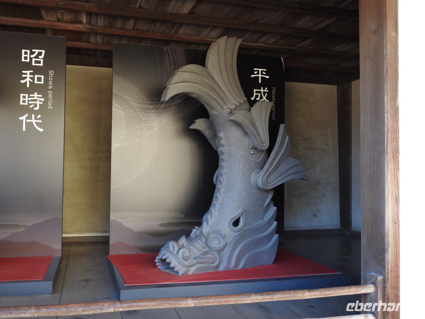 Von Togendai-ko geht es weiter mit dem Bus auf tausend Meter Höhe bis nach Owakudani. Hier dringt Schwefeldampf aus allen Löchern und es riecht entsprechend. Eine Spezialität sind hier die schwarzen Eier, deren Schale vom Kochen in Schwefelwasser schwarz ist. Für fünfhundert Yen könnte man fünf Eier erwerben und kosten, worauf wir jedoch vorsichtig verzichten. Die Touristenindustrie hat das Potenzial der schwarzen Eier auch entdeckt, nicht nur, dass es riesige Eiermodelle zum Fotografieren gibt, es stehen auch überall Hocker in Schwarzeierform herum und in den Geschäften gibt es alles, was man nur zum Thema schwarze Eier herstellen kann, angefangen von Schlüsselanhängern über Drops und Schokolade bis zu Plüscheiern für die Kleinen. Wir verlassen jetzt die Berge und fahren immer an der Küste entlang bis nach Kamakura, das wir nach anderthalb Stunden erreichen. Kamakura war von 1185 bis 1333 Regierungssitz Japans und ist heute ein beliebtes Reiseziel. Viele buddhistische Tempel und Shintoschreine gibt es hier zu sehen. Wir besuchen zuerst Daibutsu, eine überdimensionale frei stehende Buddhastatue. Anschließend spazieren wir zum Tempel Hase-dera. Die Statue ist eine von zwei, die aus einem großen Baumstamm angefertigt wurden. Während der einen ein Tempel in Nara gebaut wurde, musste diese, im Meer schwimmend, ihren Platz selbst suchen und landete sechzehn Jahre später in der Nähe von Kamakura. Sie wurde geborgen und bekam nun ebenfalls ihren Schrein.