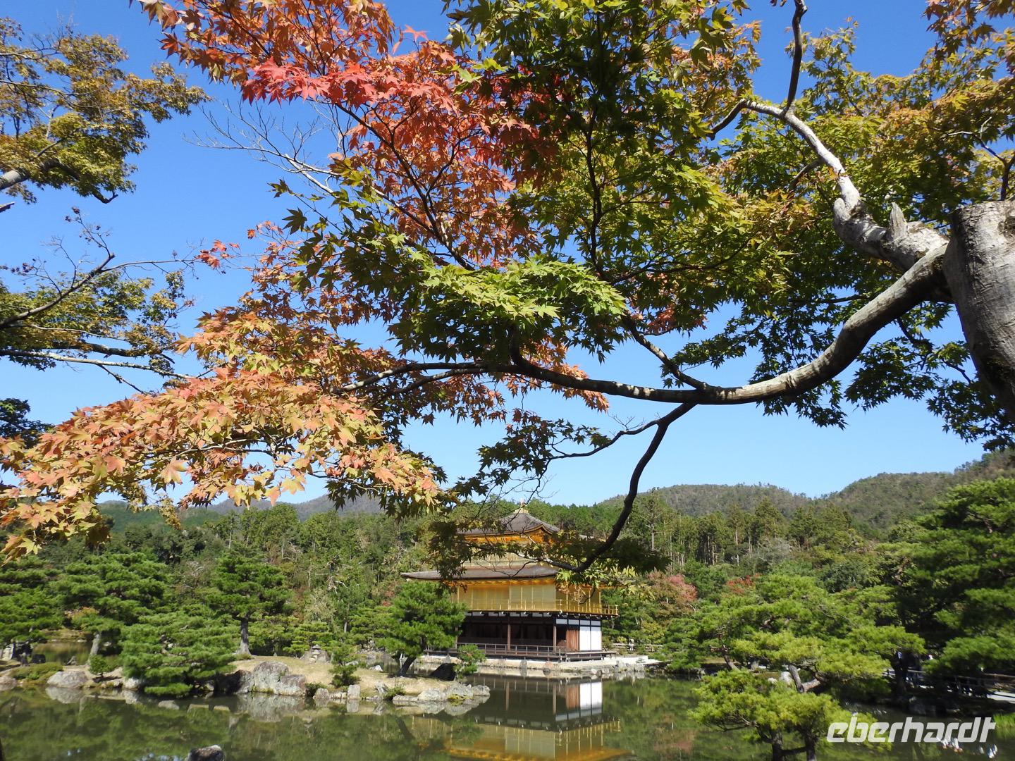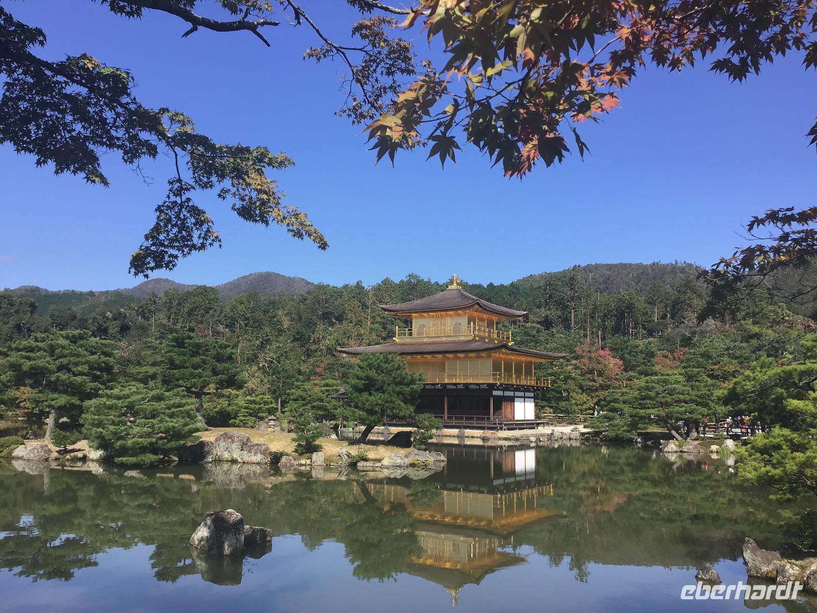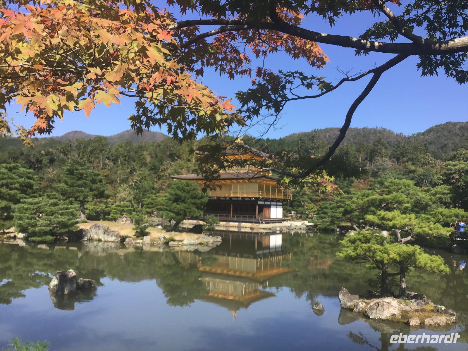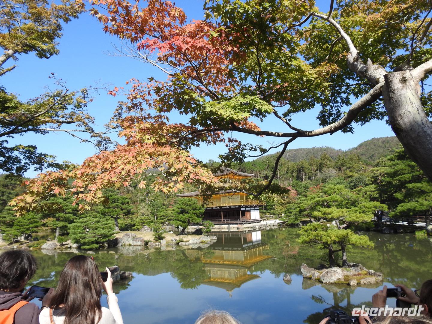 Heute Vormittag haben wir einen Bus zur Verfügung. Zuerst besuchen wir den Ryoanji Garten. Er zählt zu den berühmtesten Zen-Gärten Japans. Auf einer Fläche von zehn mal dreißig Metern sind auf fein geharktem Kies fünfzehn große Steine platziert, scheinbar zufällig. Wir können uns am Rand der Anlage auf eine Treppenstufe setzen und im Sonnenlicht darüber nachsinnen, was der Künstler uns bzw. seinem Publikum damit sagen wollte. Schließlich stammt der Garten bereits aus dem Jahre 1450 und wurde von einem damaligen Staatsbeamten angelegt. Wir haben noch Zeit, durch den sich anschließenden Park spazieren zu gehen, dann fahren wir weiter zum Kinkaku-Ji. Der Himmel ist blau, die Sonne scheint und ein bisschen färben sich schon die Blätter. Damit haben wir schönstes Fotografenwetter für den Goldenen Pavillon. 1394 begab es sich, dass der Shogun Yoshimitsu mit 37 Jahren sein Amt zugunsten seines Sohnes aufgab. Nunmehr beschäftigte er sich nur noch mit der Anlage seines Alterswohnsitzes. Bald wurde dieses Projekt zu seinem Hauptwohnsitz und er widmete sich mit aller Kraft der Konstruktion des dazugehörigen Pavillons. Besonders wegen seiner Vergoldung wurde dieser später berühmt und zieht noch heute viele Besucher an.