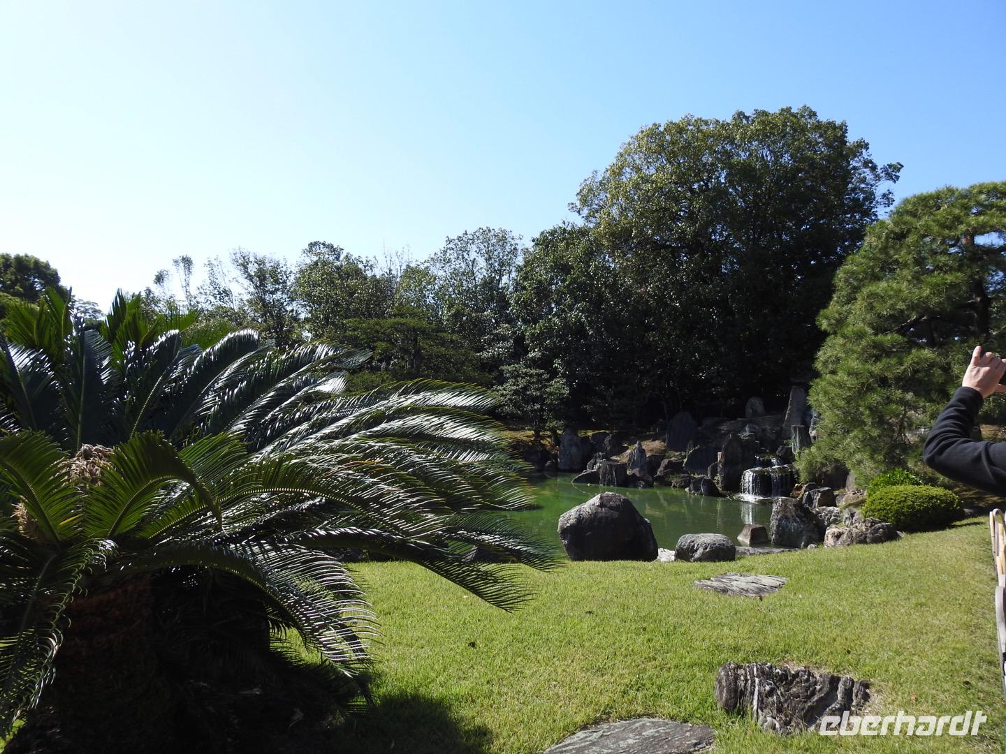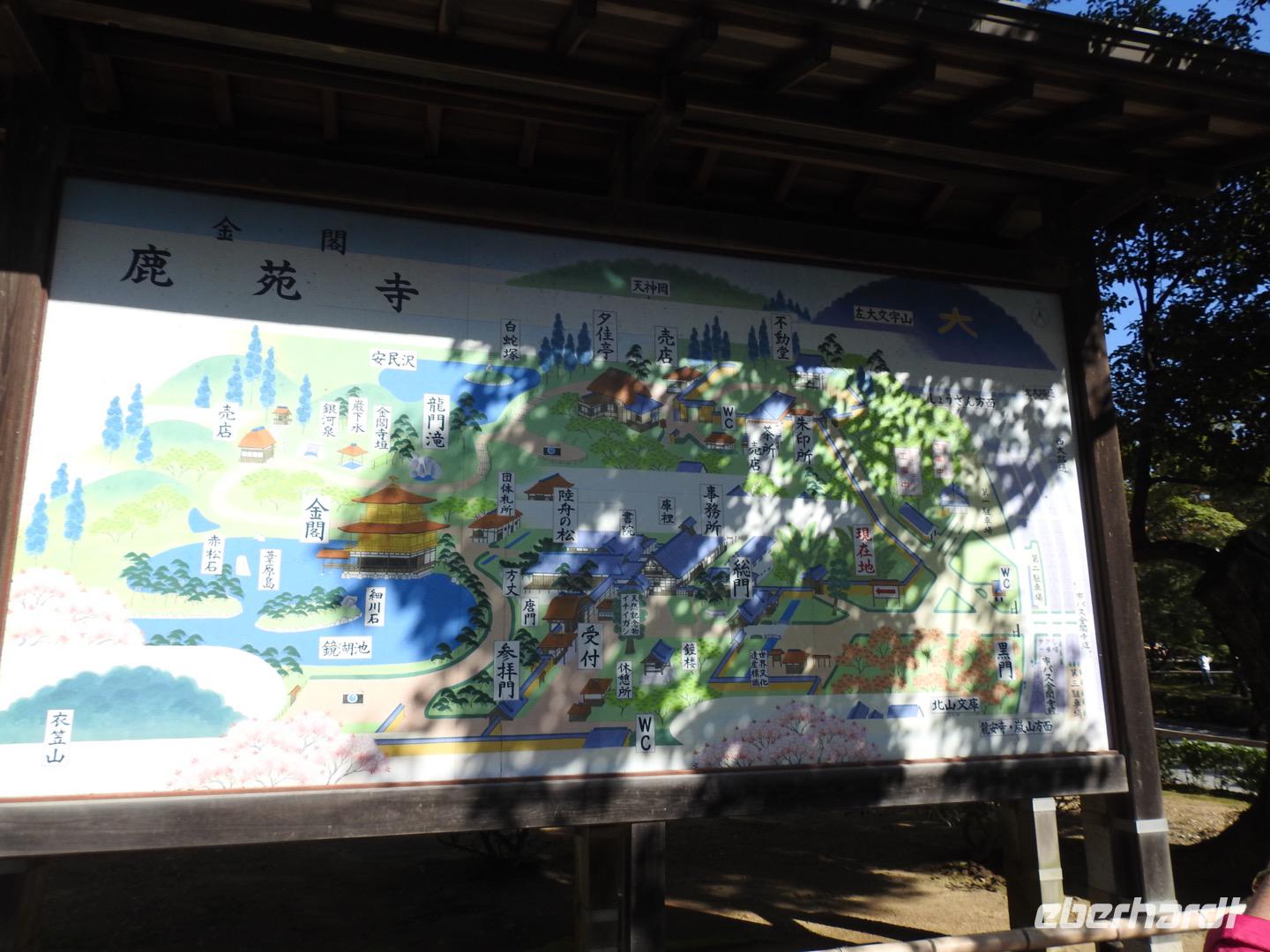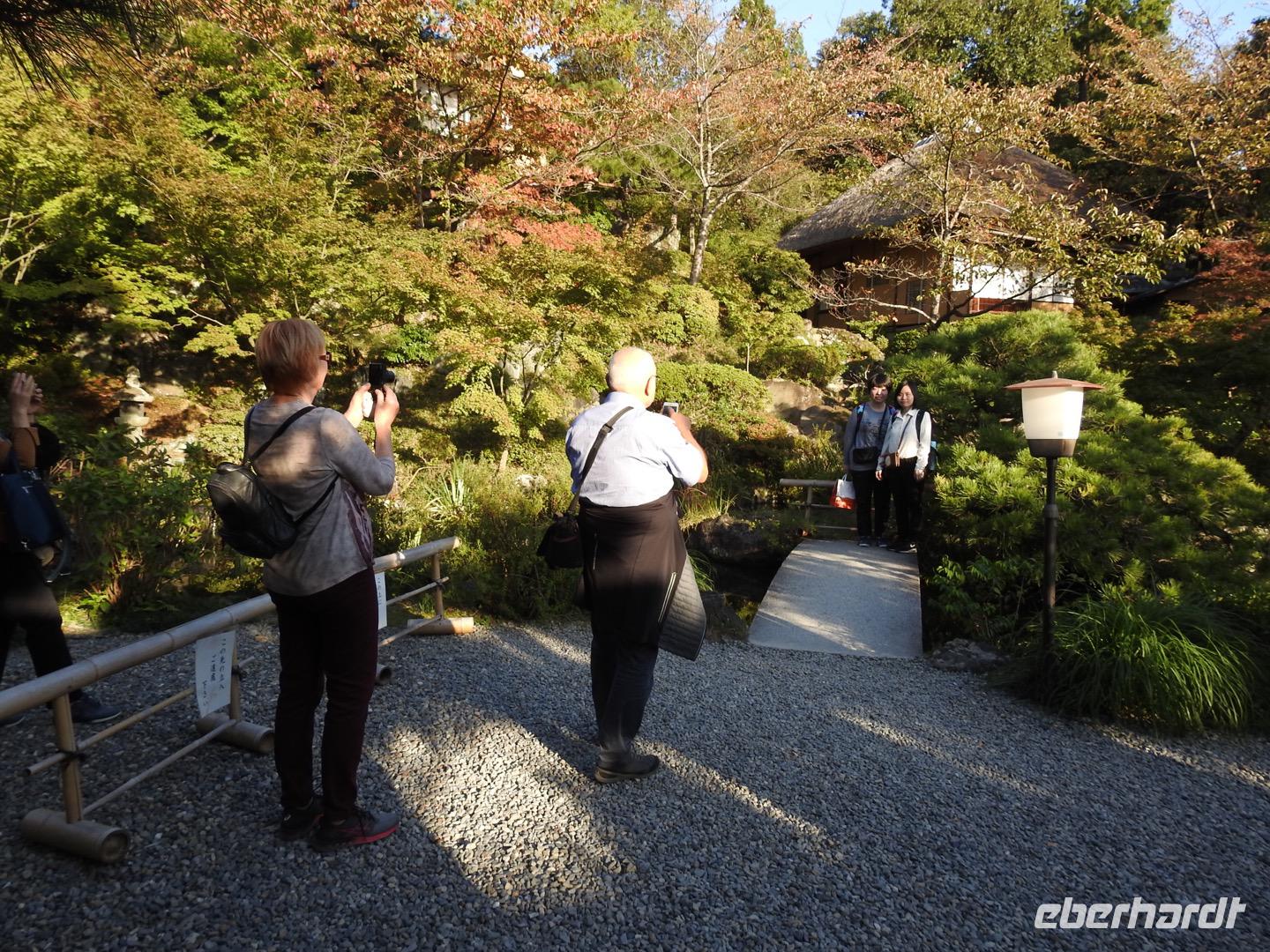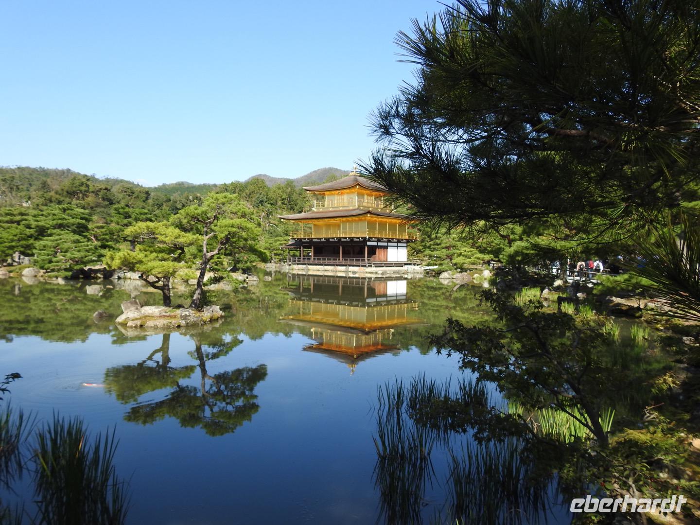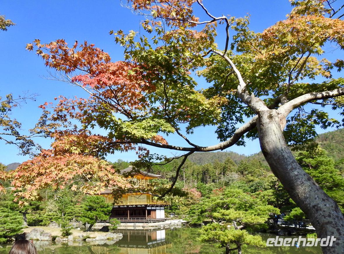 Heute Vormittag haben wir einen Bus zur Verfügung. Zuerst besuchen wir den Ryoanji Garten. Er zählt zu den berühmtesten Zen-Gärten Japans. Auf einer Fläche von zehn mal dreißig Metern sind auf fein geharktem Kies fünfzehn große Steine platziert, scheinbar zufällig. Wir können uns am Rand der Anlage auf eine Treppenstufe setzen und im Sonnenlicht darüber nachsinnen, was der Künstler uns bzw. seinem Publikum damit sagen wollte. Schließlich stammt der Garten bereits aus dem Jahre 1450 und wurde von einem damaligen Staatsbeamten angelegt. Wir haben noch Zeit, durch den sich anschließenden Park spazieren zu gehen, dann fahren wir weiter zum Kinkaku-Ji. Der Himmel ist blau, die Sonne scheint und ein bisschen färben sich schon die Blätter. Damit haben wir schönstes Fotografenwetter für den Goldenen Pavillon. 1394 begab es sich, dass der Shogun Yoshimitsu mit 37 Jahren sein Amt zugunsten seines Sohnes aufgab. Nunmehr beschäftigte er sich nur noch mit der Anlage seines Alterswohnsitzes. Bald wurde dieses Projekt zu seinem Hauptwohnsitz und er widmete sich mit aller Kraft der Konstruktion des dazugehörigen Pavillons. Besonders wegen seiner Vergoldung wurde dieser später berühmt und zieht noch heute viele Besucher an.
