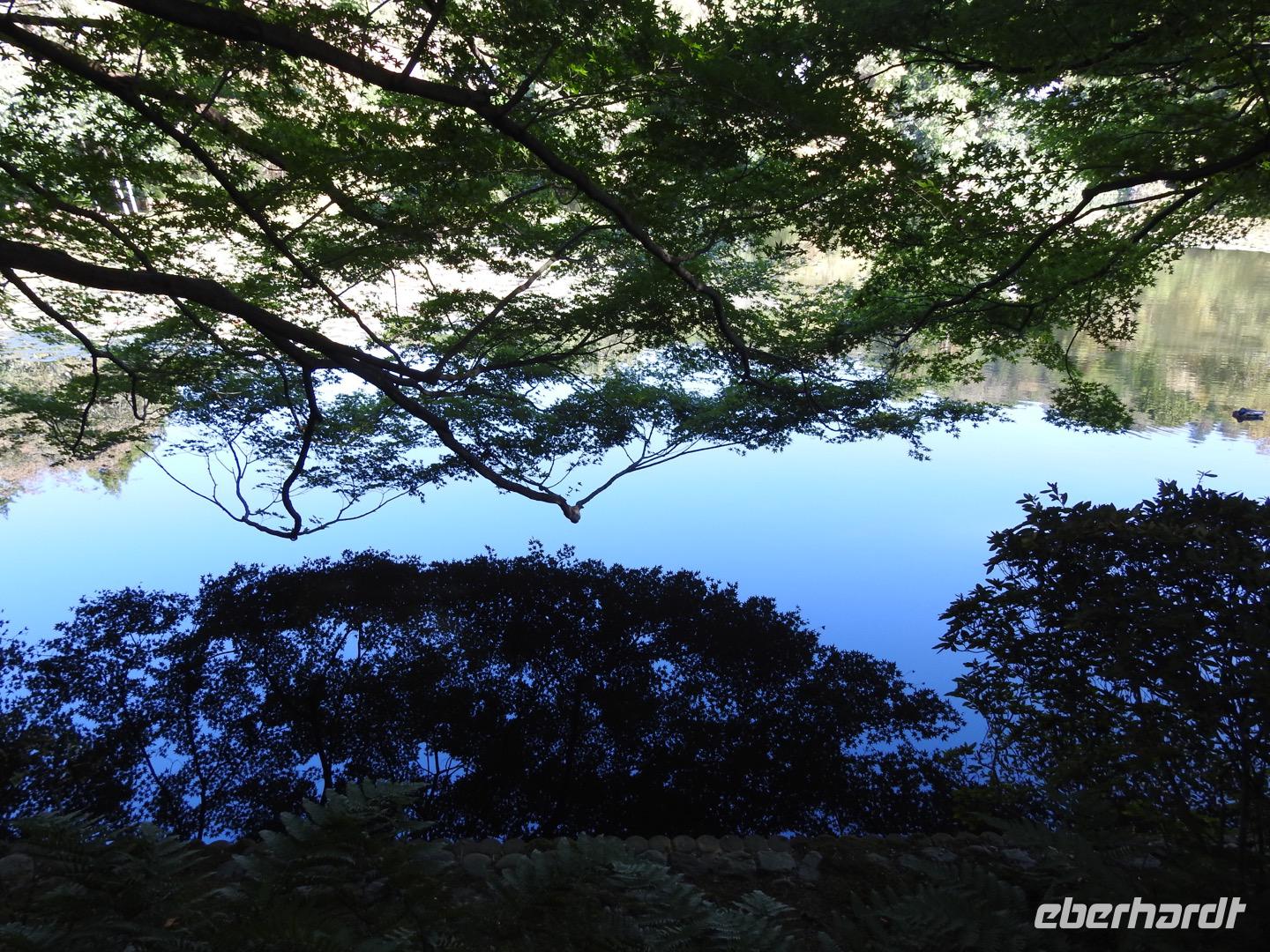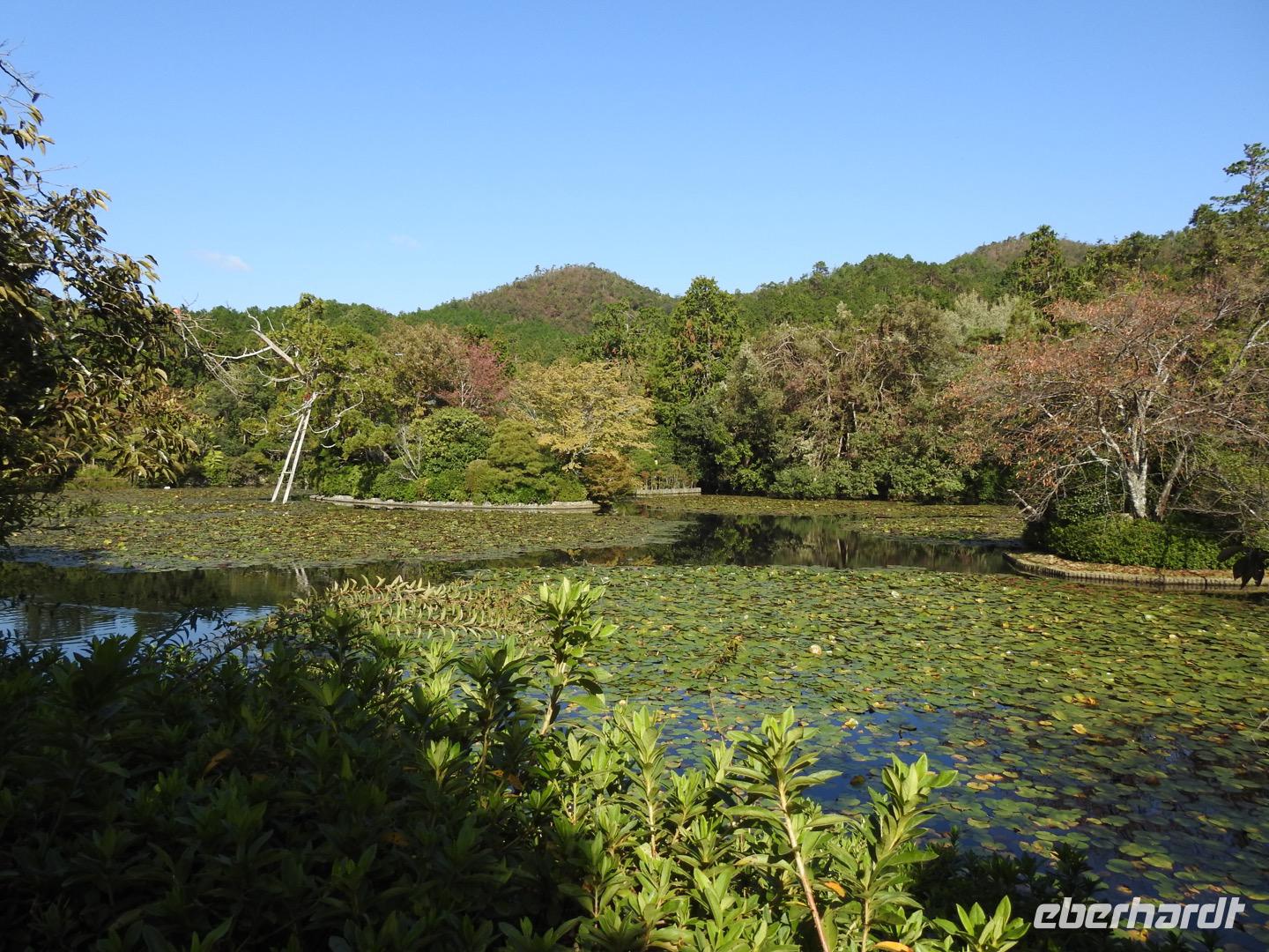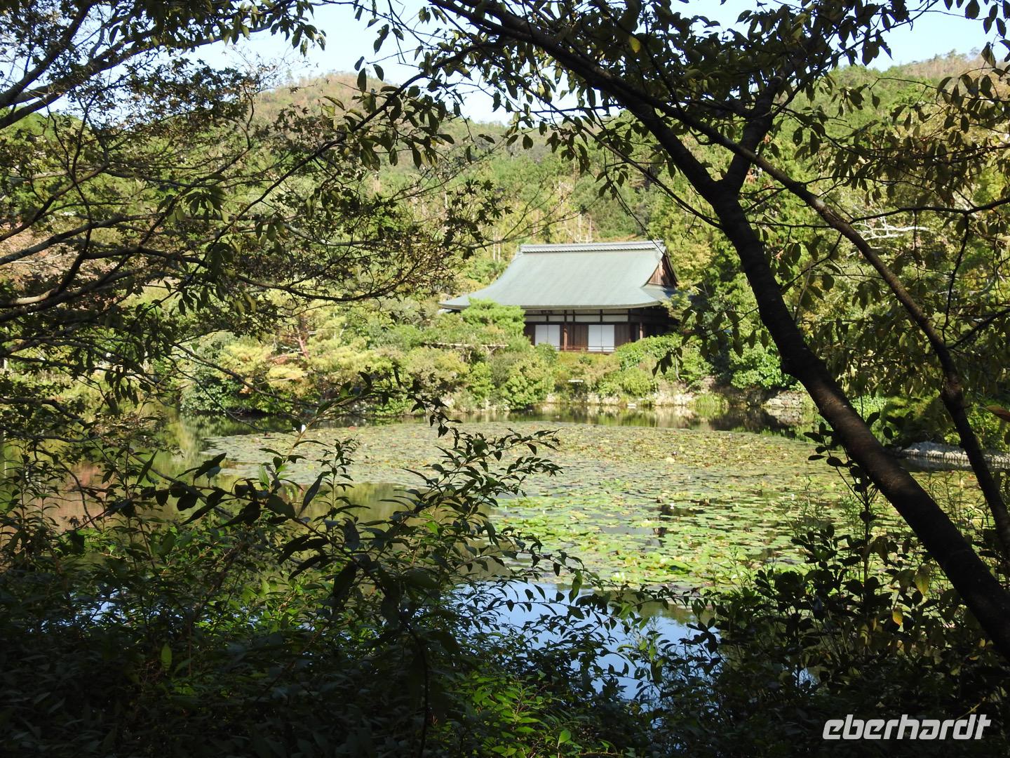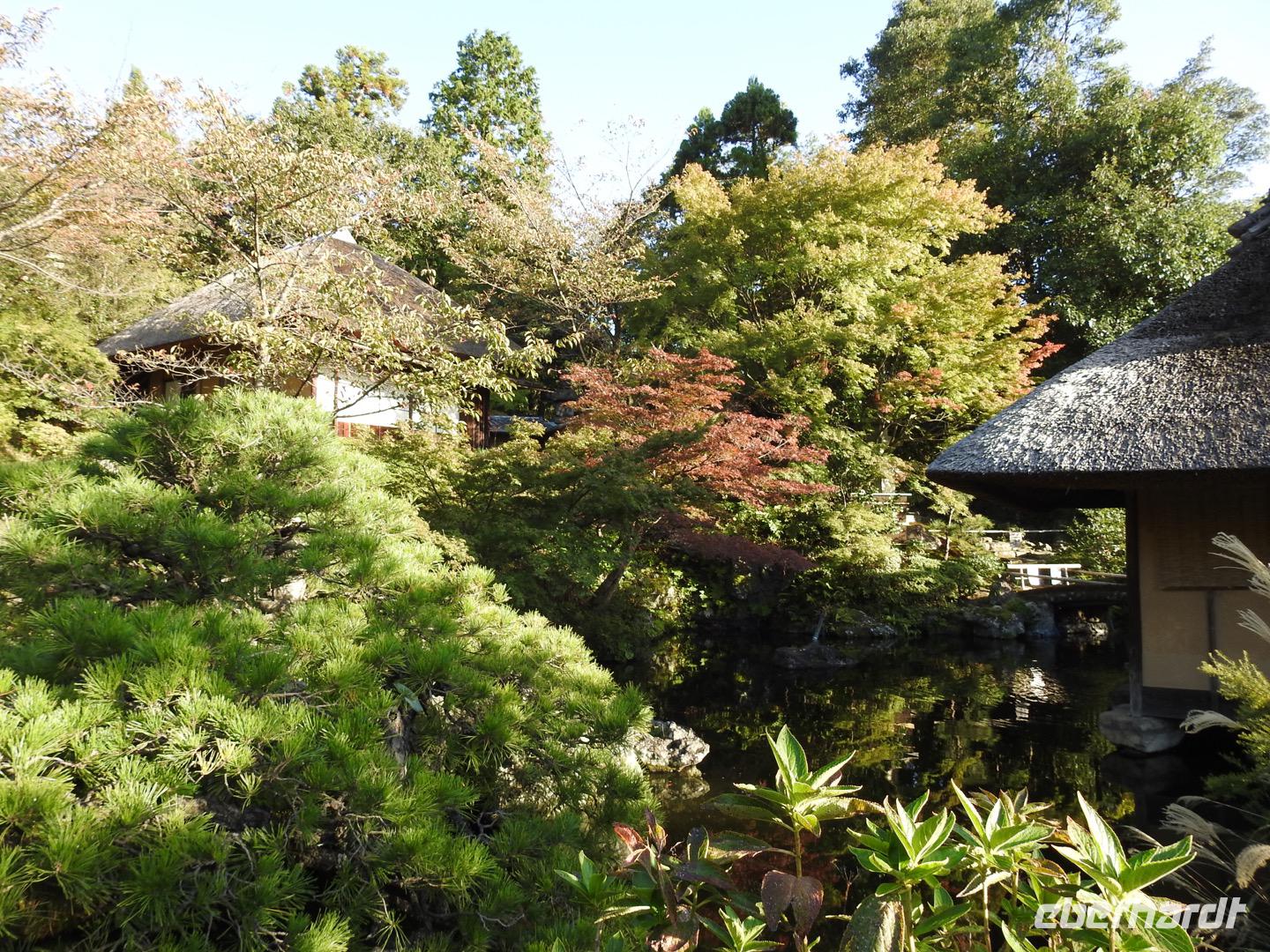 Heute Vormittag haben wir einen Bus zur Verfügung. Zuerst besuchen wir den Ryoanji Garten. Er zählt zu den berühmtesten Zen-Gärten Japans. Auf einer Fläche von zehn mal dreißig Metern sind auf fein geharktem Kies fünfzehn große Steine platziert, scheinbar zufällig. Wir können uns am Rand der Anlage auf eine Treppenstufe setzen und im Sonnenlicht darüber nachsinnen, was der Künstler uns bzw. seinem Publikum damit sagen wollte. Schließlich stammt der Garten bereits aus dem Jahre 1450 und wurde von einem damaligen Staatsbeamten angelegt. Wir haben noch Zeit, durch den sich anschließenden Park spazieren zu gehen, dann fahren wir weiter zum Kinkaku-Ji. Der Himmel ist blau, die Sonne scheint und ein bisschen färben sich schon die Blätter. Damit haben wir schönstes Fotografenwetter für den Goldenen Pavillon. 1394 begab es sich, dass der Shogun Yoshimitsu mit 37 Jahren sein Amt zugunsten seines Sohnes aufgab. Nunmehr beschäftigte er sich nur noch mit der Anlage seines Alterswohnsitzes. Bald wurde dieses Projekt zu seinem Hauptwohnsitz und er widmete sich mit aller Kraft der Konstruktion des dazugehörigen Pavillons. Besonders wegen seiner Vergoldung wurde dieser später berühmt und zieht noch heute viele Besucher an.