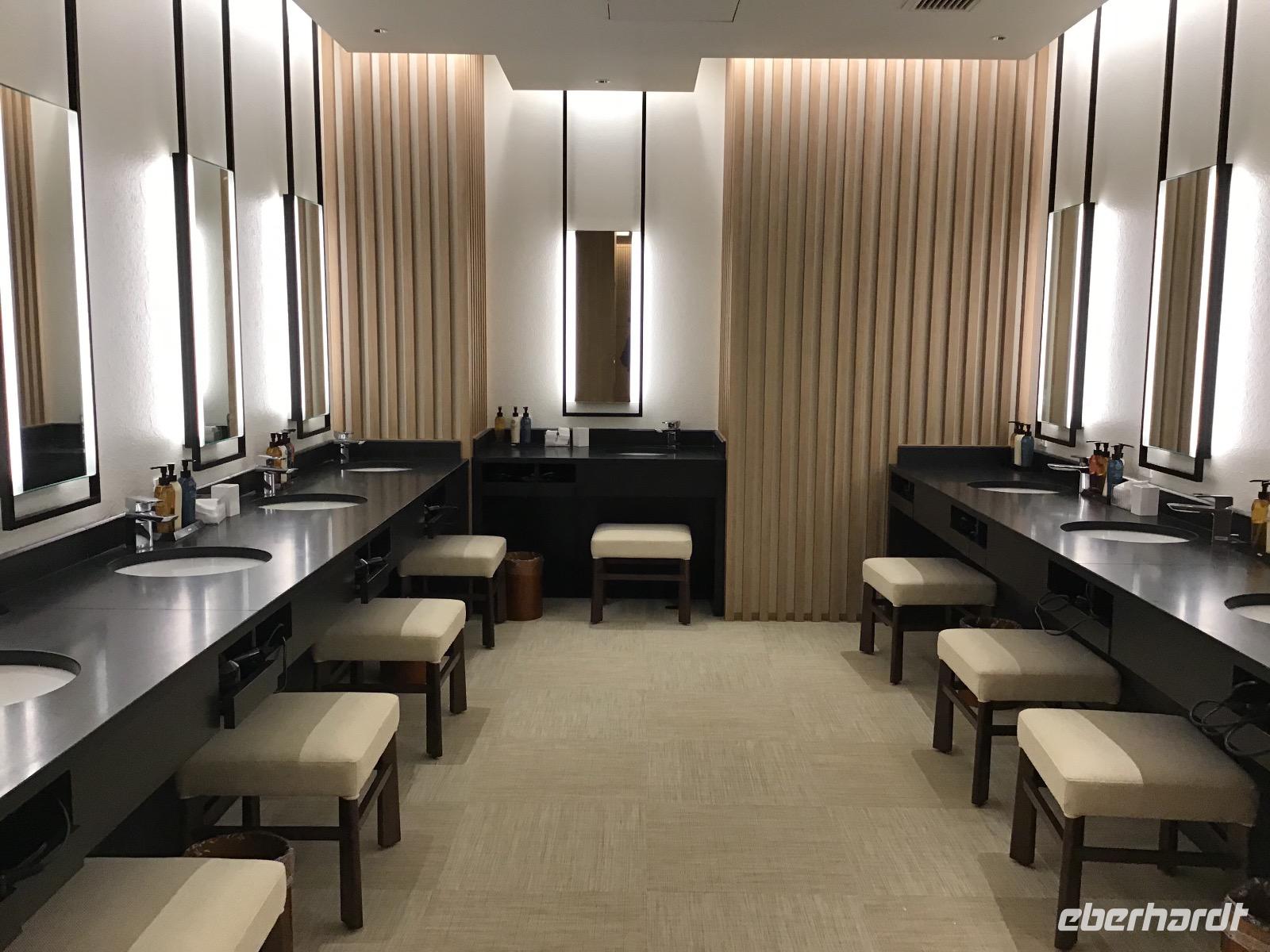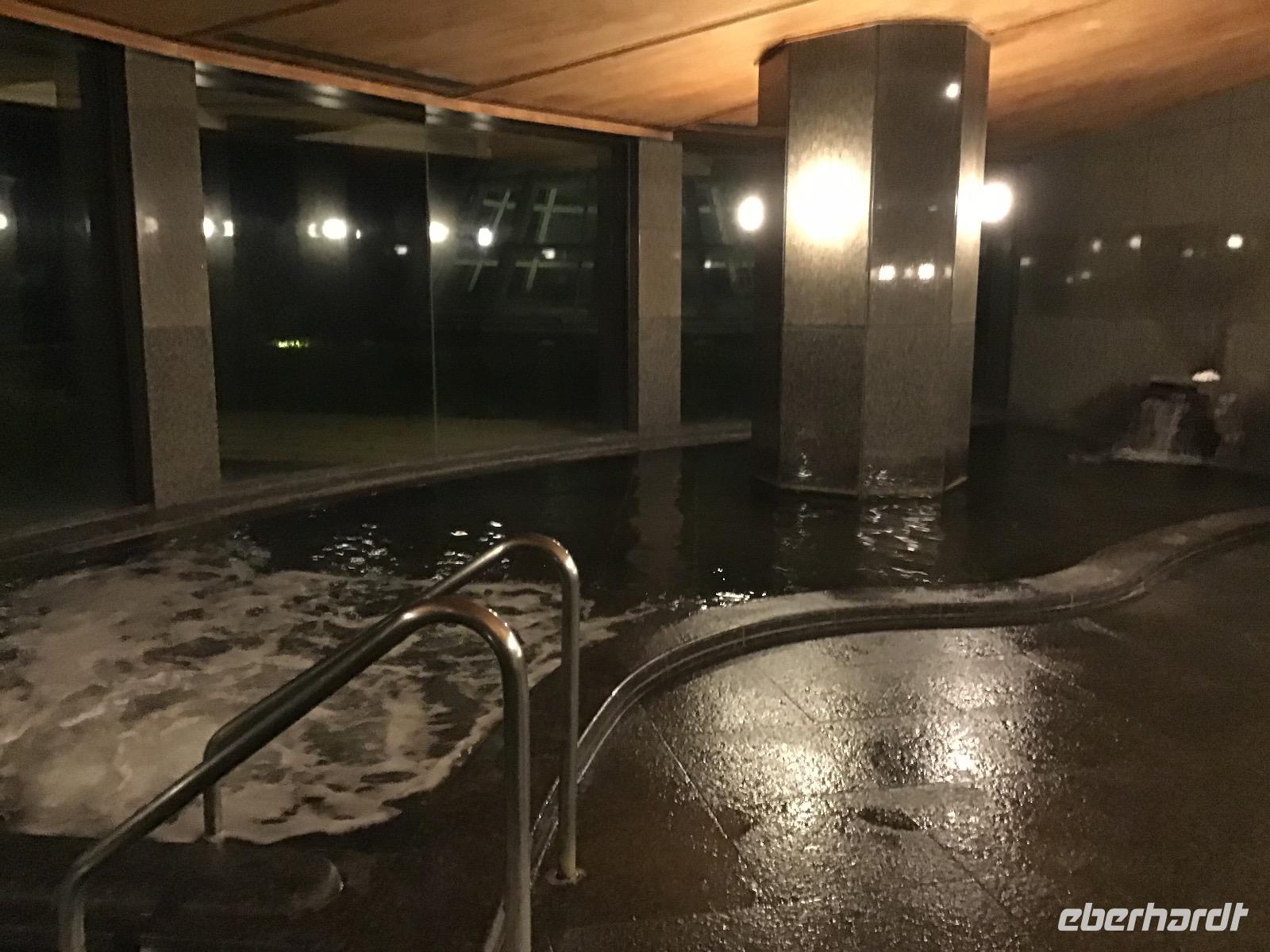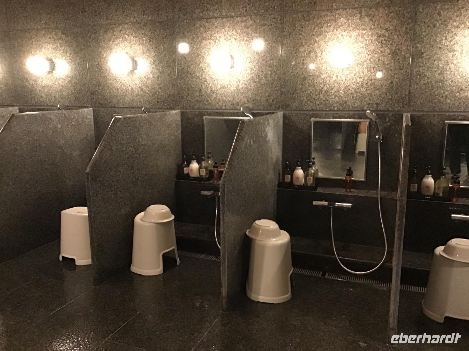 Am späten Mittag fahren wir zurück nach Kyoto und von dort mit dem Shinkansen zum Fuji-Hakone-Izu Nationalpark. Es ist bereits dunkel, als wir das Hotel erreichen. Am schwarzen Himmel steht ein Eierkuchenmond. Das Hilton Hotel hat einen schönen Wellnessbereich. Wir könnten im warmen Wasser baden, im Whirlpool relaxen oder auf einer 25 Meterbahn um die Wette schwimmen. Hierfür ist allerdings eine Badekappe vorgeschrieben. Alternativ besteht die Möglichkeit, der japanischen Badekultur zu frönen. Früher hatten die japanischen Häuser keine eigenen Bäder und man ging in ein öffentliches Bad, um sich zu reinigen. Hier wurde und wird der Aufenthalt im Bad streng nach Geschlechtern getrennt. Bevor man/frau das Bad aber benutzt wird geduscht und zwar sitzend auf einem Hocker. Dazu wird ein bereit stehender Kübel mit Wasser gefüllt und über dem Kopf ausgeschüttet. Das Bad an sich dient dann der Entspannung und nicht mehr der Reinigung.