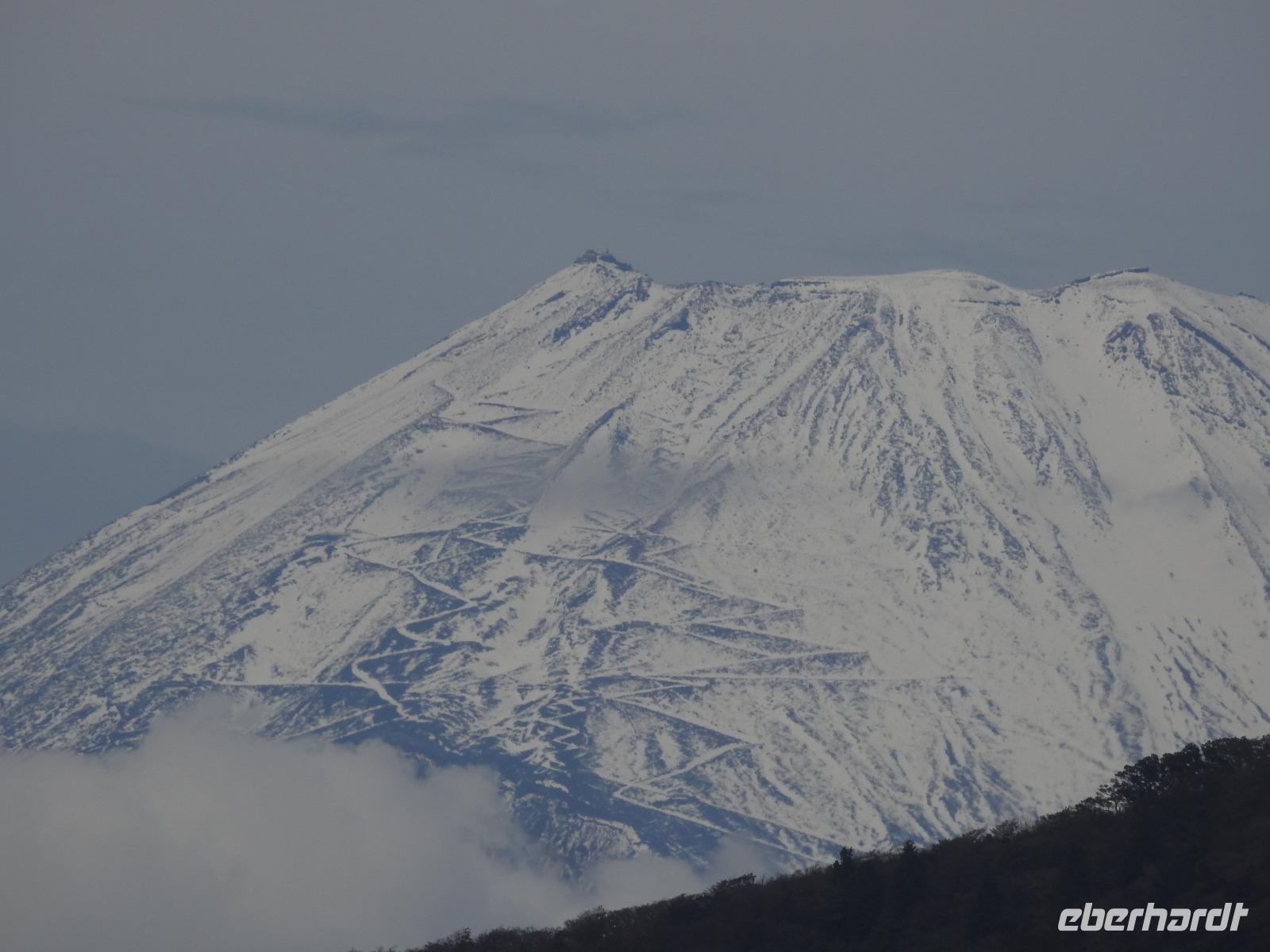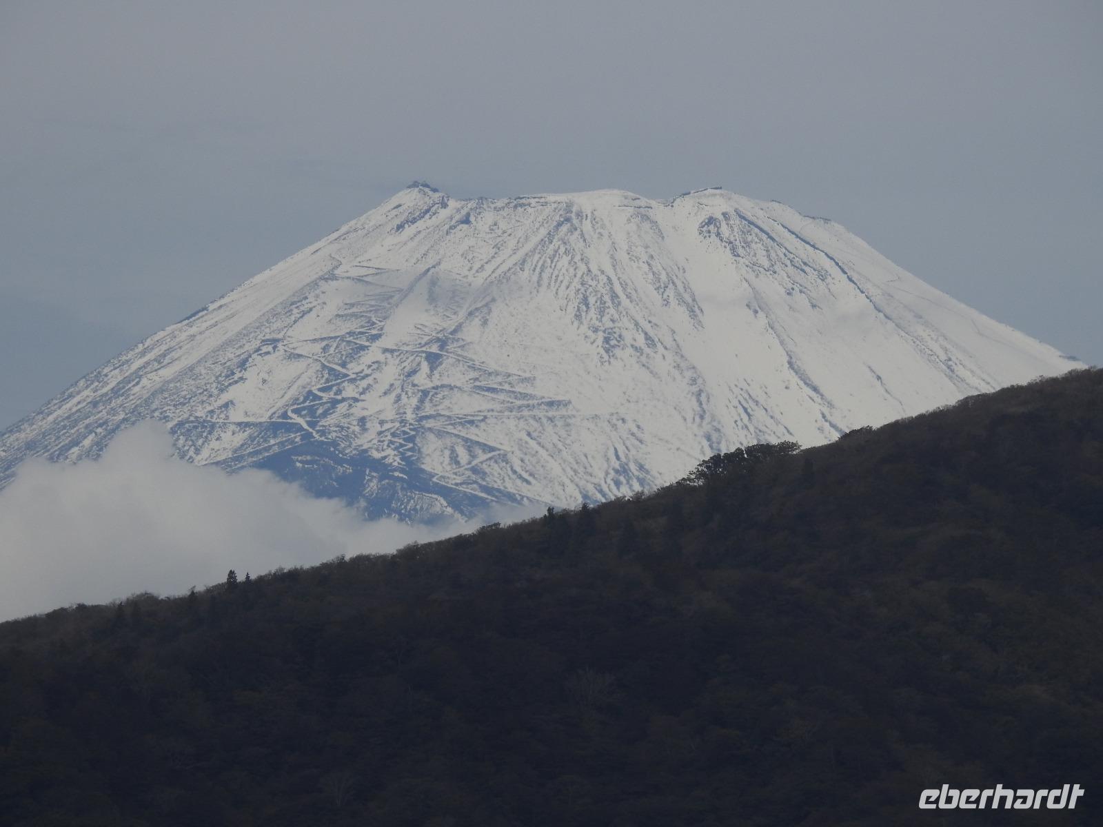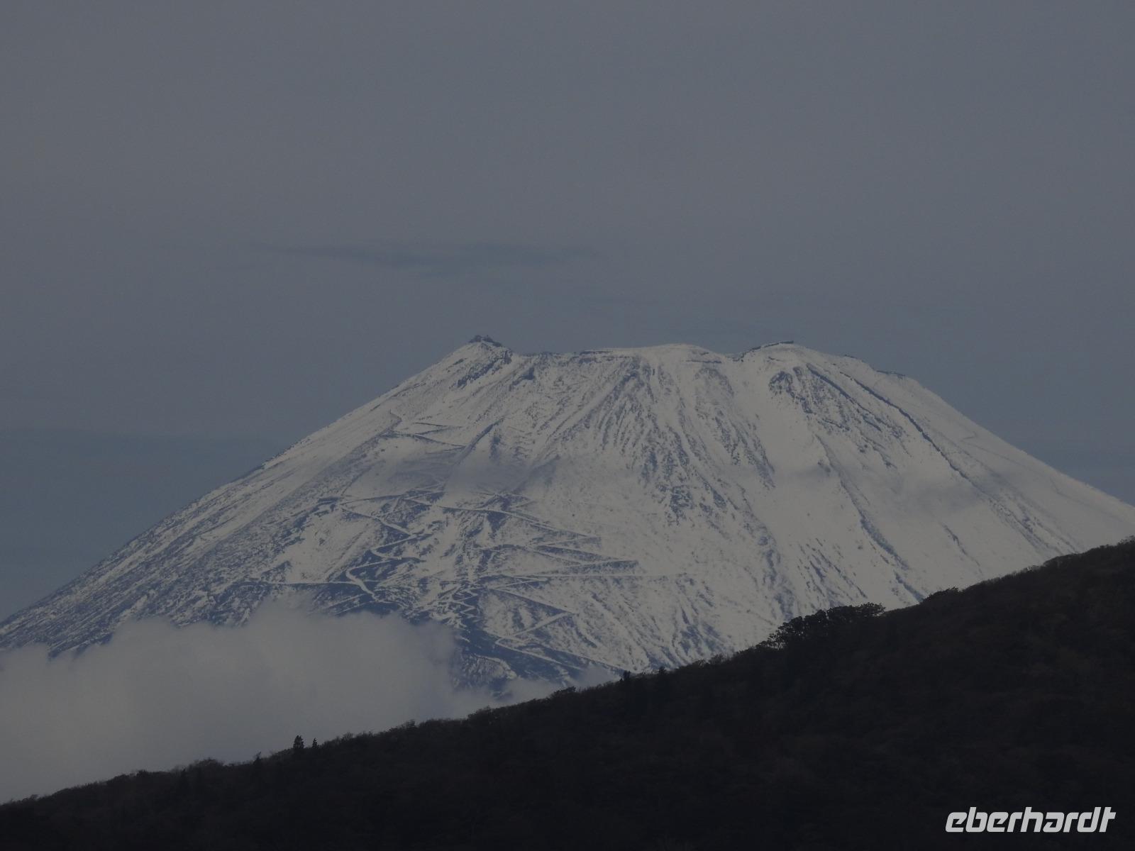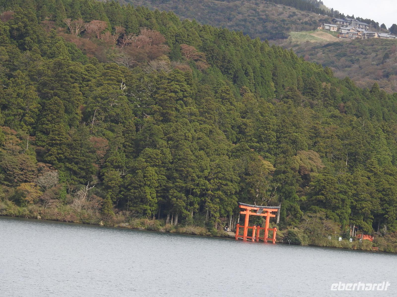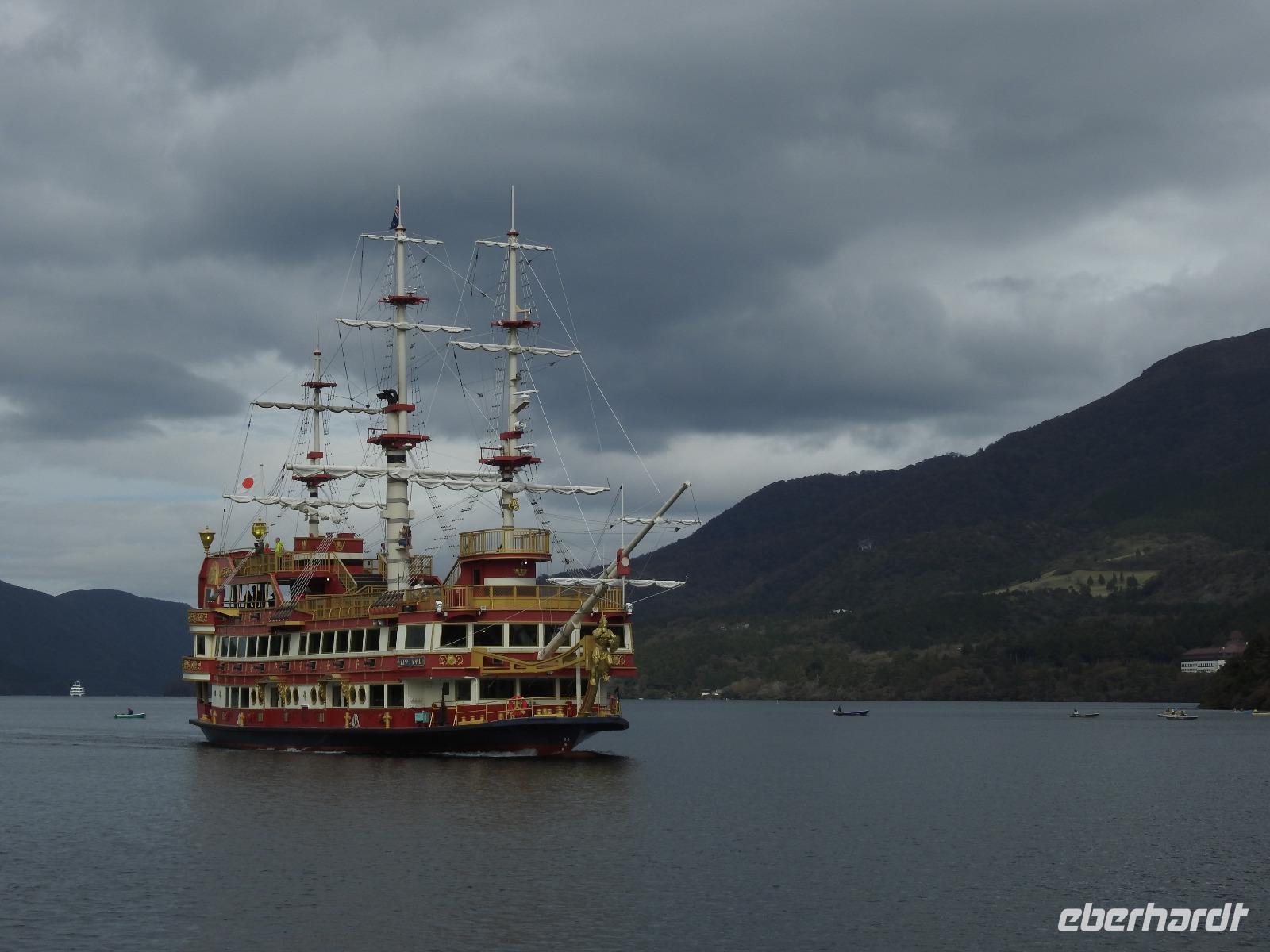 Vormittags sind wir auf der Jagd nach Fotos vom Fuji-san. Durch die Bergwelt von Hakone fahren wir zum Ashi-See, was auf Deutsch SEE DES SCHILFROHRS bedeutet. Die Japaner nennen den Berg auch DER SCHEUE. Warum, das erleben wir heute hautnah. Als wir am Ufer des Sees ankommen, werden wir mit einem traumhaften Blick auf den fast symmetrischen Berg verwöhnt. Während unserer Fahrt mit dem Piratenboot auf dem See versteckt er sich allerdings scheu in den Wolken. Die Japaner verehren ihren Berg und jeder möchte mindestens einmal im Leben, den Fuji-san gesehen haben.