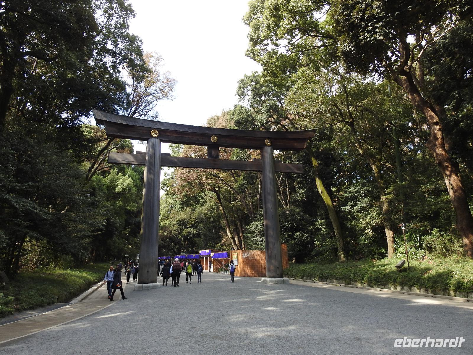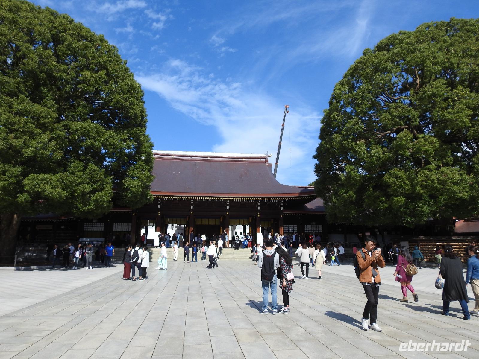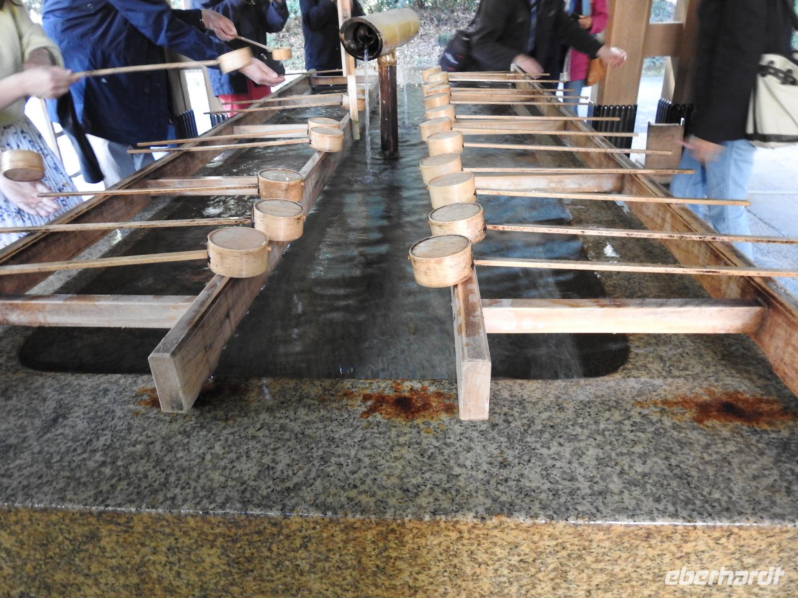Vormittags unternehmen wir eine Stadtrundfahrt. Wir kommen am Parlament vorbei, am Gerichtsgebäude und an vielen neu entstehenden Hochhäusern. Die werktätige Bevölkerung eilt in Schlips und Kragen ins Büro. Am Gästehaus der Regierung mit seinem großen weißen Tor stoppt unser Fahrer für ein Foto. Nach einer Stunde Fahrt erreichen wir den Meji Schrein, den wir zu Fuß besichtigen. Wir flanieren an einer Chrysantemen-Ausstellung vorbei, zelebrieren die rituelle Waschung und verneigen uns, der Tradition folgend, unter dem Tor, bevor wir den Schrein betreten. Der bedeutendste Schrein Japans ist für unsere Touristenaugen der unspektakulärste. Jedoch die Herzen der Japaner hängen an ihrem Schrein und wichtige Zeremonien werden hier durchgeführt.