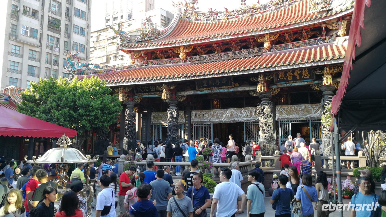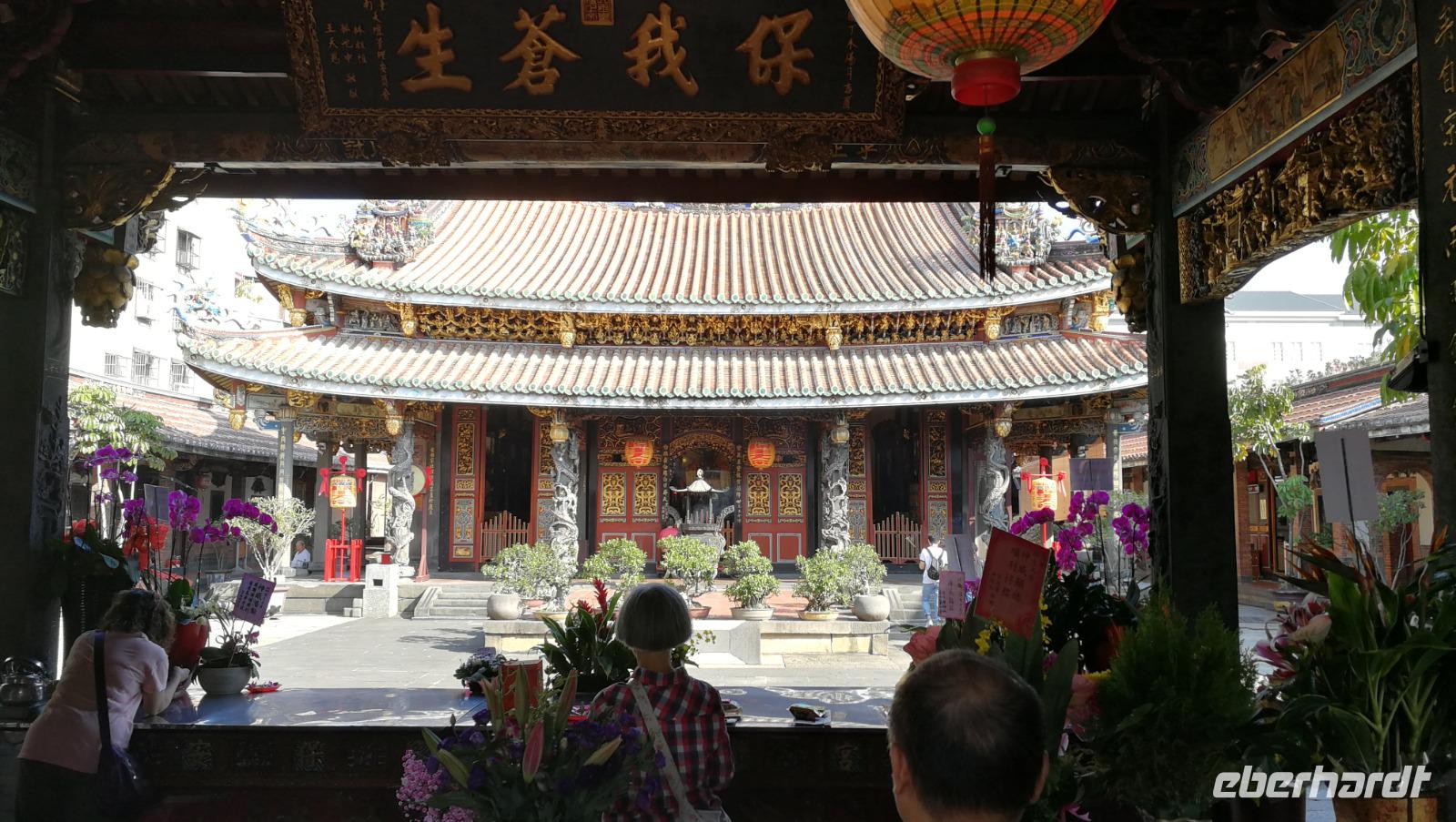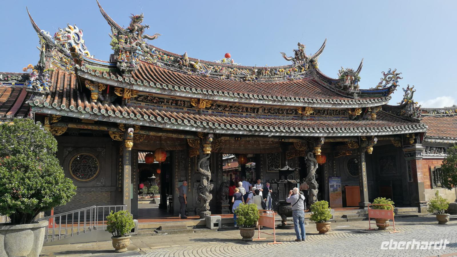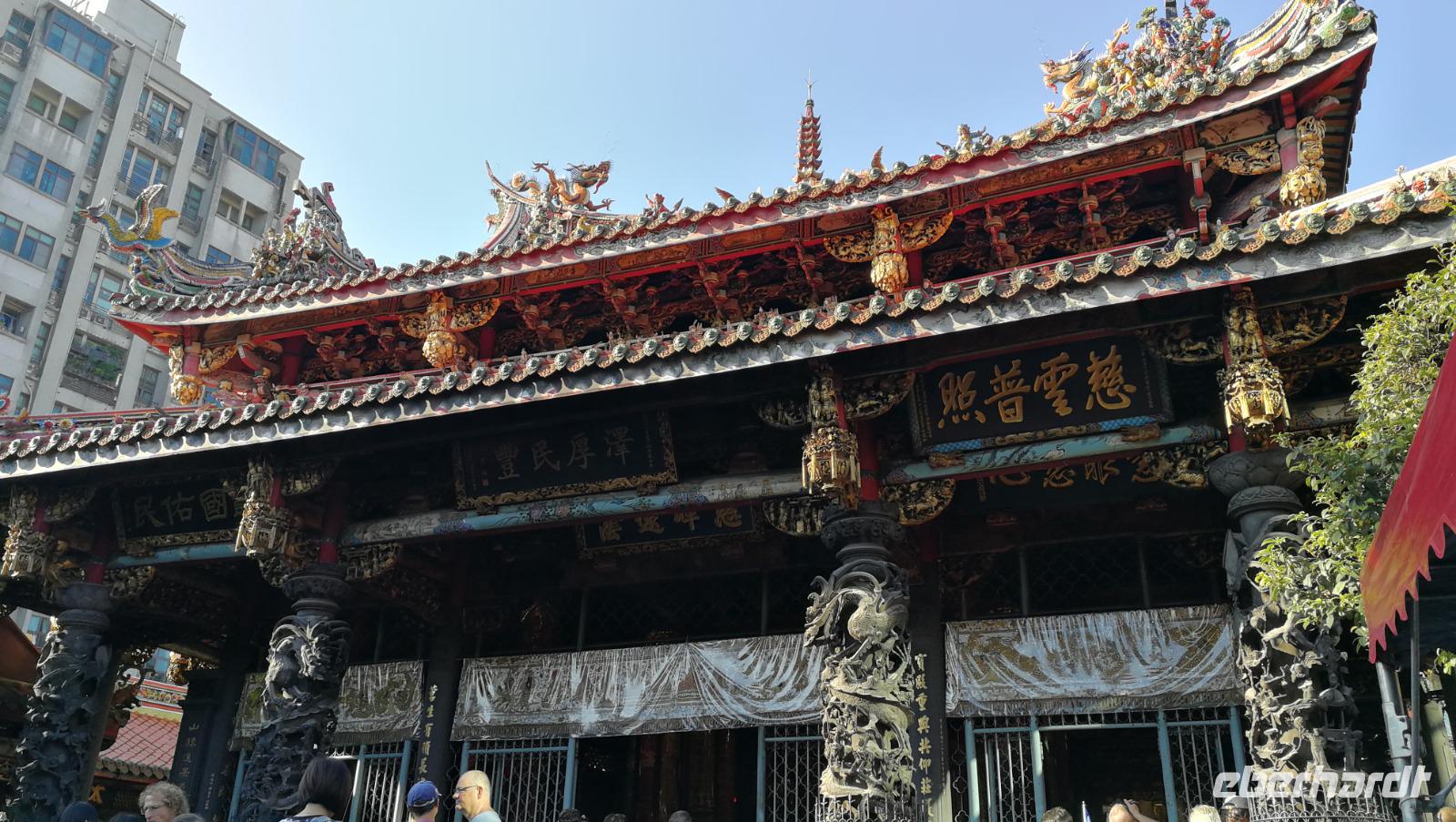 Unsere Reisegruppe traf sich vor dem Abflug nach Taipeh am Gate in Frankfurt und schon früh merkte man, dass über die nächsten Tage eine tolle Gruppendynamik entstehen wird. Aus allen Ecken Deutschlands hatten wir uns zusammengefunden und freuten uns auf die bevorstehende Zeit in Ostasien. Um 11:40 hob der Flieger ab und brachte uns nach ca. 12 Stunden Flugzeit wohlbehalten nach Taiwan, wo es zum Zeitpunkt der Landung früh am Morgen war. Nach den Einreiseprozeduren trafen wir auf unsere taiwanesische Reiseleiterin Syntia, die uns herzlich begrüßte. Auf der Fahrt in die Stadt stellte Sie uns den pazifischen Inselstaat näher vor. Auf einer Fläche so groß wie Baden-Württemberg leben hier ca. 24 Millionen Menschen - die Hauptstadt Taipeh selbst zählt davon ein Zehntel. Selbst im Oktober hat es hier noch immer 25-30°C - ein starker Kontrast zum nasskalten Deutschland aus dem wir am Morgen angereist waren. Nach der kurzen Fahrt kamen wir am Pao-an (sprich: Baoan) Tempel an. Dieser taoistische Tempel aus dem 18. Und 19. Jahrhundert liegt in der Altstadt, gehört zum UNESCO Weltkulturerbe und beeindruckte uns durch die farbenfrohe und reich verzierte Dekoration aus Porzellanfiguren und Goldverzierten Ornamenten. Syntia erklärte uns die taoistischen Gebetsriten: man richtet seine drängenden Fragen an die Gottheit seiner Wahl und formuliert eine einfache ja-nein Frage wie man weiter vorgehen soll. Eine Antwort erhält man durch das Fallenlassen von Gebetssteinen. Je nachdem, wie die Steine auf dem Boden zu liegen kommen befürwortet die Gottheit das Vorhaben oder rät einem davon ab und man formuliert eine neue Frage.